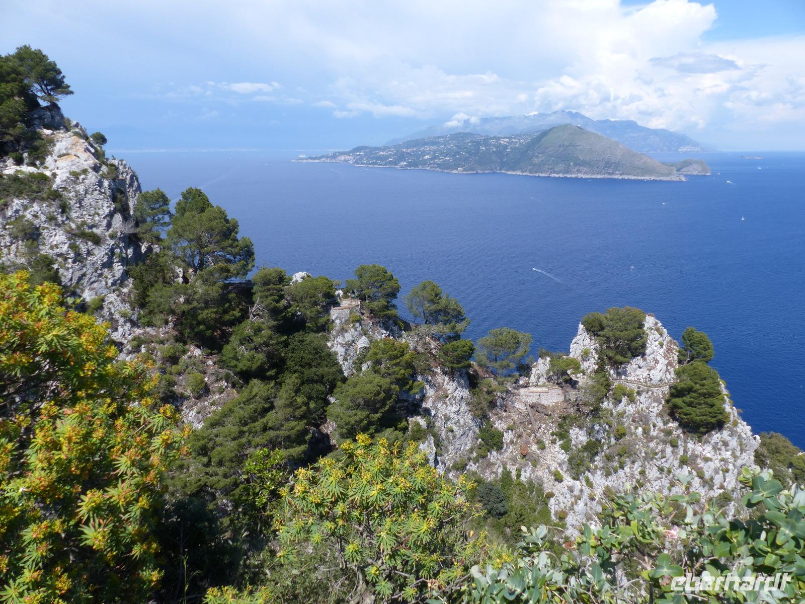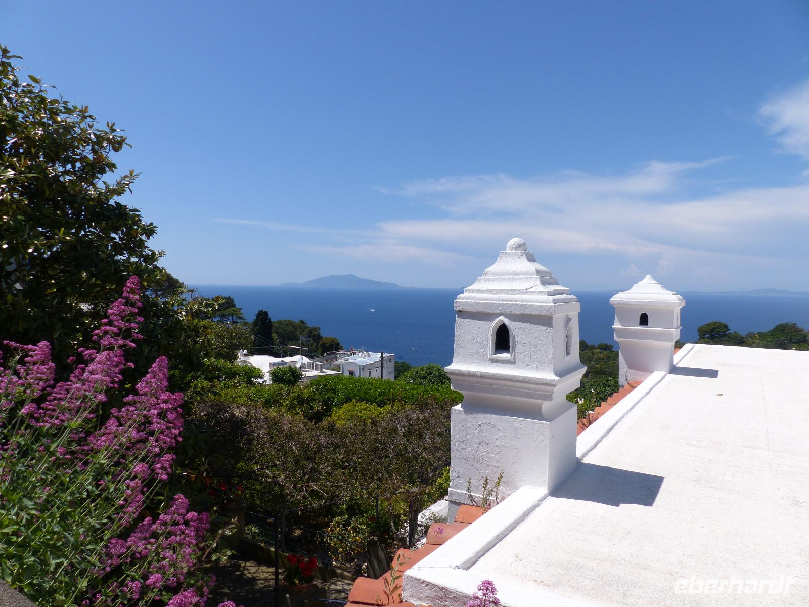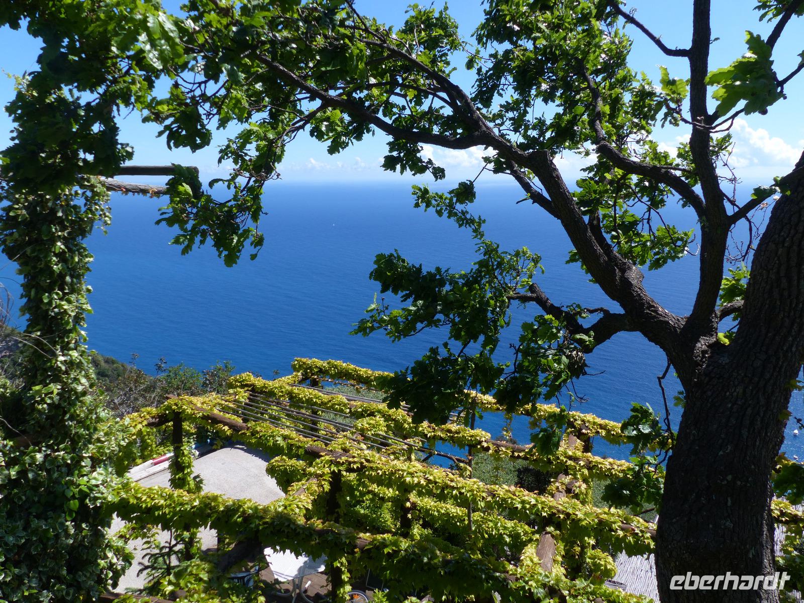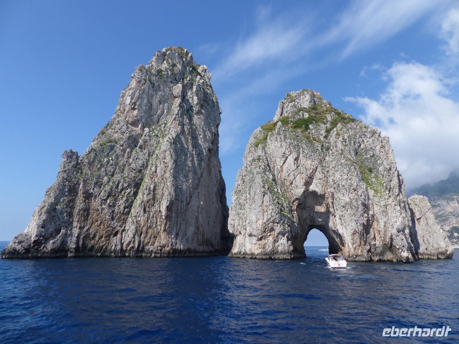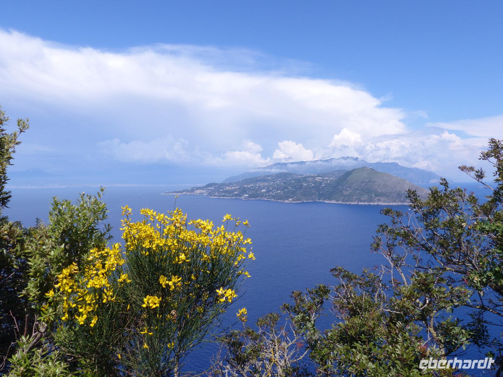 Da einige Gäste die Reise noch um ein paar Tage auf Capri verlängern wollten, nahmen diese sich heute Zeit für einen Bummel durch Amalfi und Ravello. Alle anderen wollten mit mir nach Capri. Und so zogen wir bei blitzblauem Himmel am frühen Morgen los zum Hafen von Minori. Wir konnten alle oben an Deck sitzen. Dann fuhren wir über Amalfi und Positano nach Capri. Herrliches Wetter, Spiegelungen im Wasser, schönes Licht. Das Meer war glatt und wellenlos. Wir fuhren an der Südküste Capris entlang, sahen hinauf zur Villa Malapartes und näherten uns den berühmten Faraglioni-Inseln. Unser Kapitän steuerte gekonnt das Boot durch den natürlichen Felsentunnel der mittleren Insel hindurch. Dann bekamen wir eine Inselumrundung geboten, fuhren am Leuchtturm vorüber zur Westküste, am Eingang der blauen Grotte vorbei bis zum Hafen Marina Grande und gingen an Land. In Marina Grande besorgte ich ein Picknick für uns alle und ab ging's mit der Funicolare aufwärts zum Hauptplatz von Capri. Wir spazierten zu den Augustusgärten und genossen den Ausblick auf die Via Krupp, die sich nach Marina Piccola den Hang hinunter schlängelt. Und ausgerechnet auf dem Areal, das Friedrich Alfred Krupp der Gemeinde Capri geschenkt hatte, ließ diese ein Denkmal für Lenin errichten. Das hätte dem alten Krupp sicher nicht allzu gut gefallen... Das Meer schimmerte in türkisblauen Tönen und wir wanderten los zur Punta Tragara. Für unser Picknick hatten wir eine hübsche Stelle im Halbschatten gefunden. Dann wanderten wir oberhalb der Villa Malaparte vorüber, stiegen hoch zur Grotte Matermania und machten einen Abstecher zum Felsentor Arco Naturale. Und auch hinter dem Felsentor, das da aus den leuchtend grünen Bäumen ragt, schimmerte das Meer blitzblau. Nun wanderten wir zurück nach Capri. Hier trennten wir uns, denn einige Gäste wollten den Nachmittag etwas ruhiger angehen. Die anderen wanderten noch weiter mit mir hoch zur Villa Jovis. Der Weg führt zwischen stattlichen Villen mit hübschen Gärten hindurch. Dann genossen wir die Aussicht auf die Küste vom Palast des römischen Kaisers Tiberius. Er hatte sich schon ein sehr schönes Plätzchen für seinen Sitz ausgesucht! Der Vesuv war von Wolken umgeben, aber die Farben und das Licht waren toll. Und der benachbarte Parco Astarita war geöffnet, was leider nicht immer der Fall ist. Wir waren eine flotte Gruppe und ich hatte schon vorher ein bisschen aufs Tempo gedrückt, so dass uns noch 25 Minuten Zeit blieben, um die tollen Aussichtspunkte, die teils mitten in einer Felswand liegen, die dieser Park bietet, aufzusuchen. Herrliches Blau in Blau! Dann ging's wieder abwärts, an blühenden Gärten vorüber zur Funicolare, die uns wieder abwärts zum Hafen brachte. Am Hafen von Marina Grande trafen wir uns alle wieder und zum Abschluss besorgte ich noch Eis für alle. Danach genossen wir die Abendstimmung dieses herrlichen Tages auf dem Wasser bei unserer Rückreise auf dem Ausflugsboot.