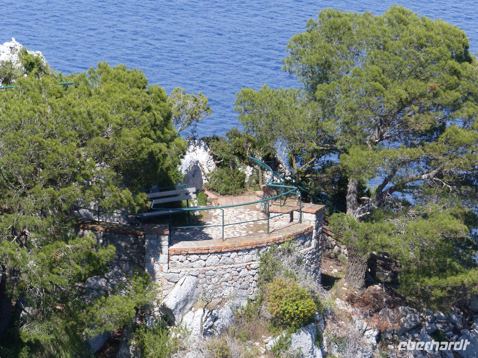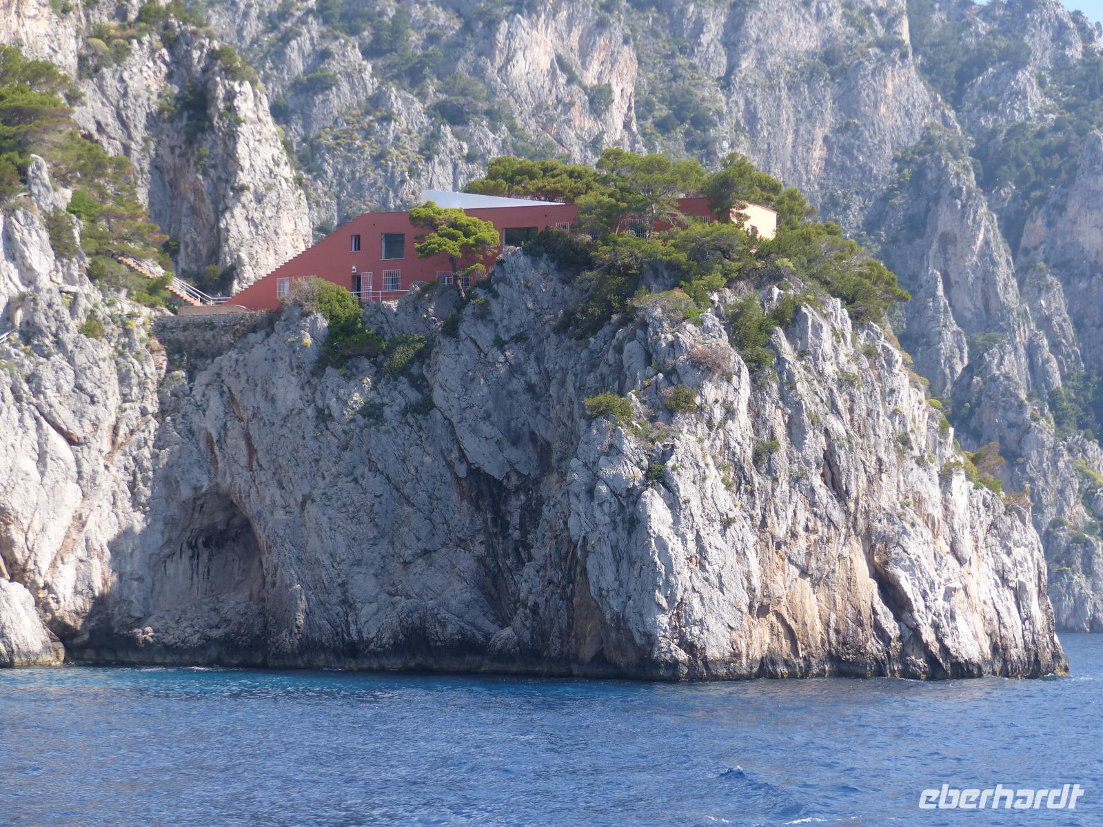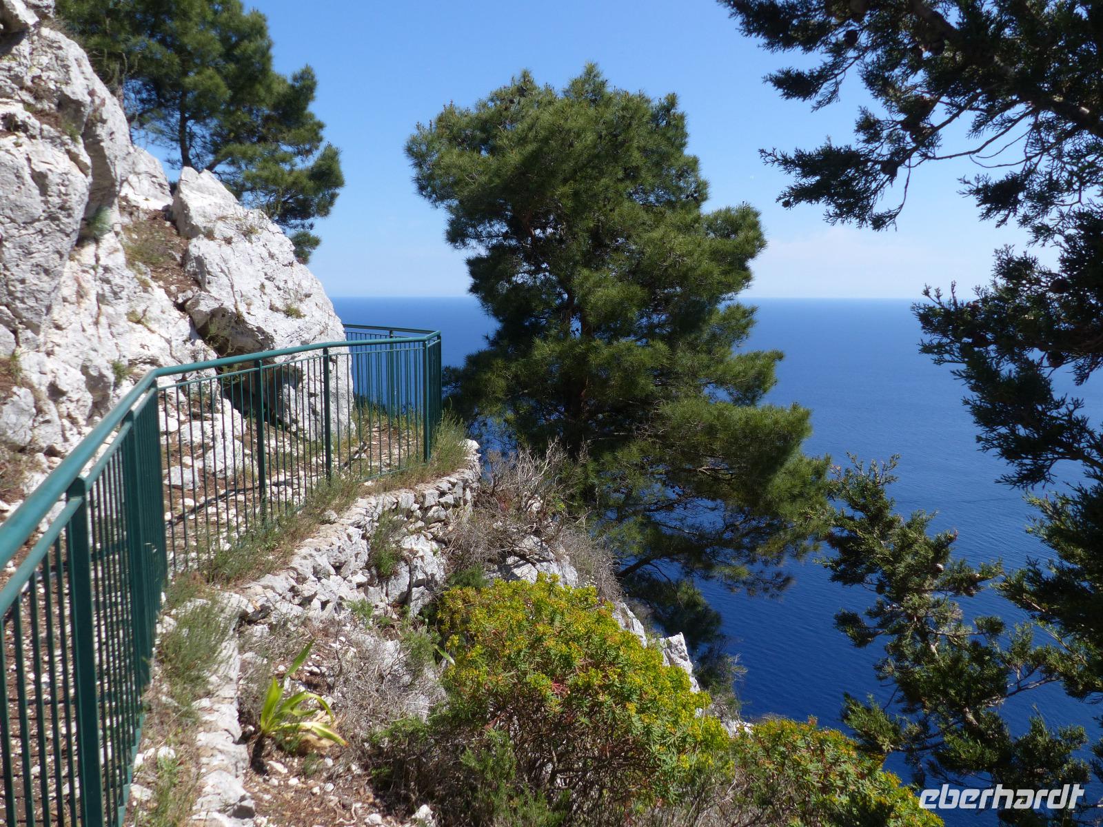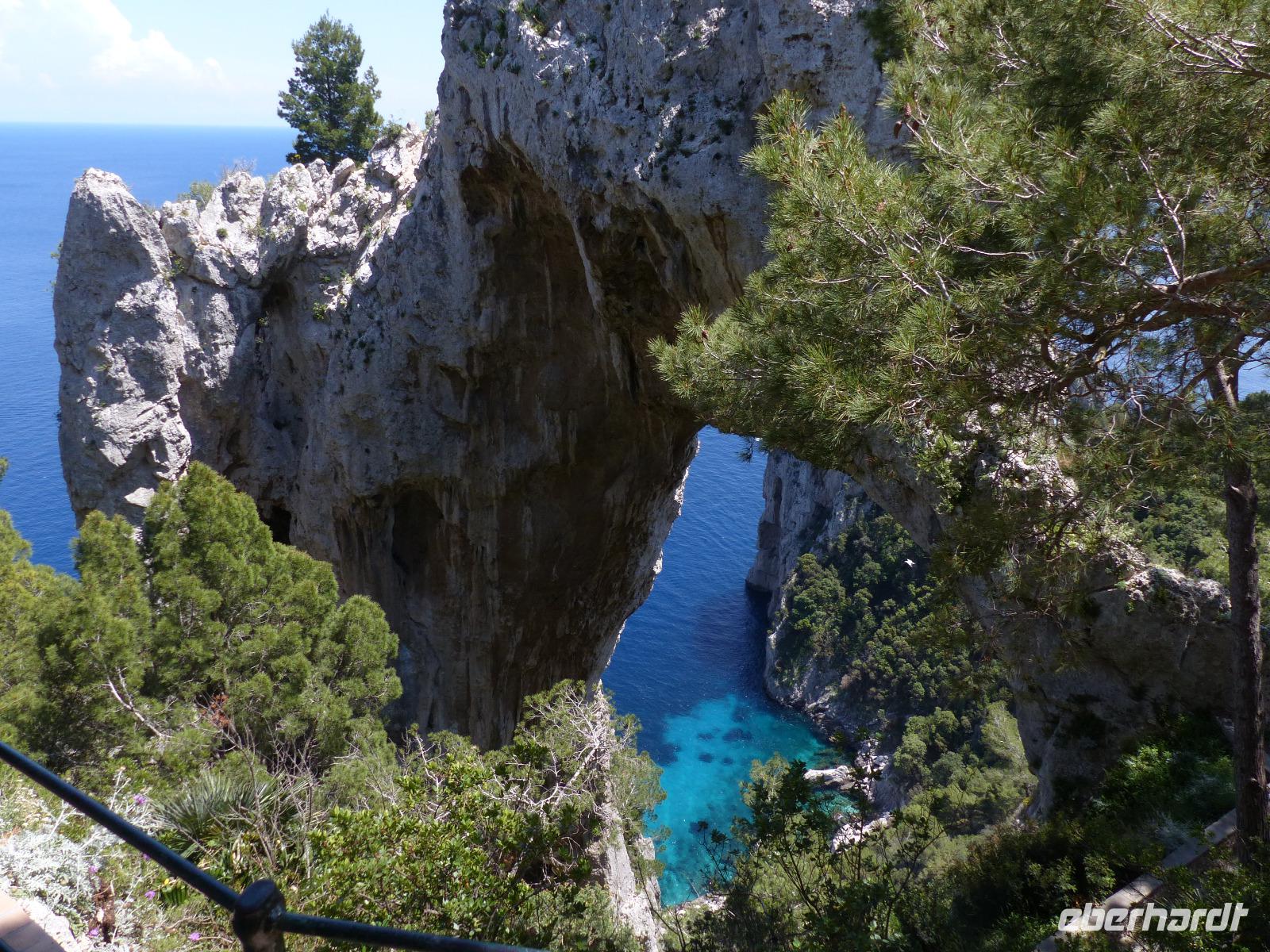 Da einige Gäste die Reise noch um ein paar Tage auf Capri verlängern wollten, nahmen diese sich heute Zeit für einen Bummel durch Amalfi und Ravello. Alle anderen wollten mit mir nach Capri. Und so zogen wir bei blitzblauem Himmel am frühen Morgen los zum Hafen von Minori. Wir konnten alle oben an Deck sitzen. Dann fuhren wir über Amalfi und Positano nach Capri. Herrliches Wetter, Spiegelungen im Wasser, schönes Licht. Das Meer war glatt und wellenlos. Wir fuhren an der Südküste Capris entlang, sahen hinauf zur Villa Malapartes und näherten uns den berühmten Faraglioni-Inseln. Unser Kapitän steuerte gekonnt das Boot durch den natürlichen Felsentunnel der mittleren Insel hindurch. Dann bekamen wir eine Inselumrundung geboten, fuhren am Leuchtturm vorüber zur Westküste, am Eingang der blauen Grotte vorbei bis zum Hafen Marina Grande und gingen an Land. In Marina Grande besorgte ich ein Picknick für uns alle und ab ging's mit der Funicolare aufwärts zum Hauptplatz von Capri. Wir spazierten zu den Augustusgärten und genossen den Ausblick auf die Via Krupp, die sich nach Marina Piccola den Hang hinunter schlängelt. Und ausgerechnet auf dem Areal, das Friedrich Alfred Krupp der Gemeinde Capri geschenkt hatte, ließ diese ein Denkmal für Lenin errichten. Das hätte dem alten Krupp sicher nicht allzu gut gefallen... Das Meer schimmerte in türkisblauen Tönen und wir wanderten los zur Punta Tragara. Für unser Picknick hatten wir eine hübsche Stelle im Halbschatten gefunden. Dann wanderten wir oberhalb der Villa Malaparte vorüber, stiegen hoch zur Grotte Matermania und machten einen Abstecher zum Felsentor Arco Naturale. Und auch hinter dem Felsentor, das da aus den leuchtend grünen Bäumen ragt, schimmerte das Meer blitzblau. Nun wanderten wir zurück nach Capri. Hier trennten wir uns, denn einige Gäste wollten den Nachmittag etwas ruhiger angehen. Die anderen wanderten noch weiter mit mir hoch zur Villa Jovis. Der Weg führt zwischen stattlichen Villen mit hübschen Gärten hindurch. Dann genossen wir die Aussicht auf die Küste vom Palast des römischen Kaisers Tiberius. Er hatte sich schon ein sehr schönes Plätzchen für seinen Sitz ausgesucht! Der Vesuv war von Wolken umgeben, aber die Farben und das Licht waren toll. Und der benachbarte Parco Astarita war geöffnet, was leider nicht immer der Fall ist. Wir waren eine flotte Gruppe und ich hatte schon vorher ein bisschen aufs Tempo gedrückt, so dass uns noch 25 Minuten Zeit blieben, um die tollen Aussichtspunkte, die teils mitten in einer Felswand liegen, die dieser Park bietet, aufzusuchen. Herrliches Blau in Blau! Dann ging's wieder abwärts, an blühenden Gärten vorüber zur Funicolare, die uns wieder abwärts zum Hafen brachte. Am Hafen von Marina Grande trafen wir uns alle wieder und zum Abschluss besorgte ich noch Eis für alle. Danach genossen wir die Abendstimmung dieses herrlichen Tages auf dem Wasser bei unserer Rückreise auf dem Ausflugsboot.