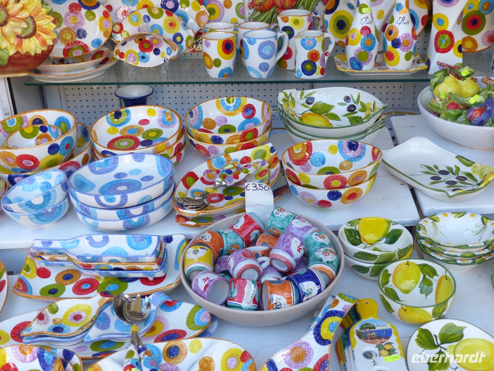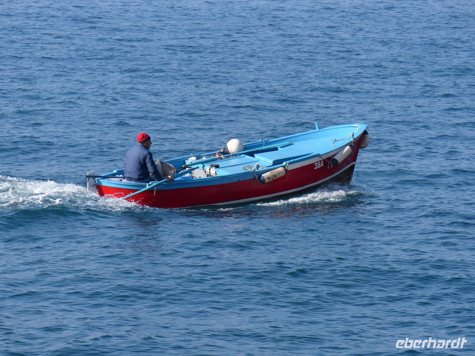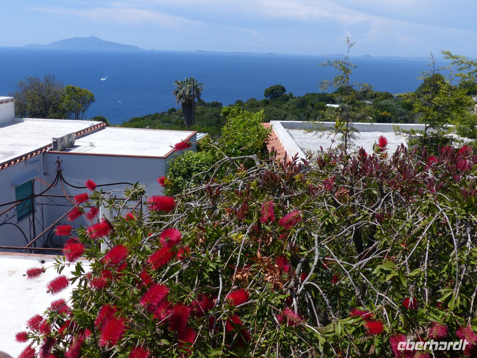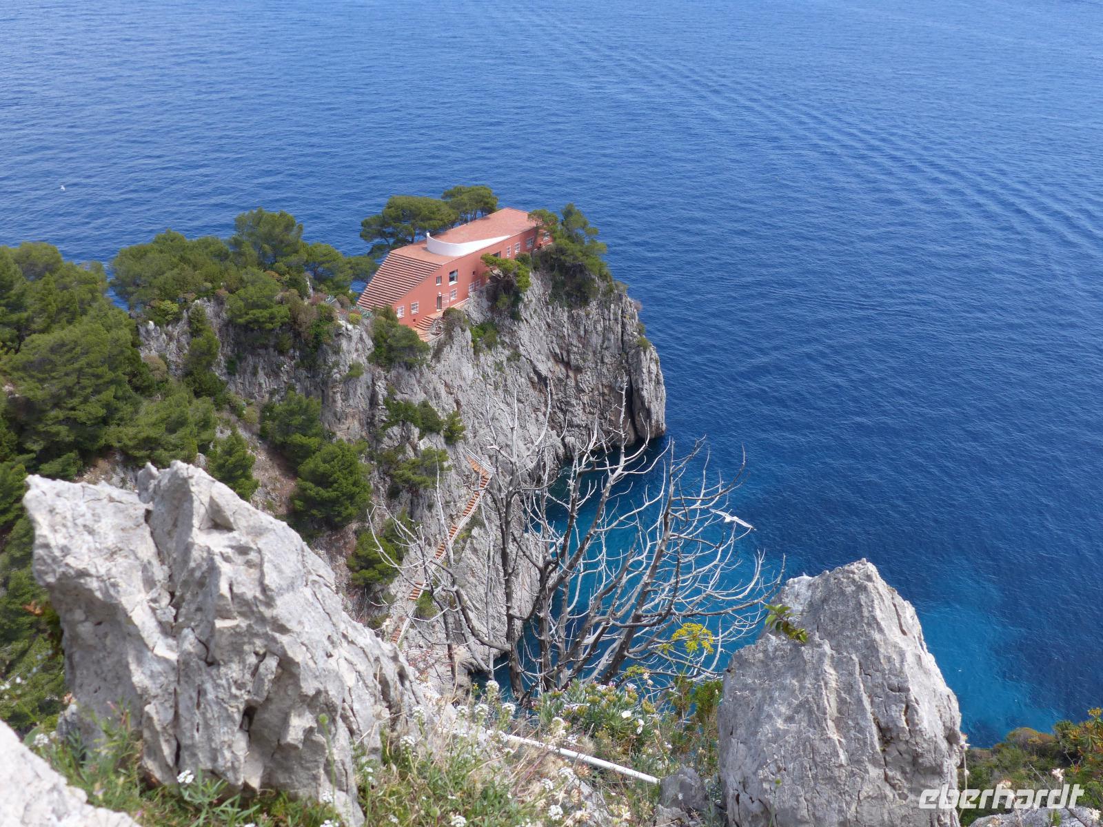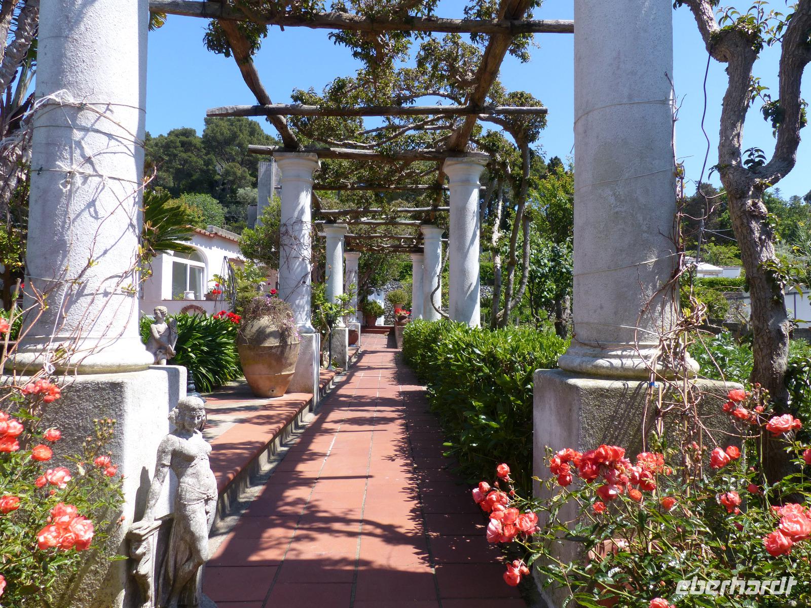 Da einige Gäste die Reise noch um ein paar Tage auf Capri verlängern wollten, nahmen diese sich heute Zeit für einen Bummel durch Amalfi und Ravello. Alle anderen wollten mit mir nach Capri. Und so zogen wir bei blitzblauem Himmel am frühen Morgen los zum Hafen von Minori. Wir konnten alle oben an Deck sitzen. Dann fuhren wir über Amalfi und Positano nach Capri. Herrliches Wetter, Spiegelungen im Wasser, schönes Licht. Das Meer war glatt und wellenlos. Wir fuhren an der Südküste Capris entlang, sahen hinauf zur Villa Malapartes und näherten uns den berühmten Faraglioni-Inseln. Unser Kapitän steuerte gekonnt das Boot durch den natürlichen Felsentunnel der mittleren Insel hindurch. Dann bekamen wir eine Inselumrundung geboten, fuhren am Leuchtturm vorüber zur Westküste, am Eingang der blauen Grotte vorbei bis zum Hafen Marina Grande und gingen an Land. In Marina Grande besorgte ich ein Picknick für uns alle und ab ging's mit der Funicolare aufwärts zum Hauptplatz von Capri. Wir spazierten zu den Augustusgärten und genossen den Ausblick auf die Via Krupp, die sich nach Marina Piccola den Hang hinunter schlängelt. Und ausgerechnet auf dem Areal, das Friedrich Alfred Krupp der Gemeinde Capri geschenkt hatte, ließ diese ein Denkmal für Lenin errichten. Das hätte dem alten Krupp sicher nicht allzu gut gefallen... Das Meer schimmerte in türkisblauen Tönen und wir wanderten los zur Punta Tragara. Für unser Picknick hatten wir eine hübsche Stelle im Halbschatten gefunden. Dann wanderten wir oberhalb der Villa Malaparte vorüber, stiegen hoch zur Grotte Matermania und machten einen Abstecher zum Felsentor Arco Naturale. Und auch hinter dem Felsentor, das da aus den leuchtend grünen Bäumen ragt, schimmerte das Meer blitzblau. Nun wanderten wir zurück nach Capri. Hier trennten wir uns, denn einige Gäste wollten den Nachmittag etwas ruhiger angehen. Die anderen wanderten noch weiter mit mir hoch zur Villa Jovis. Der Weg führt zwischen stattlichen Villen mit hübschen Gärten hindurch. Dann genossen wir die Aussicht auf die Küste vom Palast des römischen Kaisers Tiberius. Er hatte sich schon ein sehr schönes Plätzchen für seinen Sitz ausgesucht! Der Vesuv war von Wolken umgeben, aber die Farben und das Licht waren toll. Und der benachbarte Parco Astarita war geöffnet, was leider nicht immer der Fall ist. Wir waren eine flotte Gruppe und ich hatte schon vorher ein bisschen aufs Tempo gedrückt, so dass uns noch 25 Minuten Zeit blieben, um die tollen Aussichtspunkte, die teils mitten in einer Felswand liegen, die dieser Park bietet, aufzusuchen. Herrliches Blau in Blau! Dann ging's wieder abwärts, an blühenden Gärten vorüber zur Funicolare, die uns wieder abwärts zum Hafen brachte. Am Hafen von Marina Grande trafen wir uns alle wieder und zum Abschluss besorgte ich noch Eis für alle. Danach genossen wir die Abendstimmung dieses herrlichen Tages auf dem Wasser bei unserer Rückreise auf dem Ausflugsboot.