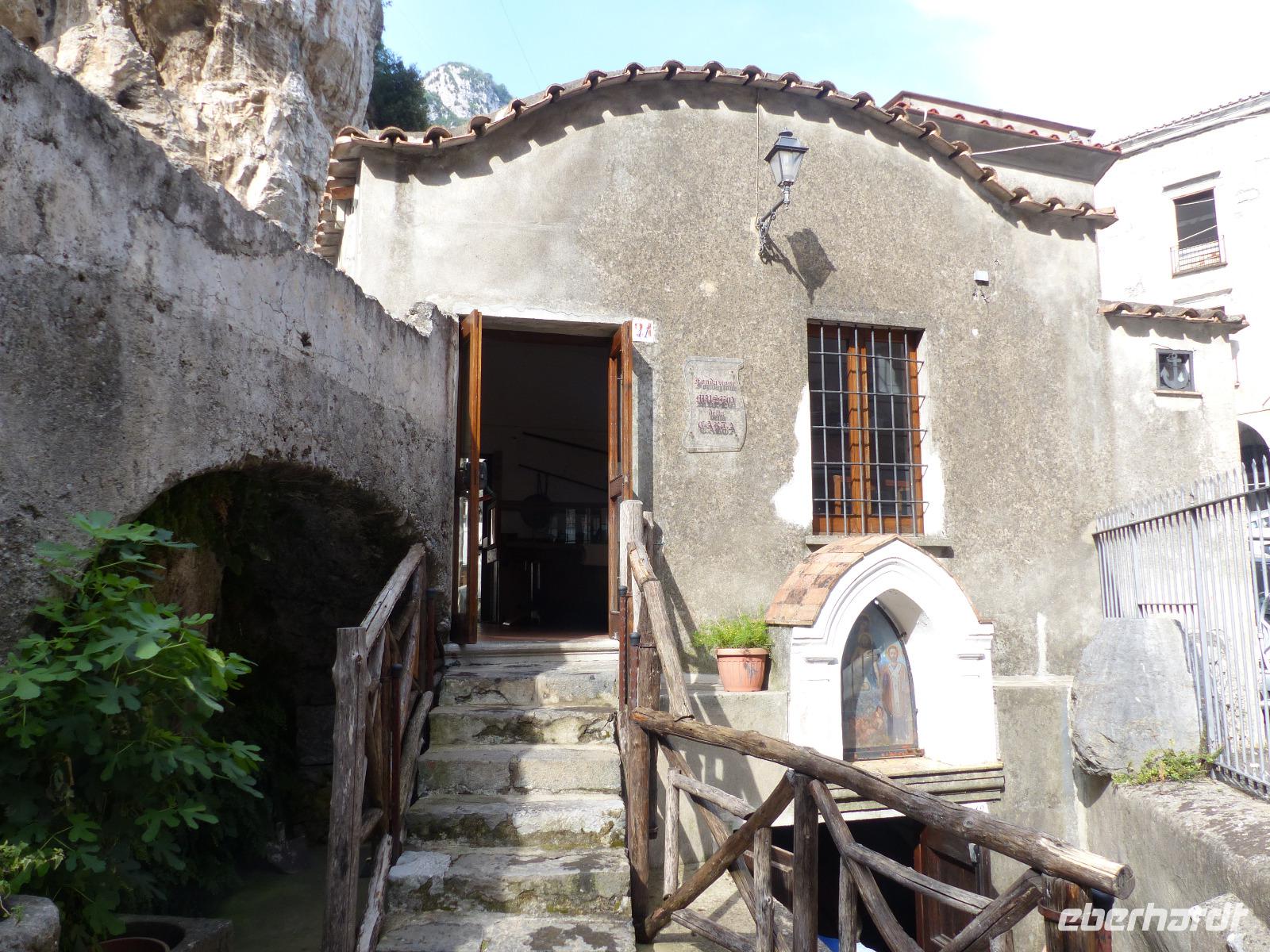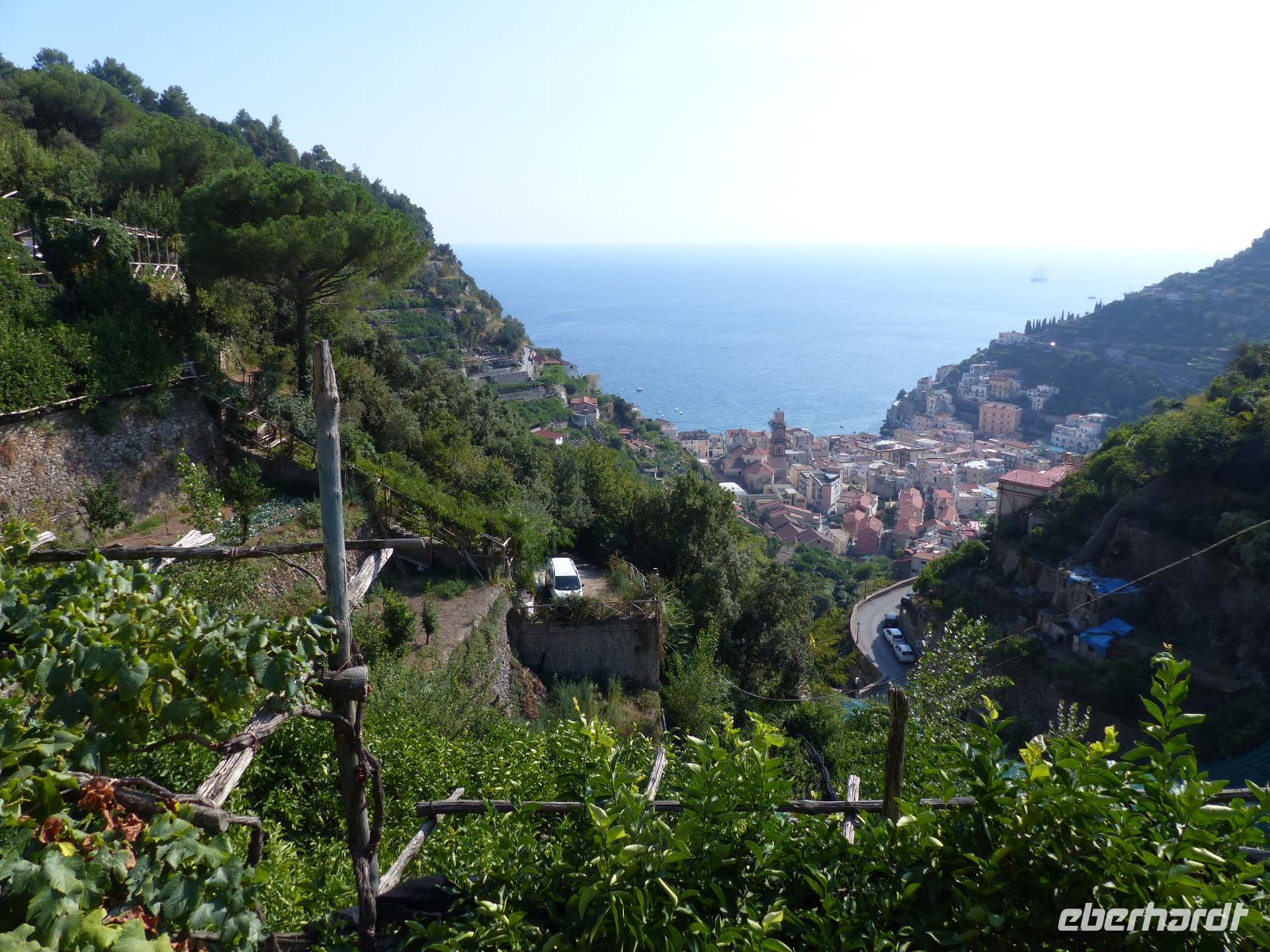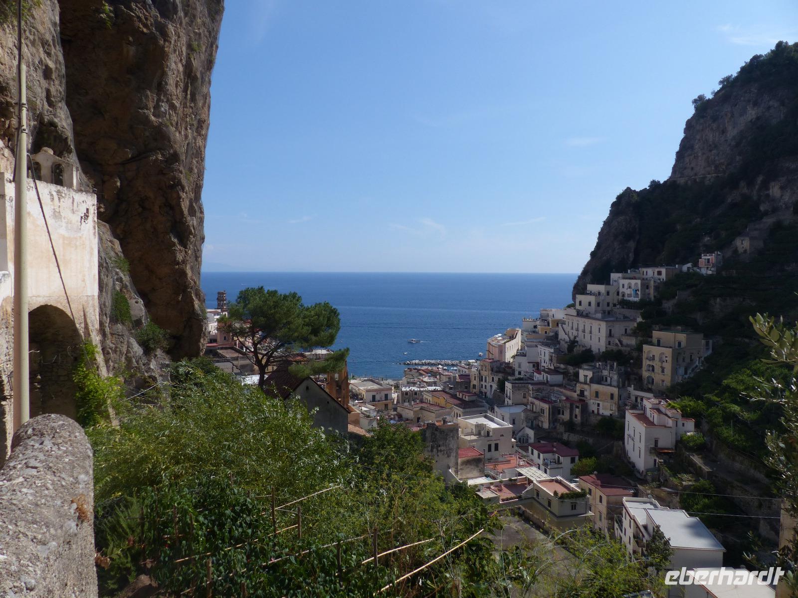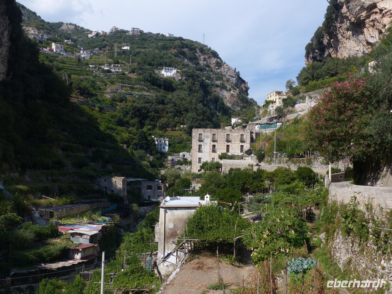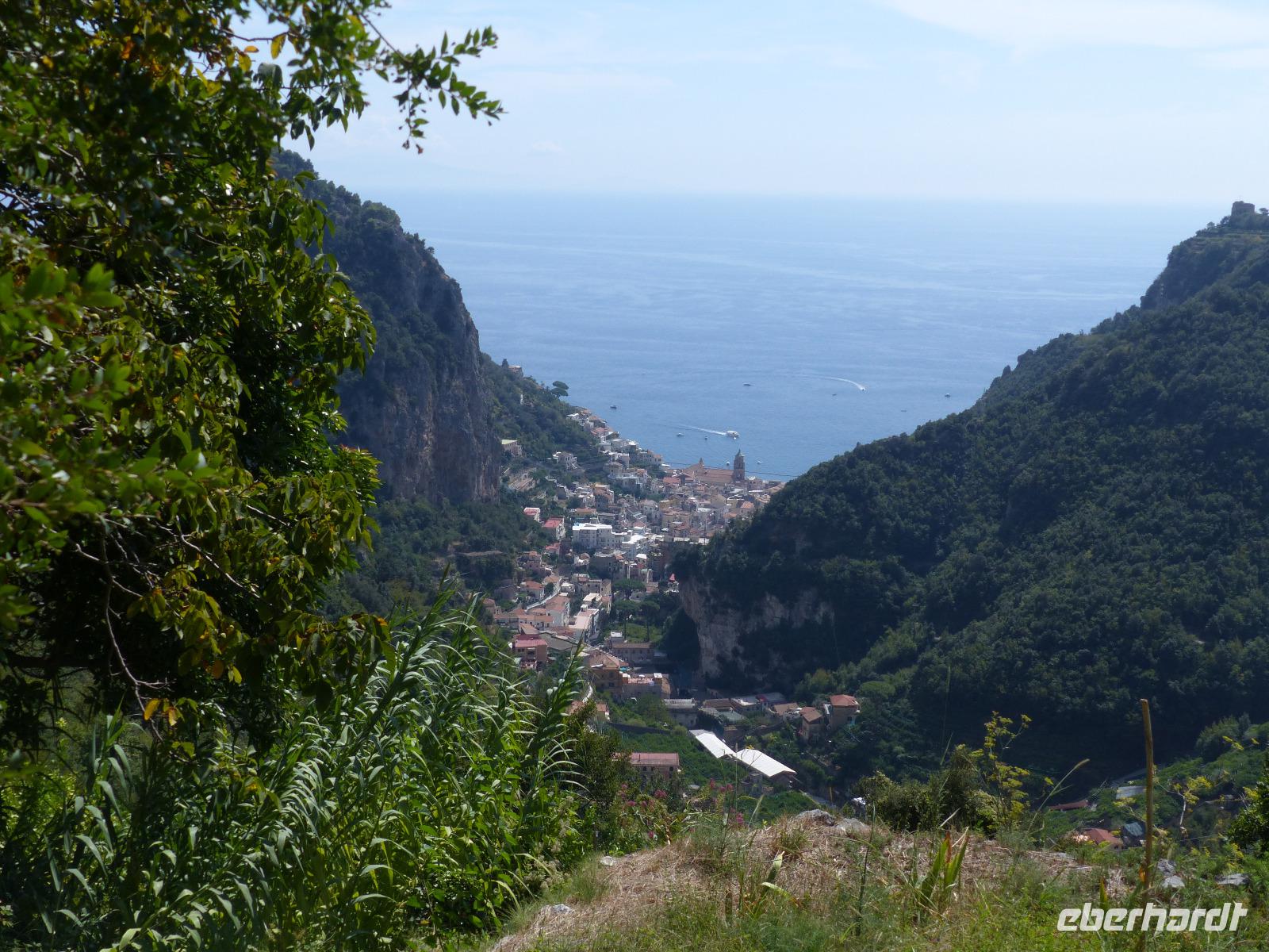 Einige Wolken konnten wir am ersten Tag zunächst nicht verjagen. Aber zum Wandern war es angenehm und es war nicht kalt. Per Bus ging es morgens nach Amalfi. Wir beäugten den Ort zuerst von der Hafenmole aus. Begrenzt durch alte Klosteranlagen, die schon lange zu Hotels umgebaut worden sind, stapeln sich die Häuser am Hang. Wir durchwanderten den malerischen Ort und ließen uns schließlich durch das Papiermuseum führen. Dann zogen wir durch Zitronenhaine aufwärts ins Mühlental, Goethes Zeilen „Zeig mir das Land wo die Zitronen blühn..." im Kopf. Überall plätscherte das Wasser. Wir passierten überwucherte alte Gemäuer, die von verfallenden Papiermühlen stammen. An einer alten Eisenhütte machten wir einen Abstecher und suchten uns eine Stelle für eine kleine Pause direkt am Wasser. Kleine braune Fröschchen krabbelten auf den Steinen am Bach. Hoch über uns die Felsen des Valle delle Ferriere. „Dort oben werden wir auch in wenigen Tagen noch wandern, ich zeig Euch dann von dort oben aus wo wir nun sind". So meine Ankündigung. Nach einem letzten Anstieg bot sich uns eine herrliche Aussicht auf Amalfi hinunter. In Pontone auf dem Kirchplatz wurde uns kräftig aufgetischt und bald schon stiegen wir ab nach Atrani ans Meer. Dort gab es sehr leckeres Eis. Dann durchquerten wir einen Tunnel und erreichten so wieder Amalfi. Nun besichtigten wir dort den Dom Sant' Andrea, bevor wir in See stachen. Wir fuhren mit dem flotten Linienschiff zurück nach Minori. Zum Abschluss dieses schönen ersten Wandertages tauchten wir noch in die Fluten des Mittelmeers und genossen das kühlende Nass am Strand von Minori. Anschließend ließen wir uns wie jeden Abend das Abendessen gut schmecken.
