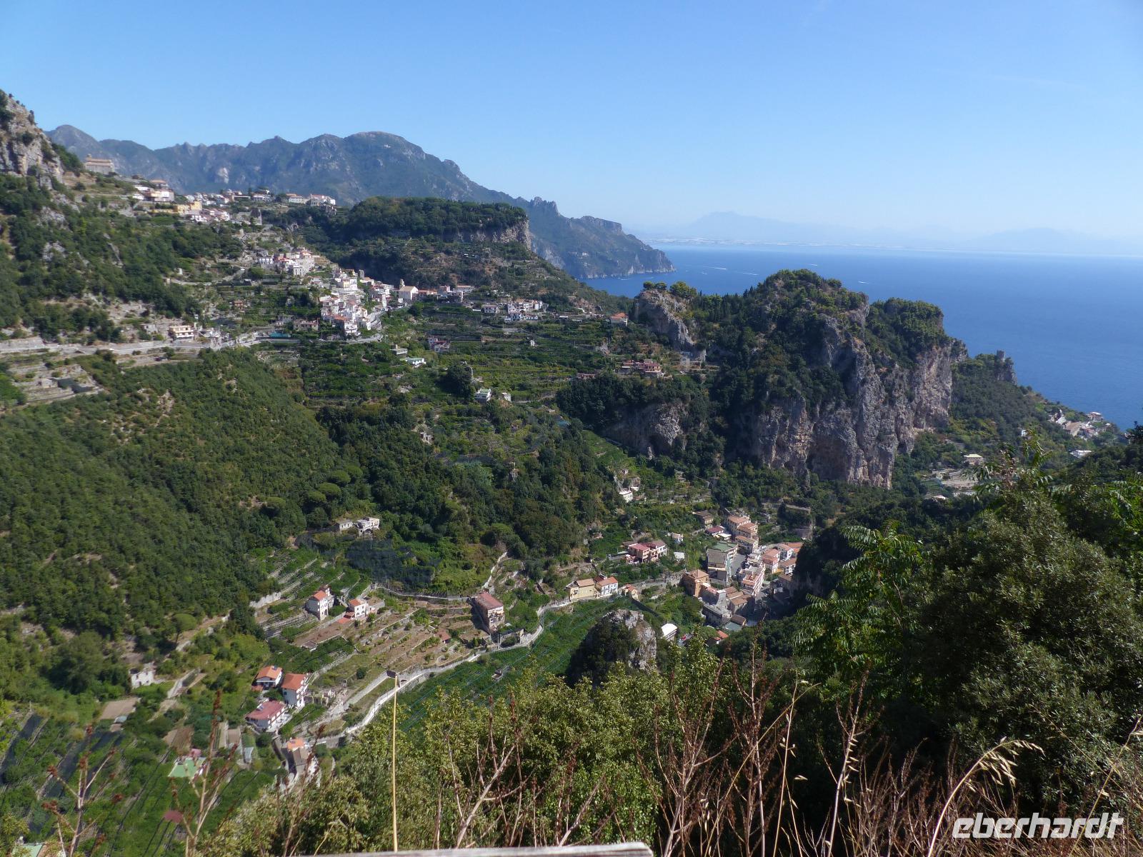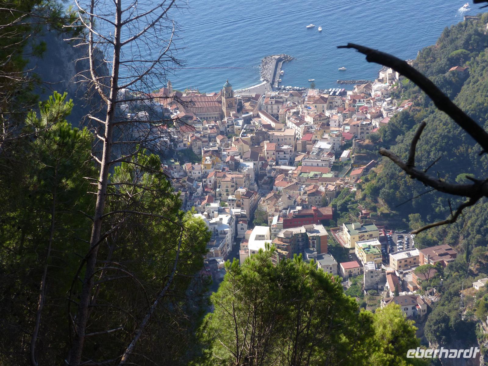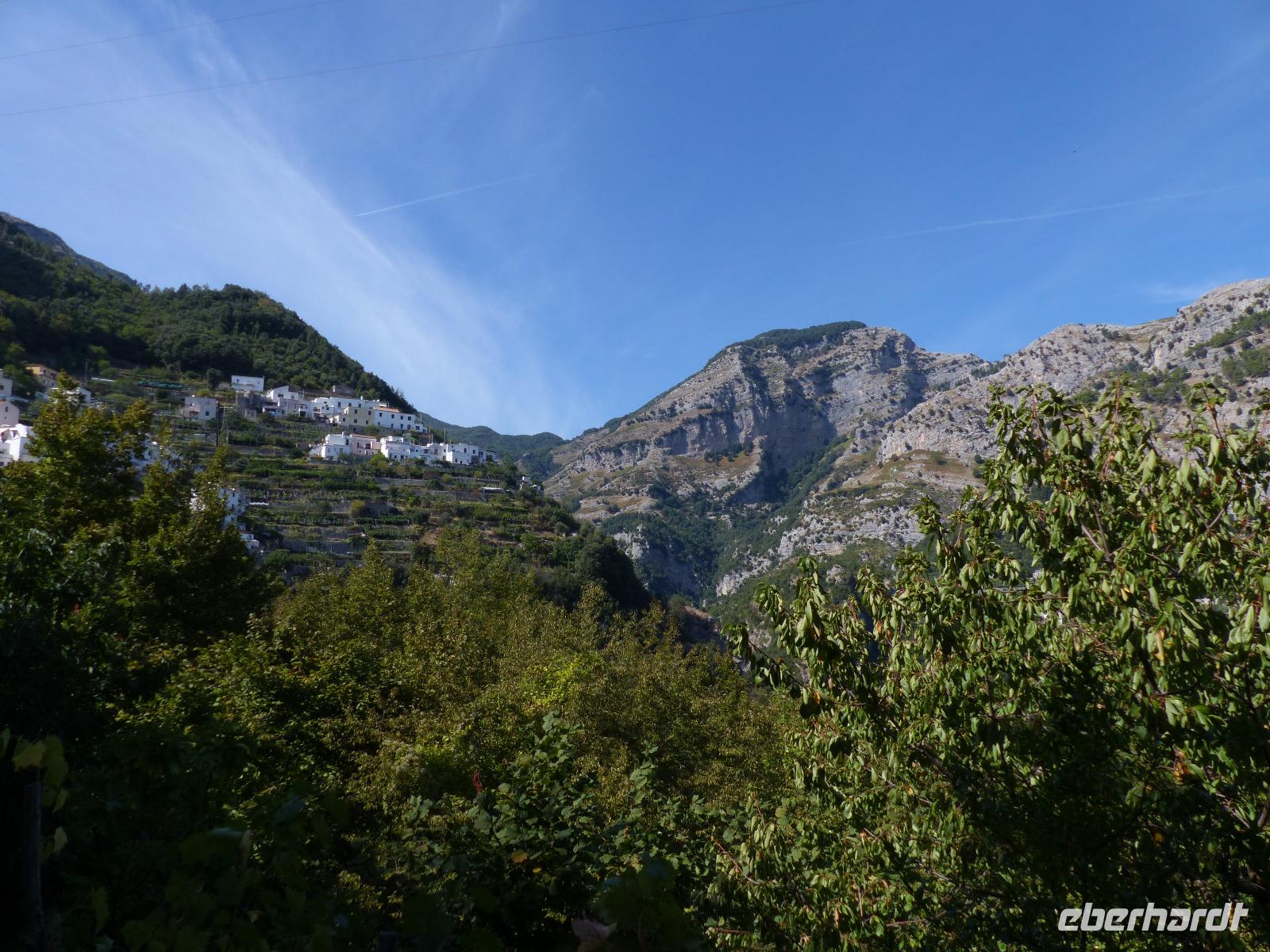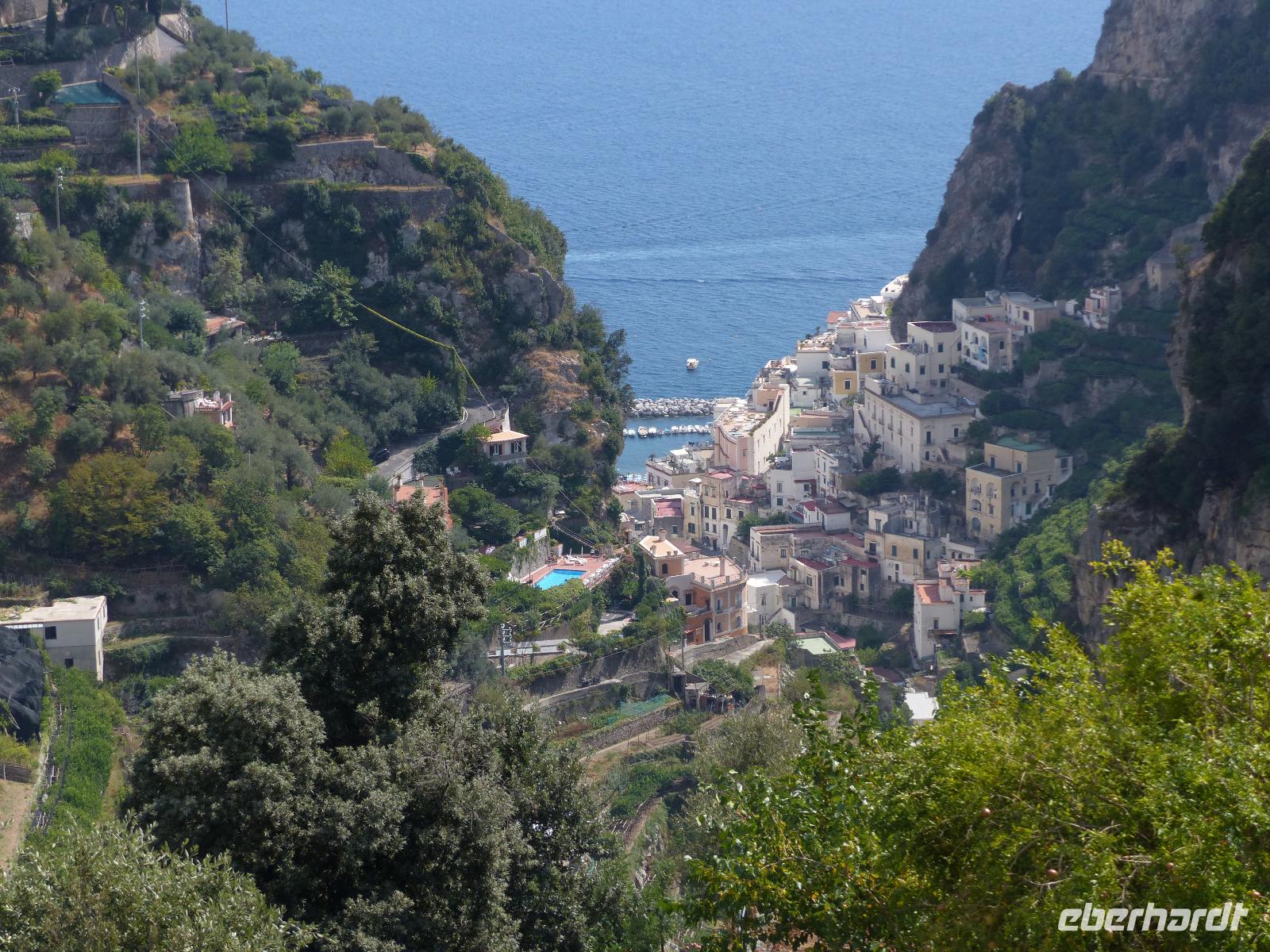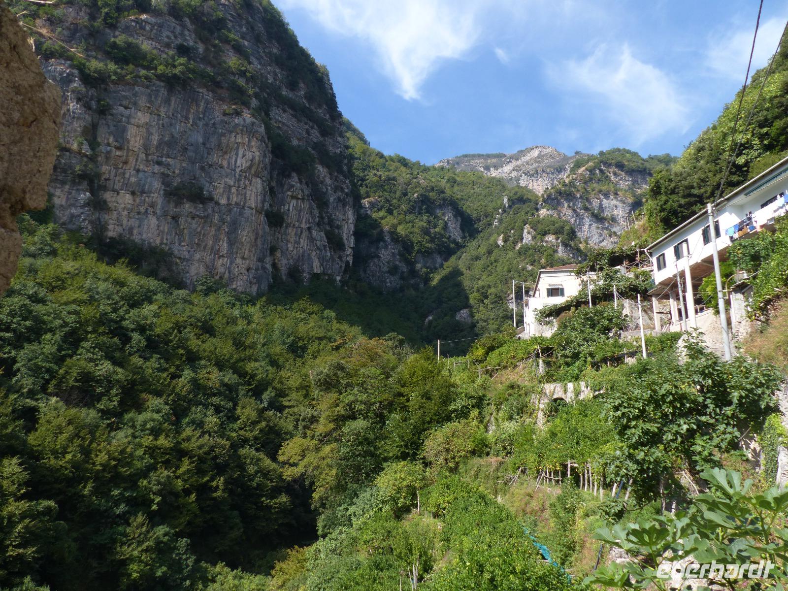 Einige Wolken konnten wir am ersten Tag zunächst nicht verjagen. Aber zum Wandern war es angenehm und es war nicht kalt. Per Bus ging es morgens nach Amalfi. Wir beäugten den Ort zuerst von der Hafenmole aus. Begrenzt durch alte Klosteranlagen, die schon lange zu Hotels umgebaut worden sind, stapeln sich die Häuser am Hang. Wir durchwanderten den malerischen Ort und ließen uns schließlich durch das Papiermuseum führen. Dann zogen wir durch Zitronenhaine aufwärts ins Mühlental, Goethes Zeilen „Zeig mir das Land wo die Zitronen blühn..." im Kopf. Überall plätscherte das Wasser. Wir passierten überwucherte alte Gemäuer, die von verfallenden Papiermühlen stammen. An einer alten Eisenhütte machten wir einen Abstecher und suchten uns eine Stelle für eine kleine Pause direkt am Wasser. Kleine braune Fröschchen krabbelten auf den Steinen am Bach. Hoch über uns die Felsen des Valle delle Ferriere. „Dort oben werden wir auch in wenigen Tagen noch wandern, ich zeig Euch dann von dort oben aus wo wir nun sind". So meine Ankündigung. Nach einem letzten Anstieg bot sich uns eine herrliche Aussicht auf Amalfi hinunter. In Pontone auf dem Kirchplatz wurde uns kräftig aufgetischt und bald schon stiegen wir ab nach Atrani ans Meer. Dort gab es sehr leckeres Eis. Dann durchquerten wir einen Tunnel und erreichten so wieder Amalfi. Nun besichtigten wir dort den Dom Sant' Andrea, bevor wir in See stachen. Wir fuhren mit dem flotten Linienschiff zurück nach Minori. Zum Abschluss dieses schönen ersten Wandertages tauchten wir noch in die Fluten des Mittelmeers und genossen das kühlende Nass am Strand von Minori. Anschließend ließen wir uns wie jeden Abend das Abendessen gut schmecken.