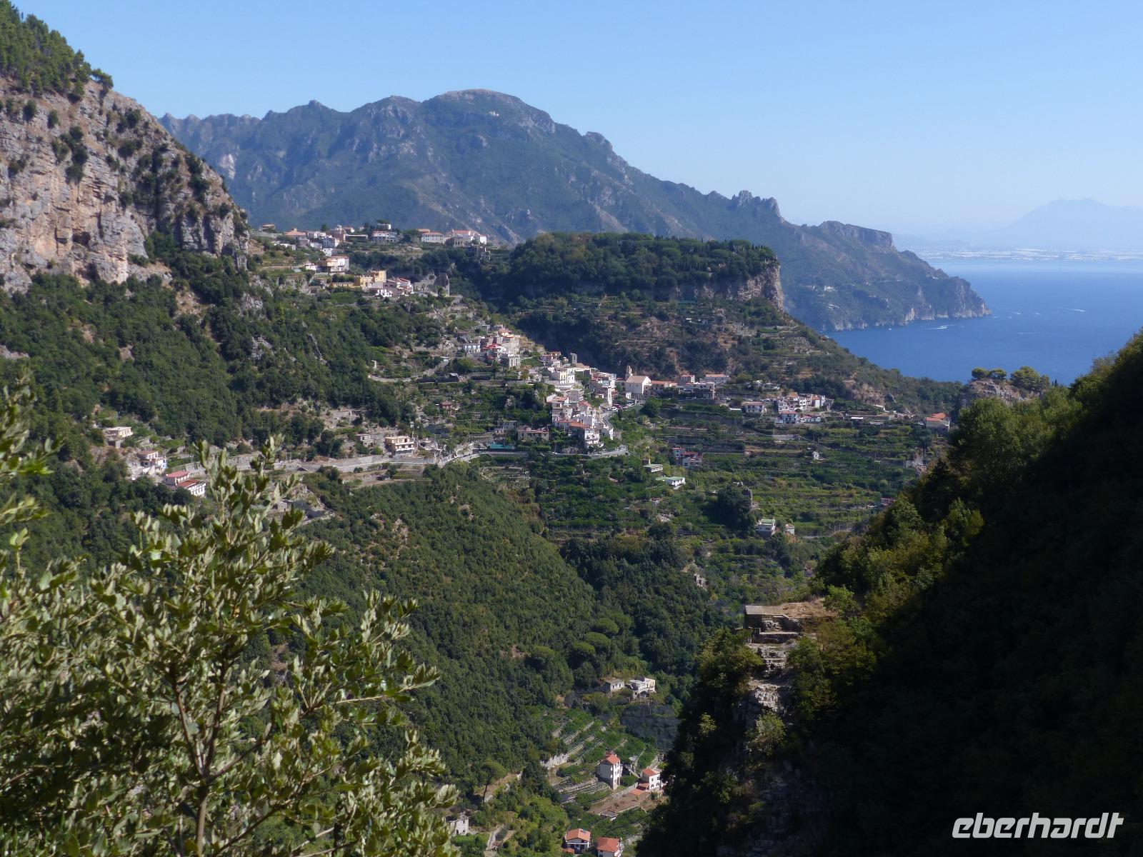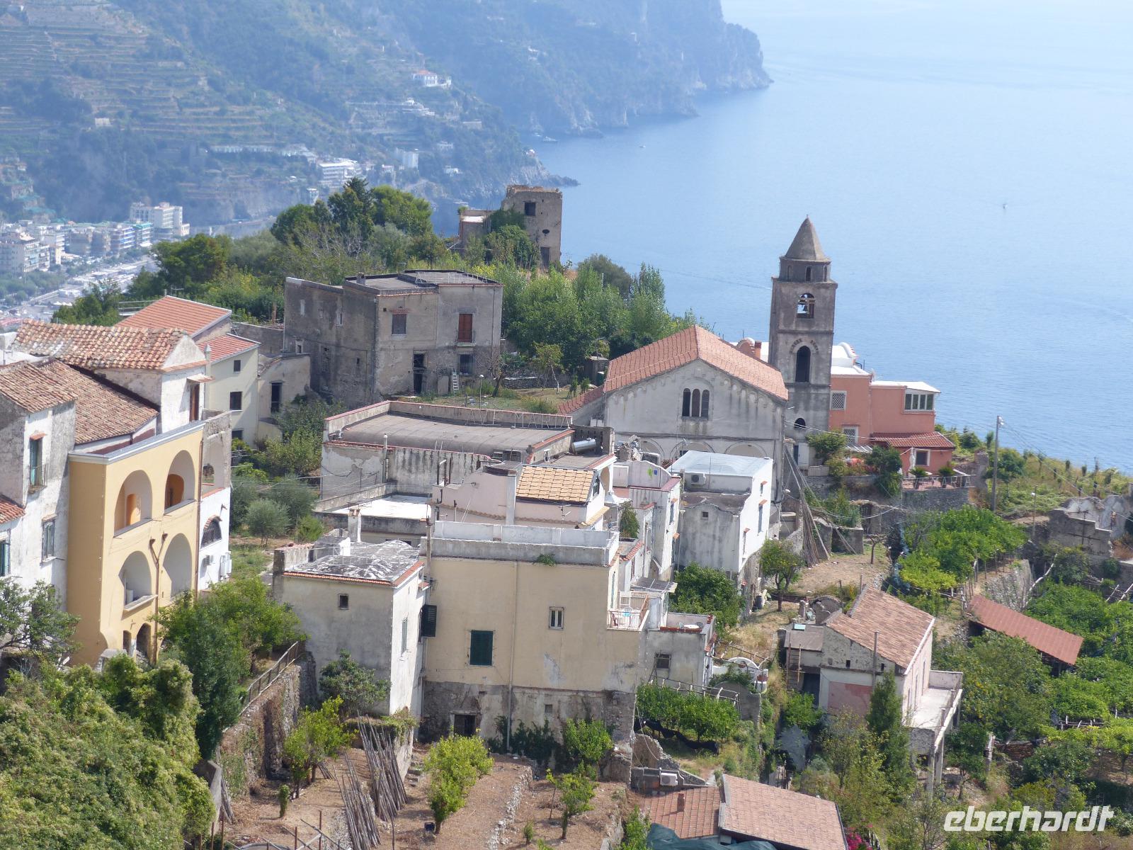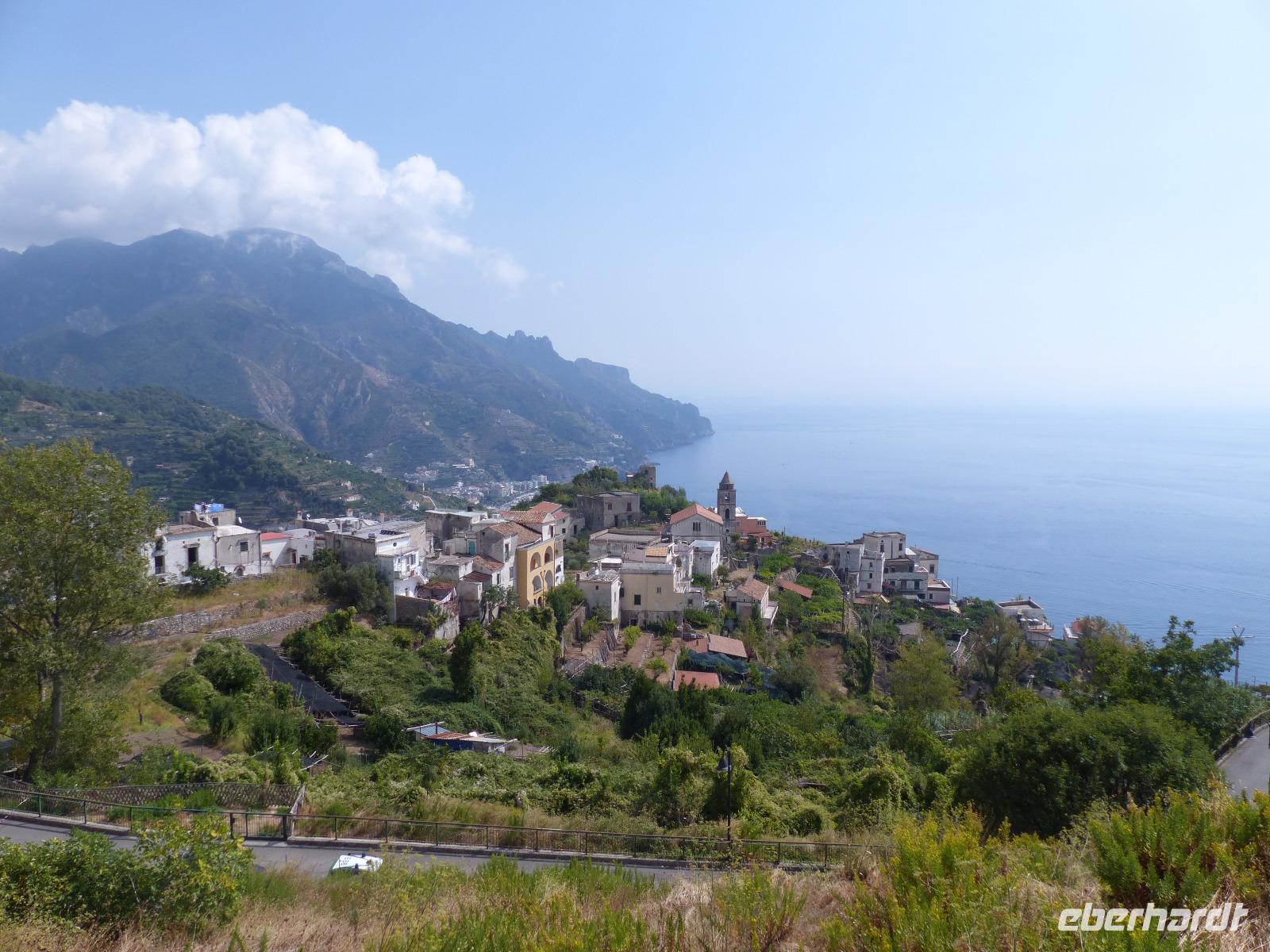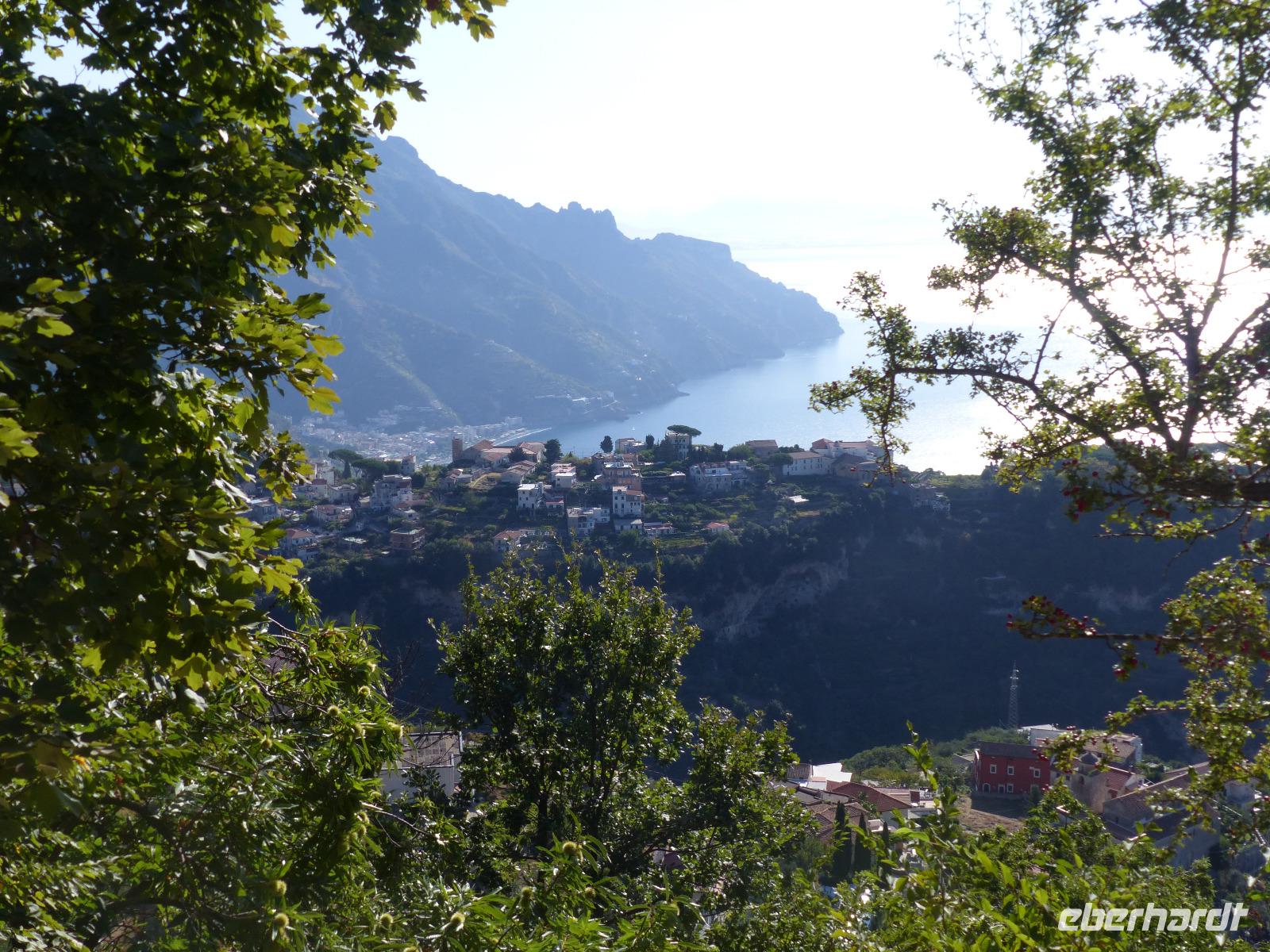 Einige Wolken konnten wir am ersten Tag zunächst nicht verjagen. Aber zum Wandern war es angenehm und es war nicht kalt. Per Bus ging es morgens nach Amalfi. Wir beäugten den Ort zuerst von der Hafenmole aus. Begrenzt durch alte Klosteranlagen, die schon lange zu Hotels umgebaut worden sind, stapeln sich die Häuser am Hang. Wir durchwanderten den malerischen Ort und ließen uns schließlich durch das Papiermuseum führen. Dann zogen wir durch Zitronenhaine aufwärts ins Mühlental, Goethes Zeilen „Zeig mir das Land wo die Zitronen blühn..." im Kopf. Überall plätscherte das Wasser. Wir passierten überwucherte alte Gemäuer, die von verfallenden Papiermühlen stammen. An einer alten Eisenhütte machten wir einen Abstecher und suchten uns eine Stelle für eine kleine Pause direkt am Wasser. Kleine braune Fröschchen krabbelten auf den Steinen am Bach. Hoch über uns die Felsen des Valle delle Ferriere. „Dort oben werden wir auch in wenigen Tagen noch wandern, ich zeig Euch dann von dort oben aus wo wir nun sind". So meine Ankündigung. Nach einem letzten Anstieg bot sich uns eine herrliche Aussicht auf Amalfi hinunter. In Pontone auf dem Kirchplatz wurde uns kräftig aufgetischt und bald schon stiegen wir ab nach Atrani ans Meer. Dort gab es sehr leckeres Eis. Dann durchquerten wir einen Tunnel und erreichten so wieder Amalfi. Nun besichtigten wir dort den Dom Sant' Andrea, bevor wir in See stachen. Wir fuhren mit dem flotten Linienschiff zurück nach Minori. Zum Abschluss dieses schönen ersten Wandertages tauchten wir noch in die Fluten des Mittelmeers und genossen das kühlende Nass am Strand von Minori. Anschließend ließen wir uns wie jeden Abend das Abendessen gut schmecken.