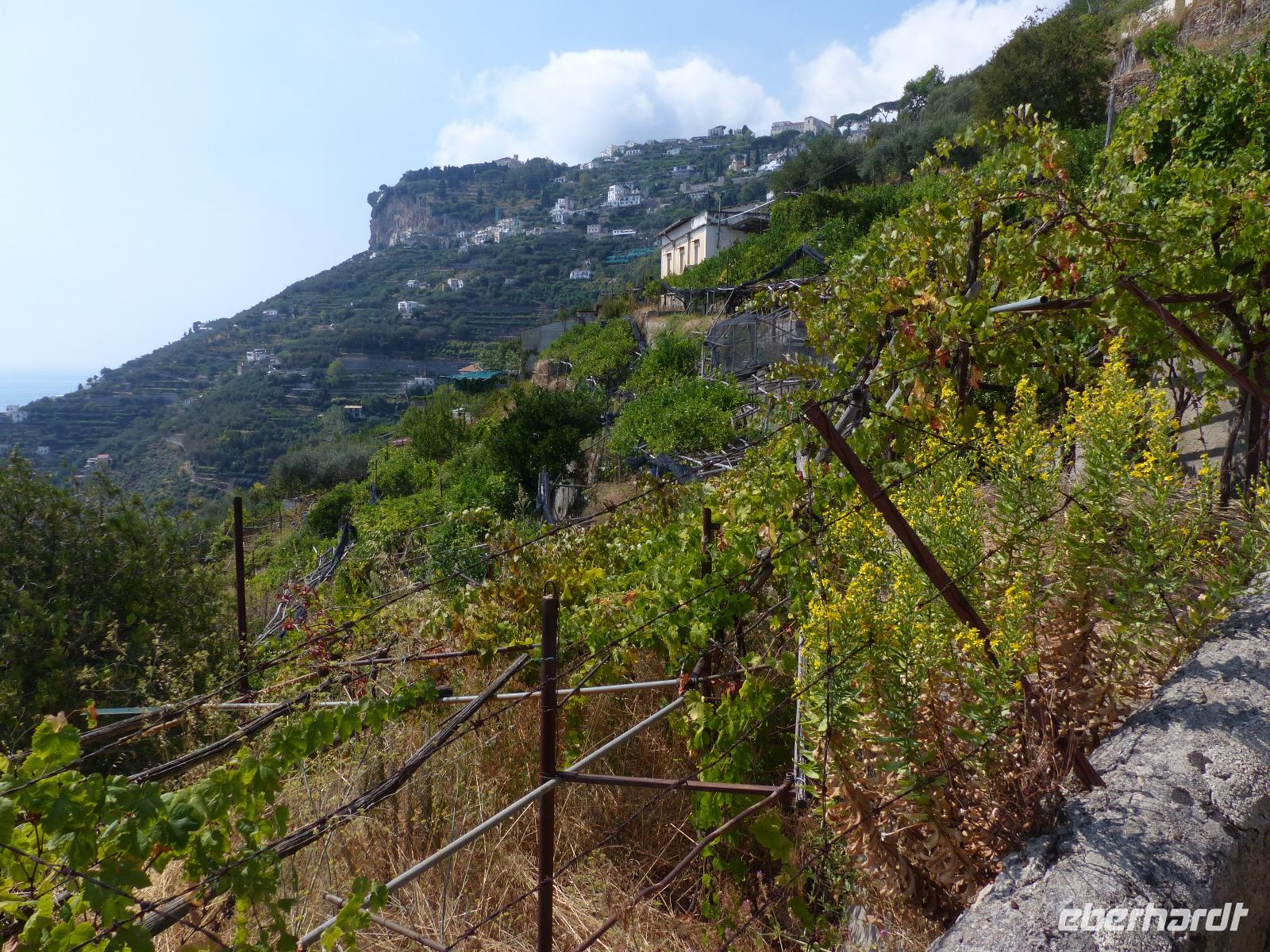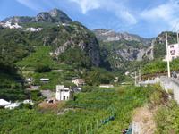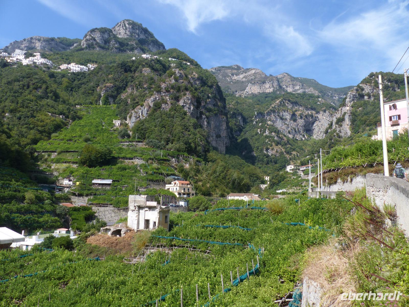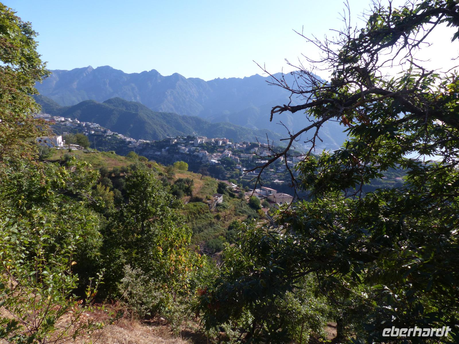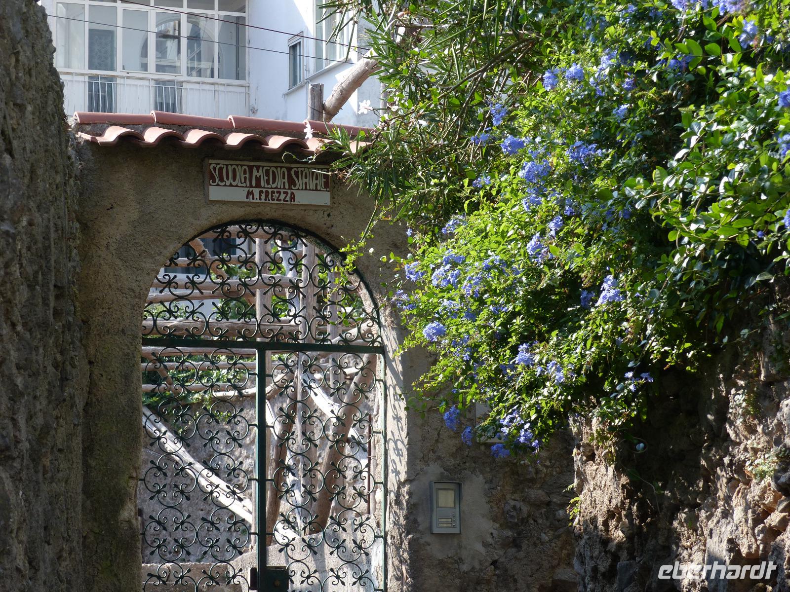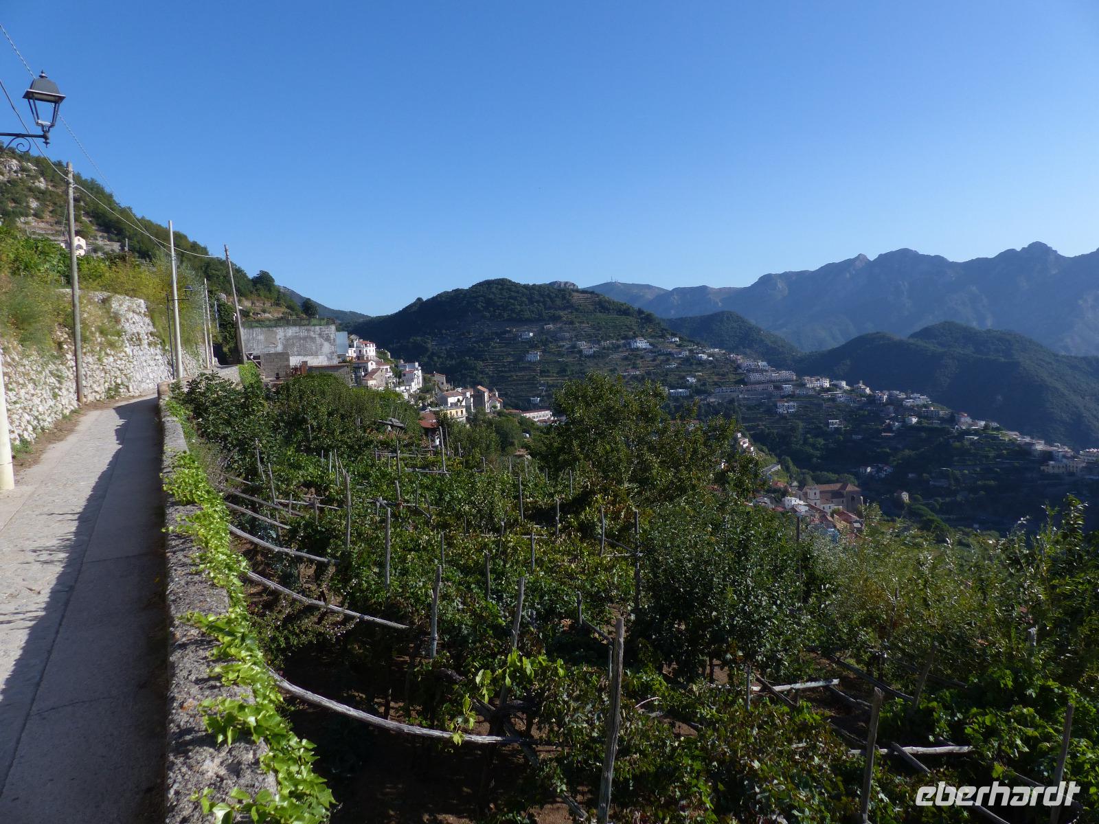 Einige Wolken konnten wir am ersten Tag zunächst nicht verjagen. Aber zum Wandern war es angenehm und es war nicht kalt. Per Bus ging es morgens nach Amalfi. Wir beäugten den Ort zuerst von der Hafenmole aus. Begrenzt durch alte Klosteranlagen, die schon lange zu Hotels umgebaut worden sind, stapeln sich die Häuser am Hang. Wir durchwanderten den malerischen Ort und ließen uns schließlich durch das Papiermuseum führen. Dann zogen wir durch Zitronenhaine aufwärts ins Mühlental, Goethes Zeilen „Zeig mir das Land wo die Zitronen blühn..." im Kopf. Überall plätscherte das Wasser. Wir passierten überwucherte alte Gemäuer, die von verfallenden Papiermühlen stammen. An einer alten Eisenhütte machten wir einen Abstecher und suchten uns eine Stelle für eine kleine Pause direkt am Wasser. Kleine braune Fröschchen krabbelten auf den Steinen am Bach. Hoch über uns die Felsen des Valle delle Ferriere. „Dort oben werden wir auch in wenigen Tagen noch wandern, ich zeig Euch dann von dort oben aus wo wir nun sind". So meine Ankündigung. Nach einem letzten Anstieg bot sich uns eine herrliche Aussicht auf Amalfi hinunter. In Pontone auf dem Kirchplatz wurde uns kräftig aufgetischt und bald schon stiegen wir ab nach Atrani ans Meer. Dort gab es sehr leckeres Eis. Dann durchquerten wir einen Tunnel und erreichten so wieder Amalfi. Nun besichtigten wir dort den Dom Sant' Andrea, bevor wir in See stachen. Wir fuhren mit dem flotten Linienschiff zurück nach Minori. Zum Abschluss dieses schönen ersten Wandertages tauchten wir noch in die Fluten des Mittelmeers und genossen das kühlende Nass am Strand von Minori. Anschließend ließen wir uns wie jeden Abend das Abendessen gut schmecken.