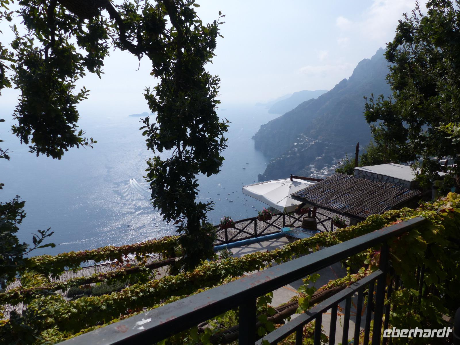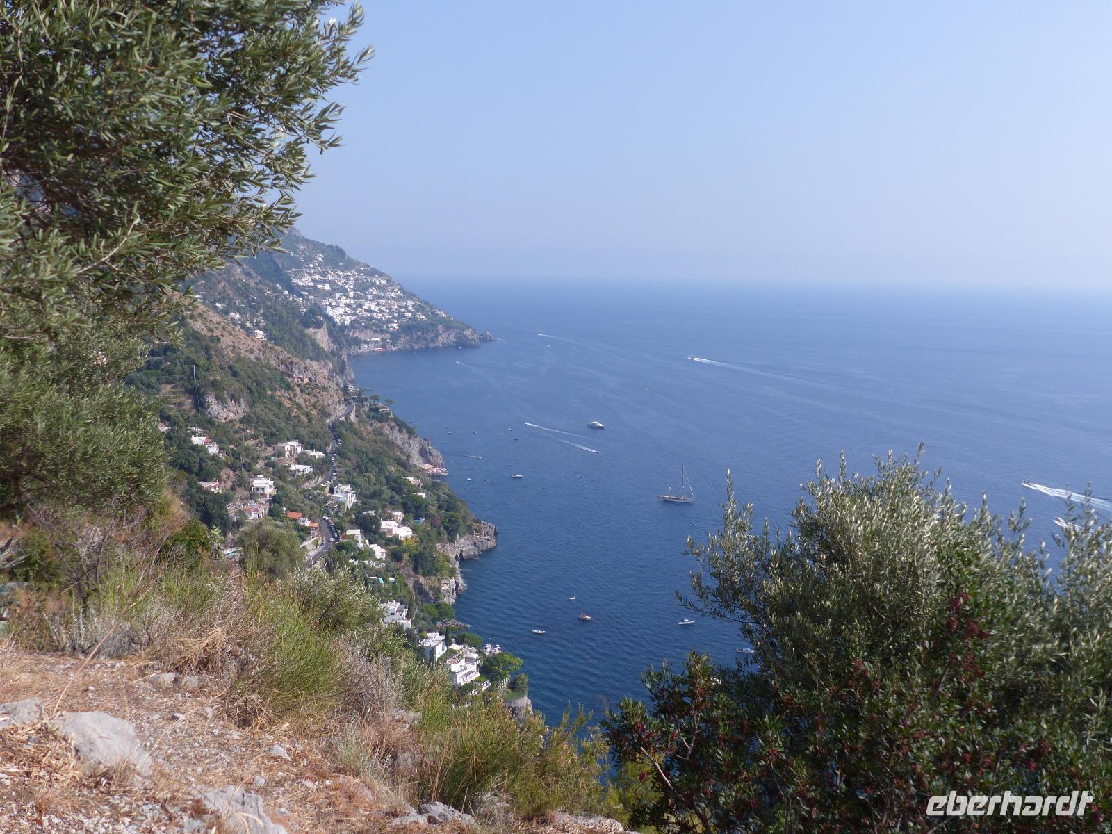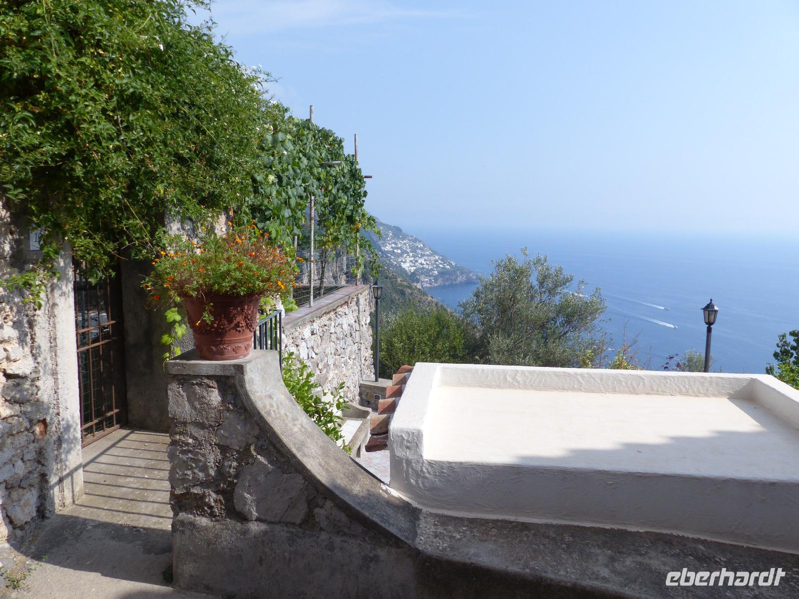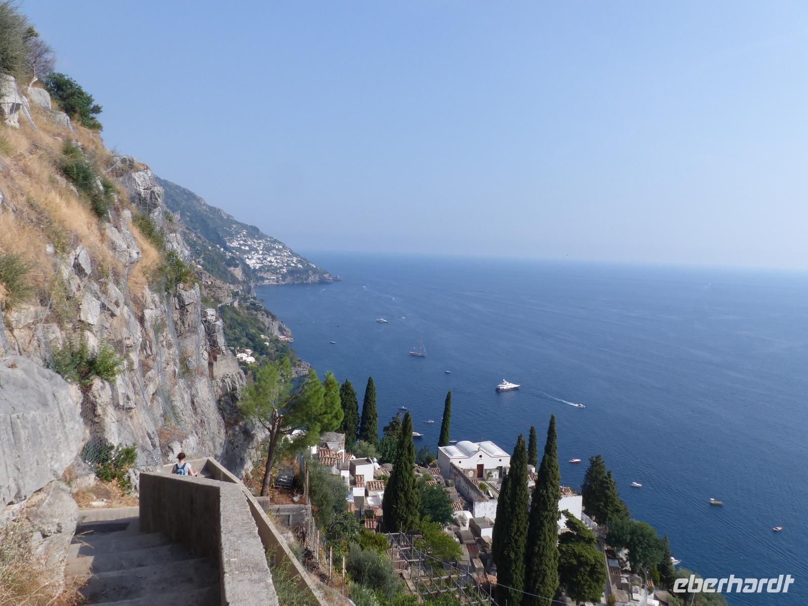 Die Götter empfingen uns zunächst mit wolkigem Himmel. In Bomerano gönnten wir uns also zunächst noch einen Kaffee. Dann ging's los. Auf einem Schild wird nun ausdrücklich jeder Wanderer auf das erforderliche Schuhwerk aufmerksam gemacht: Sandalen und Turnschuhe sind hier verboten! Scheinbar gibt es aber viele Analphabeten hier oben in den Bergen. Und das rächt sich bei manchem Urlauber... Nach einer knappen halben Stunde konnten wir einem Konzert lauschen, denn auch heute wieder standen Musiker am Wegesrand und ließen klassische Töne erklingen. Aber bald schon zogen wir weiter. Die Wolken lichteten sich Stück für Stück und es klarte langsam auf. Eine kleine Pause machten wir an einer aussichtsreichen Stelle unter einer Felswand. Unser Wandertempo war recht unterschiedlich und so zog sich die Gruppe über eine längere Strecke dahin, weil jeder sein eigenes Tempo gehen konnte. Ich blieb am Schluss, denn dort war meine Hilfe mehr gefragt als bei den flotten Wanderern an der Spitze. Da es kaum Weggabelungen gibt ist das normalerweise kein Problem. Aber heute wurde unsere Gruppe auseinander gerissen, was nicht an uns lag. Ein Helikopter tauchte bald schon auf und drehte merkwürdige Runden. Schließlich erreichten wir den Grund seines Flugmanövers: eine Dame, die diese Tour wohl ziemlich unterschätzt hatte, war gestürzt und hatte sich verletzt. Der Helikopter hatte den Arzt gebracht und nun wurde der Weg gesperrt. Die ersten unserer Gruppe mussten also in Nocelle rund eine halbe Stunde auf das hintere Ende der Gruppe warten. Wir am Ende erlebten die Bergung der Verletzten in unmittelbarer Nähe mit. Hut ab vor diesem Rettungstrupp, v.a. vor dem Piloten, der den Hubschrauber direkt über den Bäumen auf einer Stelle hielt! Nachdenklich wanderten wir schließlich weiter und trafen in Nocelle auf den Rest der Gruppe. Unsere Mittagspause erfolgte nun in Nocelle, einem kleinen Weiler, der hoch oben am Hang klebt. Hier erwartete uns mal wieder Leckeres aus der Küche. Sehr gute Antipasti - und wir hatten die ganze Terrasse für uns alleine. Einige Reisende nutzten nun den Bus, die anderen wanderten mit mir über einen Treppenweg bis nach Positano hinunter. Herrliches Wetter und wunderschöne Aussicht auf das blaue Meer war der Lohn. Dann erreichten wir die prächtigen Häuser mit ihren alten Portalen von Positano. Im Zentrum des Ortes drängten sich die Menschen und wir verließen Positano ohne lange zu zögern wieder. Den Rückweg traten wir übers Wasser an. Und im weichen Abendlicht erreichten wir Minori wieder.
