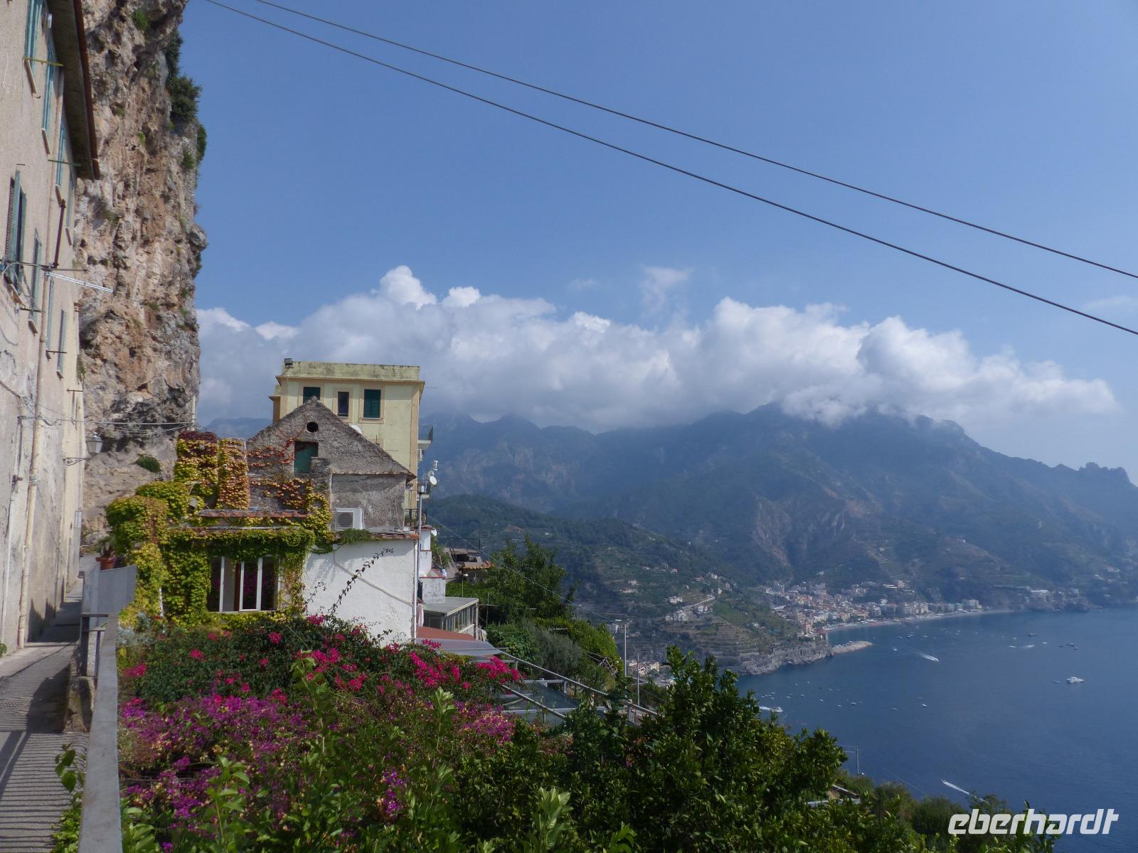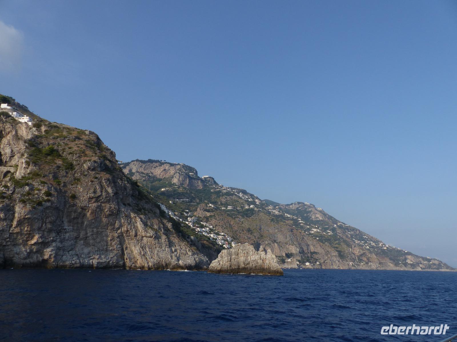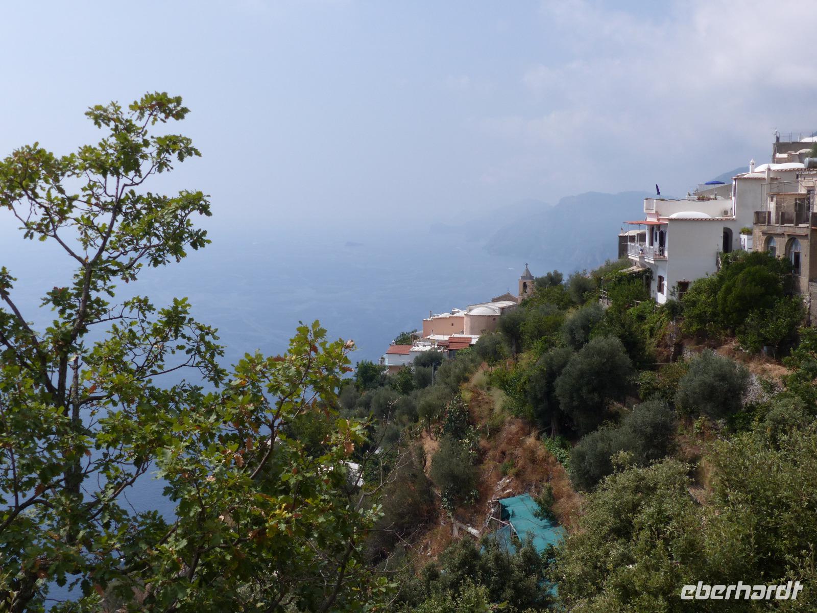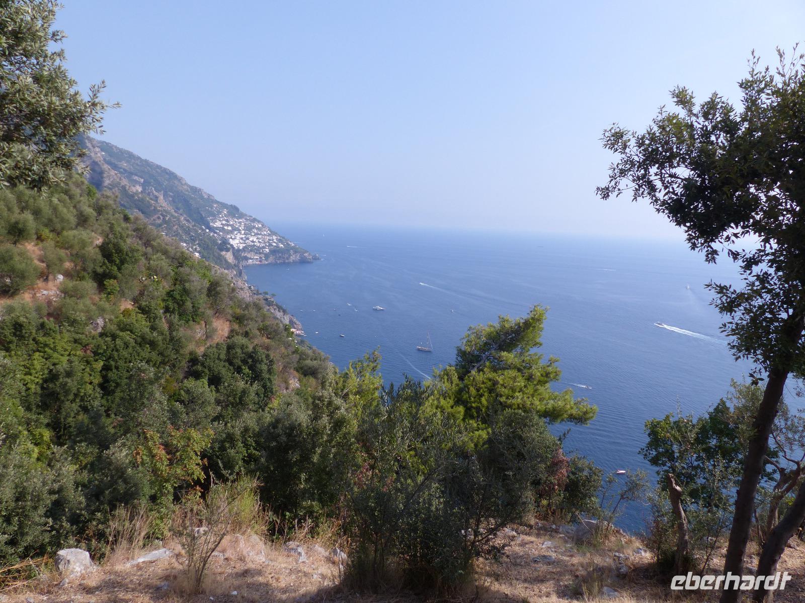 Die Götter empfingen uns zunächst mit wolkigem Himmel. In Bomerano gönnten wir uns also zunächst noch einen Kaffee. Dann ging's los. Auf einem Schild wird nun ausdrücklich jeder Wanderer auf das erforderliche Schuhwerk aufmerksam gemacht: Sandalen und Turnschuhe sind hier verboten! Scheinbar gibt es aber viele Analphabeten hier oben in den Bergen. Und das rächt sich bei manchem Urlauber... Nach einer knappen halben Stunde konnten wir einem Konzert lauschen, denn auch heute wieder standen Musiker am Wegesrand und ließen klassische Töne erklingen. Aber bald schon zogen wir weiter. Die Wolken lichteten sich Stück für Stück und es klarte langsam auf. Eine kleine Pause machten wir an einer aussichtsreichen Stelle unter einer Felswand. Unser Wandertempo war recht unterschiedlich und so zog sich die Gruppe über eine längere Strecke dahin, weil jeder sein eigenes Tempo gehen konnte. Ich blieb am Schluss, denn dort war meine Hilfe mehr gefragt als bei den flotten Wanderern an der Spitze. Da es kaum Weggabelungen gibt ist das normalerweise kein Problem. Aber heute wurde unsere Gruppe auseinander gerissen, was nicht an uns lag. Ein Helikopter tauchte bald schon auf und drehte merkwürdige Runden. Schließlich erreichten wir den Grund seines Flugmanövers: eine Dame, die diese Tour wohl ziemlich unterschätzt hatte, war gestürzt und hatte sich verletzt. Der Helikopter hatte den Arzt gebracht und nun wurde der Weg gesperrt. Die ersten unserer Gruppe mussten also in Nocelle rund eine halbe Stunde auf das hintere Ende der Gruppe warten. Wir am Ende erlebten die Bergung der Verletzten in unmittelbarer Nähe mit. Hut ab vor diesem Rettungstrupp, v.a. vor dem Piloten, der den Hubschrauber direkt über den Bäumen auf einer Stelle hielt! Nachdenklich wanderten wir schließlich weiter und trafen in Nocelle auf den Rest der Gruppe. Unsere Mittagspause erfolgte nun in Nocelle, einem kleinen Weiler, der hoch oben am Hang klebt. Hier erwartete uns mal wieder Leckeres aus der Küche. Sehr gute Antipasti - und wir hatten die ganze Terrasse für uns alleine. Einige Reisende nutzten nun den Bus, die anderen wanderten mit mir über einen Treppenweg bis nach Positano hinunter. Herrliches Wetter und wunderschöne Aussicht auf das blaue Meer war der Lohn. Dann erreichten wir die prächtigen Häuser mit ihren alten Portalen von Positano. Im Zentrum des Ortes drängten sich die Menschen und wir verließen Positano ohne lange zu zögern wieder. Den Rückweg traten wir übers Wasser an. Und im weichen Abendlicht erreichten wir Minori wieder.