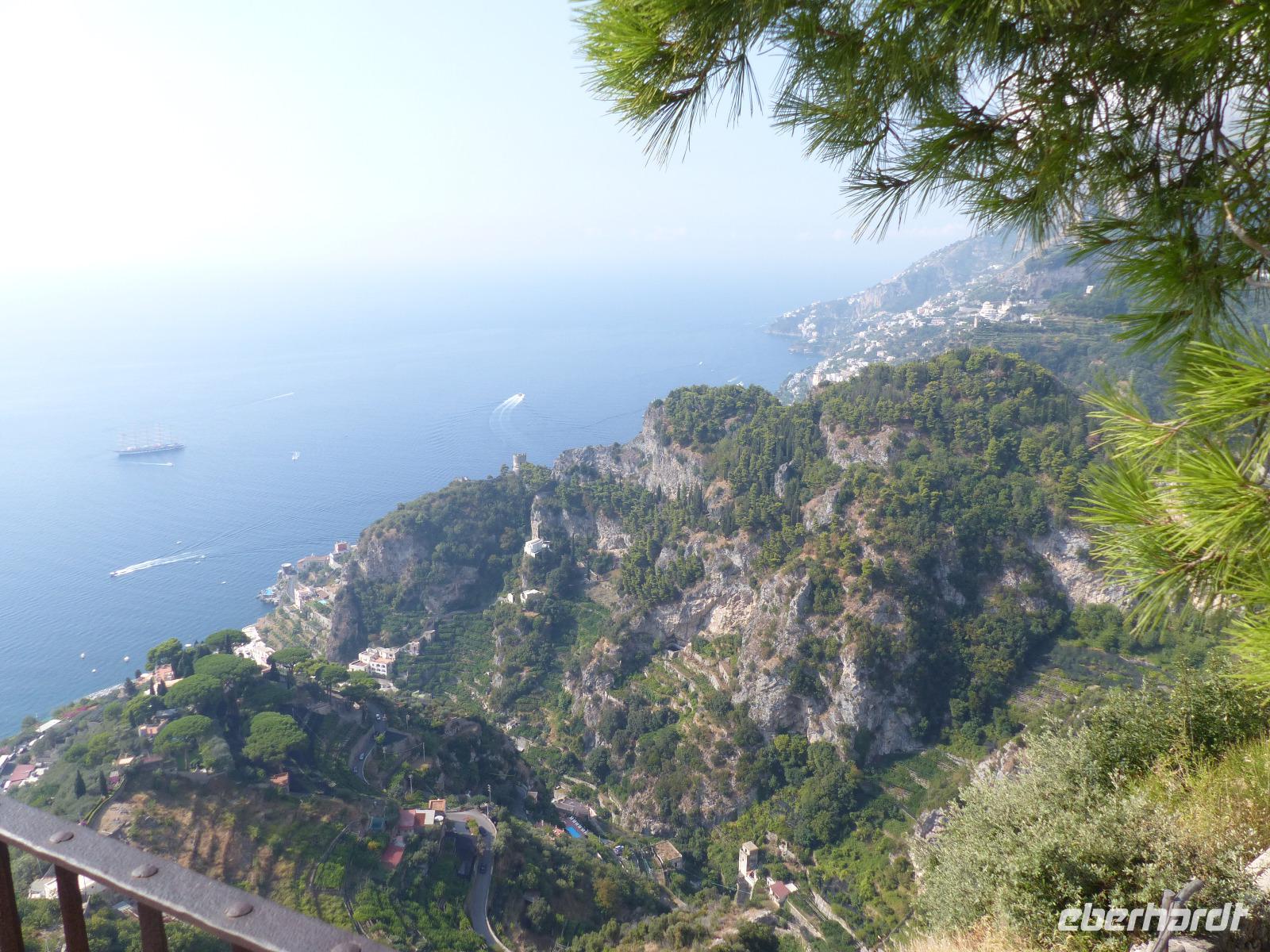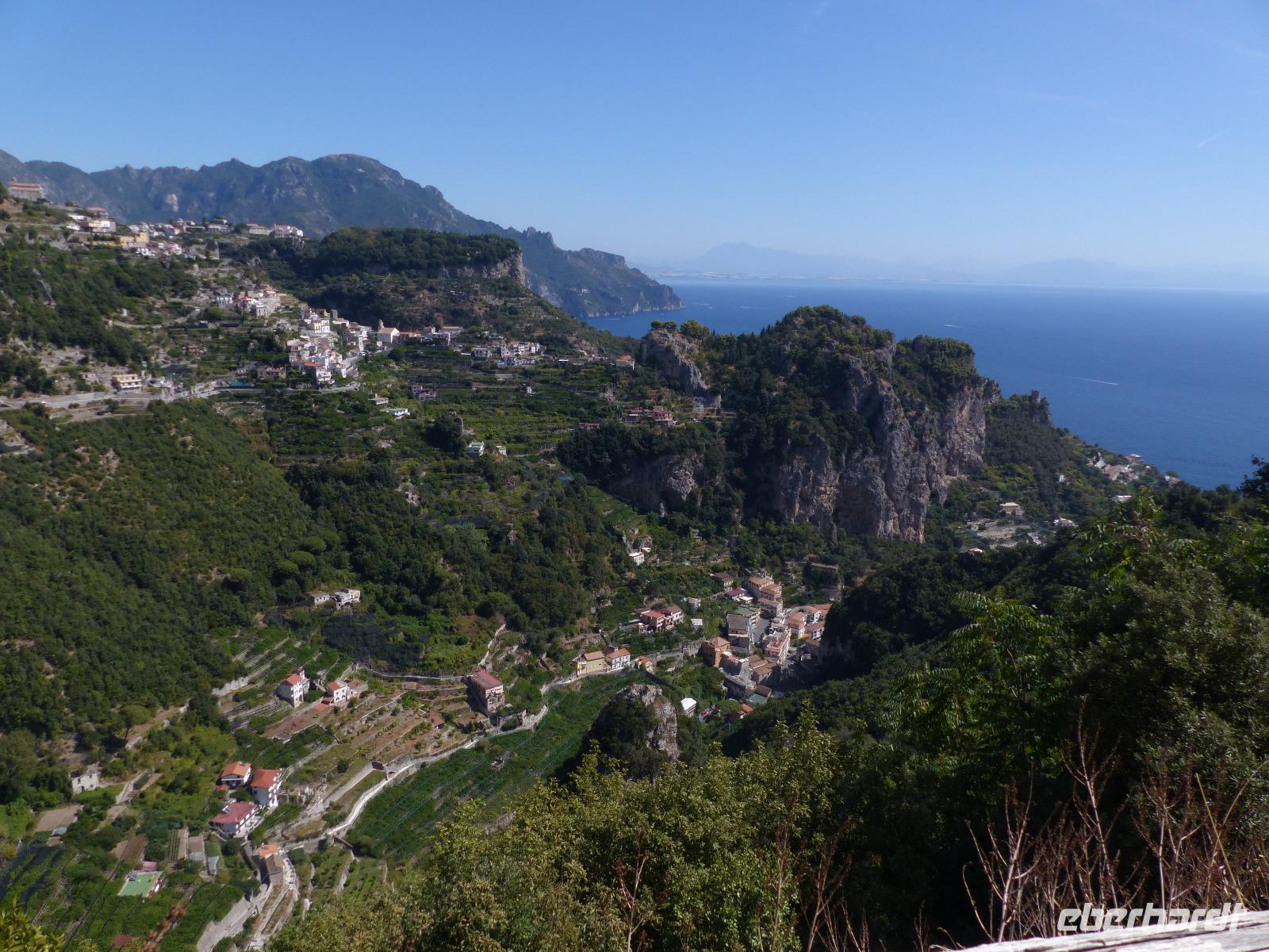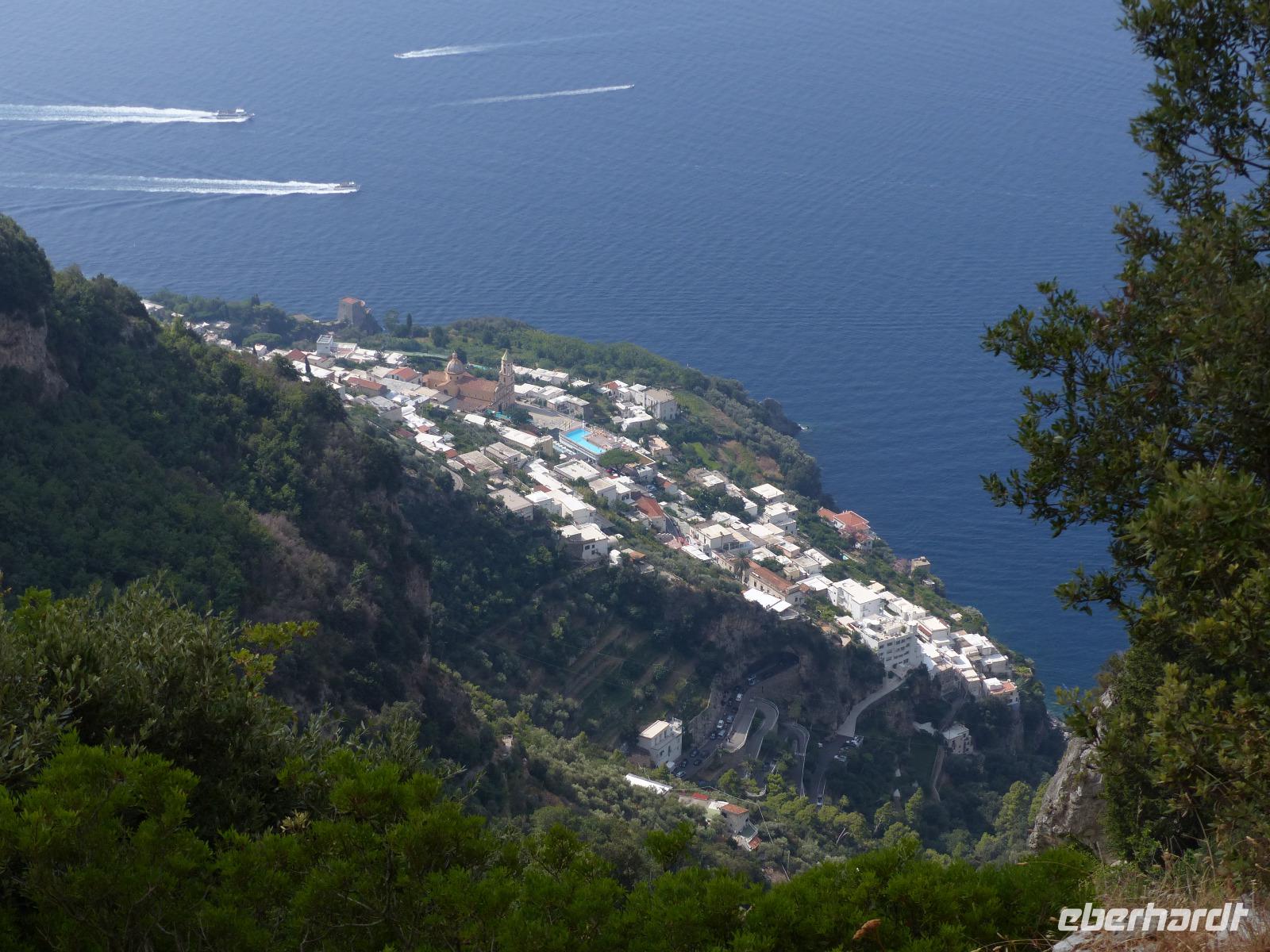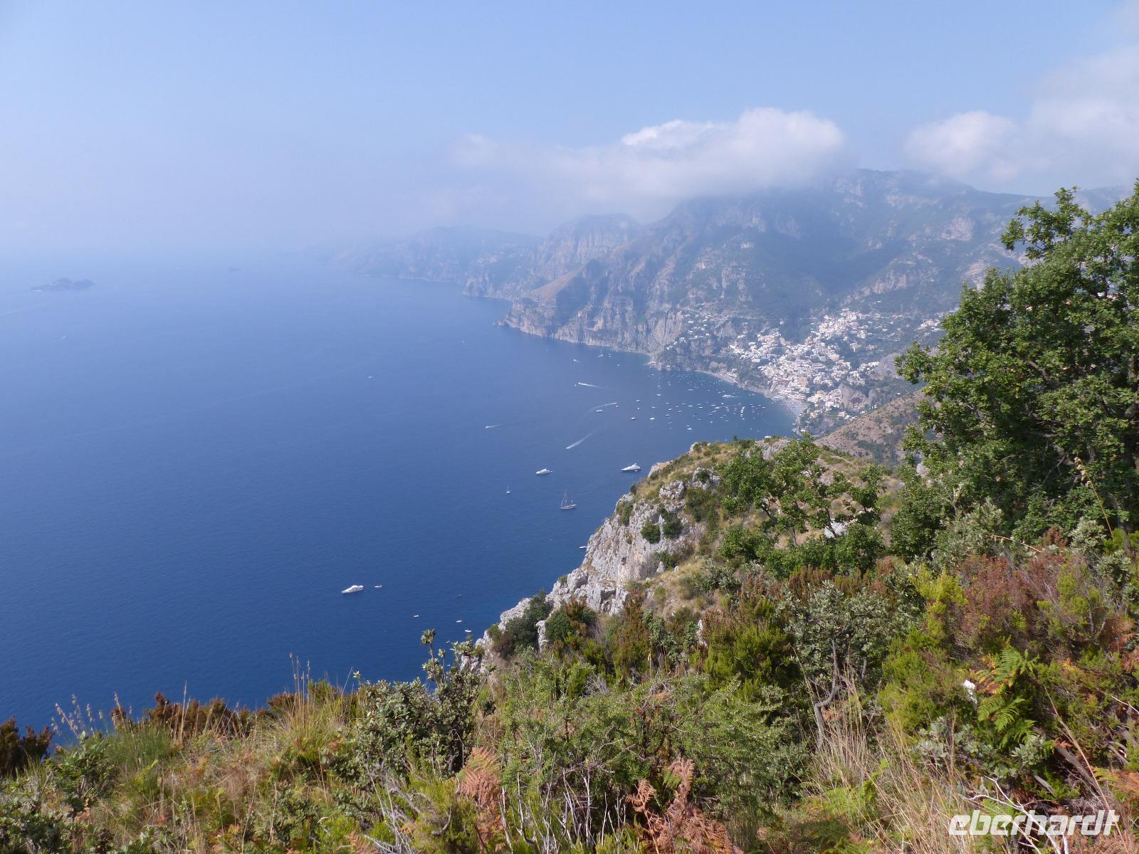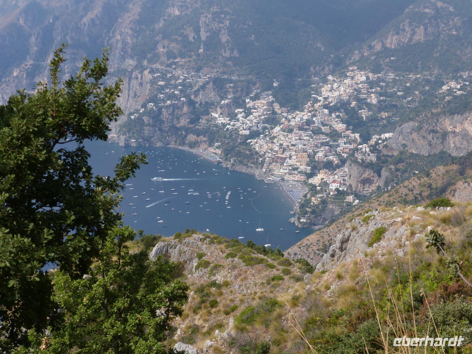Die Götter empfingen uns zunächst mit wolkigem Himmel. In Bomerano gönnten wir uns also zunächst noch einen Kaffee. Dann ging's los. Auf einem Schild wird nun ausdrücklich jeder Wanderer auf das erforderliche Schuhwerk aufmerksam gemacht: Sandalen und Turnschuhe sind hier verboten! Scheinbar gibt es aber viele Analphabeten hier oben in den Bergen. Und das rächt sich bei manchem Urlauber... Nach einer knappen halben Stunde konnten wir einem Konzert lauschen, denn auch heute wieder standen Musiker am Wegesrand und ließen klassische Töne erklingen. Aber bald schon zogen wir weiter. Die Wolken lichteten sich Stück für Stück und es klarte langsam auf. Eine kleine Pause machten wir an einer aussichtsreichen Stelle unter einer Felswand. Unser Wandertempo war recht unterschiedlich und so zog sich die Gruppe über eine längere Strecke dahin, weil jeder sein eigenes Tempo gehen konnte. Ich blieb am Schluss, denn dort war meine Hilfe mehr gefragt als bei den flotten Wanderern an der Spitze. Da es kaum Weggabelungen gibt ist das normalerweise kein Problem. Aber heute wurde unsere Gruppe auseinander gerissen, was nicht an uns lag. Ein Helikopter tauchte bald schon auf und drehte merkwürdige Runden. Schließlich erreichten wir den Grund seines Flugmanövers: eine Dame, die diese Tour wohl ziemlich unterschätzt hatte, war gestürzt und hatte sich verletzt. Der Helikopter hatte den Arzt gebracht und nun wurde der Weg gesperrt. Die ersten unserer Gruppe mussten also in Nocelle rund eine halbe Stunde auf das hintere Ende der Gruppe warten. Wir am Ende erlebten die Bergung der Verletzten in unmittelbarer Nähe mit. Hut ab vor diesem Rettungstrupp, v.a. vor dem Piloten, der den Hubschrauber direkt über den Bäumen auf einer Stelle hielt! Nachdenklich wanderten wir schließlich weiter und trafen in Nocelle auf den Rest der Gruppe. Unsere Mittagspause erfolgte nun in Nocelle, einem kleinen Weiler, der hoch oben am Hang klebt. Hier erwartete uns mal wieder Leckeres aus der Küche. Sehr gute Antipasti - und wir hatten die ganze Terrasse für uns alleine. Einige Reisende nutzten nun den Bus, die anderen wanderten mit mir über einen Treppenweg bis nach Positano hinunter. Herrliches Wetter und wunderschöne Aussicht auf das blaue Meer war der Lohn. Dann erreichten wir die prächtigen Häuser mit ihren alten Portalen von Positano. Im Zentrum des Ortes drängten sich die Menschen und wir verließen Positano ohne lange zu zögern wieder. Den Rückweg traten wir übers Wasser an. Und im weichen Abendlicht erreichten wir Minori wieder.