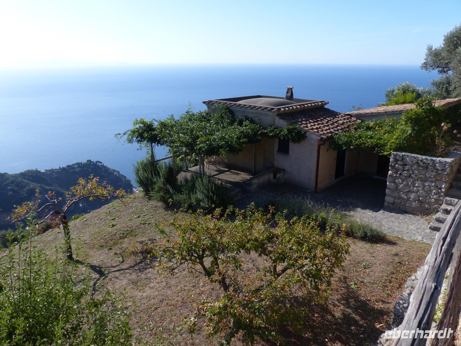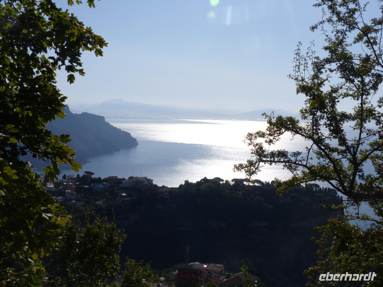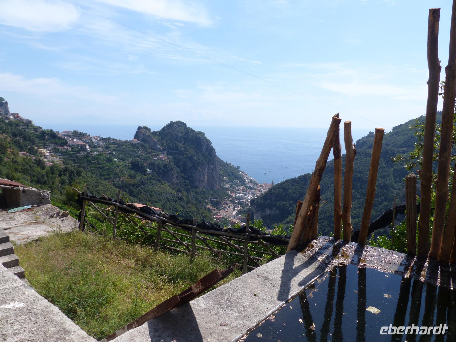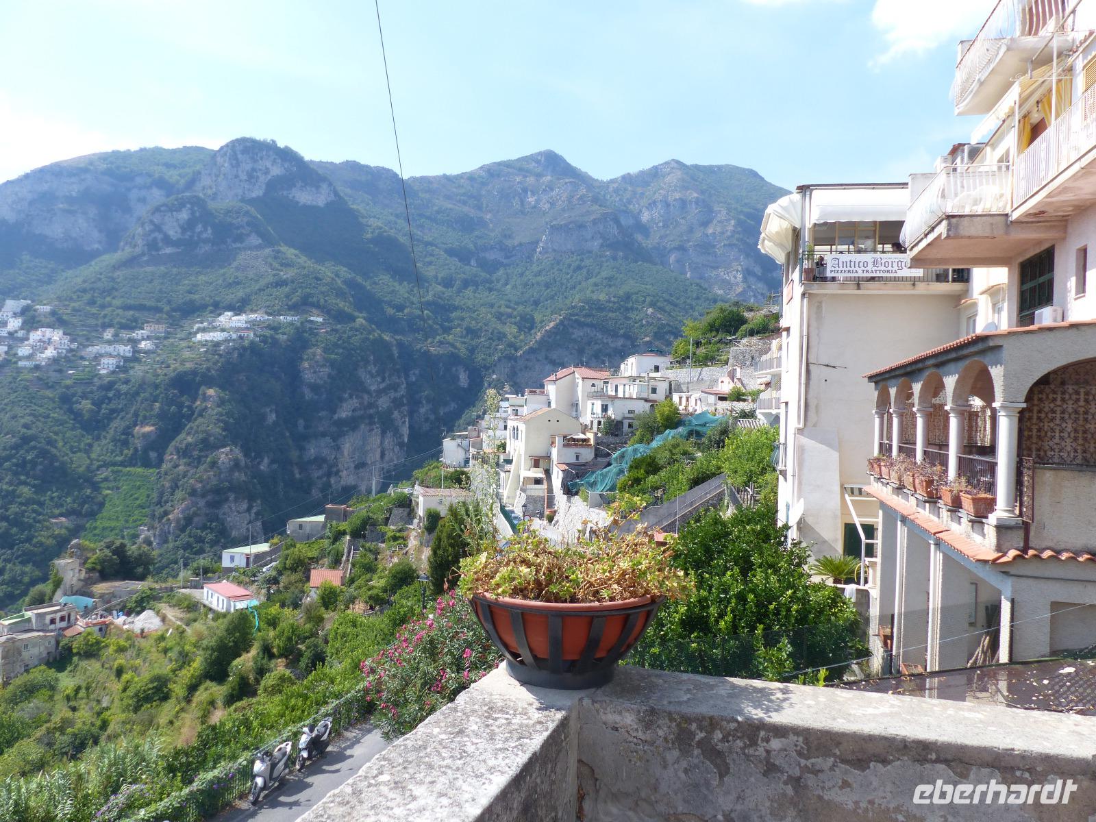 Die Götter empfingen uns zunächst mit wolkigem Himmel. In Bomerano gönnten wir uns also zunächst noch einen Kaffee. Dann ging's los. Auf einem Schild wird nun ausdrücklich jeder Wanderer auf das erforderliche Schuhwerk aufmerksam gemacht: Sandalen und Turnschuhe sind hier verboten! Scheinbar gibt es aber viele Analphabeten hier oben in den Bergen. Und das rächt sich bei manchem Urlauber... Nach einer knappen halben Stunde konnten wir einem Konzert lauschen, denn auch heute wieder standen Musiker am Wegesrand und ließen klassische Töne erklingen. Aber bald schon zogen wir weiter. Die Wolken lichteten sich Stück für Stück und es klarte langsam auf. Eine kleine Pause machten wir an einer aussichtsreichen Stelle unter einer Felswand. Unser Wandertempo war recht unterschiedlich und so zog sich die Gruppe über eine längere Strecke dahin, weil jeder sein eigenes Tempo gehen konnte. Ich blieb am Schluss, denn dort war meine Hilfe mehr gefragt als bei den flotten Wanderern an der Spitze. Da es kaum Weggabelungen gibt ist das normalerweise kein Problem. Aber heute wurde unsere Gruppe auseinander gerissen, was nicht an uns lag. Ein Helikopter tauchte bald schon auf und drehte merkwürdige Runden. Schließlich erreichten wir den Grund seines Flugmanövers: eine Dame, die diese Tour wohl ziemlich unterschätzt hatte, war gestürzt und hatte sich verletzt. Der Helikopter hatte den Arzt gebracht und nun wurde der Weg gesperrt. Die ersten unserer Gruppe mussten also in Nocelle rund eine halbe Stunde auf das hintere Ende der Gruppe warten. Wir am Ende erlebten die Bergung der Verletzten in unmittelbarer Nähe mit. Hut ab vor diesem Rettungstrupp, v.a. vor dem Piloten, der den Hubschrauber direkt über den Bäumen auf einer Stelle hielt! Nachdenklich wanderten wir schließlich weiter und trafen in Nocelle auf den Rest der Gruppe. Unsere Mittagspause erfolgte nun in Nocelle, einem kleinen Weiler, der hoch oben am Hang klebt. Hier erwartete uns mal wieder Leckeres aus der Küche. Sehr gute Antipasti - und wir hatten die ganze Terrasse für uns alleine. Einige Reisende nutzten nun den Bus, die anderen wanderten mit mir über einen Treppenweg bis nach Positano hinunter. Herrliches Wetter und wunderschöne Aussicht auf das blaue Meer war der Lohn. Dann erreichten wir die prächtigen Häuser mit ihren alten Portalen von Positano. Im Zentrum des Ortes drängten sich die Menschen und wir verließen Positano ohne lange zu zögern wieder. Den Rückweg traten wir übers Wasser an. Und im weichen Abendlicht erreichten wir Minori wieder.
