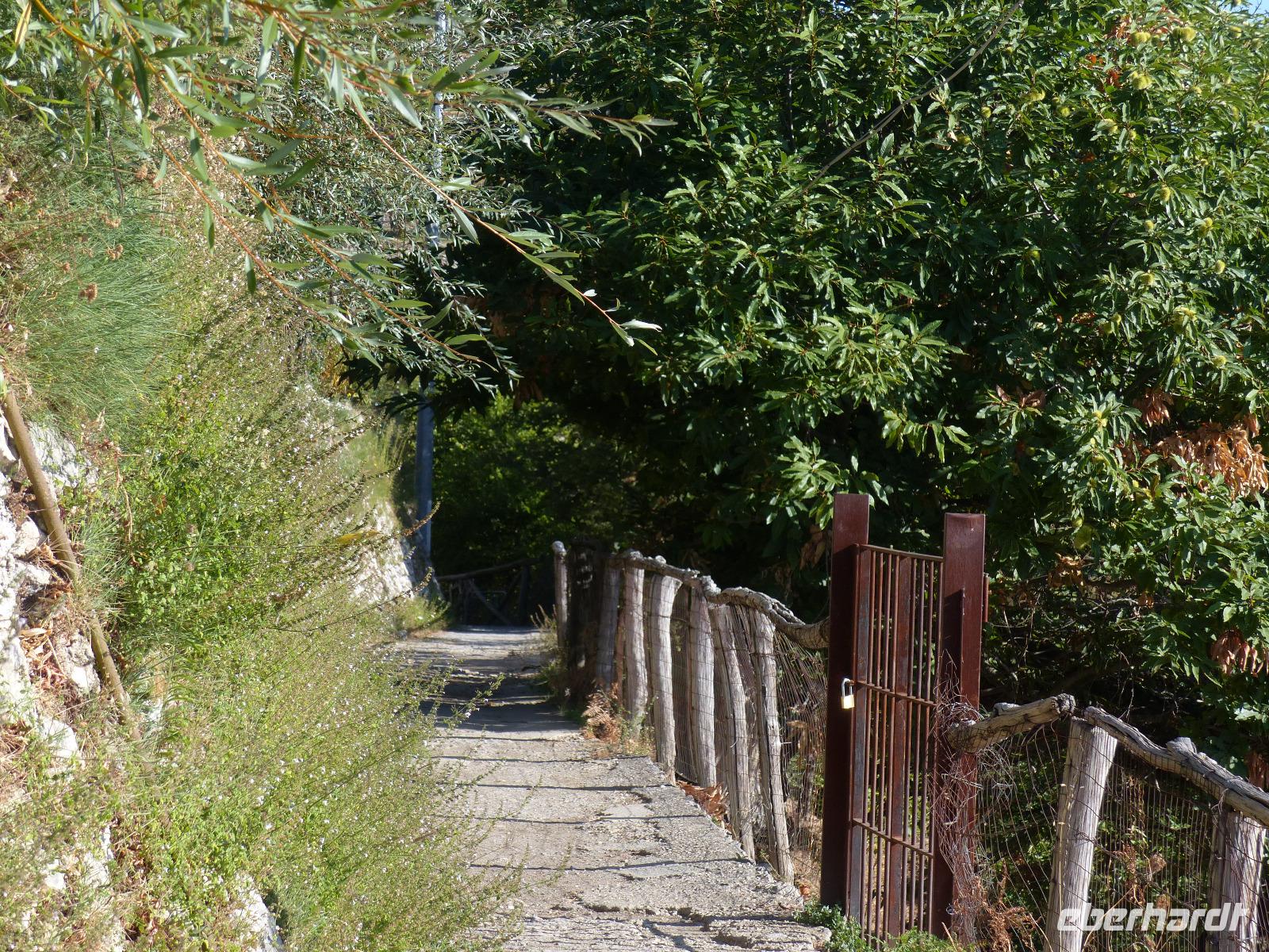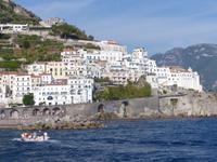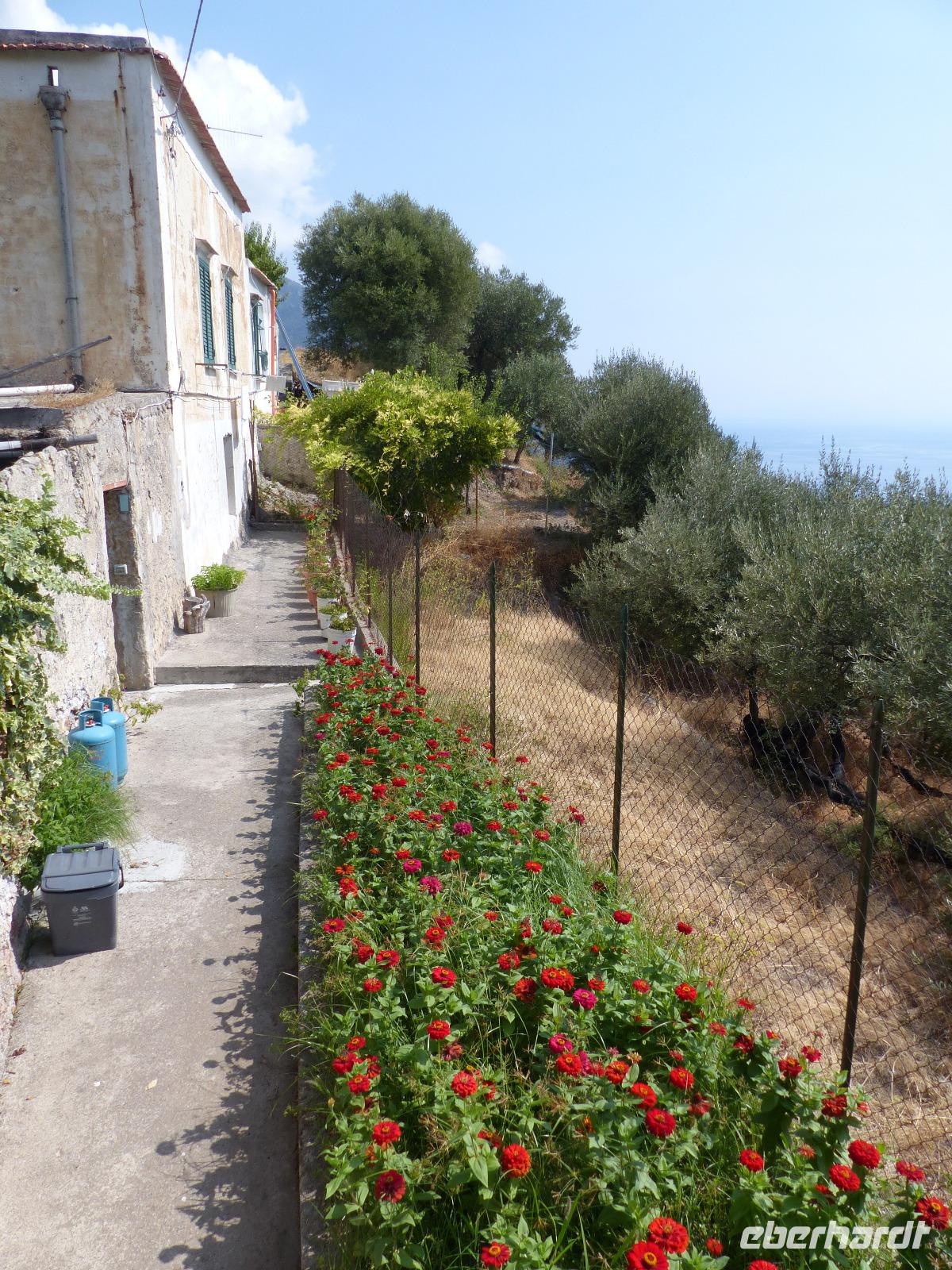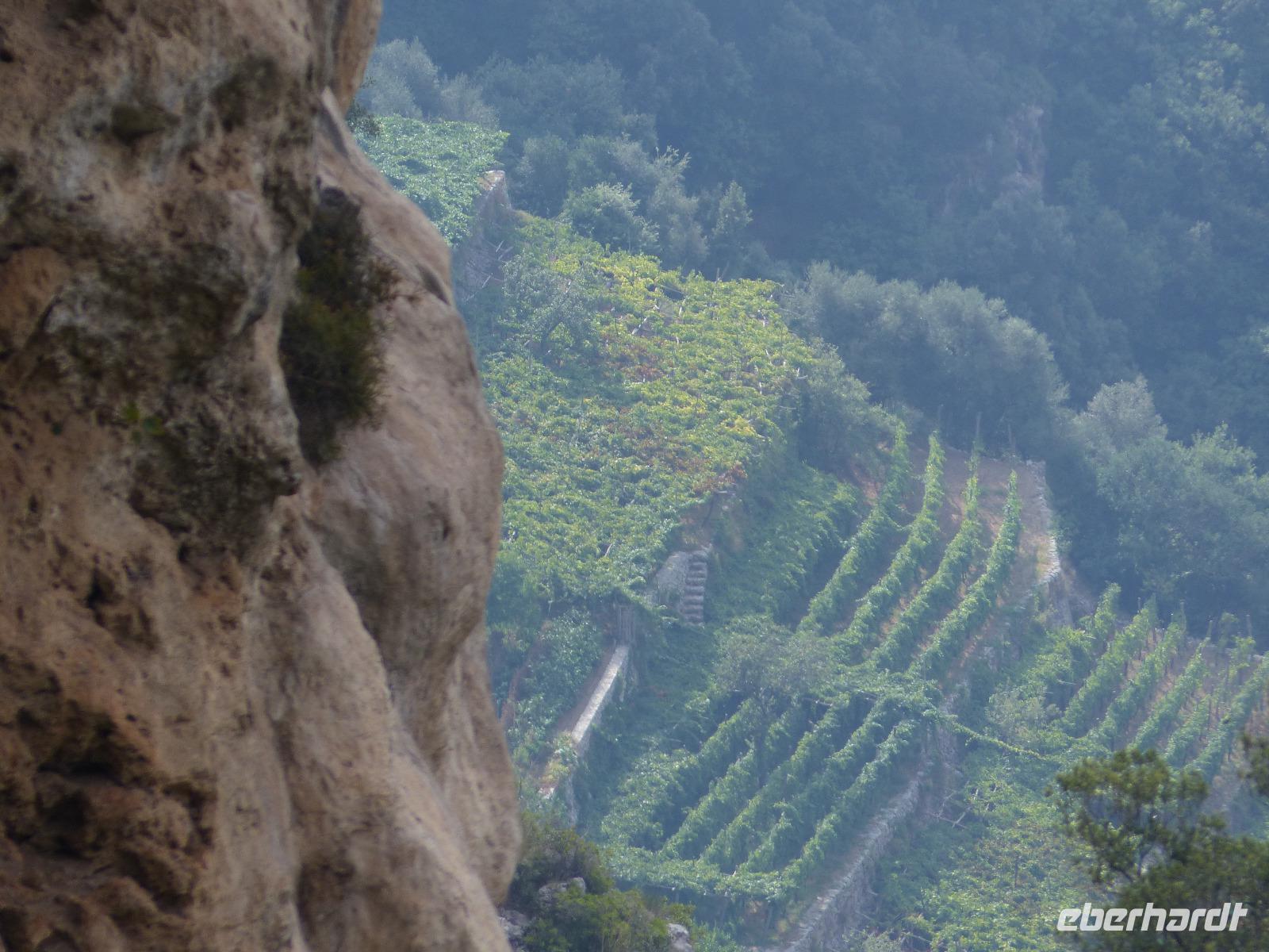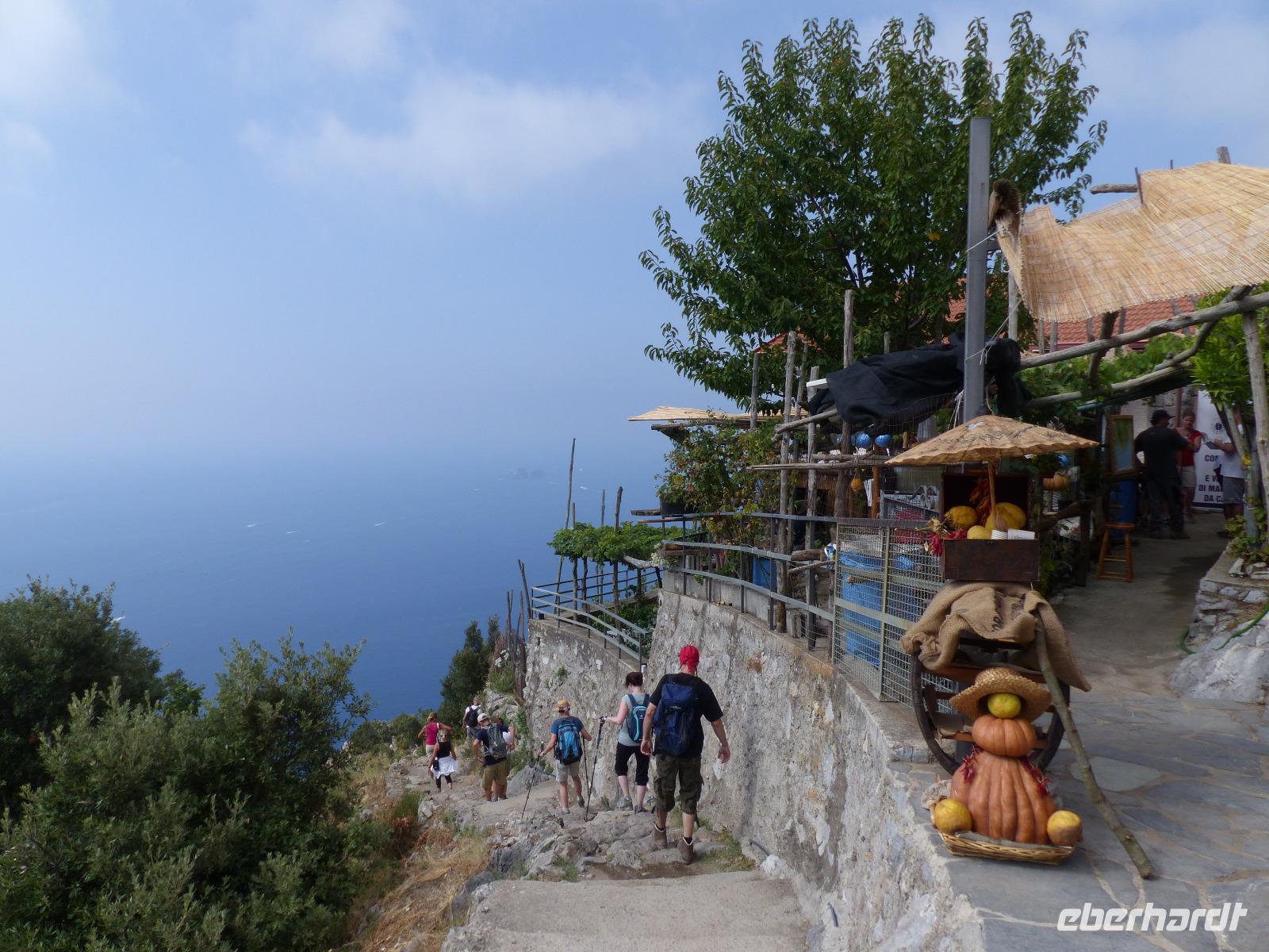 Die Götter empfingen uns zunächst mit wolkigem Himmel. In Bomerano gönnten wir uns also zunächst noch einen Kaffee. Dann ging's los. Auf einem Schild wird nun ausdrücklich jeder Wanderer auf das erforderliche Schuhwerk aufmerksam gemacht: Sandalen und Turnschuhe sind hier verboten! Scheinbar gibt es aber viele Analphabeten hier oben in den Bergen. Und das rächt sich bei manchem Urlauber... Nach einer knappen halben Stunde konnten wir einem Konzert lauschen, denn auch heute wieder standen Musiker am Wegesrand und ließen klassische Töne erklingen. Aber bald schon zogen wir weiter. Die Wolken lichteten sich Stück für Stück und es klarte langsam auf. Eine kleine Pause machten wir an einer aussichtsreichen Stelle unter einer Felswand. Unser Wandertempo war recht unterschiedlich und so zog sich die Gruppe über eine längere Strecke dahin, weil jeder sein eigenes Tempo gehen konnte. Ich blieb am Schluss, denn dort war meine Hilfe mehr gefragt als bei den flotten Wanderern an der Spitze. Da es kaum Weggabelungen gibt ist das normalerweise kein Problem. Aber heute wurde unsere Gruppe auseinander gerissen, was nicht an uns lag. Ein Helikopter tauchte bald schon auf und drehte merkwürdige Runden. Schließlich erreichten wir den Grund seines Flugmanövers: eine Dame, die diese Tour wohl ziemlich unterschätzt hatte, war gestürzt und hatte sich verletzt. Der Helikopter hatte den Arzt gebracht und nun wurde der Weg gesperrt. Die ersten unserer Gruppe mussten also in Nocelle rund eine halbe Stunde auf das hintere Ende der Gruppe warten. Wir am Ende erlebten die Bergung der Verletzten in unmittelbarer Nähe mit. Hut ab vor diesem Rettungstrupp, v.a. vor dem Piloten, der den Hubschrauber direkt über den Bäumen auf einer Stelle hielt! Nachdenklich wanderten wir schließlich weiter und trafen in Nocelle auf den Rest der Gruppe. Unsere Mittagspause erfolgte nun in Nocelle, einem kleinen Weiler, der hoch oben am Hang klebt. Hier erwartete uns mal wieder Leckeres aus der Küche. Sehr gute Antipasti - und wir hatten die ganze Terrasse für uns alleine. Einige Reisende nutzten nun den Bus, die anderen wanderten mit mir über einen Treppenweg bis nach Positano hinunter. Herrliches Wetter und wunderschöne Aussicht auf das blaue Meer war der Lohn. Dann erreichten wir die prächtigen Häuser mit ihren alten Portalen von Positano. Im Zentrum des Ortes drängten sich die Menschen und wir verließen Positano ohne lange zu zögern wieder. Den Rückweg traten wir übers Wasser an. Und im weichen Abendlicht erreichten wir Minori wieder.