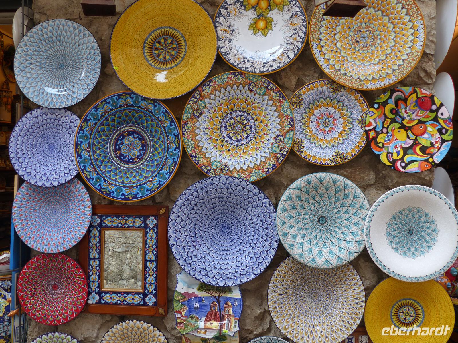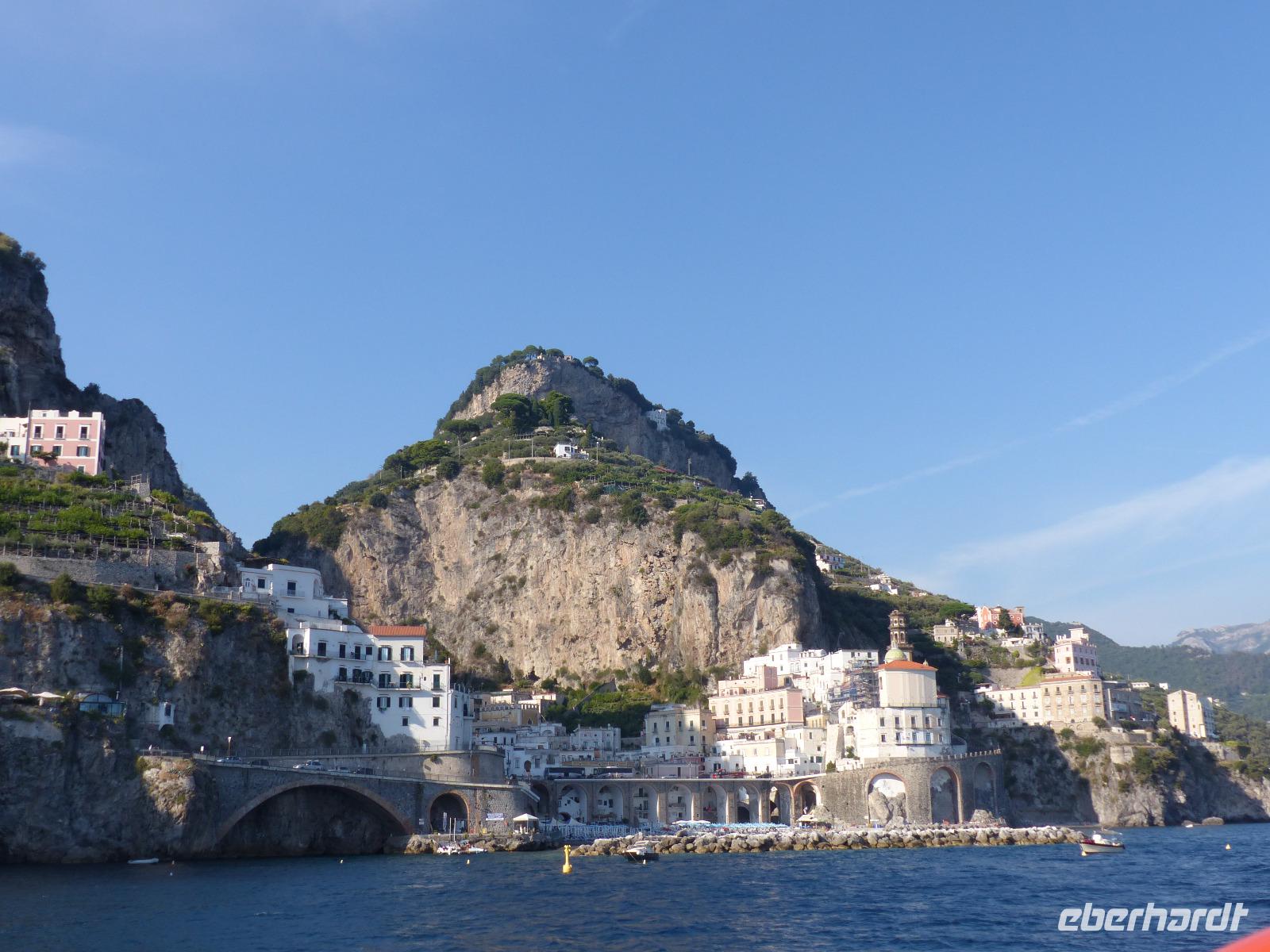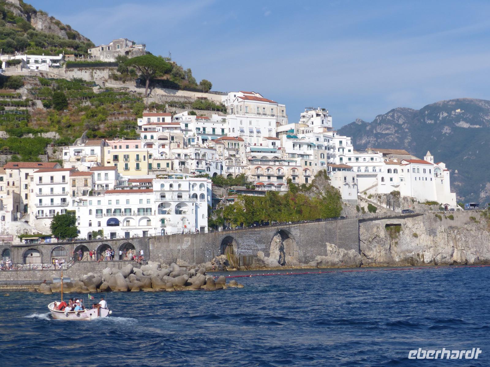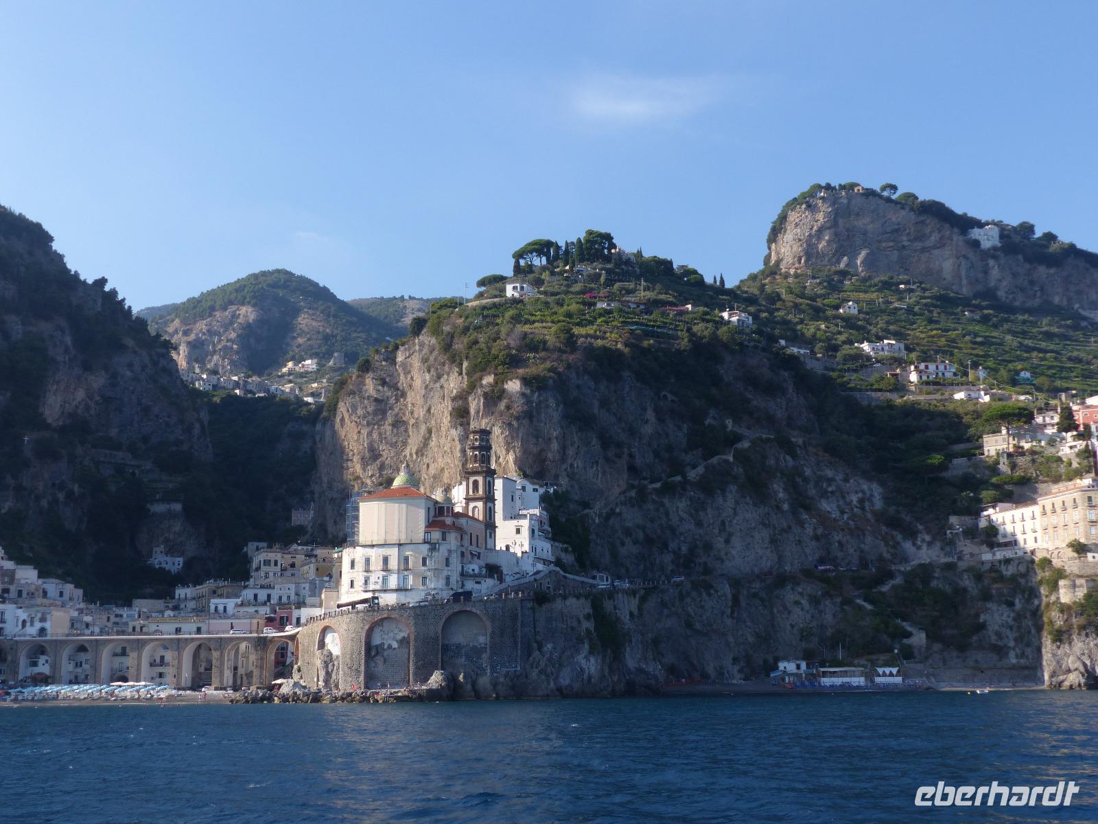 Dieses Mal reisten die Gäste ohne die Reiseleiterin an. Die kam nämlich aus Genua direkt von der letzten Reise nach Neapel angeflogen. Alle Dresdner, Leipziger, Berliner und die Gäste, die von Frankfurt abgeflogen waren, erreichten ohne große Schwierigkeiten Neapel. Ich stand dort schon am Gepäckband und erkannte meine Gäste an den Eberhardt-Schildchen und Kofferbändern sofort. Nun mussten wir allerdings gemeinsam noch ein bisschen warten, denn die Maschine aus München, auf die wir eigentlich nur 15 Minuten hätten warten sollen, hatte Verspätung. Aber auch diese Gäste kamen samt Koffern schließlich an und wir fuhren gemeinsam los. Wir sausten mit unserem Bus auf der Autobahn am Vesuv vorüber und erreichten schließlich Vietri sul Mare, die Pforte zur Amalfitana. Farbenfroh leuchtete uns das Kirchturmdach entgegen: Blau, gelb und grün. Der Himmel und das Meer sind blau, gelb die Zitronen und grün ist das Land. Die Straße windet sich hinter Vietri auf halber Höhe aussichtsreich an der Steilküste entlang. Überall hingen Zitronen an den Pergolen. Wir haben das Blau, Grün und Gelb also gleich zu sehen bekommen. Und wir bekamen einen Vorgeschmack auf das Verkehrschaos an der Küste. „Wie gut dass ich nun nicht am Steuer sitzen muss," so ein Gästekommentar. Bald schon war Minori erreicht und den Nachmittag verbrachten wir bummelnd und badend am Strand, denn es war noch kräftig warm in Süditalien. Unsere Reise hatte uns den Sommer zurückgebracht. Unsere Düsseldorfer, die schon sehr früh angereist waren, verbrachten fast den ganzen Tag schon in Minori. Die Stuttgarter dagegen mussten zwar morgens nicht so früh aufstehen, erreichten Minori aber erst am Abend. Minori ist einer der wenigen Orte an der Amalfitana, der sich sein italienisches Flair bewahrt hat. Im Hotel trafen alle Gäste schließlich zusammen und wir ließen uns das leckere Abendessen im Hotel gut schmecken. So ging unser Anreisetag genussvoll zu Ende.