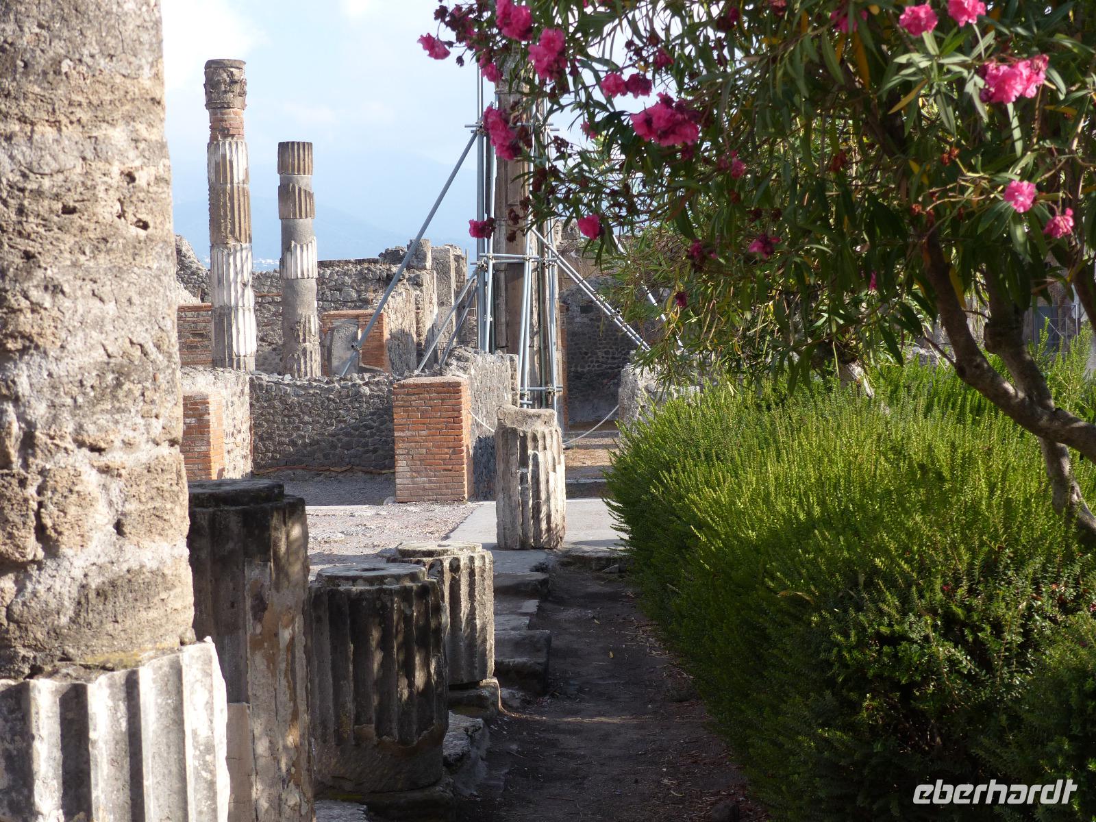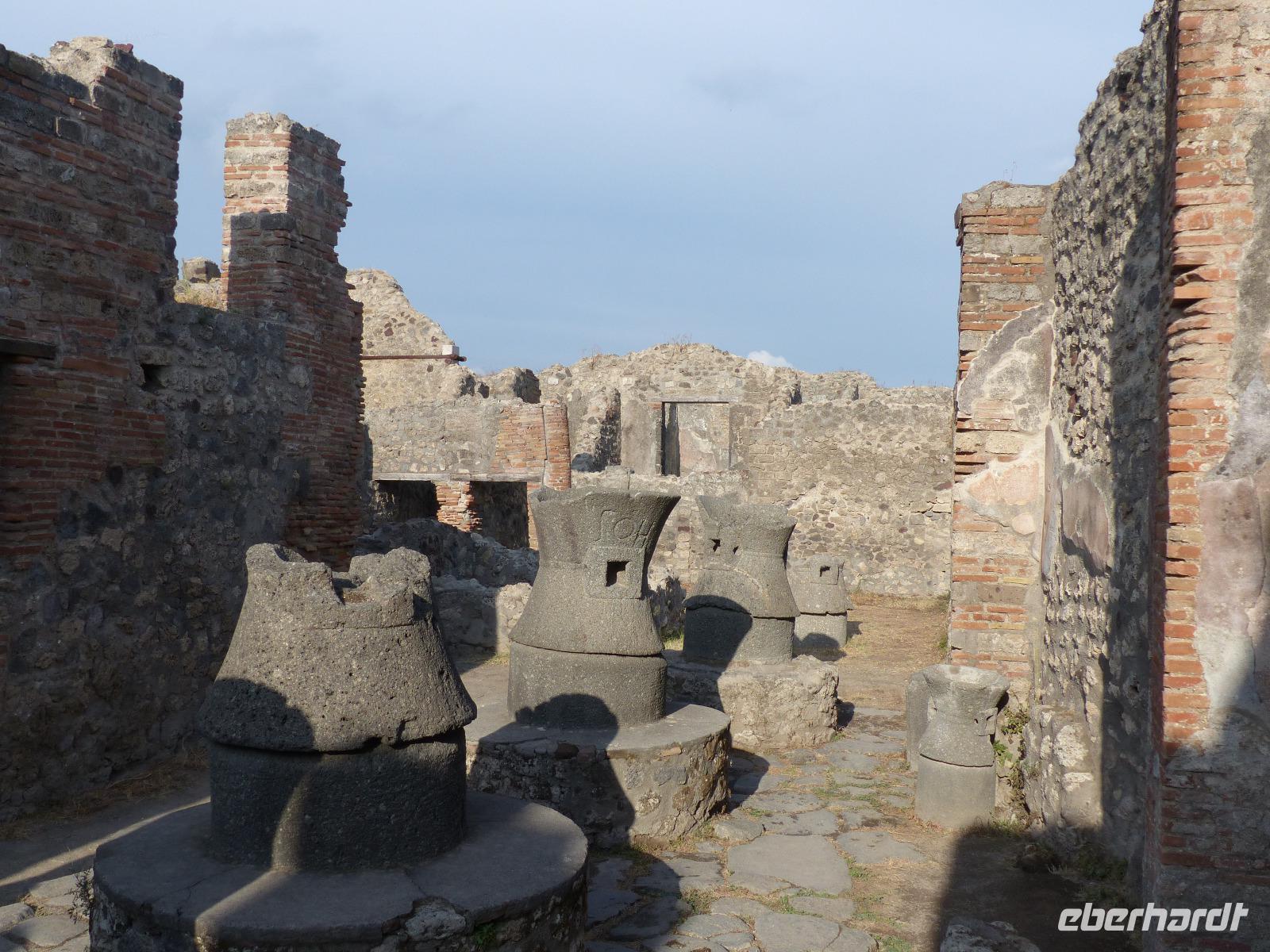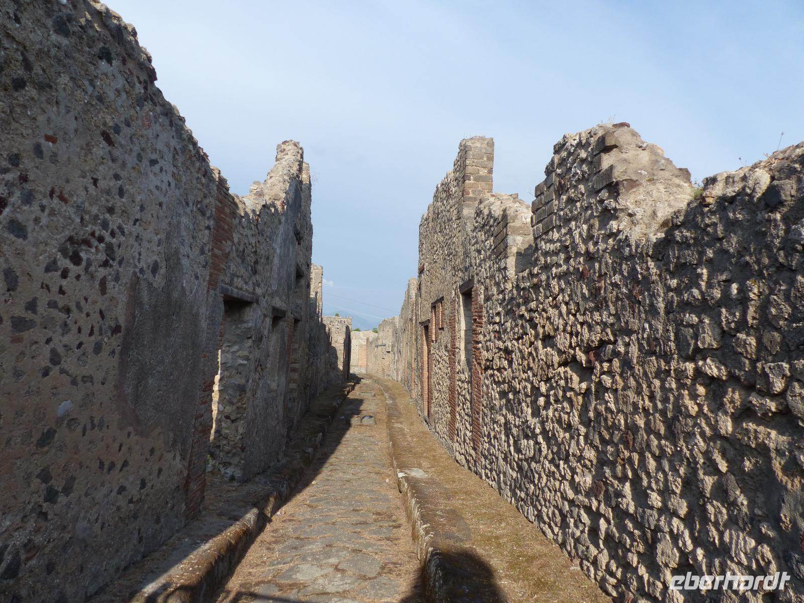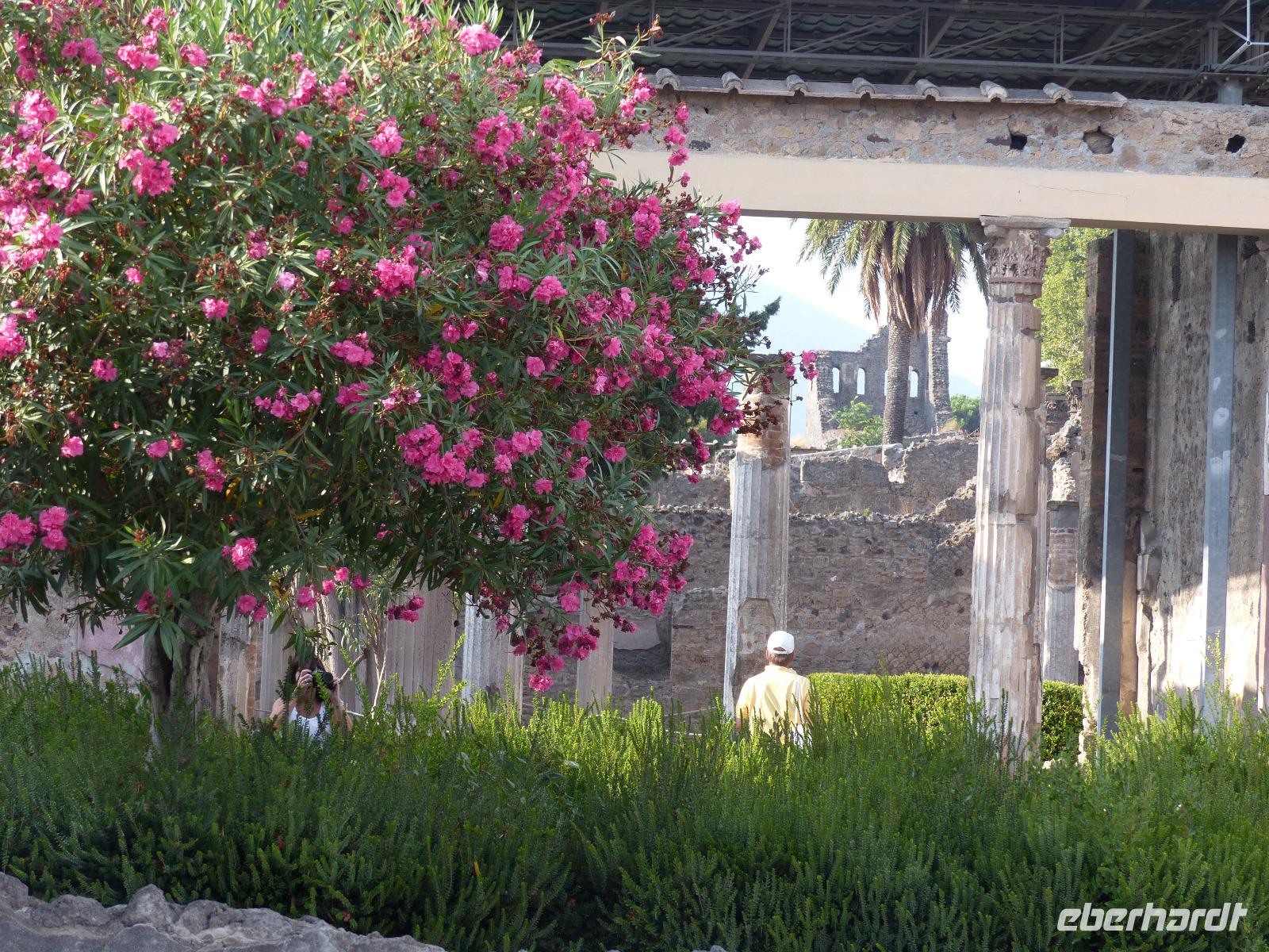 Die Blasen an der Ferse plagten einen Gast doch sehr und so zogen wir nicht ganz vollständig los. Ein anderer hatte sich vor ein paar Tagen schon einige weniger schöne blaue Flecken an der Wade zugezogen, ließ sich aber von diesen nicht zurückhalten. Wir starteten also auf der Küstenstraße in Richtung Vietri sul Mare, genossen die herrlichen Blicke auf die Küste und die Tatsache, dass wir hier selbst nicht hinterm Steuer saßen. Dann sausten wir über die Autobahn zum Vesuv und fuhren hoch bis zum Parkplatz. Die Wettervorhersage war nicht gut und die Wolkenberge wirkten ein bisschen bedrohlich. „Um 12 Uhr geht's los, dann solltet Ihr nicht mehr oben sein" sagte mir ein Ortskundiger. Wir verzichteten also auf die Führung am Kraterrand und gingen direkt hoch bis zur Bergstation der Funicolare, genauer gesagt zu dem was von ihr nach dem letzten Vulkanausbruch 1944 noch übrig ist. Ein paar Blicke in den Krater hinein, ein paar Blicke nach Neapel runter an die Küste - und ab ging's in flottem Schritt den Berg wieder hinunter. Um 11:45 Uhr fielen die ersten Tropfen, aber bevor es richtig losging mit dem Gewitter saßen wir wieder im Bus und fuhren abwärts. Raffaele, unser Fahrer, hatte ein bisschen Mühe unser nächstes Ziel zu finden, denn das Weingut der Familie Setara liegt ziemlich gut versteckt in einem sehr engen Sträßchen. Wie hat man das früher bloß geschafft, als es noch keine Handys gab...? Raffaele bekam übers Telefon den Weg erklärt. Wir erprobten nun die Tränen Christi. So wird der Wein genannt, der am Vesuv wächst. Und dazu gab es wieder etwas Leckeres zum Essen. Am Nachmittag folgte dann ein Besuch in Pompei. „Weiter!" - dieses Wort wird uns in Erinnerung bleiben. Antonio beförderte uns im Sauseschritt durch die Überreste der antiken Stadt. Sein Wissen, das er mit uns teilen wollte, war sehr groß. Und seine Schritte auch. Das Marinetor, die Basilika, der Apollontempel, das Forum, das Macellum, die Villa des Fauns, eine Bäckerei, die Thermen, das Freudenhaus, das Odeon, die Gladiatorenunterkünfte - überall sind wir gewesen. Und alles wurde uns von Antonio in Windeseile erklärt. Am Forum warfen wir auch einen Blick auf die Gipsfiguren, die die gefundenen Hohlräume abbilden, die die Toten in Pompei hinterlassen haben. Ein Hund, ein Kind, ein Mann. So wie sie diese Welt verließen. Müde aber voller neuer Eindrücke erreichten wir am Abend unseren Bus und bald schon flitzten wir über die Autobahn und fuhren am Abend über die Monte Lateri, die Milchberge, hoch auf einen Pass, der uns durch die Bergdörfer Tramonti brachte, die im Gebirge zwischen Weinbergen zerstreut liegen. Heute Abend blieb uns keine Zeit zum Baden, aber ein gutes Essen wartete wie immer auf uns.