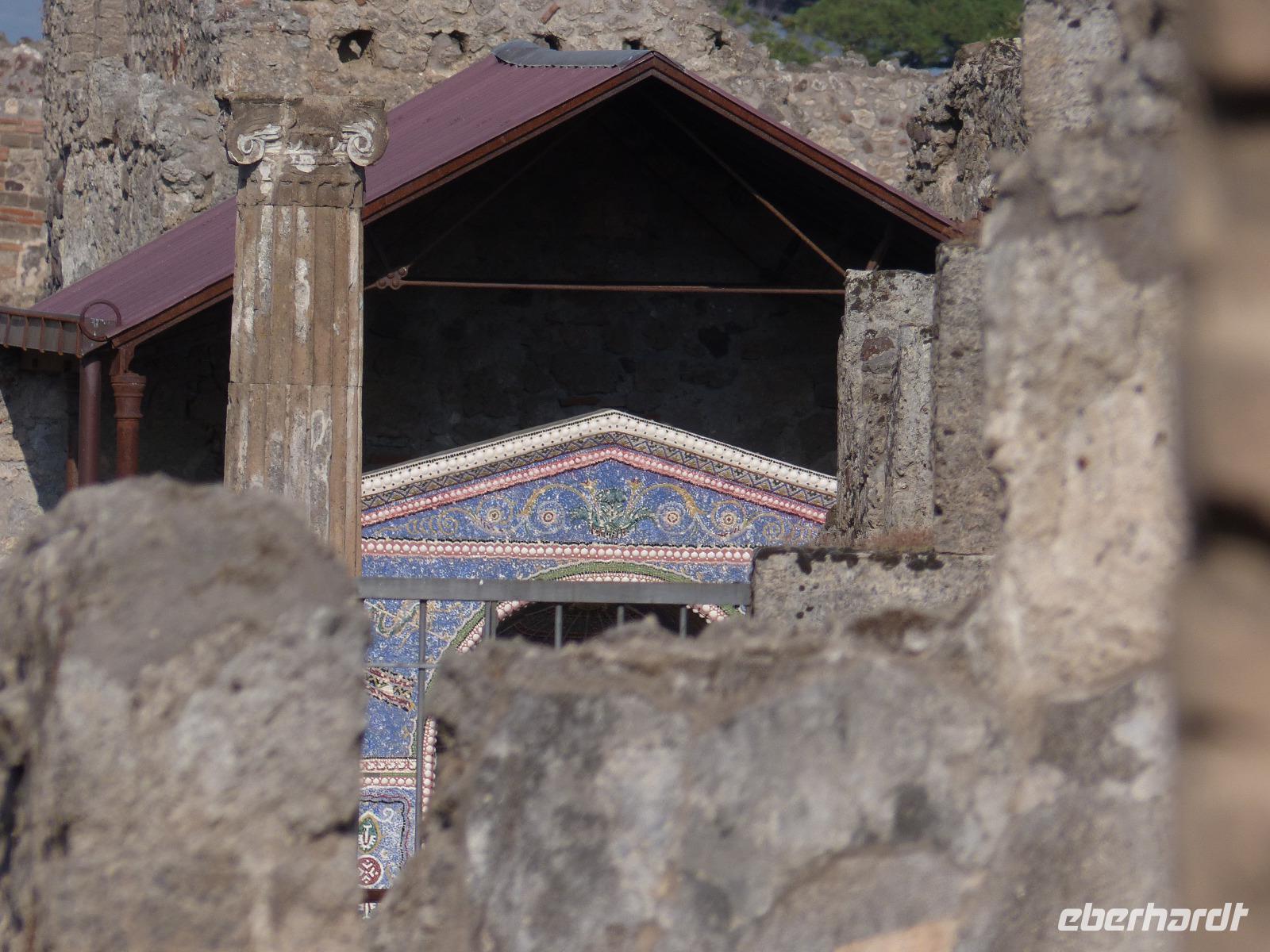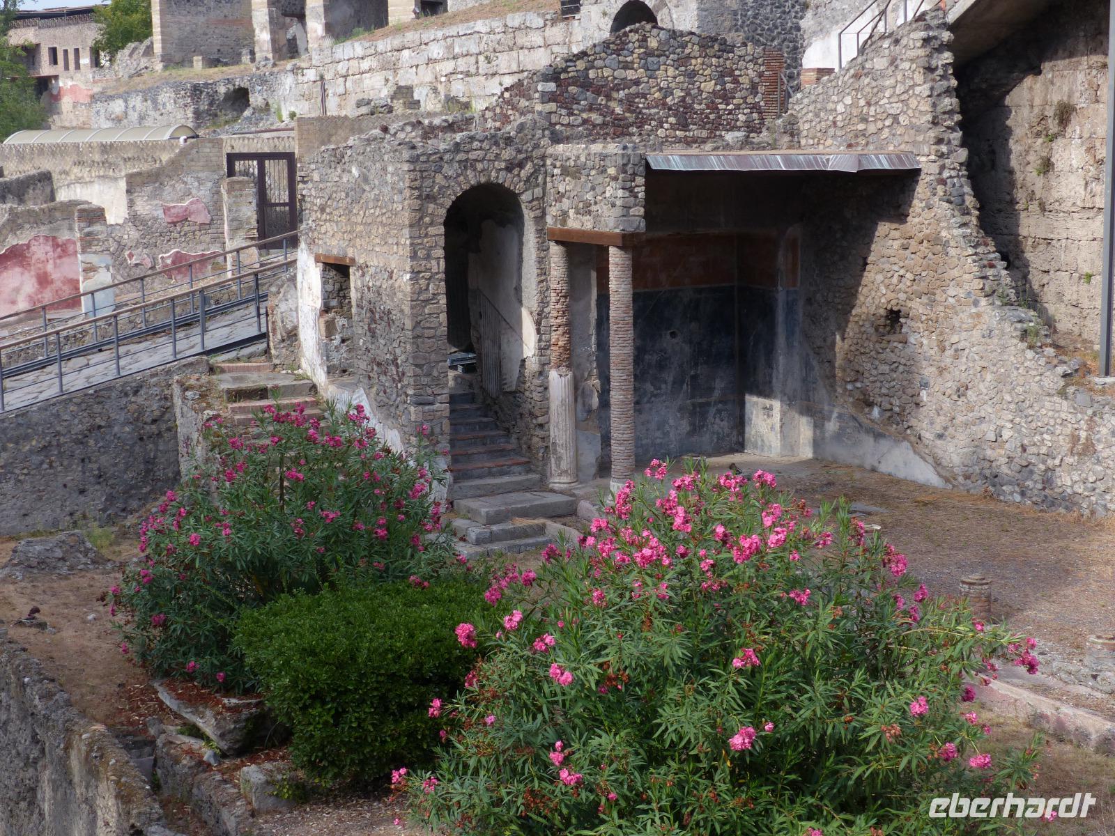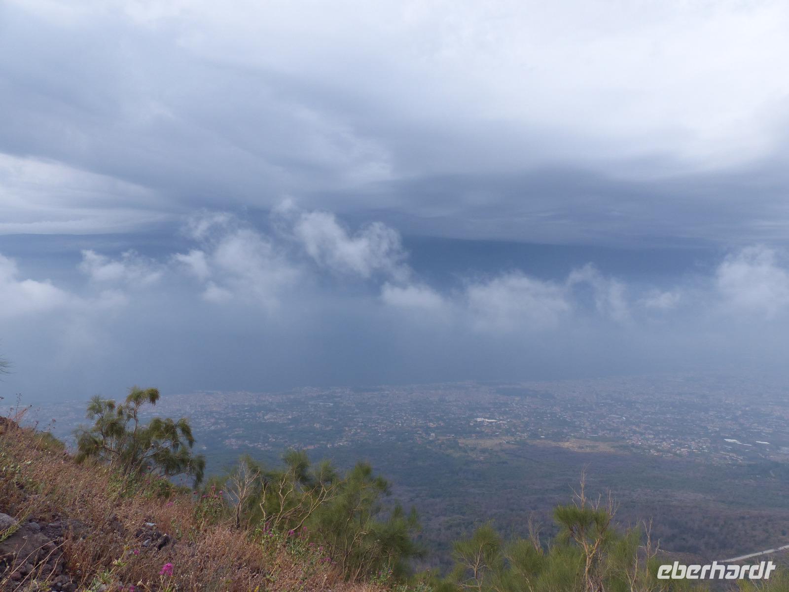 Die Blasen an der Ferse plagten einen Gast doch sehr und so zogen wir nicht ganz vollständig los. Ein anderer hatte sich vor ein paar Tagen schon einige weniger schöne blaue Flecken an der Wade zugezogen, ließ sich aber von diesen nicht zurückhalten. Wir starteten also auf der Küstenstraße in Richtung Vietri sul Mare, genossen die herrlichen Blicke auf die Küste und die Tatsache, dass wir hier selbst nicht hinterm Steuer saßen. Dann sausten wir über die Autobahn zum Vesuv und fuhren hoch bis zum Parkplatz. Die Wettervorhersage war nicht gut und die Wolkenberge wirkten ein bisschen bedrohlich. „Um 12 Uhr geht's los, dann solltet Ihr nicht mehr oben sein" sagte mir ein Ortskundiger. Wir verzichteten also auf die Führung am Kraterrand und gingen direkt hoch bis zur Bergstation der Funicolare, genauer gesagt zu dem was von ihr nach dem letzten Vulkanausbruch 1944 noch übrig ist. Ein paar Blicke in den Krater hinein, ein paar Blicke nach Neapel runter an die Küste - und ab ging's in flottem Schritt den Berg wieder hinunter. Um 11:45 Uhr fielen die ersten Tropfen, aber bevor es richtig losging mit dem Gewitter saßen wir wieder im Bus und fuhren abwärts. Raffaele, unser Fahrer, hatte ein bisschen Mühe unser nächstes Ziel zu finden, denn das Weingut der Familie Setara liegt ziemlich gut versteckt in einem sehr engen Sträßchen. Wie hat man das früher bloß geschafft, als es noch keine Handys gab...? Raffaele bekam übers Telefon den Weg erklärt. Wir erprobten nun die Tränen Christi. So wird der Wein genannt, der am Vesuv wächst. Und dazu gab es wieder etwas Leckeres zum Essen. Am Nachmittag folgte dann ein Besuch in Pompei. „Weiter!" - dieses Wort wird uns in Erinnerung bleiben. Antonio beförderte uns im Sauseschritt durch die Überreste der antiken Stadt. Sein Wissen, das er mit uns teilen wollte, war sehr groß. Und seine Schritte auch. Das Marinetor, die Basilika, der Apollontempel, das Forum, das Macellum, die Villa des Fauns, eine Bäckerei, die Thermen, das Freudenhaus, das Odeon, die Gladiatorenunterkünfte - überall sind wir gewesen. Und alles wurde uns von Antonio in Windeseile erklärt. Am Forum warfen wir auch einen Blick auf die Gipsfiguren, die die gefundenen Hohlräume abbilden, die die Toten in Pompei hinterlassen haben. Ein Hund, ein Kind, ein Mann. So wie sie diese Welt verließen. Müde aber voller neuer Eindrücke erreichten wir am Abend unseren Bus und bald schon flitzten wir über die Autobahn und fuhren am Abend über die Monte Lateri, die Milchberge, hoch auf einen Pass, der uns durch die Bergdörfer Tramonti brachte, die im Gebirge zwischen Weinbergen zerstreut liegen. Heute Abend blieb uns keine Zeit zum Baden, aber ein gutes Essen wartete wie immer auf uns.