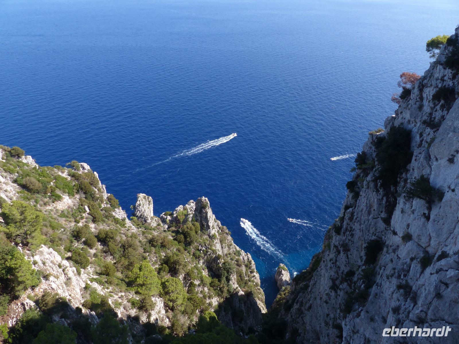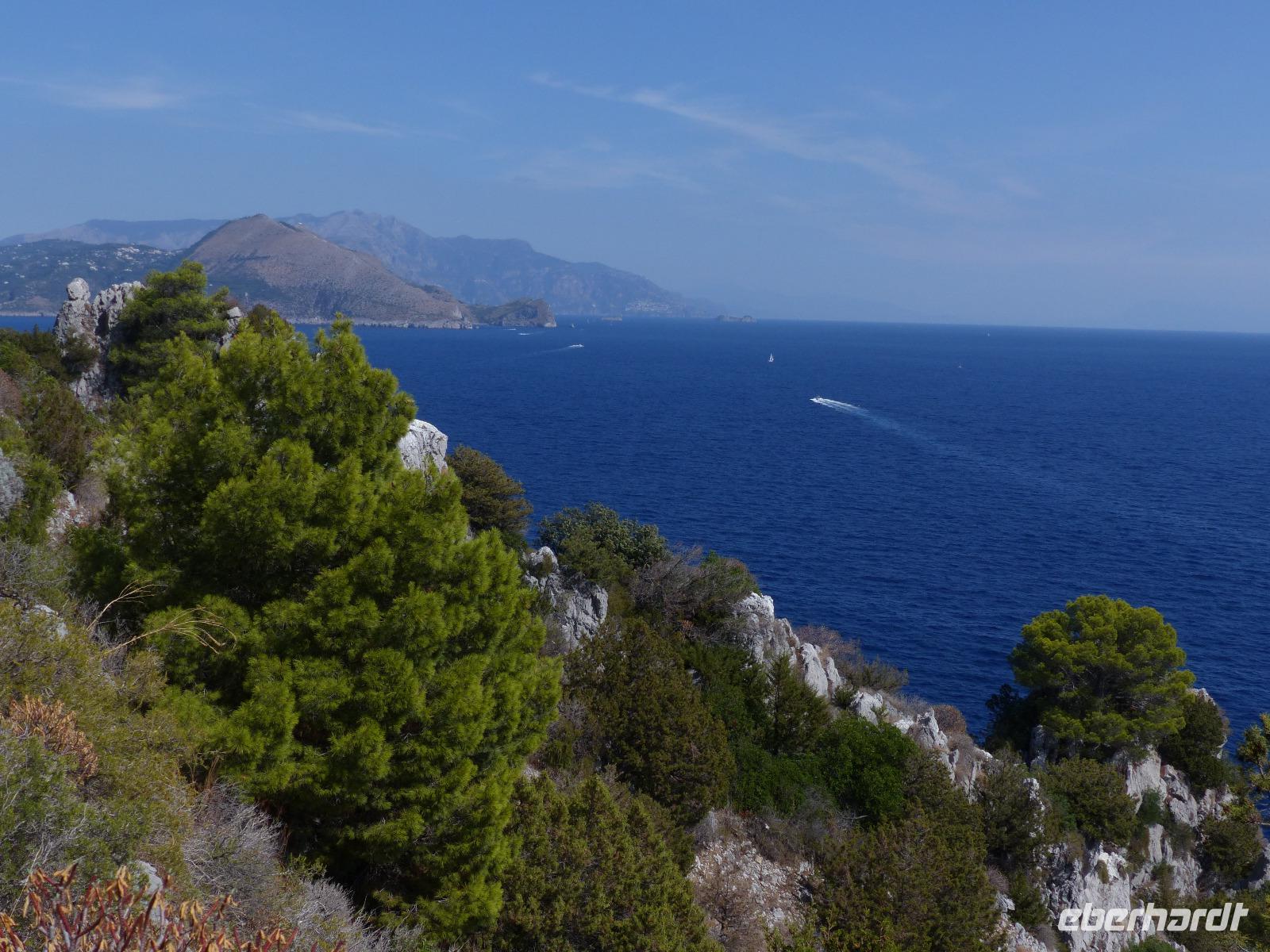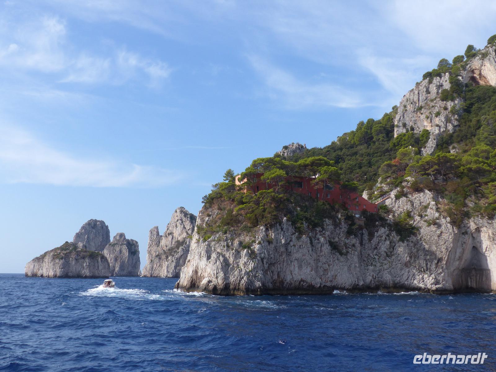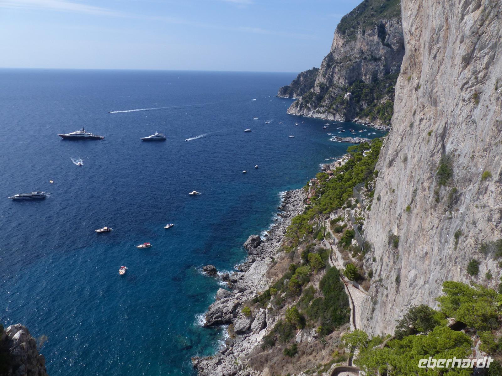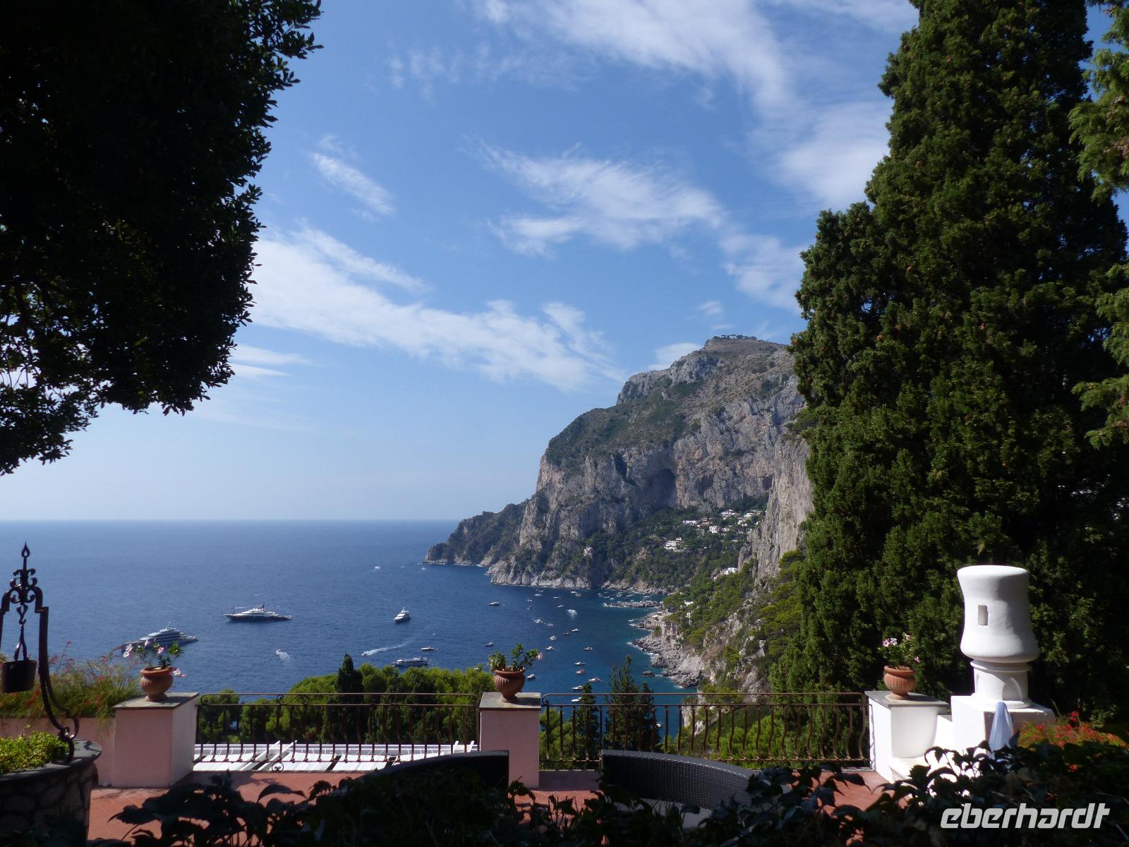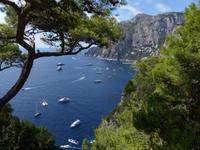 Einige Gäste brauchten einen Tag für sich und zogen getrennt los. Die anderen wollten mit mir nach Capri. Und so zogen wir bei blitzblauem Himmel am frühen Morgen los. Wir konnten alle oben an Deck des Schiffs sitzen und fuhren über Amalfi und Positano nach Capri. Kein Wölkchen weit und breit. Tolles Licht. Das Meer war morgens noch ziemlich lebendig. Aber keiner von uns wurde richtig seekrank. Wir fuhren an der Südküste Capris entlang, sahen hinauf zur Villa Malapartes und näherten uns den berühmten Faraglioni-Inseln. Unser Kapitän steuerte gekonnt das Boot durch den natürlichen Felsentunnel hindurch. Baci, baci, baci - Paare sollen sich hier küssen, das bringt Glück! Dann bekamen wir eine Inselumrundung per Schiff geboten, fuhren am Leuchtturm vorüber zur Westküste. Am Eingang der blauen Grotte lagen viele Schiffe in Wartestellung. Die Wellen waren zu hoch, so dass die Boote nicht in die Grotte reinfahren konnten. Schließlich erreichten wir den Hafen Marina Grande. In Marina Grande besorgte ich ein Picknick und ab ging's in die Warteschlange zur Funicolare, denn mit der Funicolare fuhren wir zum Hauptplatz von Capri hoch. Der Ort Capri war sehr voll. Wir spazierten zu den Augustusgärten und genossen den Ausblick auf die Via Krupp, die sich nach Marina Piccola den Hang hinunter schlängelt. Das Meer schimmerte in türkisblauen Tönen. Dann wanderten wir los zur Punta Tragara. Nun wurde es ruhiger und wir machten an einer schattigen Stelle ein schönes Picknick. Wir wanderten weiter, kamen oberhalb der Villa Malaparte vorüber und stiegen hoch zur Grotte Matromania und wanderten zurück nach Capri. Hier trennten wir uns, denn einige Gäste wollten den Nachmittag etwas ruhiger angehen. Die anderen wanderten noch weiter mit mir hoch zur Villa Jovis. Überall strahlendes Blau. Das Meer hatte sich beruhigt. Wir genossen die Aussicht auf die Küste vom Palast des römischen Kaisers Tiberius. Er hatte sich schon ein sehr schönes Plätzchen für seinen Sitz ausgesucht! Und wir machten noch einen kurzen Abstecher zu den tollen Aussichtspunkten im Parco Astarita. Nun wanderten wir wieder abwärts, an herrlich blühenden Gärten vorüber zum Hafen hinunter. Am Hafen von Marina Grande trafen wir uns alle wieder und zum Abschluss besorgte ich noch Eis für alle. Danach genossen wir die Abendstimmung dieses herrlichen Tages auf dem Wasser bei unserer Rückreise per Boot.