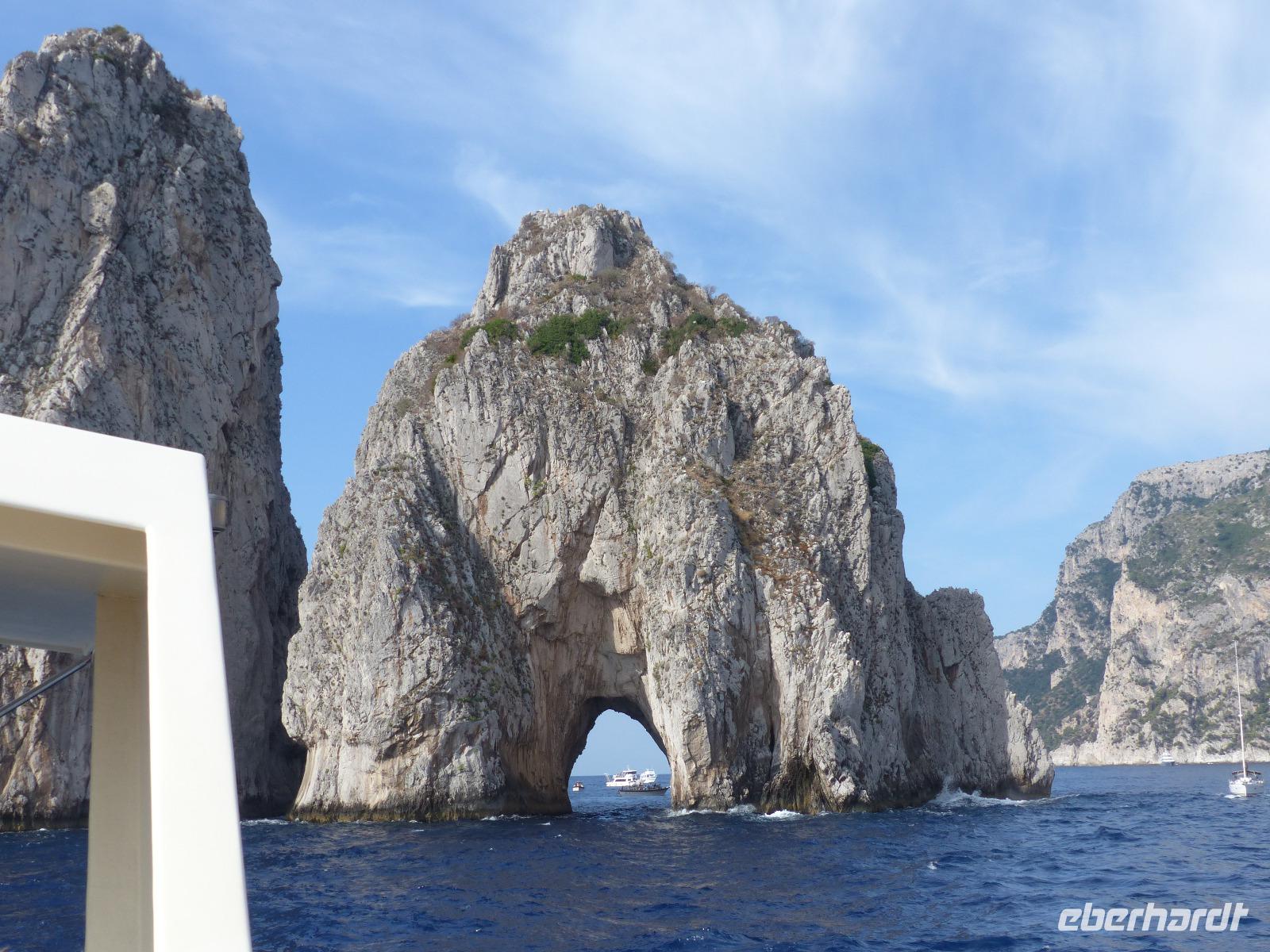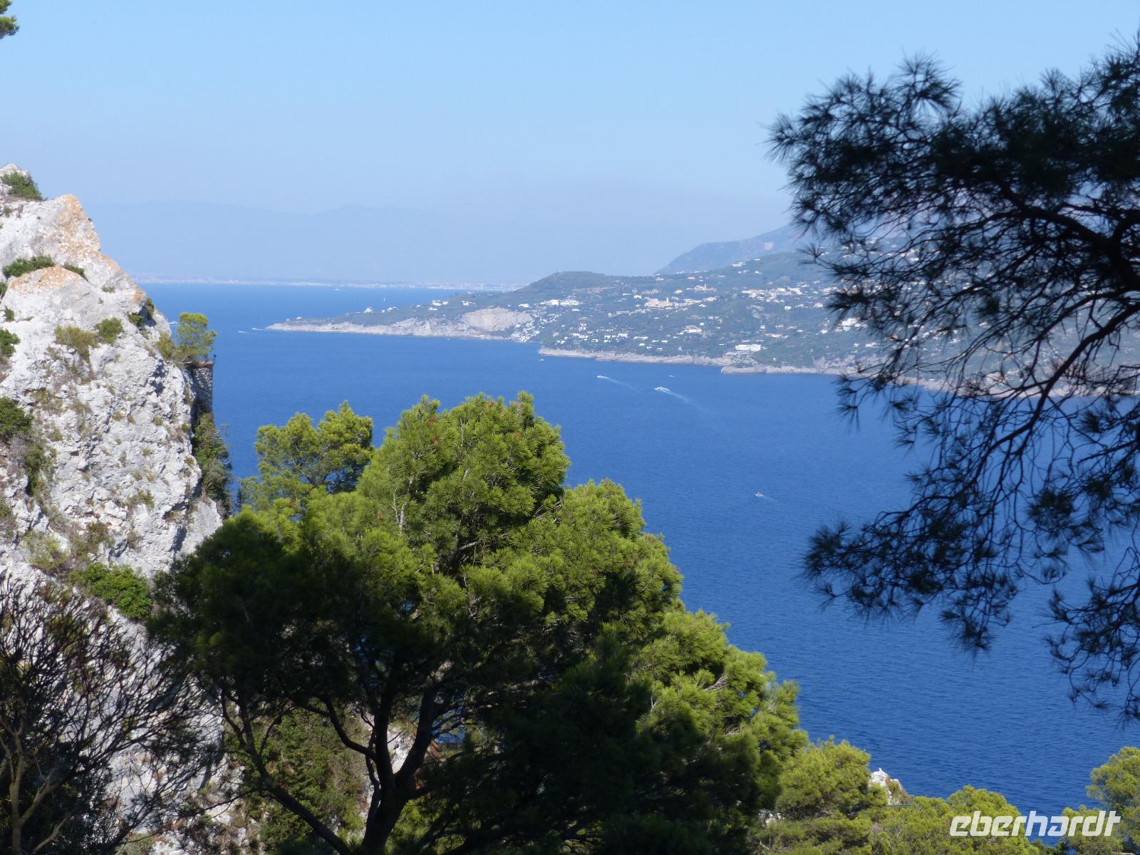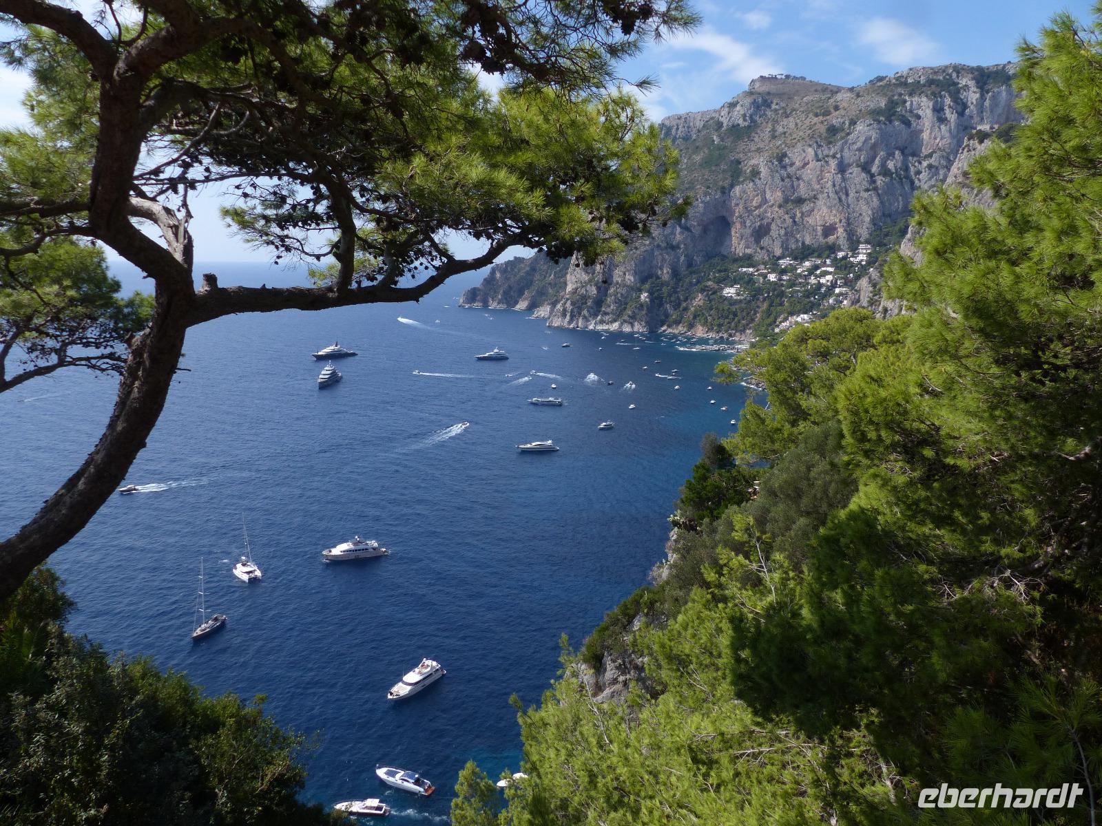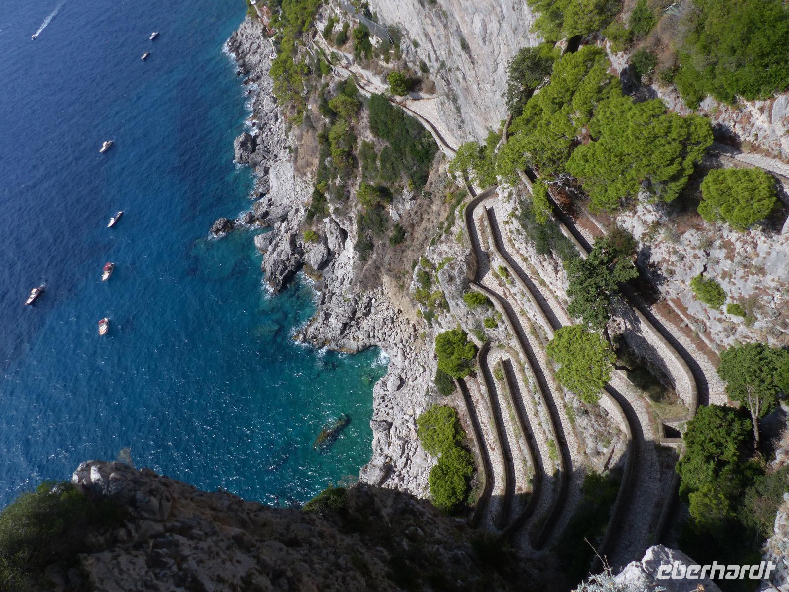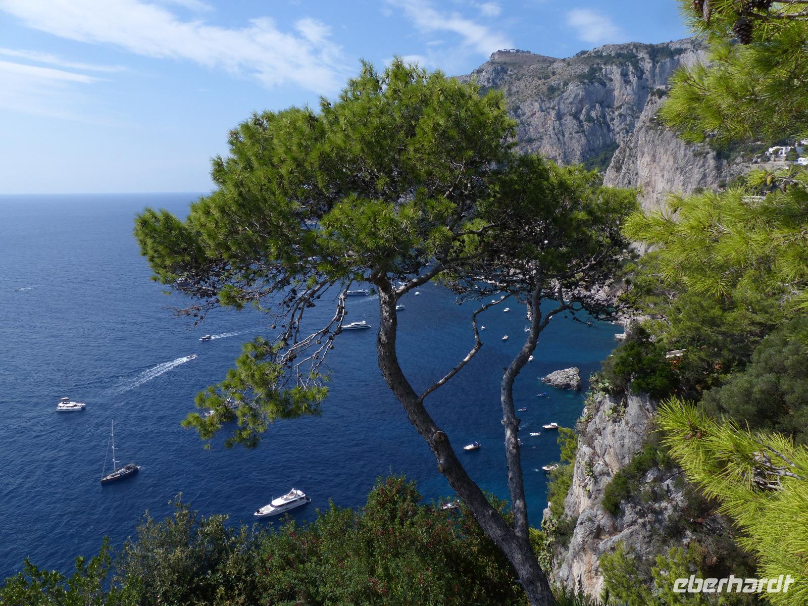 Einige Gäste brauchten einen Tag für sich und zogen getrennt los. Die anderen wollten mit mir nach Capri. Und so zogen wir bei blitzblauem Himmel am frühen Morgen los. Wir konnten alle oben an Deck des Schiffs sitzen und fuhren über Amalfi und Positano nach Capri. Kein Wölkchen weit und breit. Tolles Licht. Das Meer war morgens noch ziemlich lebendig. Aber keiner von uns wurde richtig seekrank. Wir fuhren an der Südküste Capris entlang, sahen hinauf zur Villa Malapartes und näherten uns den berühmten Faraglioni-Inseln. Unser Kapitän steuerte gekonnt das Boot durch den natürlichen Felsentunnel hindurch. Baci, baci, baci - Paare sollen sich hier küssen, das bringt Glück! Dann bekamen wir eine Inselumrundung per Schiff geboten, fuhren am Leuchtturm vorüber zur Westküste. Am Eingang der blauen Grotte lagen viele Schiffe in Wartestellung. Die Wellen waren zu hoch, so dass die Boote nicht in die Grotte reinfahren konnten. Schließlich erreichten wir den Hafen Marina Grande. In Marina Grande besorgte ich ein Picknick und ab ging's in die Warteschlange zur Funicolare, denn mit der Funicolare fuhren wir zum Hauptplatz von Capri hoch. Der Ort Capri war sehr voll. Wir spazierten zu den Augustusgärten und genossen den Ausblick auf die Via Krupp, die sich nach Marina Piccola den Hang hinunter schlängelt. Das Meer schimmerte in türkisblauen Tönen. Dann wanderten wir los zur Punta Tragara. Nun wurde es ruhiger und wir machten an einer schattigen Stelle ein schönes Picknick. Wir wanderten weiter, kamen oberhalb der Villa Malaparte vorüber und stiegen hoch zur Grotte Matromania und wanderten zurück nach Capri. Hier trennten wir uns, denn einige Gäste wollten den Nachmittag etwas ruhiger angehen. Die anderen wanderten noch weiter mit mir hoch zur Villa Jovis. Überall strahlendes Blau. Das Meer hatte sich beruhigt. Wir genossen die Aussicht auf die Küste vom Palast des römischen Kaisers Tiberius. Er hatte sich schon ein sehr schönes Plätzchen für seinen Sitz ausgesucht! Und wir machten noch einen kurzen Abstecher zu den tollen Aussichtspunkten im Parco Astarita. Nun wanderten wir wieder abwärts, an herrlich blühenden Gärten vorüber zum Hafen hinunter. Am Hafen von Marina Grande trafen wir uns alle wieder und zum Abschluss besorgte ich noch Eis für alle. Danach genossen wir die Abendstimmung dieses herrlichen Tages auf dem Wasser bei unserer Rückreise per Boot.
