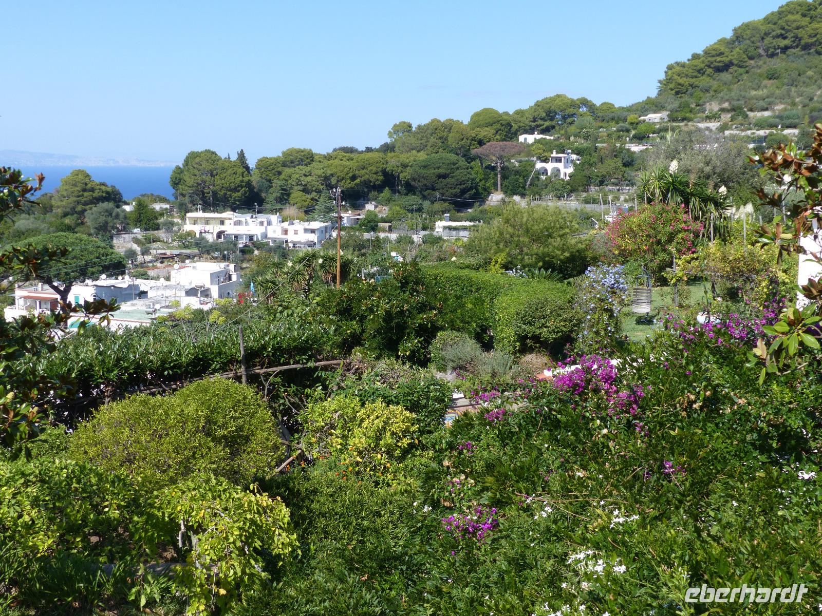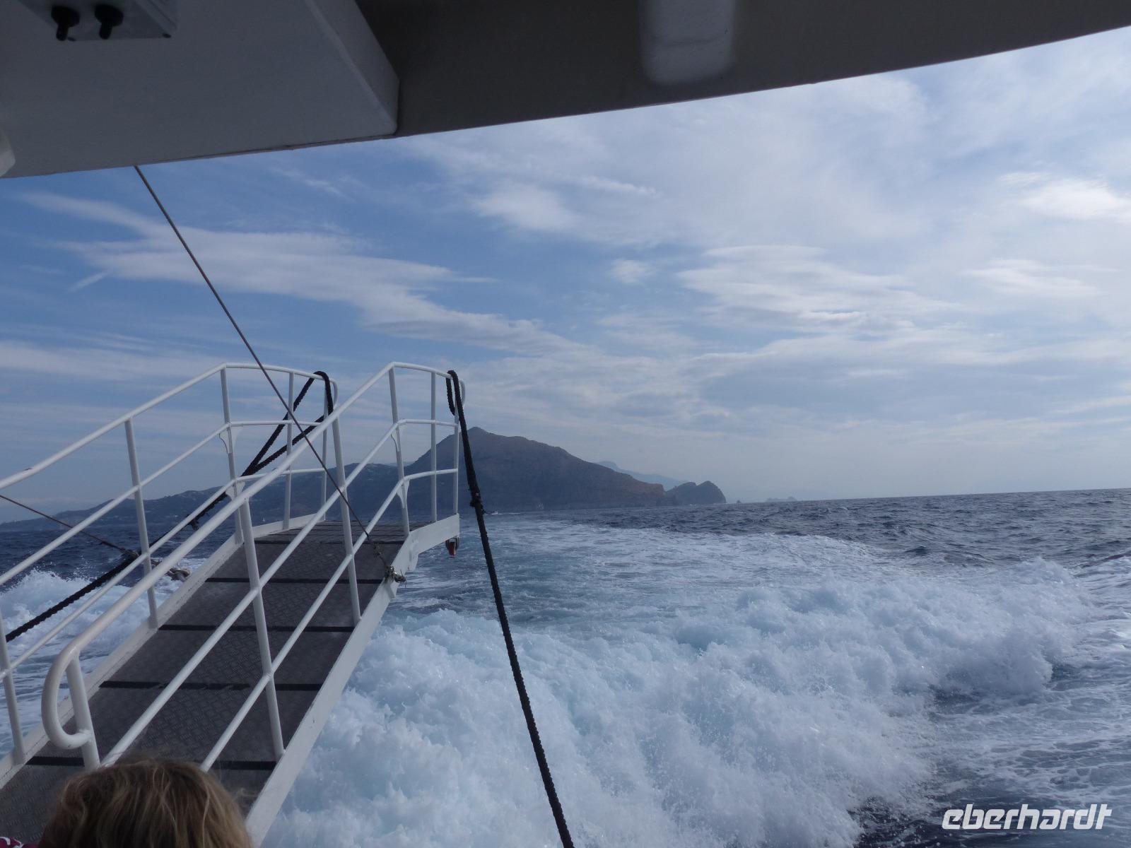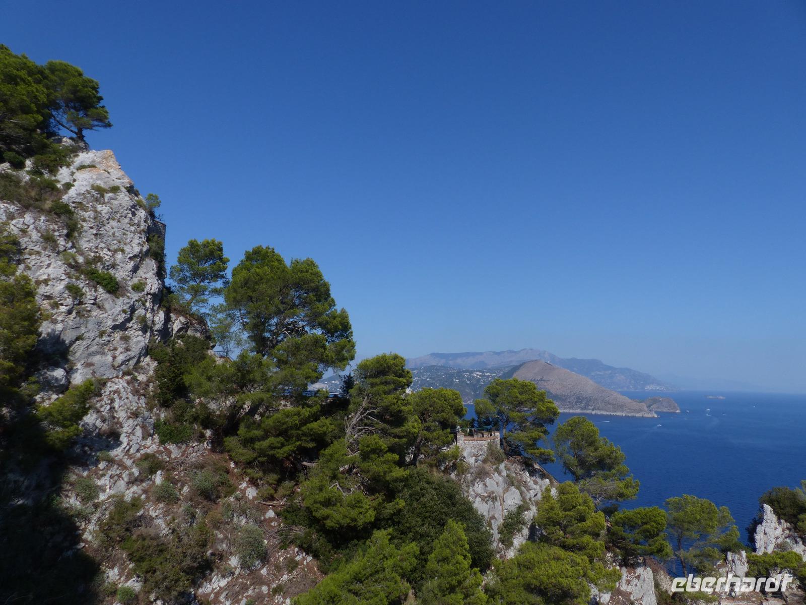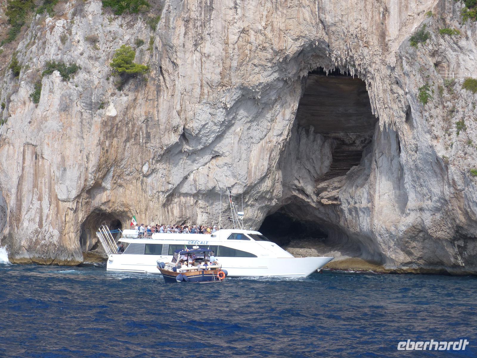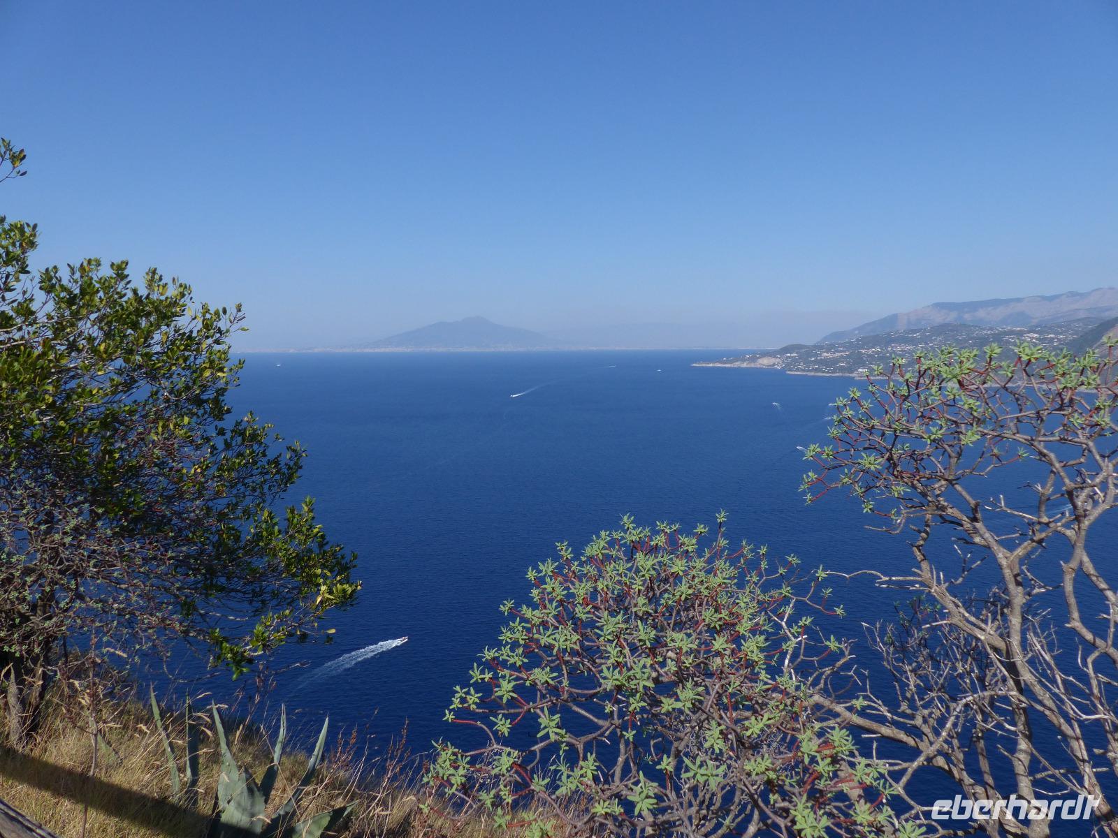 Einige Gäste brauchten einen Tag für sich und zogen getrennt los. Die anderen wollten mit mir nach Capri. Und so zogen wir bei blitzblauem Himmel am frühen Morgen los. Wir konnten alle oben an Deck des Schiffs sitzen und fuhren über Amalfi und Positano nach Capri. Kein Wölkchen weit und breit. Tolles Licht. Das Meer war morgens noch ziemlich lebendig. Aber keiner von uns wurde richtig seekrank. Wir fuhren an der Südküste Capris entlang, sahen hinauf zur Villa Malapartes und näherten uns den berühmten Faraglioni-Inseln. Unser Kapitän steuerte gekonnt das Boot durch den natürlichen Felsentunnel hindurch. Baci, baci, baci - Paare sollen sich hier küssen, das bringt Glück! Dann bekamen wir eine Inselumrundung per Schiff geboten, fuhren am Leuchtturm vorüber zur Westküste. Am Eingang der blauen Grotte lagen viele Schiffe in Wartestellung. Die Wellen waren zu hoch, so dass die Boote nicht in die Grotte reinfahren konnten. Schließlich erreichten wir den Hafen Marina Grande. In Marina Grande besorgte ich ein Picknick und ab ging's in die Warteschlange zur Funicolare, denn mit der Funicolare fuhren wir zum Hauptplatz von Capri hoch. Der Ort Capri war sehr voll. Wir spazierten zu den Augustusgärten und genossen den Ausblick auf die Via Krupp, die sich nach Marina Piccola den Hang hinunter schlängelt. Das Meer schimmerte in türkisblauen Tönen. Dann wanderten wir los zur Punta Tragara. Nun wurde es ruhiger und wir machten an einer schattigen Stelle ein schönes Picknick. Wir wanderten weiter, kamen oberhalb der Villa Malaparte vorüber und stiegen hoch zur Grotte Matromania und wanderten zurück nach Capri. Hier trennten wir uns, denn einige Gäste wollten den Nachmittag etwas ruhiger angehen. Die anderen wanderten noch weiter mit mir hoch zur Villa Jovis. Überall strahlendes Blau. Das Meer hatte sich beruhigt. Wir genossen die Aussicht auf die Küste vom Palast des römischen Kaisers Tiberius. Er hatte sich schon ein sehr schönes Plätzchen für seinen Sitz ausgesucht! Und wir machten noch einen kurzen Abstecher zu den tollen Aussichtspunkten im Parco Astarita. Nun wanderten wir wieder abwärts, an herrlich blühenden Gärten vorüber zum Hafen hinunter. Am Hafen von Marina Grande trafen wir uns alle wieder und zum Abschluss besorgte ich noch Eis für alle. Danach genossen wir die Abendstimmung dieses herrlichen Tages auf dem Wasser bei unserer Rückreise per Boot.