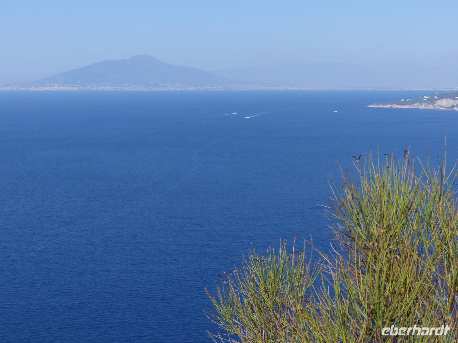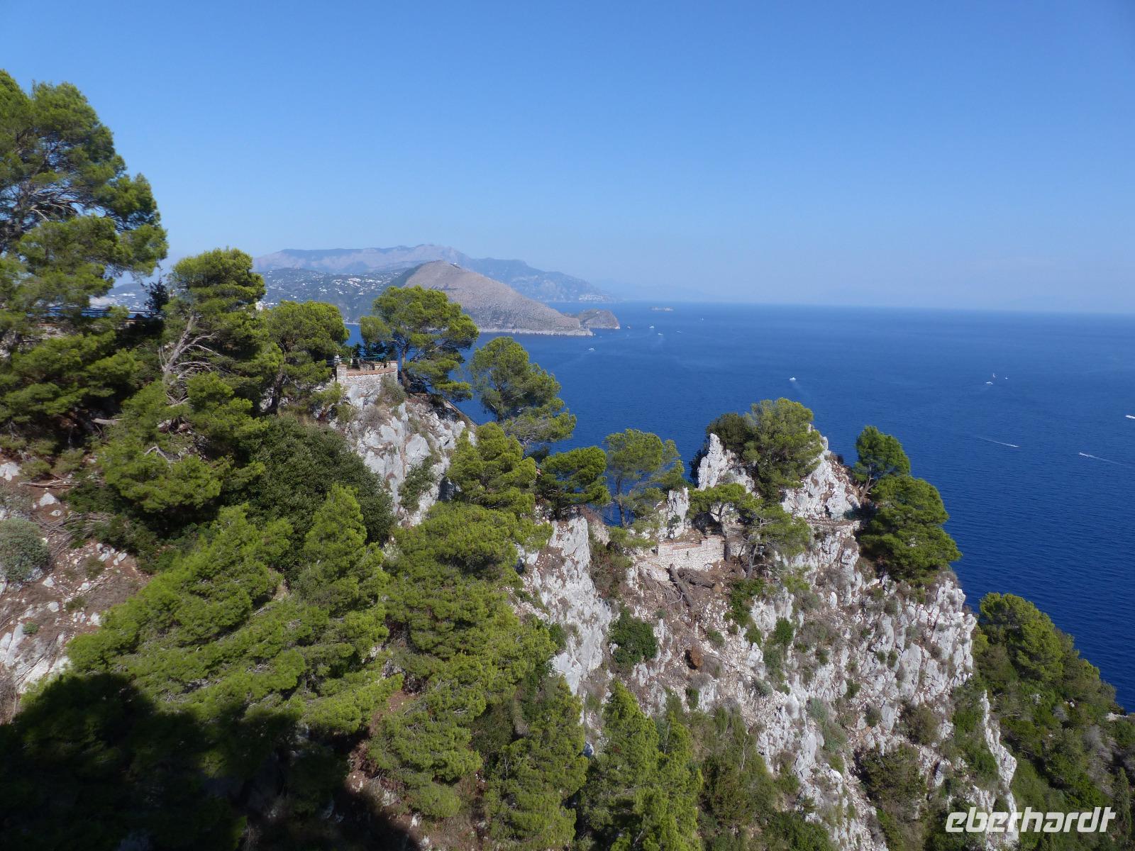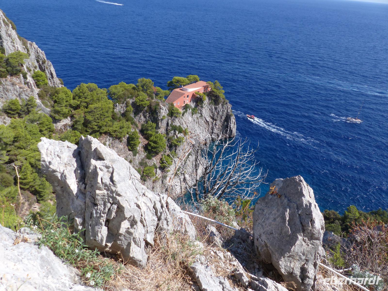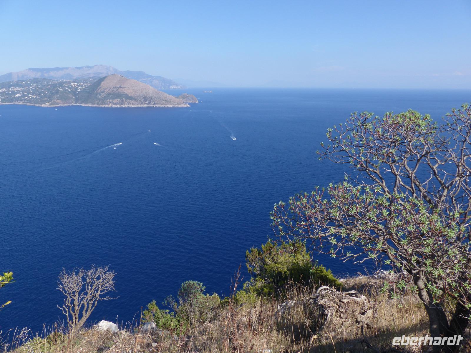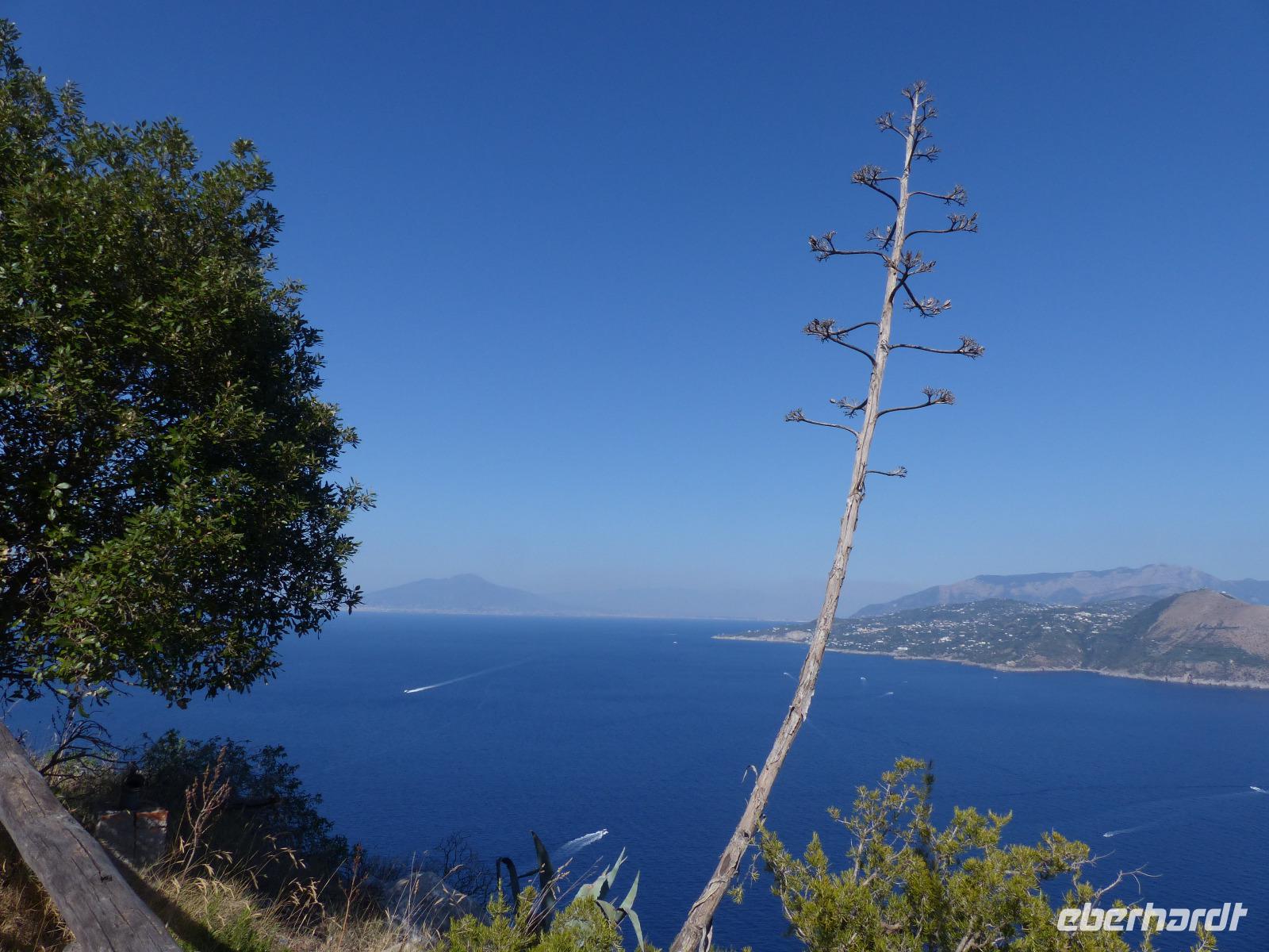 Einige Gäste brauchten einen Tag für sich und zogen getrennt los. Die anderen wollten mit mir nach Capri. Und so zogen wir bei blitzblauem Himmel am frühen Morgen los. Wir konnten alle oben an Deck des Schiffs sitzen und fuhren über Amalfi und Positano nach Capri. Kein Wölkchen weit und breit. Tolles Licht. Das Meer war morgens noch ziemlich lebendig. Aber keiner von uns wurde richtig seekrank. Wir fuhren an der Südküste Capris entlang, sahen hinauf zur Villa Malapartes und näherten uns den berühmten Faraglioni-Inseln. Unser Kapitän steuerte gekonnt das Boot durch den natürlichen Felsentunnel hindurch. Baci, baci, baci - Paare sollen sich hier küssen, das bringt Glück! Dann bekamen wir eine Inselumrundung per Schiff geboten, fuhren am Leuchtturm vorüber zur Westküste. Am Eingang der blauen Grotte lagen viele Schiffe in Wartestellung. Die Wellen waren zu hoch, so dass die Boote nicht in die Grotte reinfahren konnten. Schließlich erreichten wir den Hafen Marina Grande. In Marina Grande besorgte ich ein Picknick und ab ging's in die Warteschlange zur Funicolare, denn mit der Funicolare fuhren wir zum Hauptplatz von Capri hoch. Der Ort Capri war sehr voll. Wir spazierten zu den Augustusgärten und genossen den Ausblick auf die Via Krupp, die sich nach Marina Piccola den Hang hinunter schlängelt. Das Meer schimmerte in türkisblauen Tönen. Dann wanderten wir los zur Punta Tragara. Nun wurde es ruhiger und wir machten an einer schattigen Stelle ein schönes Picknick. Wir wanderten weiter, kamen oberhalb der Villa Malaparte vorüber und stiegen hoch zur Grotte Matromania und wanderten zurück nach Capri. Hier trennten wir uns, denn einige Gäste wollten den Nachmittag etwas ruhiger angehen. Die anderen wanderten noch weiter mit mir hoch zur Villa Jovis. Überall strahlendes Blau. Das Meer hatte sich beruhigt. Wir genossen die Aussicht auf die Küste vom Palast des römischen Kaisers Tiberius. Er hatte sich schon ein sehr schönes Plätzchen für seinen Sitz ausgesucht! Und wir machten noch einen kurzen Abstecher zu den tollen Aussichtspunkten im Parco Astarita. Nun wanderten wir wieder abwärts, an herrlich blühenden Gärten vorüber zum Hafen hinunter. Am Hafen von Marina Grande trafen wir uns alle wieder und zum Abschluss besorgte ich noch Eis für alle. Danach genossen wir die Abendstimmung dieses herrlichen Tages auf dem Wasser bei unserer Rückreise per Boot.