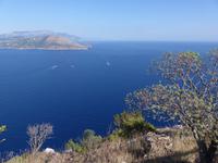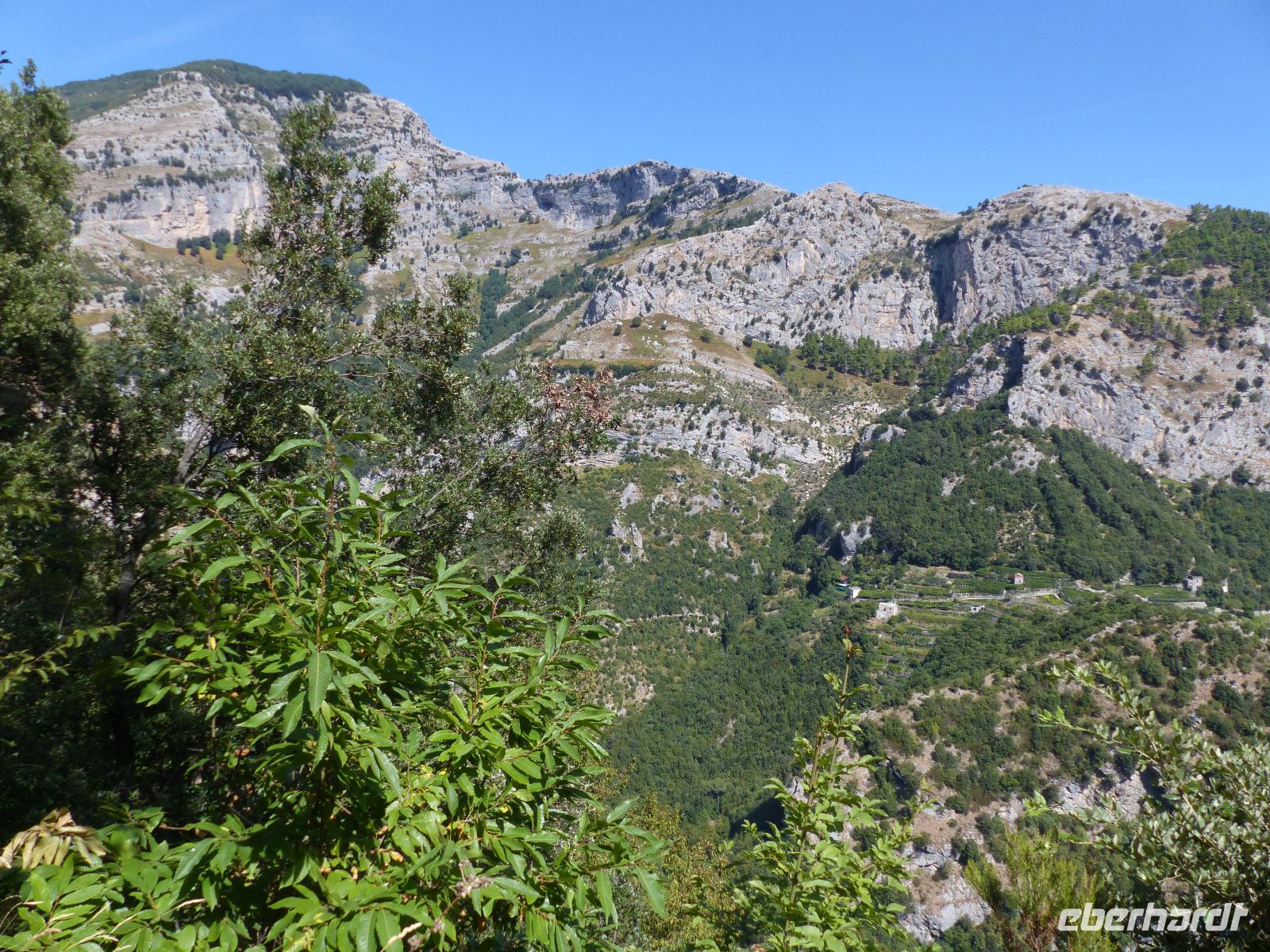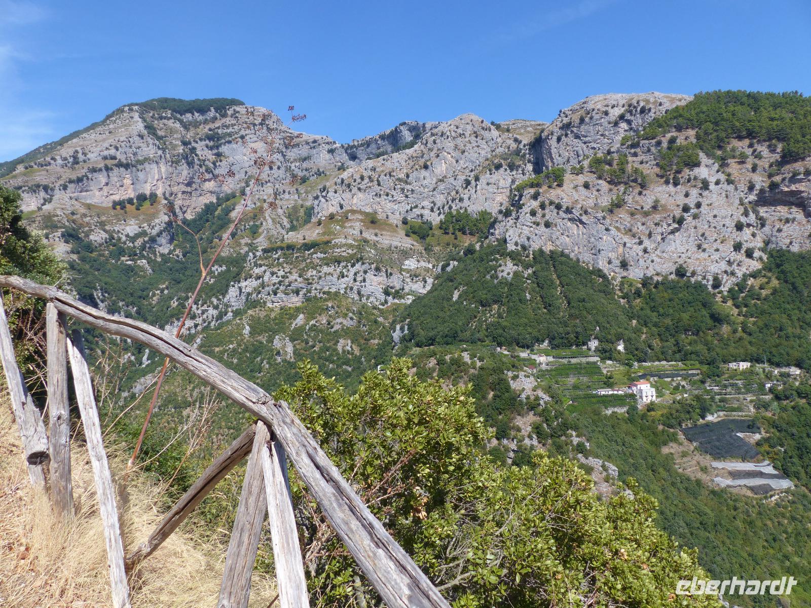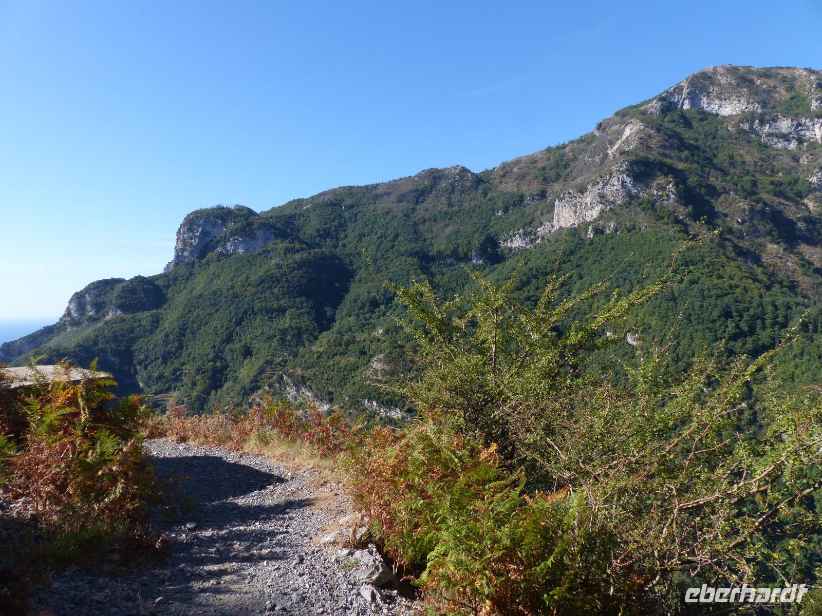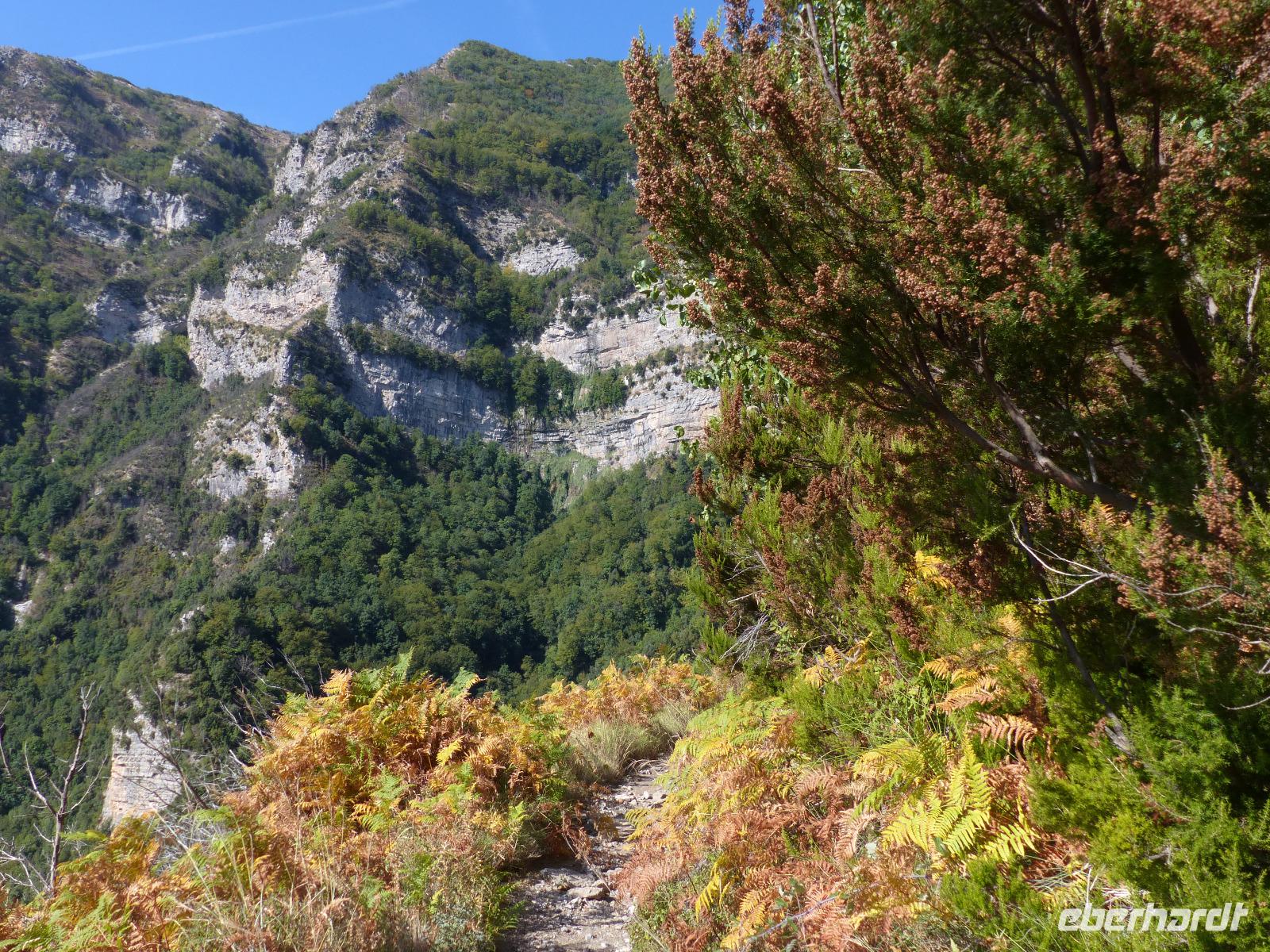 Die Blasen und eine Magenverstimmung ließen einige Gäste pausieren. So waren wir heute eine etwas kleinere Gruppe. Die blauen Flecken an der Wade hatten sich bei einem Gast zwar unschön festgesetzt, aber dieser wollte einfach mit. Von Campidoglio, einem kleinen Weiler, der hoch über Ravello am Hang klebt, schlängelte sich unser aussichtsreicher Weg am Hang entlang. Auch hier faszinierte das Blau, das Schimmern des Meeres im Gegenlicht. Herbstblumen und Maronibäume voller Früchte erwarteten uns. Ein Hund begleitete uns ein Stück. Dann begegnete uns ein Reiter auf einem Maultier. Amalfi lag tief unter uns im klaren Herbstlicht. Unser Weg führte uns durch einen Felsentunnel. Dann wanderten wir an Felswänden vorüber in rund 400 m Höhe am Hang entlang. Die Farne, die die Hänge überzogen, waren orangerot verfärbt. An den Weißdornbüschen hingen rote Beerchen. Und darüber blitzblauer Himmel! Unten im Tal wurden früher Papiermühlen betrieben, hoch oben in den Bergen standen früher Eisenhütten, die dem oberen Tal den Namen gaben, denn der untere Teil des Tales wird Valle dei Mulini genannt, das wir ja bereits ergründet hatten. Die Wasserkraft wurde hier überall genutzt. Ganz hinten im Tal mussten wir bei einem sehr schönen Wasserfall den Bach überqueren, was uns gut gelang. Zur Stärkung hatte ich noch Pistazien - und Zitronenkekse mitgebracht. Es folgte nun nämlich ein etwas mühsameres Stück, aber wir schafften es gut. Immer wieder kamen wir an Wasserfällen vorüber, die die Felswände herabfielen. Schließlich durchstreiften wir Esskastanienplantagen. An den Bäumen hingen hellgrün leuchtende Stachelkugeln. Noch waren die Kastanien nicht geerntet. Und immer wieder tolle Aussichten. Und wir hatten fast das ganze Tal für uns. In Pogerola wurde uns nebst leckerer Antipasti auch noch eine Pizza aufgetischt. Dann nahmen wir die letzten Stufen ins Visier. Einige Gäste fuhren lieber mit dem Bus nach Amalfi runter. Ein letzter Bummel durch Amalfi folgte. Und per Schiff kamen wir schließlich wieder in Minori an. Einige Gäste stürzten sich nun noch einmal, zum letzten Mal, ins Meer, denn die Heimreise sollte bald folgen.