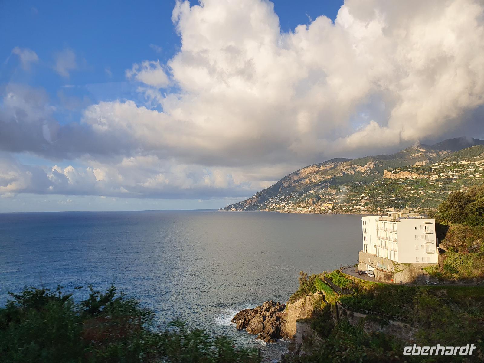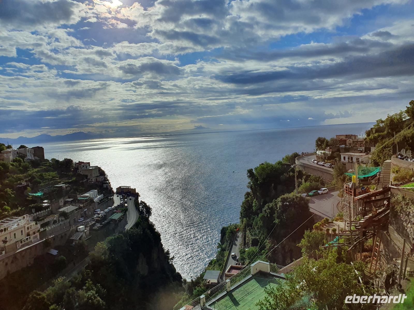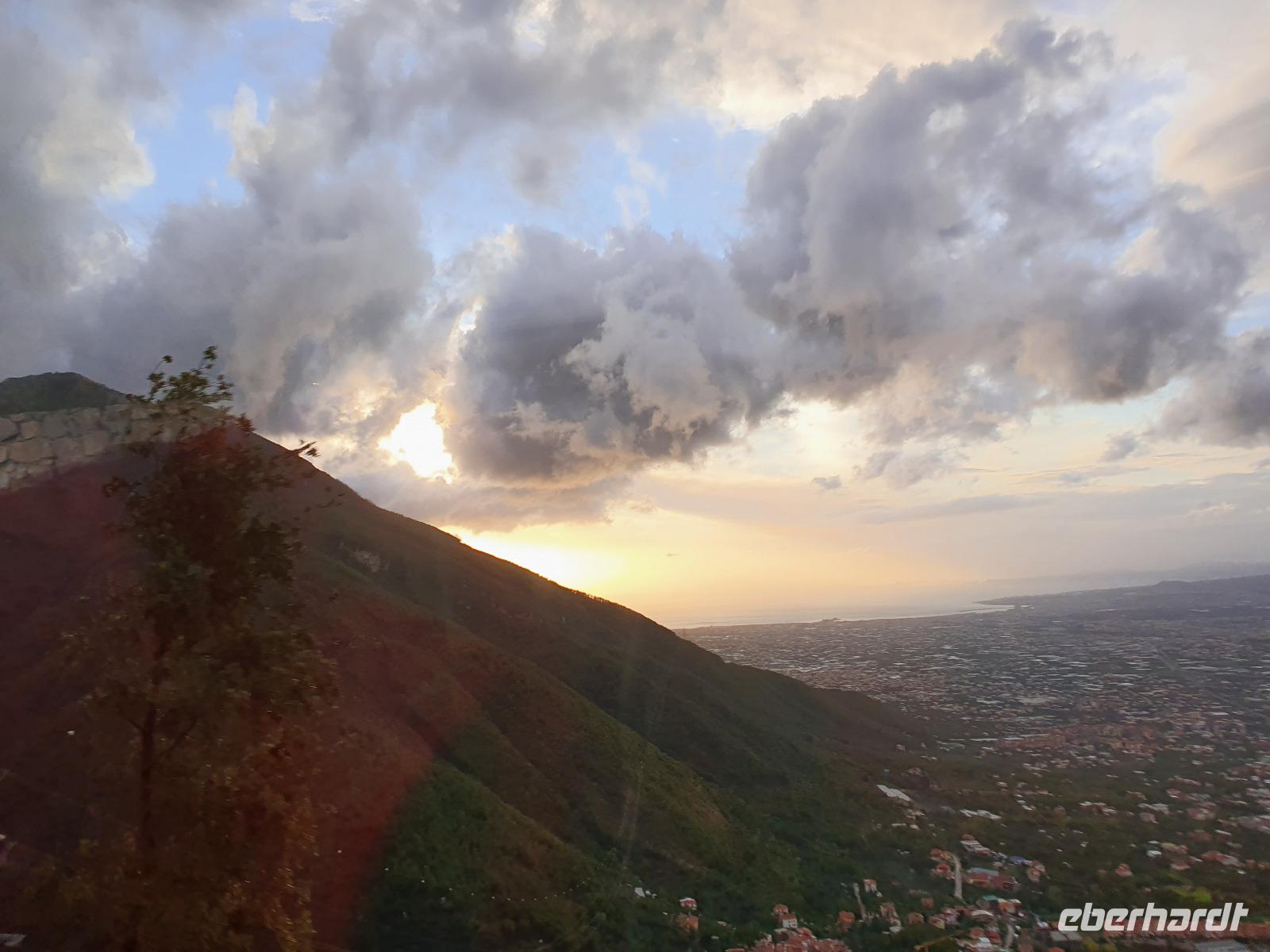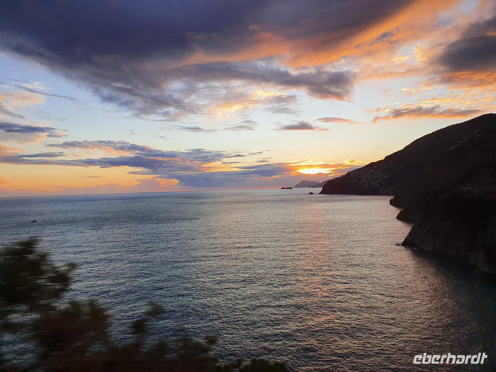 In Sorrent nehmen wir eine andere Treppe hinauf in die Stadt und Annamaria geht mit uns durch die Altstadtgassen dieser wunderschönen Stadt. So bekommen wir einen kurzen Einblick von Sorrent. Am Busparkplatz erwartet uns Guiseppe und mit ihm fahren wir über den Pass auf der sorrentinischen Halbinsel hinunter zur Amalfitana. Nun lernen wir noch das unbekannte Stück dieser berühmten Strasse kennen und geniessen die untergehende Sonne.