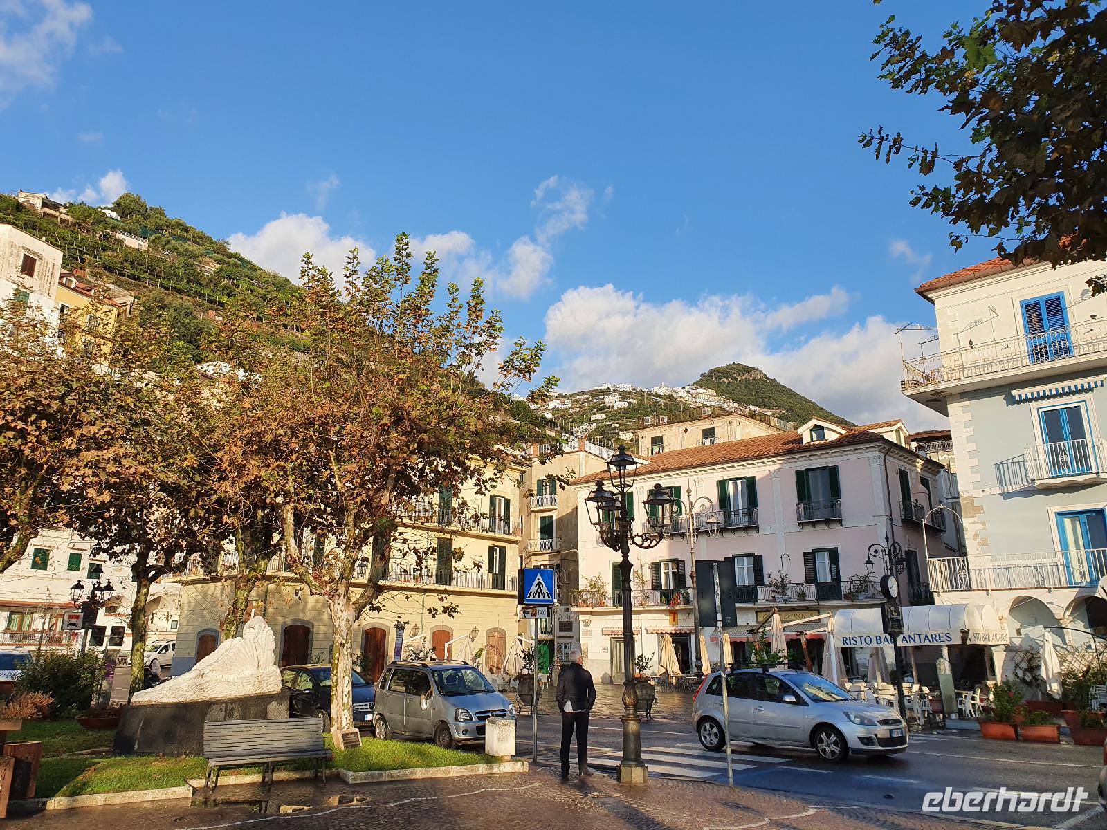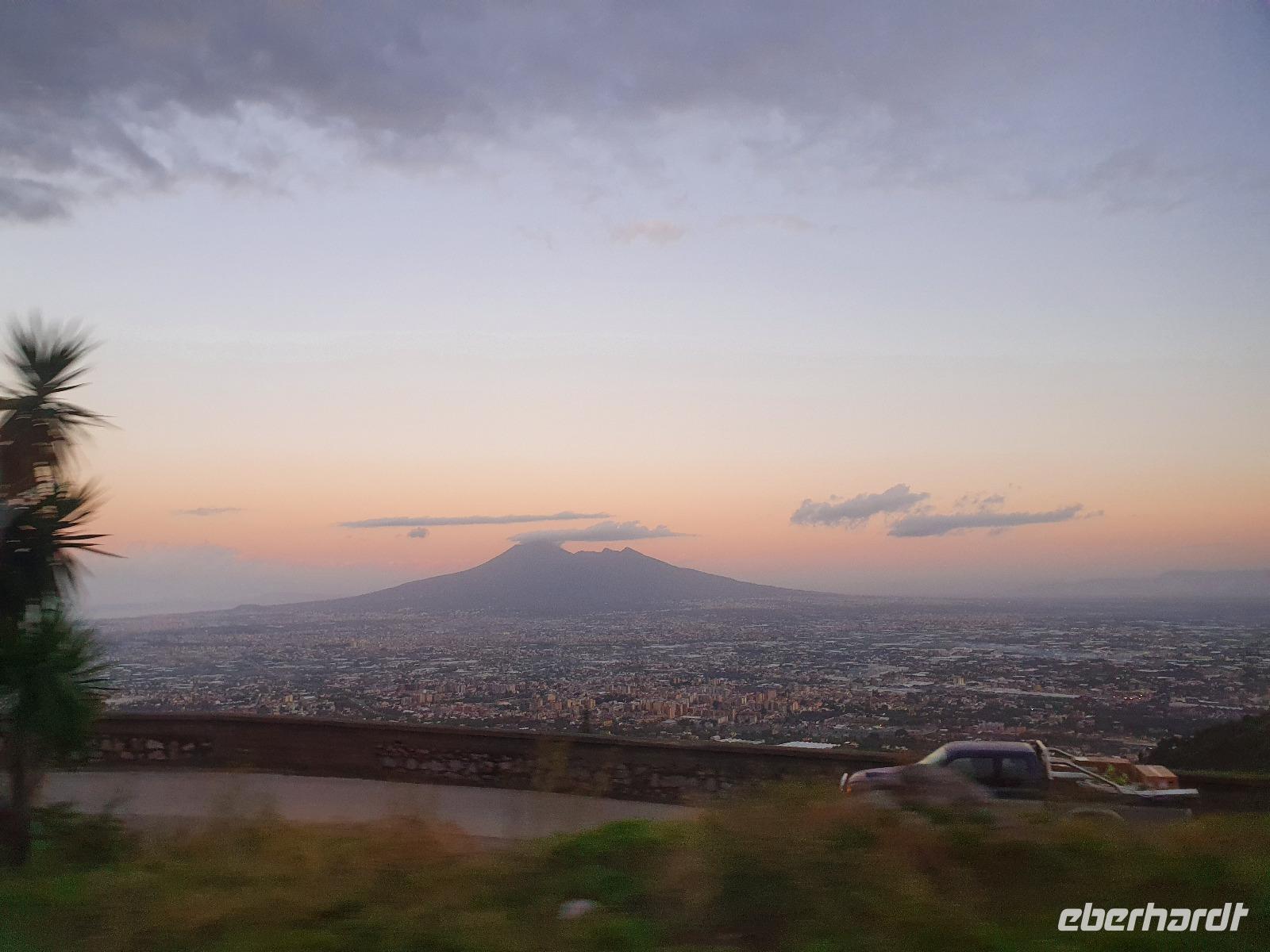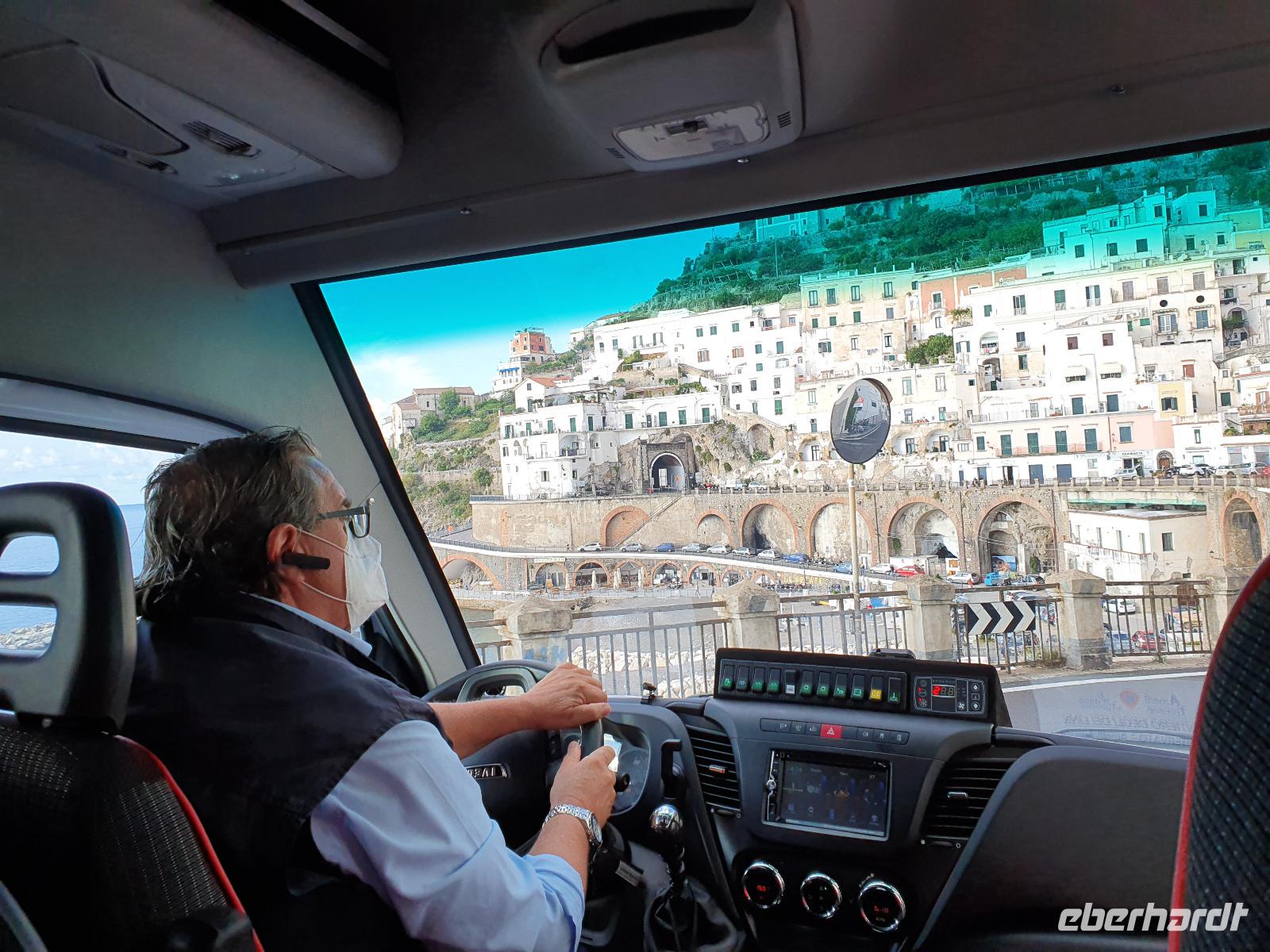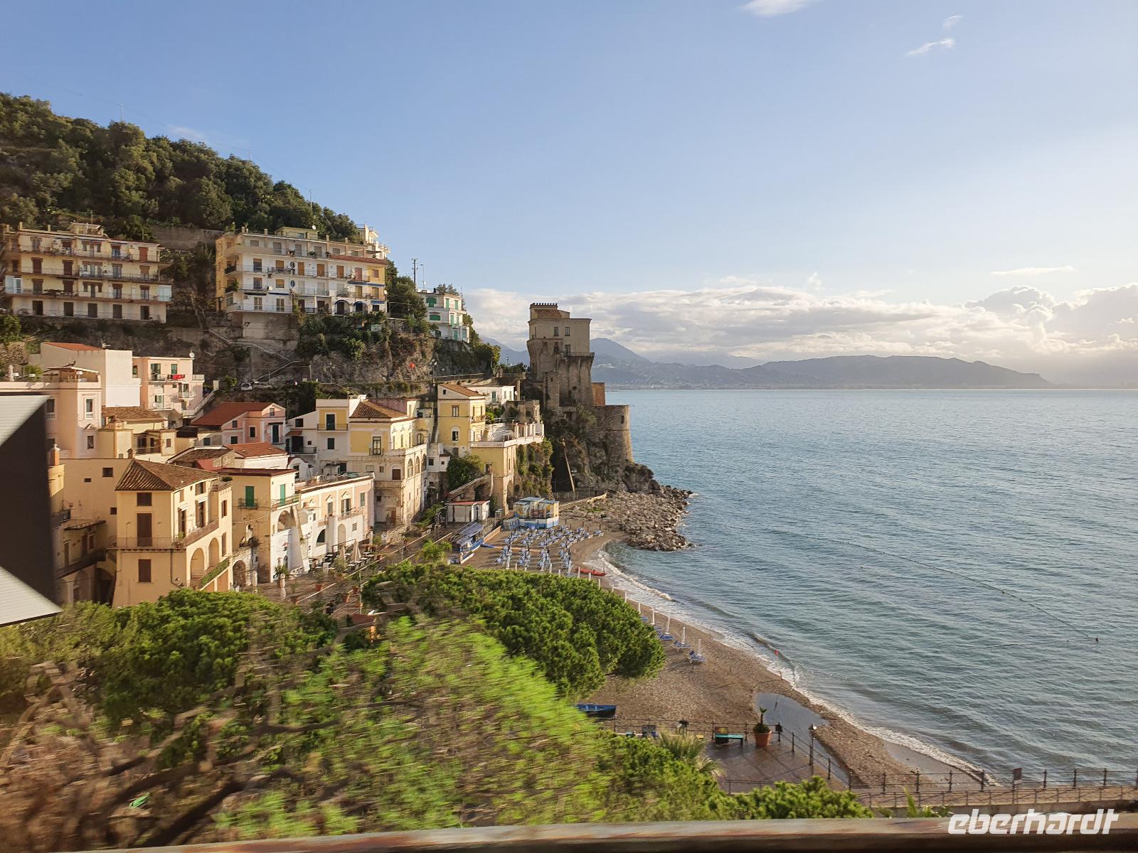In Sorrent nehmen wir eine andere Treppe hinauf in die Stadt und Annamaria geht mit uns durch die Altstadtgassen dieser wunderschönen Stadt. So bekommen wir einen kurzen Einblick von Sorrent. Am Busparkplatz erwartet uns Guiseppe und mit ihm fahren wir über den Pass auf der sorrentinischen Halbinsel hinunter zur Amalfitana. Nun lernen wir noch das unbekannte Stück dieser berühmten Strasse kennen und geniessen die untergehende Sonne.