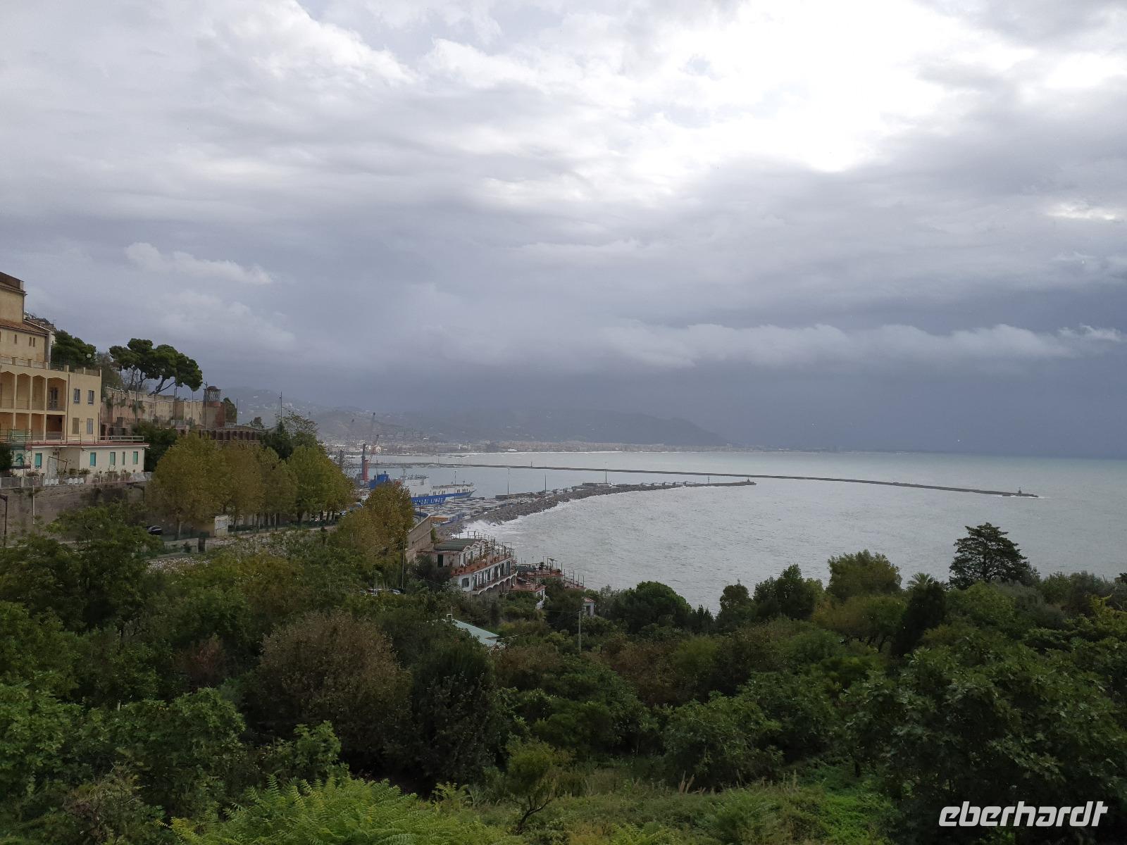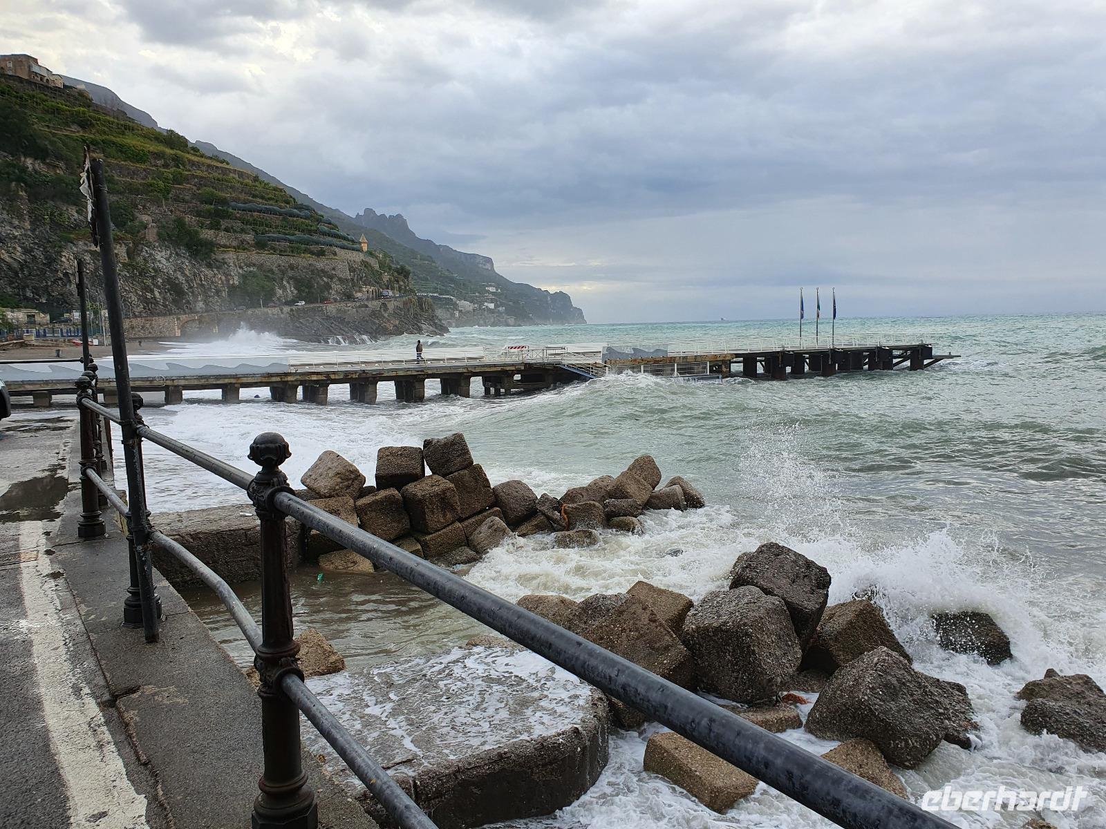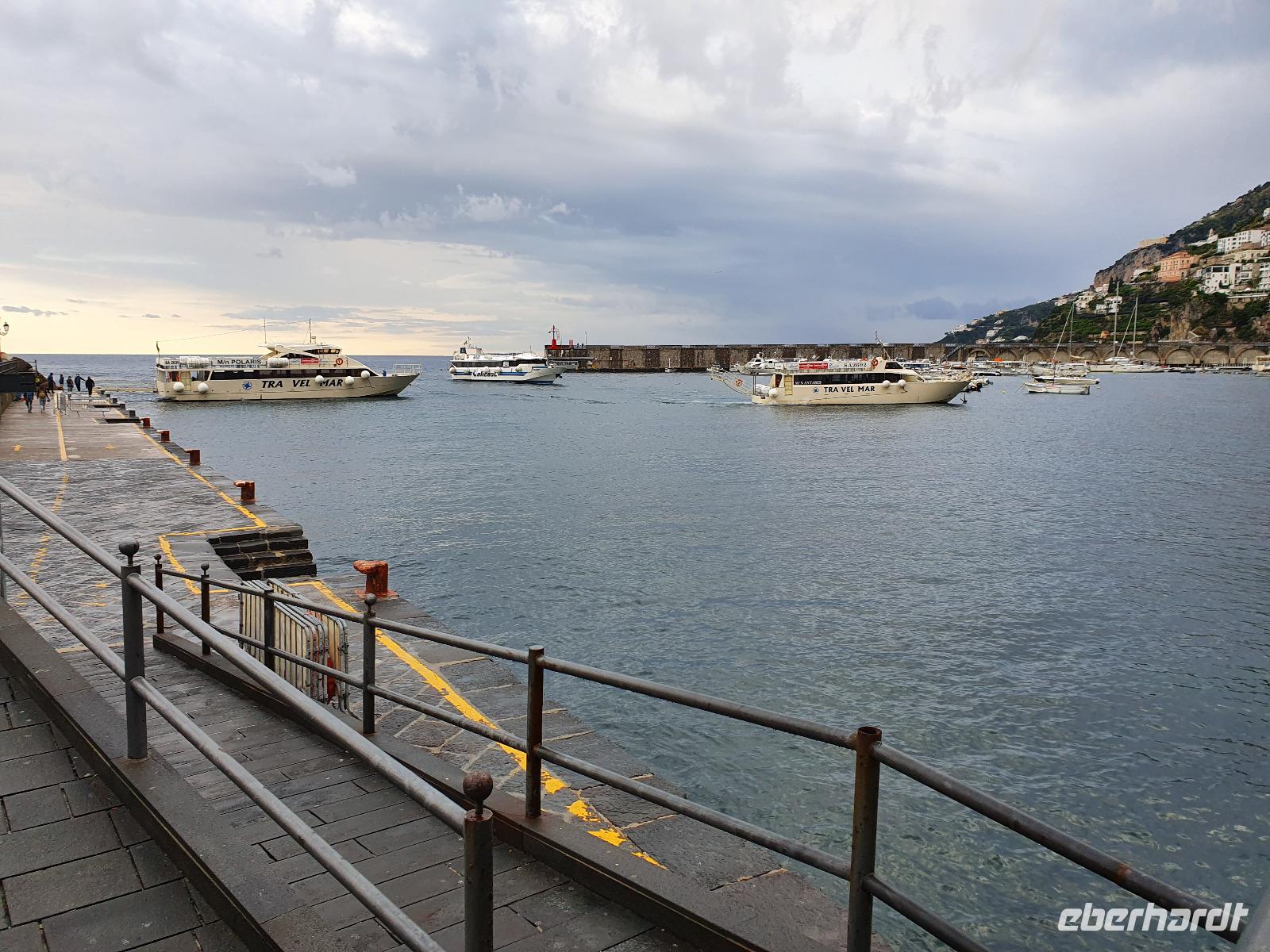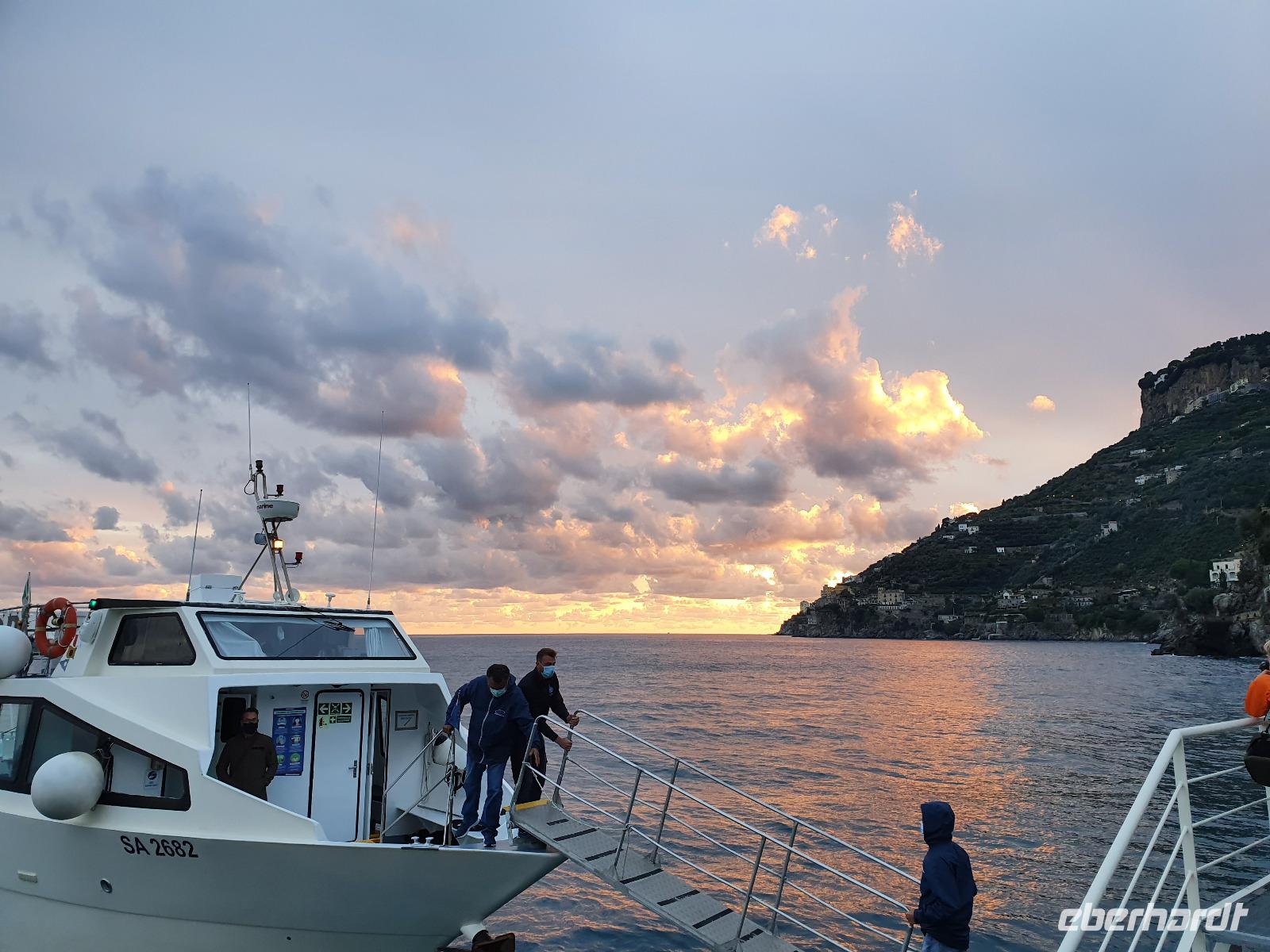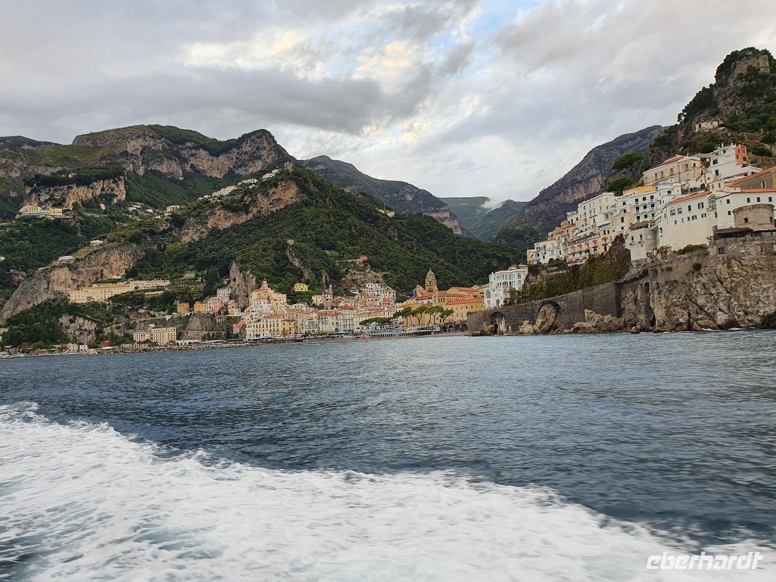 In Amalfi nutzen wir die Zeit zum Kaffeetrinken und probieren Sfogliatella, das köstliche Gebäck der Nonnen vom Kloster Santa Rosa. Zum Treffen am Hafen stellen wir fest, dass sich die Abfahrtszeit unseres Bootes verändert hatte und wir gerade zu spät kommen. So gibt es nochmals Freizeit im Regen und endlich 18 Uhr die Abfahrt nach Minori mit dem Schiff.