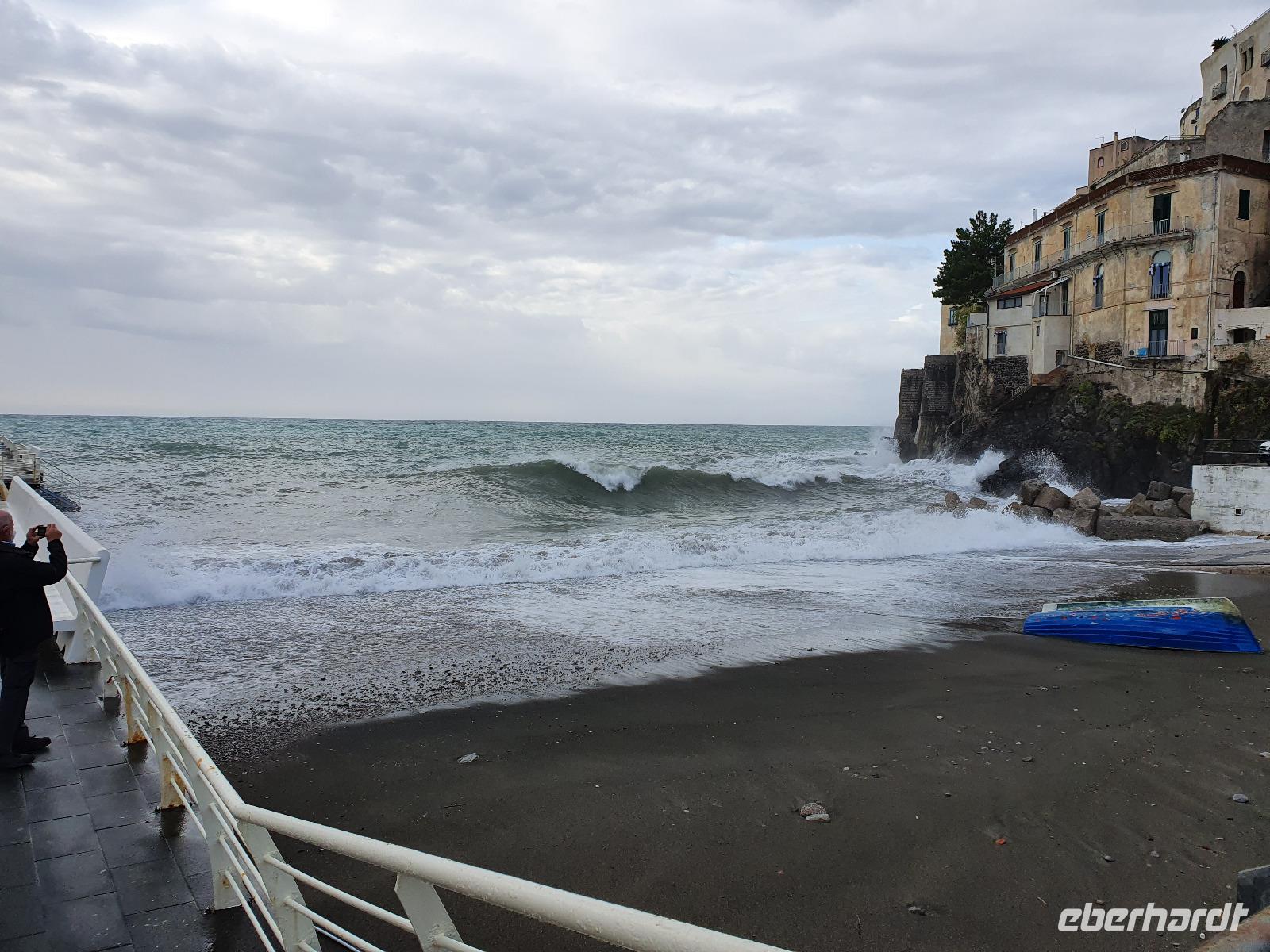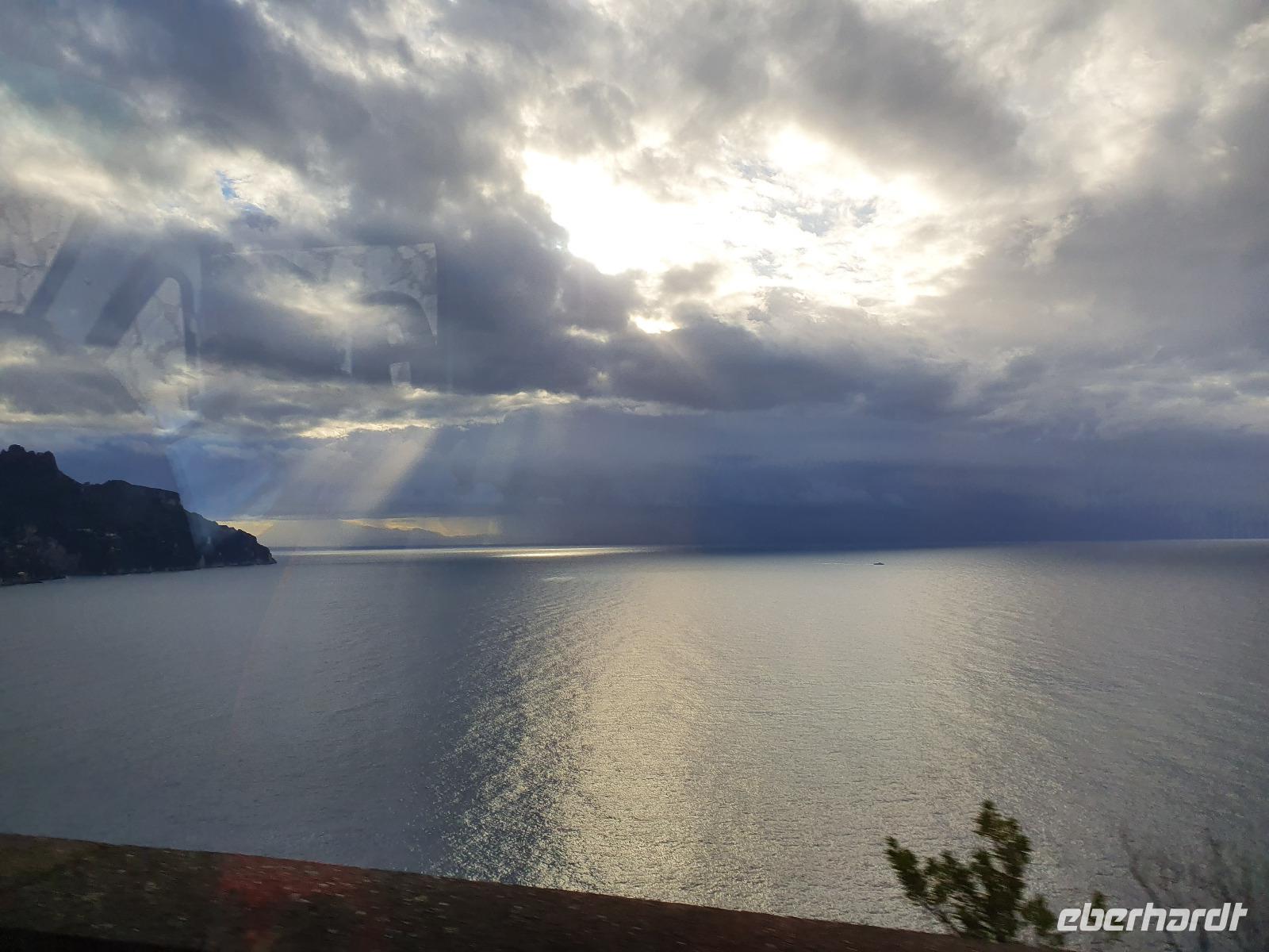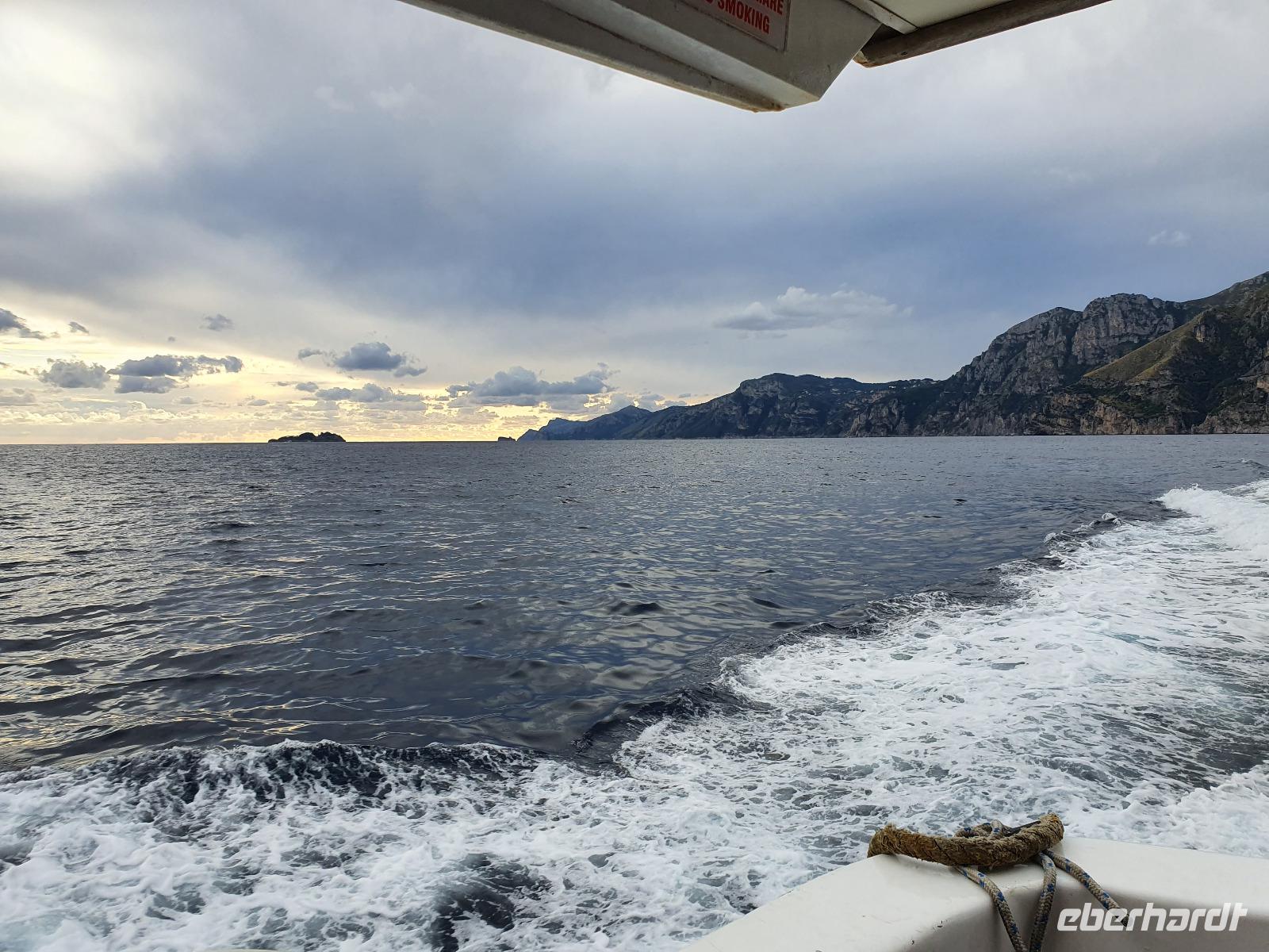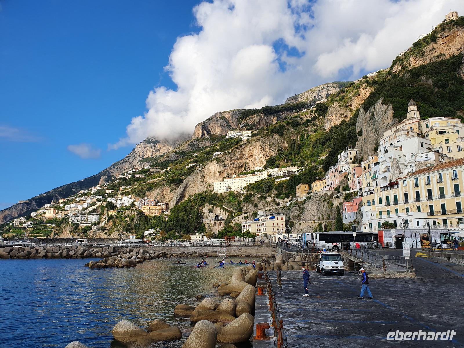In Amalfi nutzen wir die Zeit zum Kaffeetrinken und probieren Sfogliatella, das köstliche Gebäck der Nonnen vom Kloster Santa Rosa. Zum Treffen am Hafen stellen wir fest, dass sich die Abfahrtszeit unseres Bootes verändert hatte und wir gerade zu spät kommen. So gibt es nochmals Freizeit im Regen und endlich 18 Uhr die Abfahrt nach Minori mit dem Schiff.
