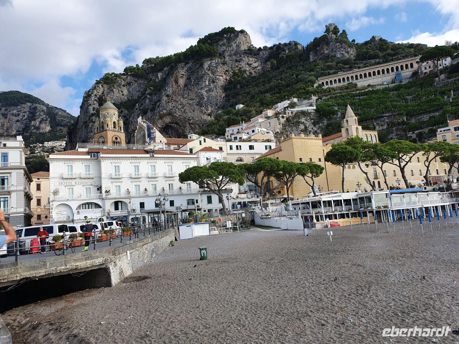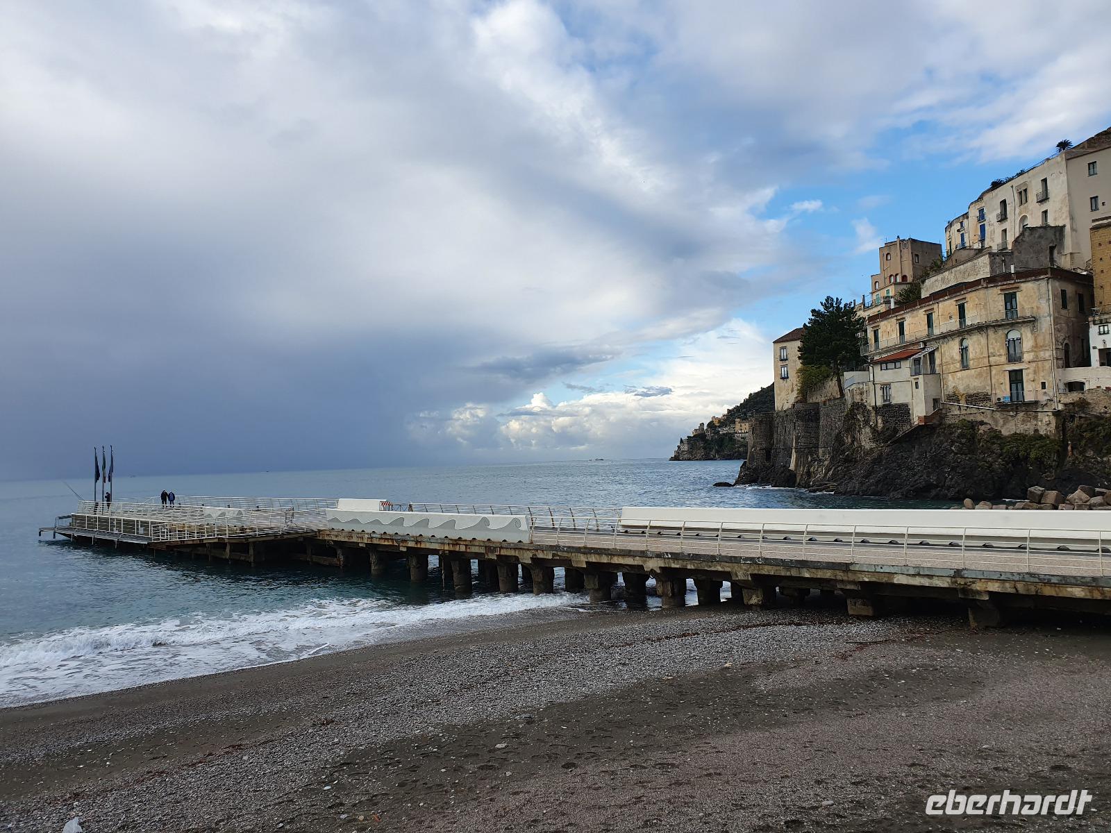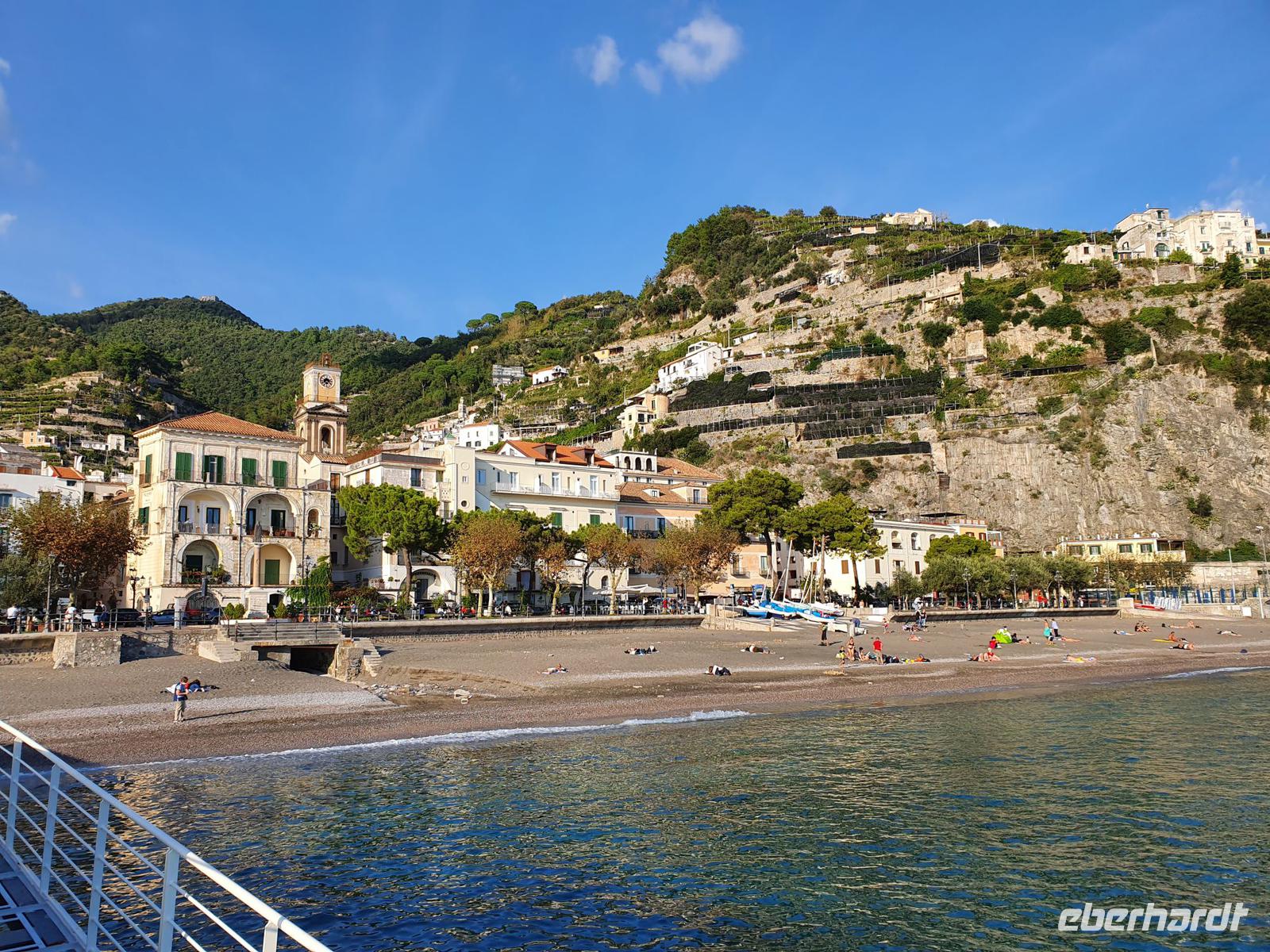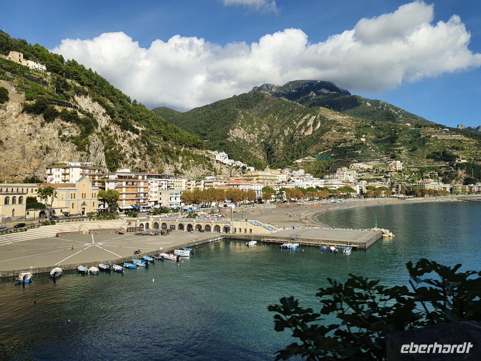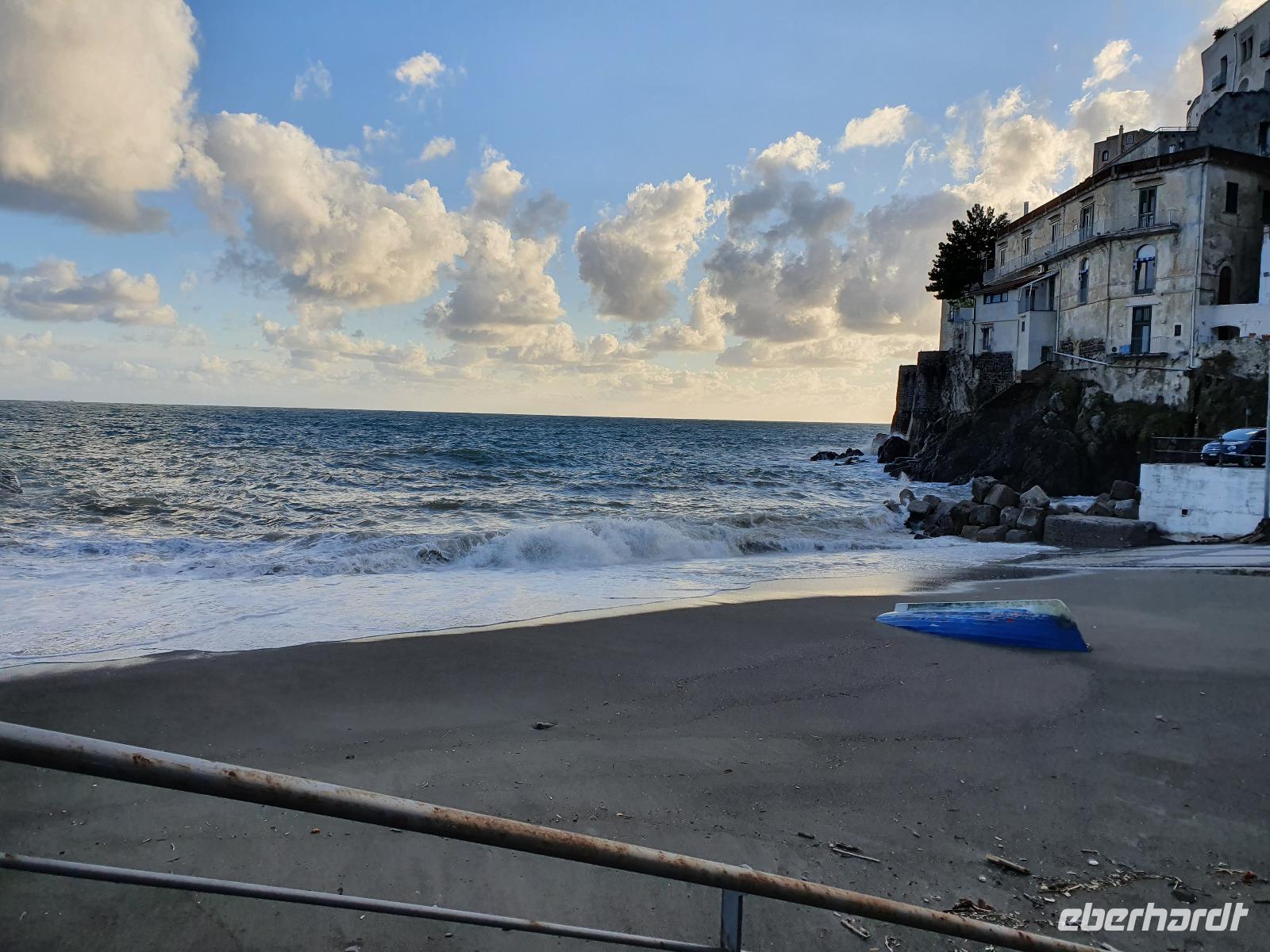 In Amalfi nutzen wir die Zeit zum Kaffeetrinken und probieren Sfogliatella, das köstliche Gebäck der Nonnen vom Kloster Santa Rosa. Zum Treffen am Hafen stellen wir fest, dass sich die Abfahrtszeit unseres Bootes verändert hatte und wir gerade zu spät kommen. So gibt es nochmals Freizeit im Regen und endlich 18 Uhr die Abfahrt nach Minori mit dem Schiff.