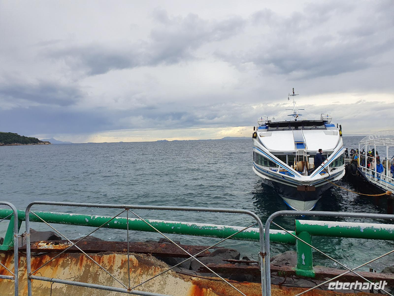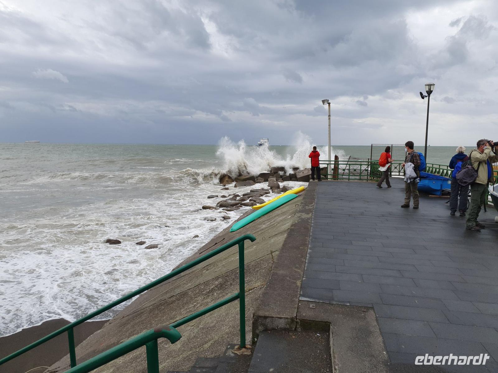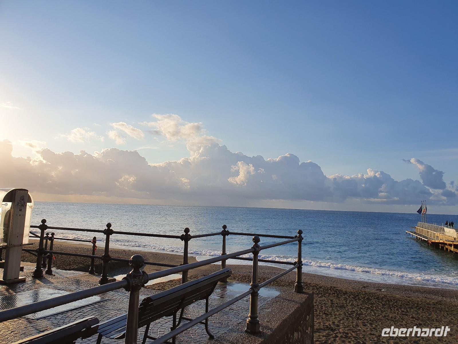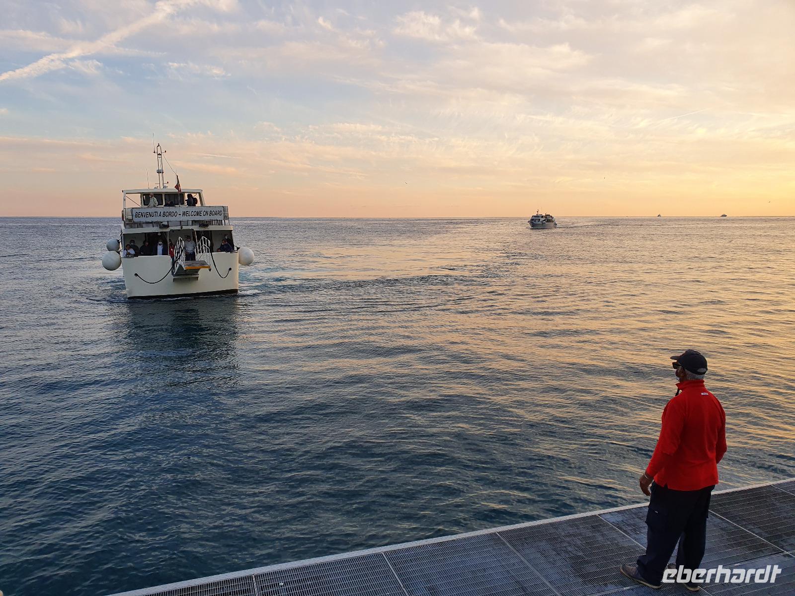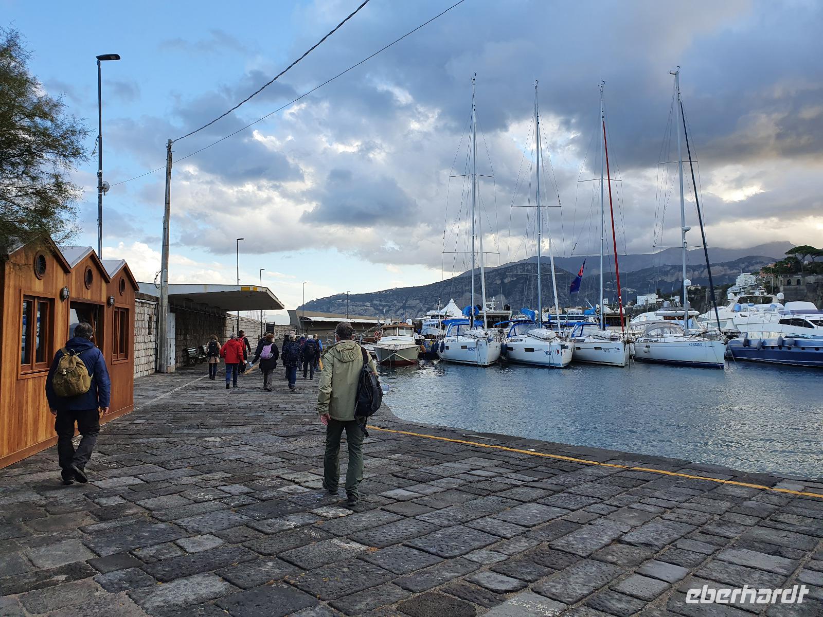 In Amalfi nutzen wir die Zeit zum Kaffeetrinken und probieren Sfogliatella, das köstliche Gebäck der Nonnen vom Kloster Santa Rosa. Zum Treffen am Hafen stellen wir fest, dass sich die Abfahrtszeit unseres Bootes verändert hatte und wir gerade zu spät kommen. So gibt es nochmals Freizeit im Regen und endlich 18 Uhr die Abfahrt nach Minori mit dem Schiff.