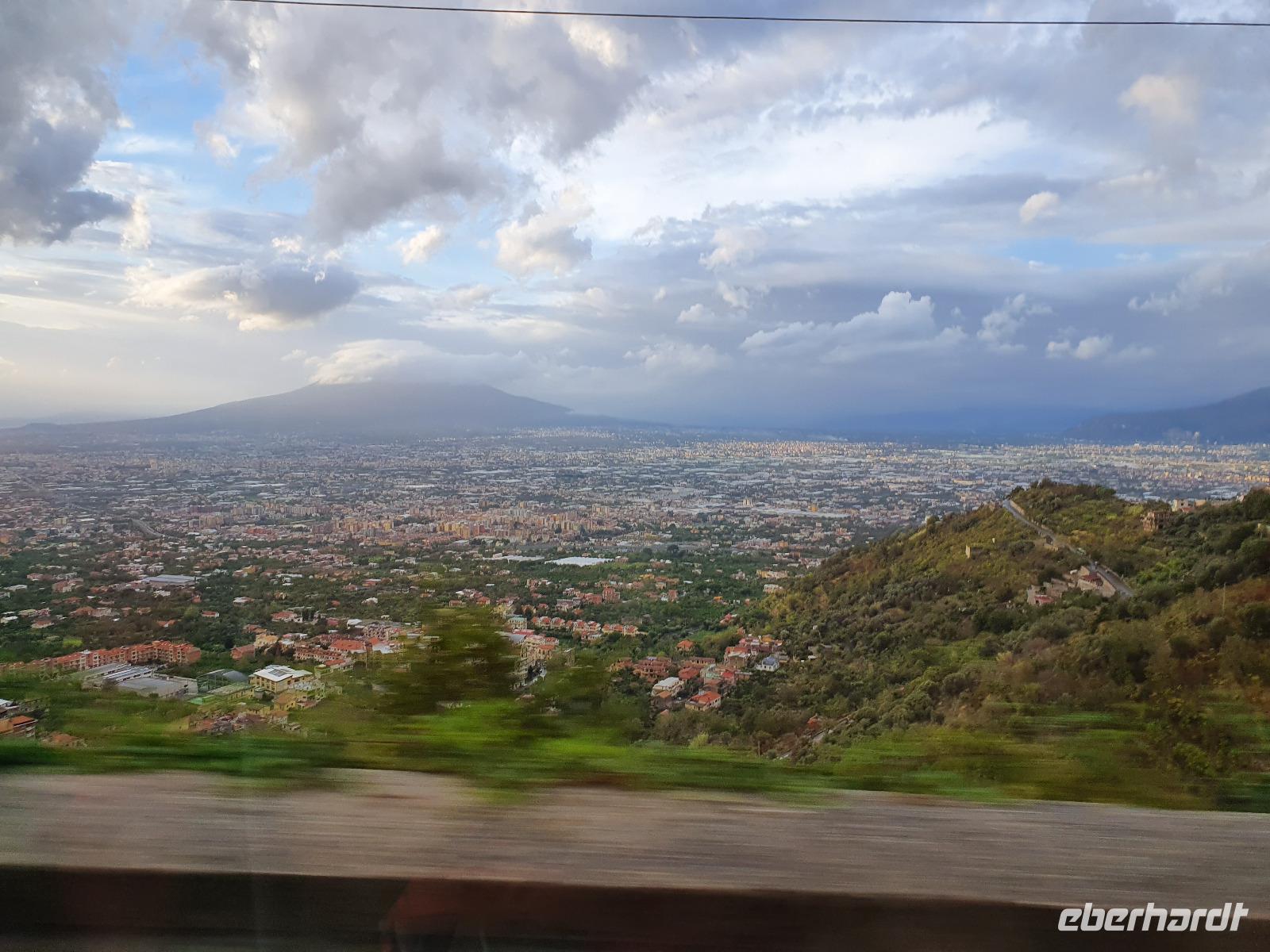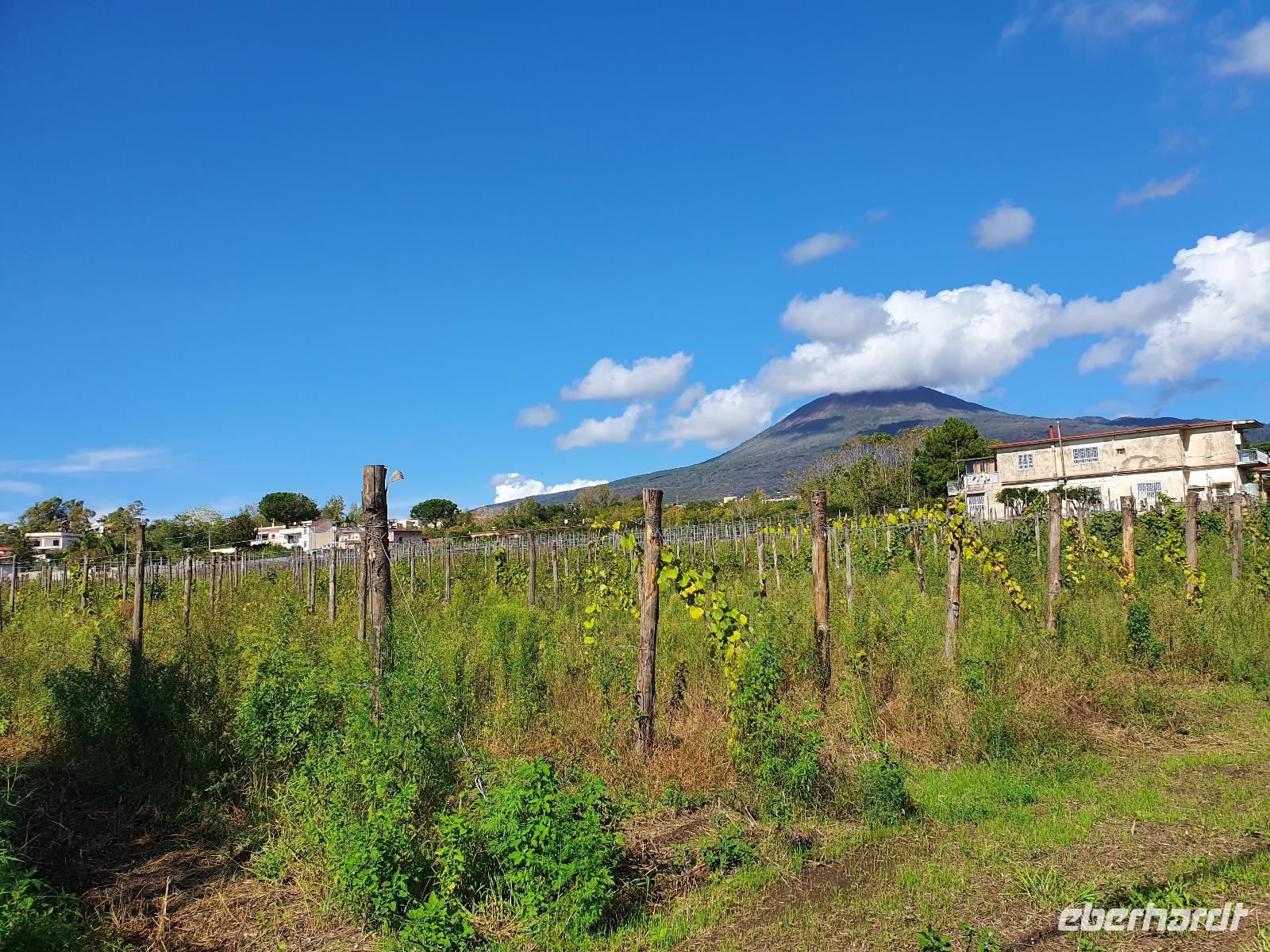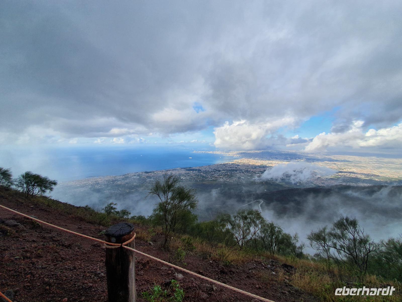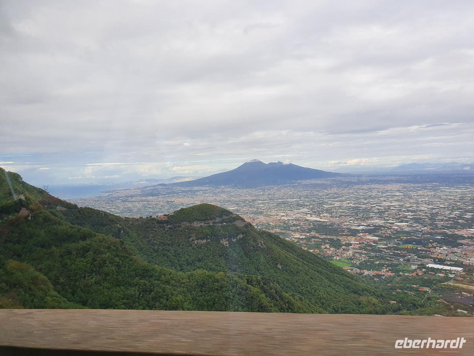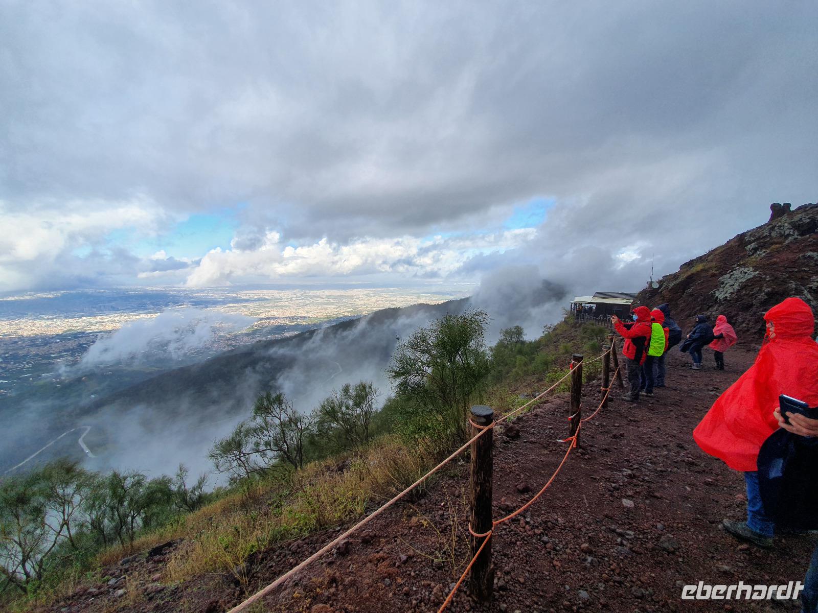 Frühstück gab es wieder zeitiger und so konnten wir schon kurz nach 8 Uhr zu unserer Fahrt über die Monti Lattari starten. Die aussichtsreiche Strecke kannten wir schon von der Anreise und wenn man in 650 m Höhe den Scheiteltunnel am Pass verlässt, öffnet sich ein grandioser Blick hinunter zum Golf von Neapel und zum Vesuv. Unten in der Ebene nehmen wir die Schnellstrasse bis zur Abfahrt Vesuvio und dann geht es wieder stets bergan bis auf 1000 m Höhe. Dort oben sind wir in den Wolken und im Regen. Beim Einlass zum Weg auf den Vesuv mussten wir vorab eine Zeit buchen und nach der schon gewohnten Fieber Messung wandern wir immer bergan bis zum Kraterrand des Vesuvs. Eigentlich sollte uns ein Bergführer begleiten, aber bei diesem nassen und windigen Wetter verlassen die Bergführer ihre Hütten nicht und geben uns die wichtigen Informationen an ihren Stationen. Wir aber wanderten tapfer immer am Kraterrand entlang und wurden belohnt. So wie im Theater öffnete sich der "Wolken" Vorhang immer mal und gab den Blick frei hinunter in die Ebene, wo die Sonne schien. So konnten wir das Panorama von Neapel über die Inseln Ischia und Capri bis hin zur sorrentinischen Halbinsel geniessen. Auch die Hafenanlagen der Orte unten im Golf waren gut zu erkennen. Auf dem Rückweg kauften wir an einem Kiosk ein und tranken etwas heisses. Am Ende der Kraterrandes erwartete uns dann Julia in ihrer Bergführerhütte und war ganz überrascht, als wir berichteten, dass doch was zu sehen war. Julia erläuterte sehr anschaulich die Entstehung der Kraters und hatte Fotos, aufgenommen vor dem letzten Ausbruch 1944 zur Hand. Auf gleichem Weg gehen wir zurück zum Parkplatz und unser Bus bringt uns hinunter zum Weingut Casa Setaro.