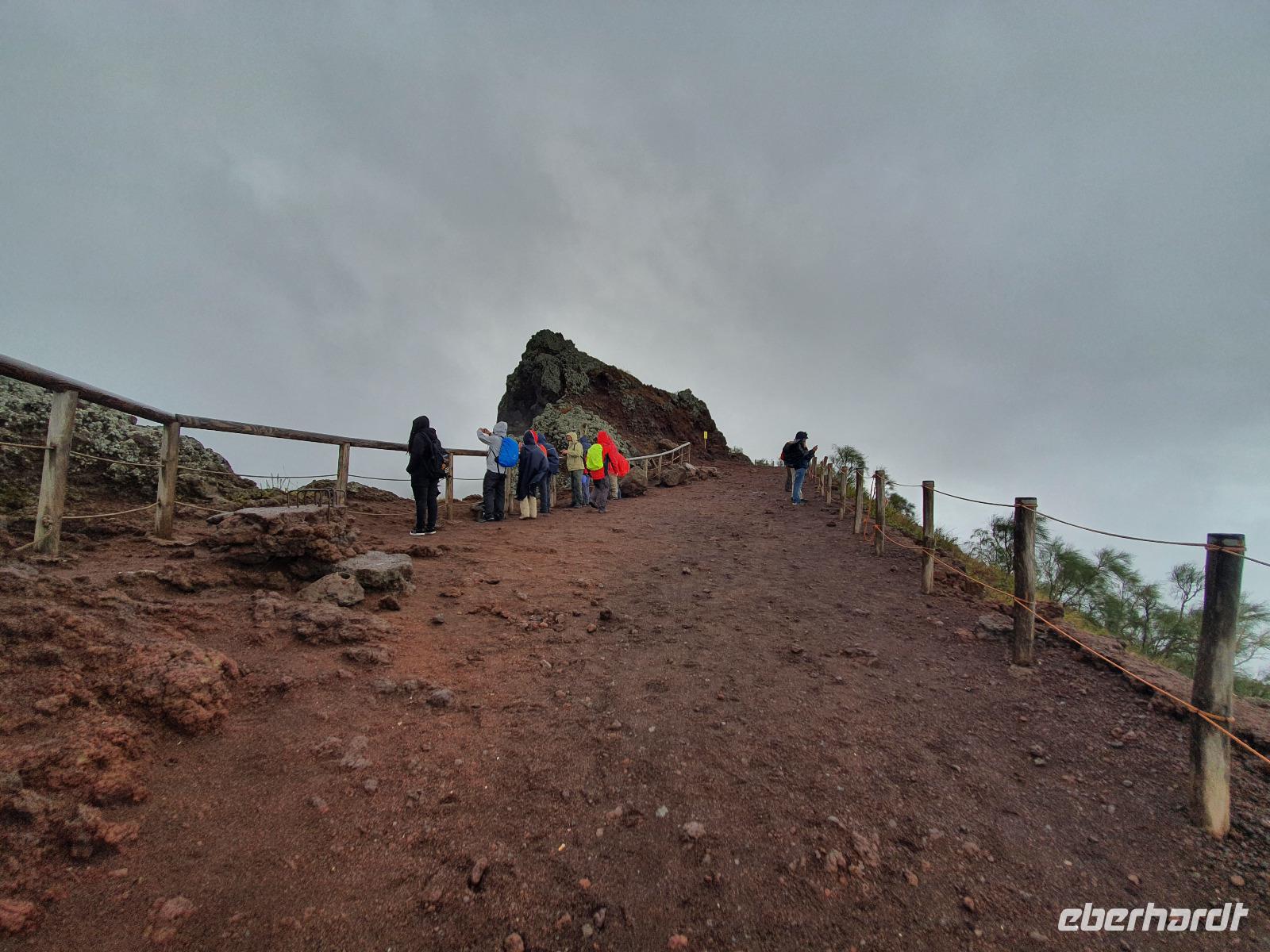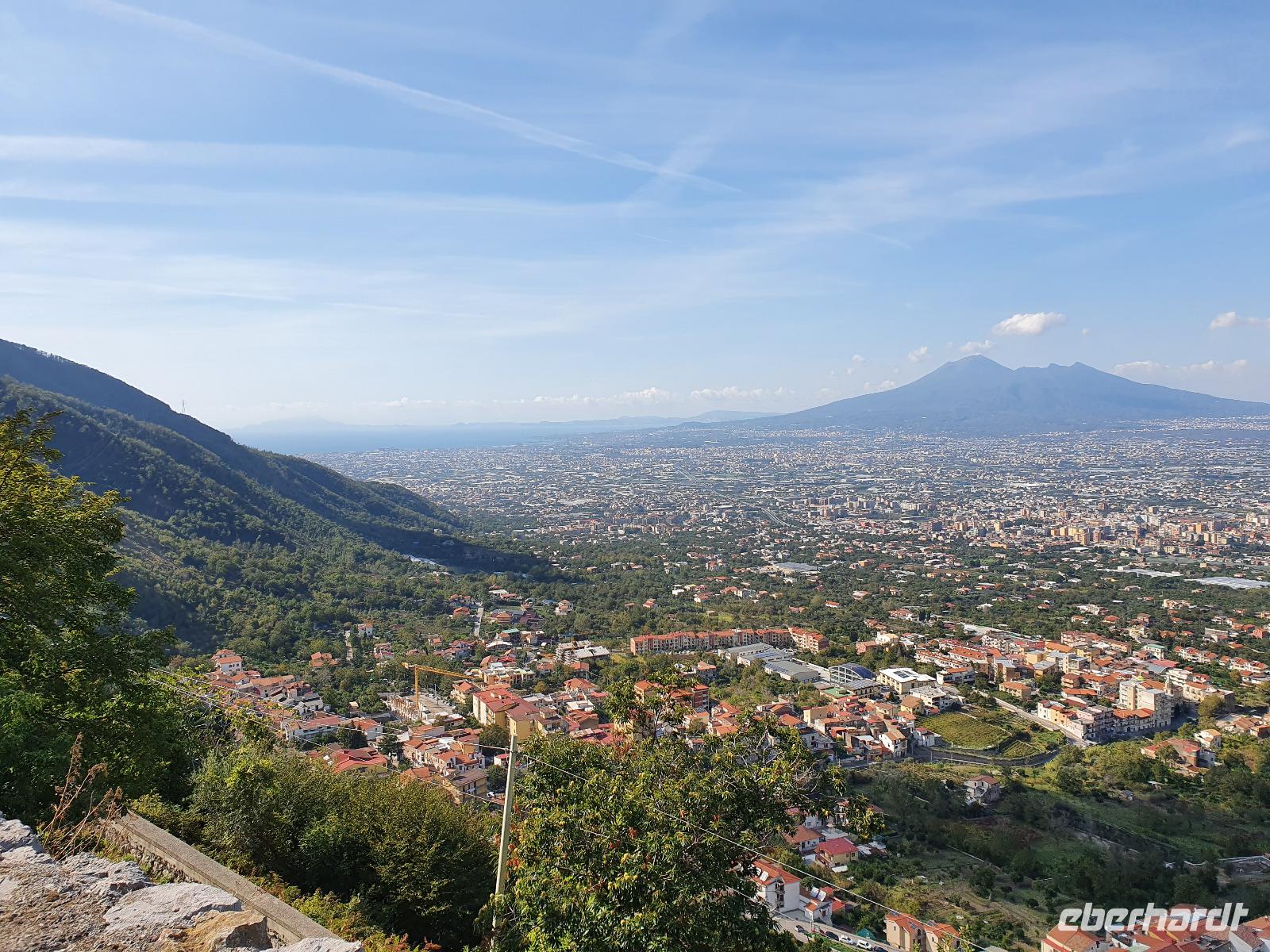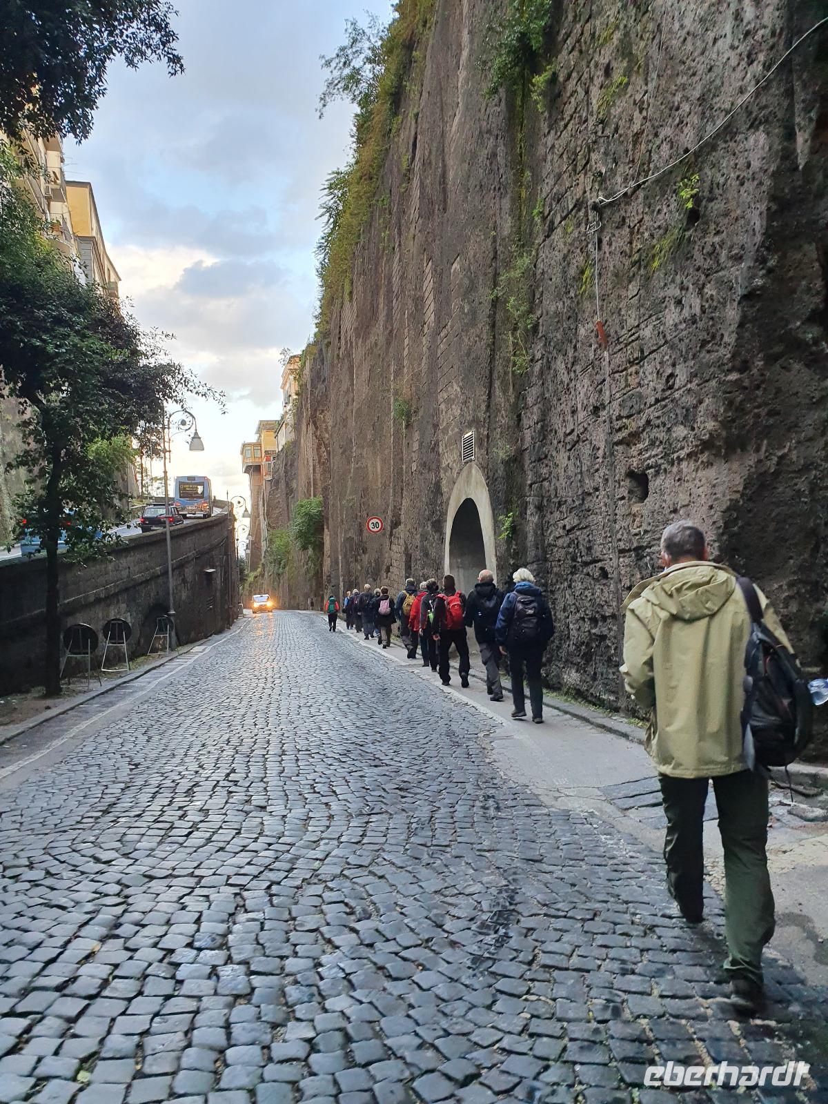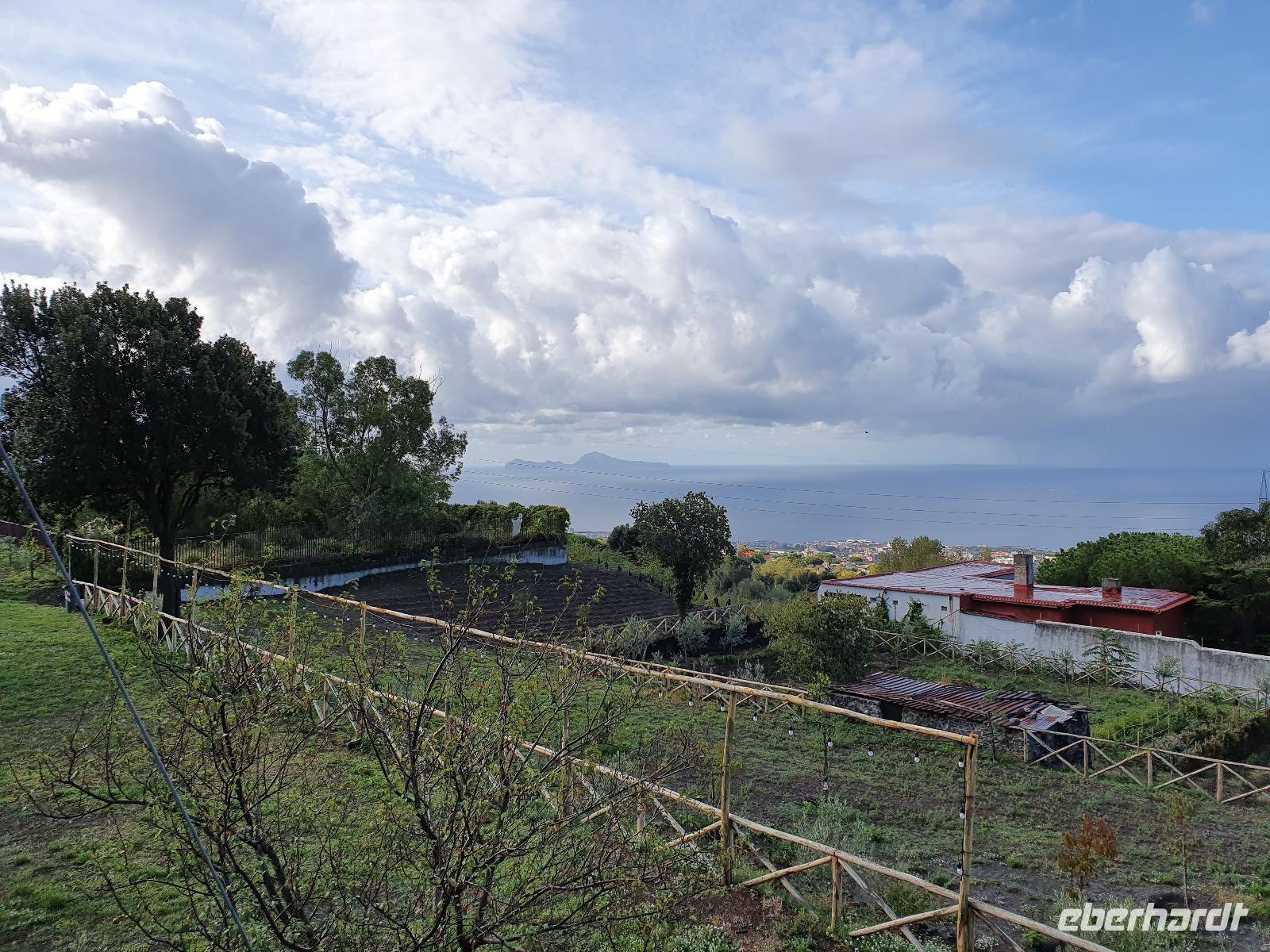 Frühstück gab es wieder zeitiger und so konnten wir schon kurz nach 8 Uhr zu unserer Fahrt über die Monti Lattari starten. Die aussichtsreiche Strecke kannten wir schon von der Anreise und wenn man in 650 m Höhe den Scheiteltunnel am Pass verlässt, öffnet sich ein grandioser Blick hinunter zum Golf von Neapel und zum Vesuv. Unten in der Ebene nehmen wir die Schnellstrasse bis zur Abfahrt Vesuvio und dann geht es wieder stets bergan bis auf 1000 m Höhe. Dort oben sind wir in den Wolken und im Regen. Beim Einlass zum Weg auf den Vesuv mussten wir vorab eine Zeit buchen und nach der schon gewohnten Fieber Messung wandern wir immer bergan bis zum Kraterrand des Vesuvs. Eigentlich sollte uns ein Bergführer begleiten, aber bei diesem nassen und windigen Wetter verlassen die Bergführer ihre Hütten nicht und geben uns die wichtigen Informationen an ihren Stationen. Wir aber wanderten tapfer immer am Kraterrand entlang und wurden belohnt. So wie im Theater öffnete sich der "Wolken" Vorhang immer mal und gab den Blick frei hinunter in die Ebene, wo die Sonne schien. So konnten wir das Panorama von Neapel über die Inseln Ischia und Capri bis hin zur sorrentinischen Halbinsel geniessen. Auch die Hafenanlagen der Orte unten im Golf waren gut zu erkennen. Auf dem Rückweg kauften wir an einem Kiosk ein und tranken etwas heisses. Am Ende der Kraterrandes erwartete uns dann Julia in ihrer Bergführerhütte und war ganz überrascht, als wir berichteten, dass doch was zu sehen war. Julia erläuterte sehr anschaulich die Entstehung der Kraters und hatte Fotos, aufgenommen vor dem letzten Ausbruch 1944 zur Hand. Auf gleichem Weg gehen wir zurück zum Parkplatz und unser Bus bringt uns hinunter zum Weingut Casa Setaro.