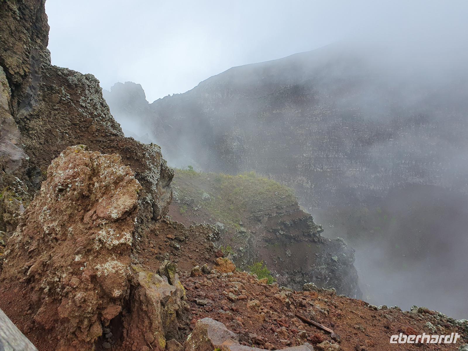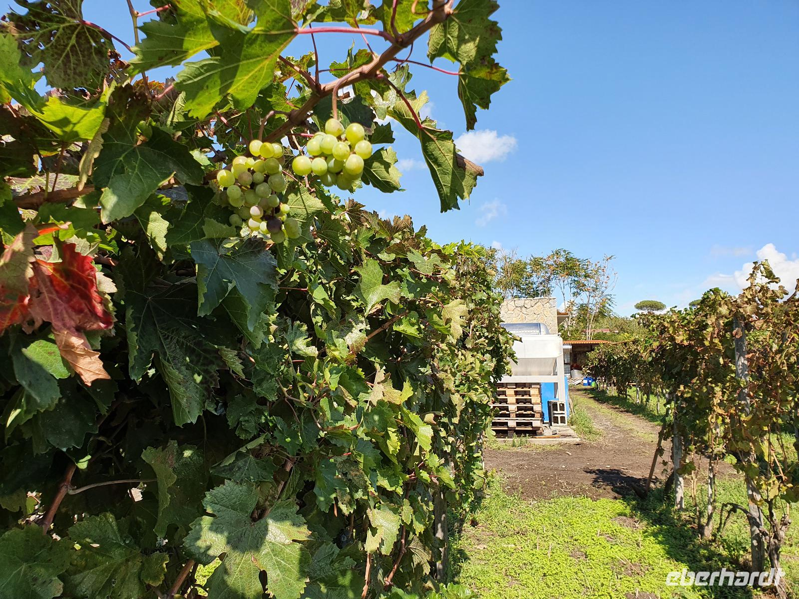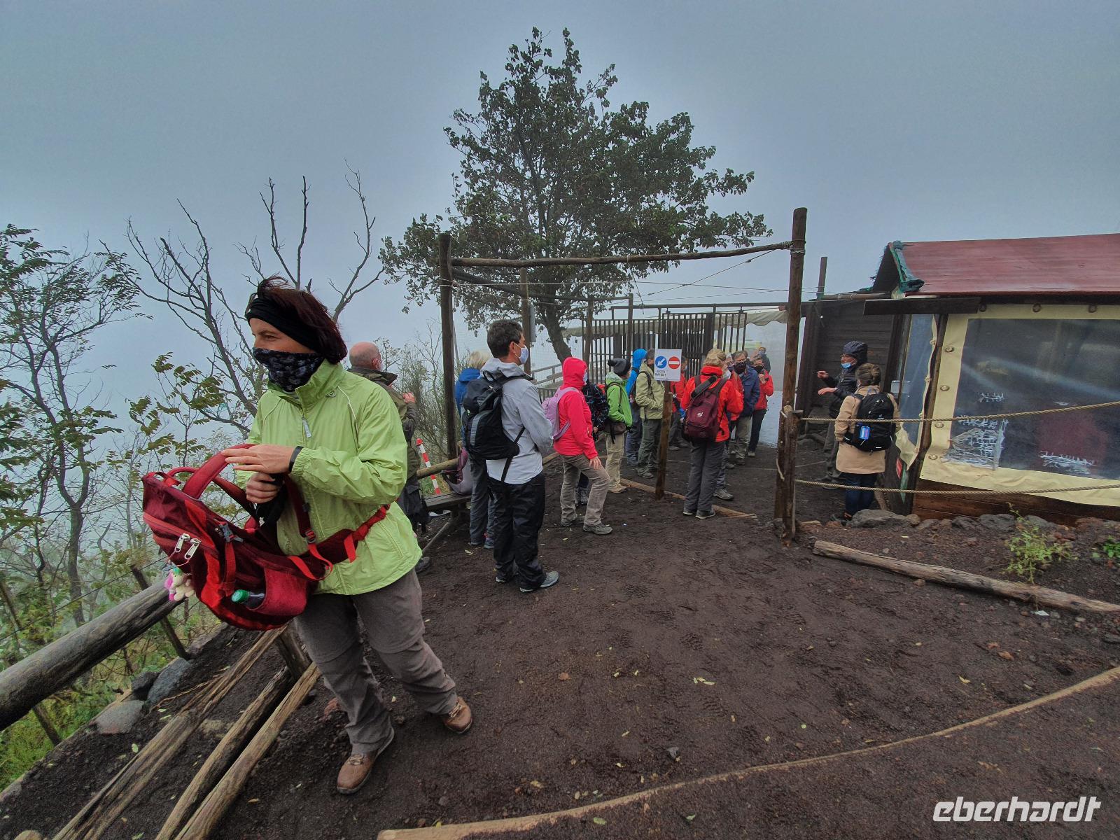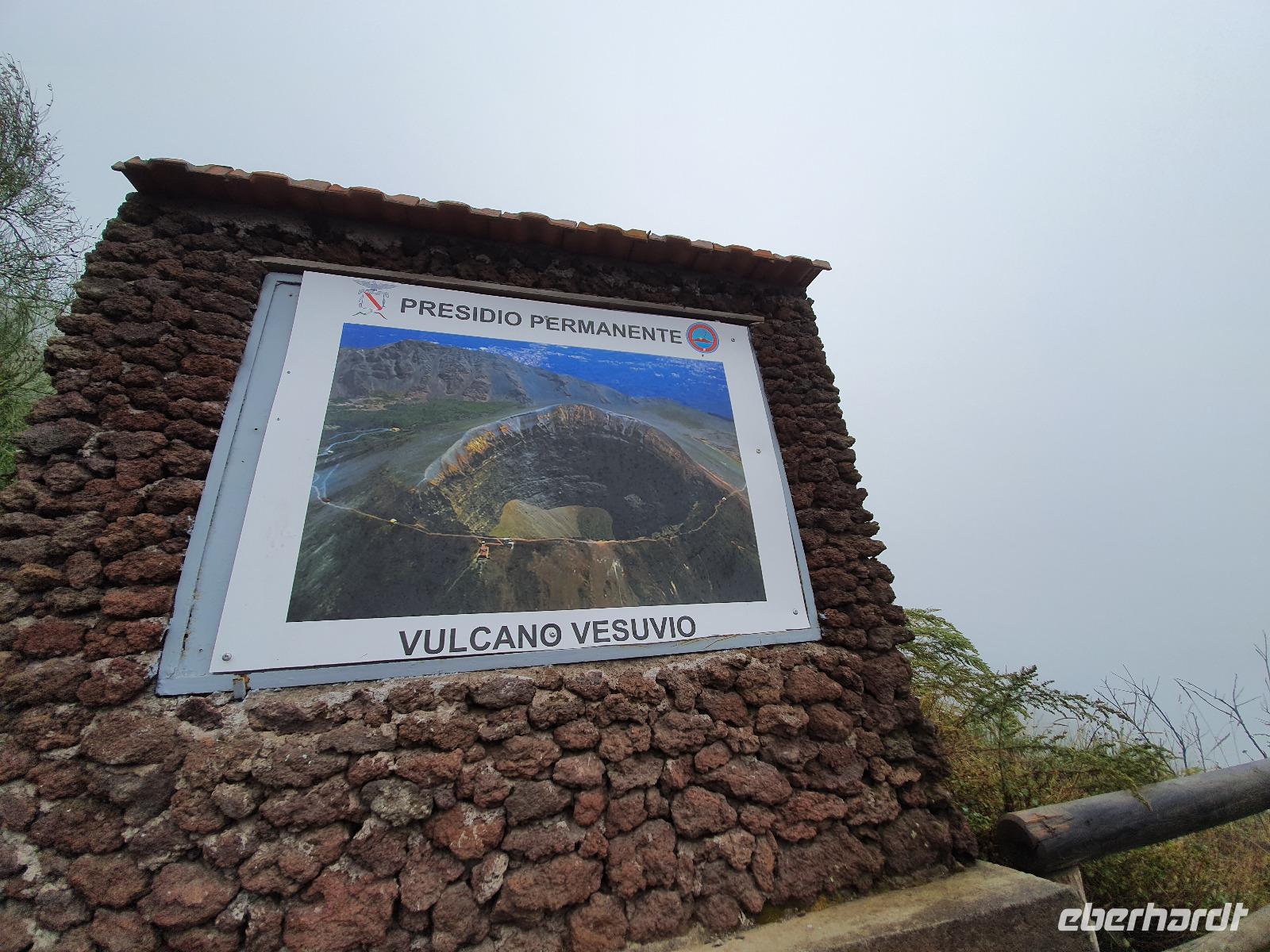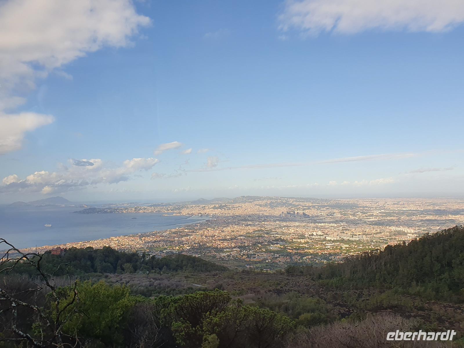 Frühstück gab es wieder zeitiger und so konnten wir schon kurz nach 8 Uhr zu unserer Fahrt über die Monti Lattari starten. Die aussichtsreiche Strecke kannten wir schon von der Anreise und wenn man in 650 m Höhe den Scheiteltunnel am Pass verlässt, öffnet sich ein grandioser Blick hinunter zum Golf von Neapel und zum Vesuv. Unten in der Ebene nehmen wir die Schnellstrasse bis zur Abfahrt Vesuvio und dann geht es wieder stets bergan bis auf 1000 m Höhe. Dort oben sind wir in den Wolken und im Regen. Beim Einlass zum Weg auf den Vesuv mussten wir vorab eine Zeit buchen und nach der schon gewohnten Fieber Messung wandern wir immer bergan bis zum Kraterrand des Vesuvs. Eigentlich sollte uns ein Bergführer begleiten, aber bei diesem nassen und windigen Wetter verlassen die Bergführer ihre Hütten nicht und geben uns die wichtigen Informationen an ihren Stationen. Wir aber wanderten tapfer immer am Kraterrand entlang und wurden belohnt. So wie im Theater öffnete sich der "Wolken" Vorhang immer mal und gab den Blick frei hinunter in die Ebene, wo die Sonne schien. So konnten wir das Panorama von Neapel über die Inseln Ischia und Capri bis hin zur sorrentinischen Halbinsel geniessen. Auch die Hafenanlagen der Orte unten im Golf waren gut zu erkennen. Auf dem Rückweg kauften wir an einem Kiosk ein und tranken etwas heisses. Am Ende der Kraterrandes erwartete uns dann Julia in ihrer Bergführerhütte und war ganz überrascht, als wir berichteten, dass doch was zu sehen war. Julia erläuterte sehr anschaulich die Entstehung der Kraters und hatte Fotos, aufgenommen vor dem letzten Ausbruch 1944 zur Hand. Auf gleichem Weg gehen wir zurück zum Parkplatz und unser Bus bringt uns hinunter zum Weingut Casa Setaro.