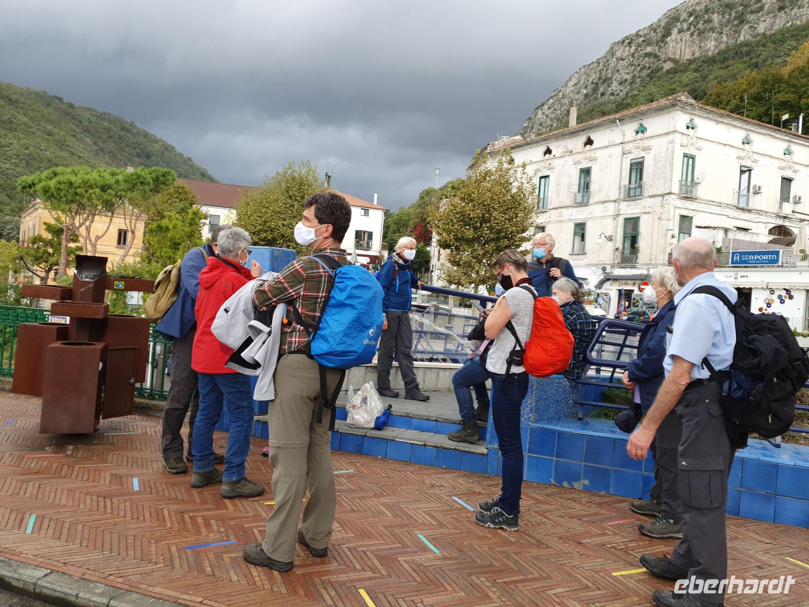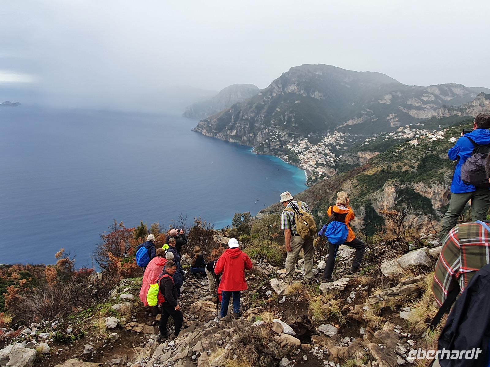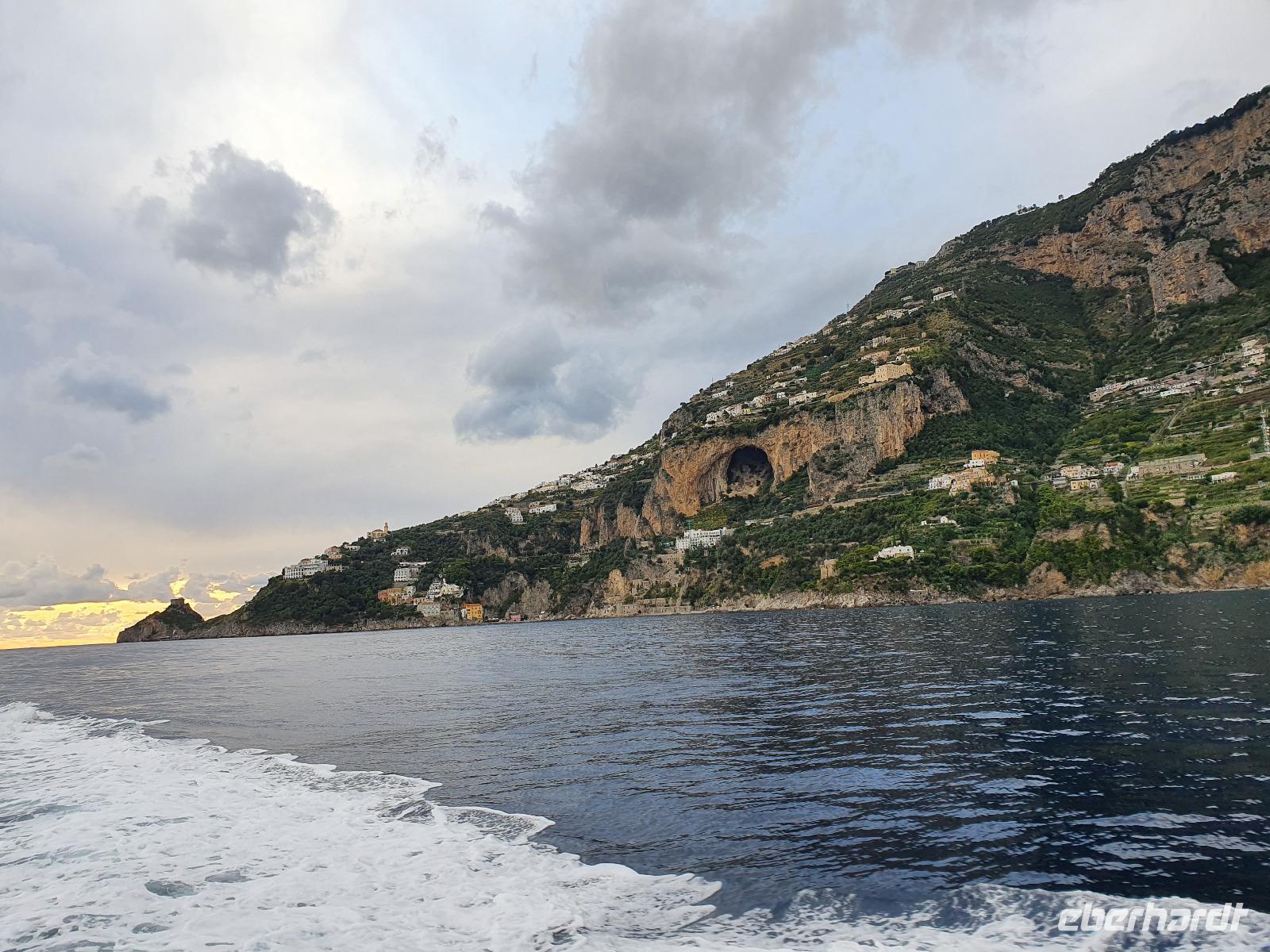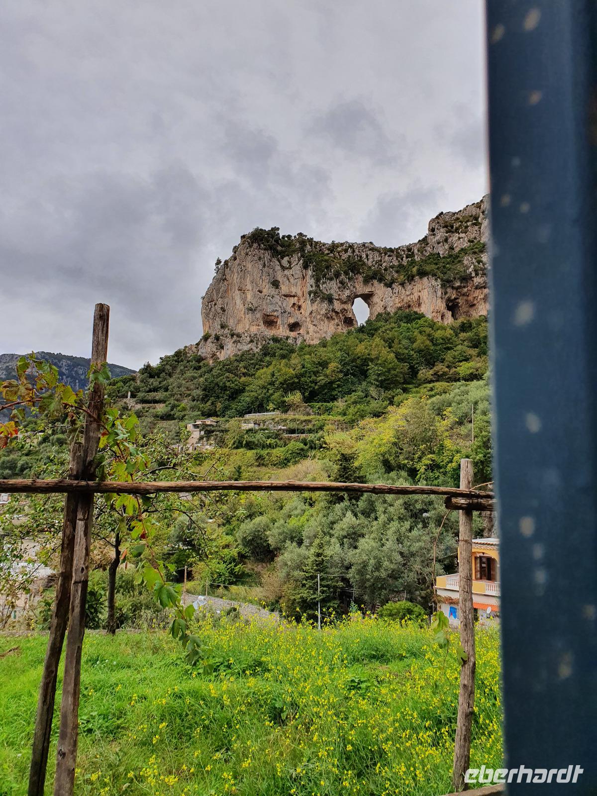Gut gestärkt und erholt nehmen wir die letzte Etappe unserer Wanderung in Angriff. Gemeinsam laufen wir durch Nocelle zur Bushaltestelle und dort nehmen 5 Gäste den Bus hinunter nach Positano. Vor den Wanderern liegen nun 1300 Treppenstufen und 440 Höhenmeter hinunter. Zunächst wandern wir auf der Strasse bis nach Monte Perduso, benannt nach dem Felsen mit dem Loch und den sehen wir auch gut. Bei der Kirche beginnen dann die Treppen und die verfolgen uns bis Positano hinunter ans Meer. Unten treffen wir die "Busfahrer" und 2 Gäste, die sich heute eine Auszeit nahmen und mit dem Linienbus von Minori nach Positano reisten. Gemeinsam fahren wir mit dem Linienboot entlang der Küste über Amalfi zurück nach Minori.