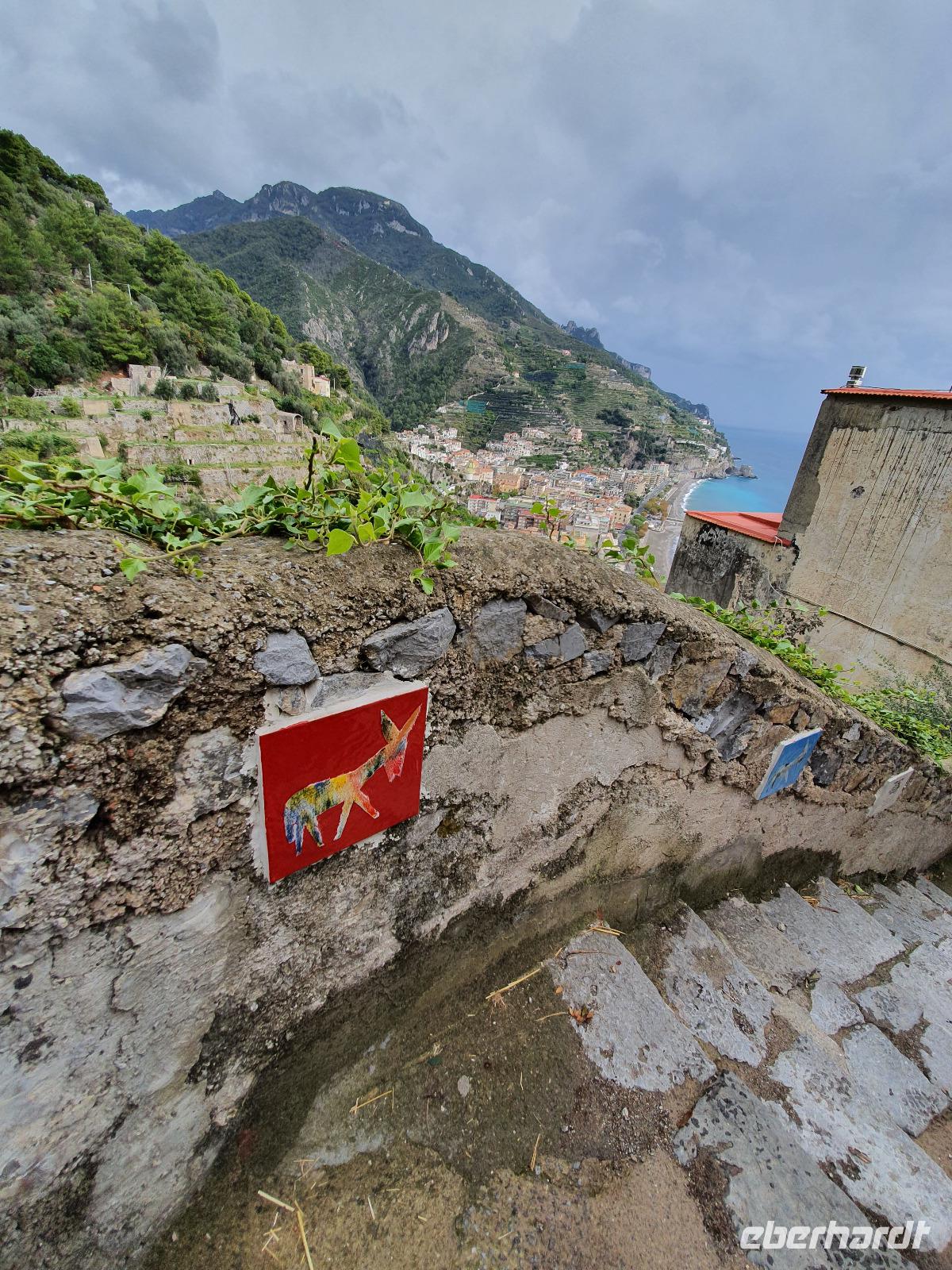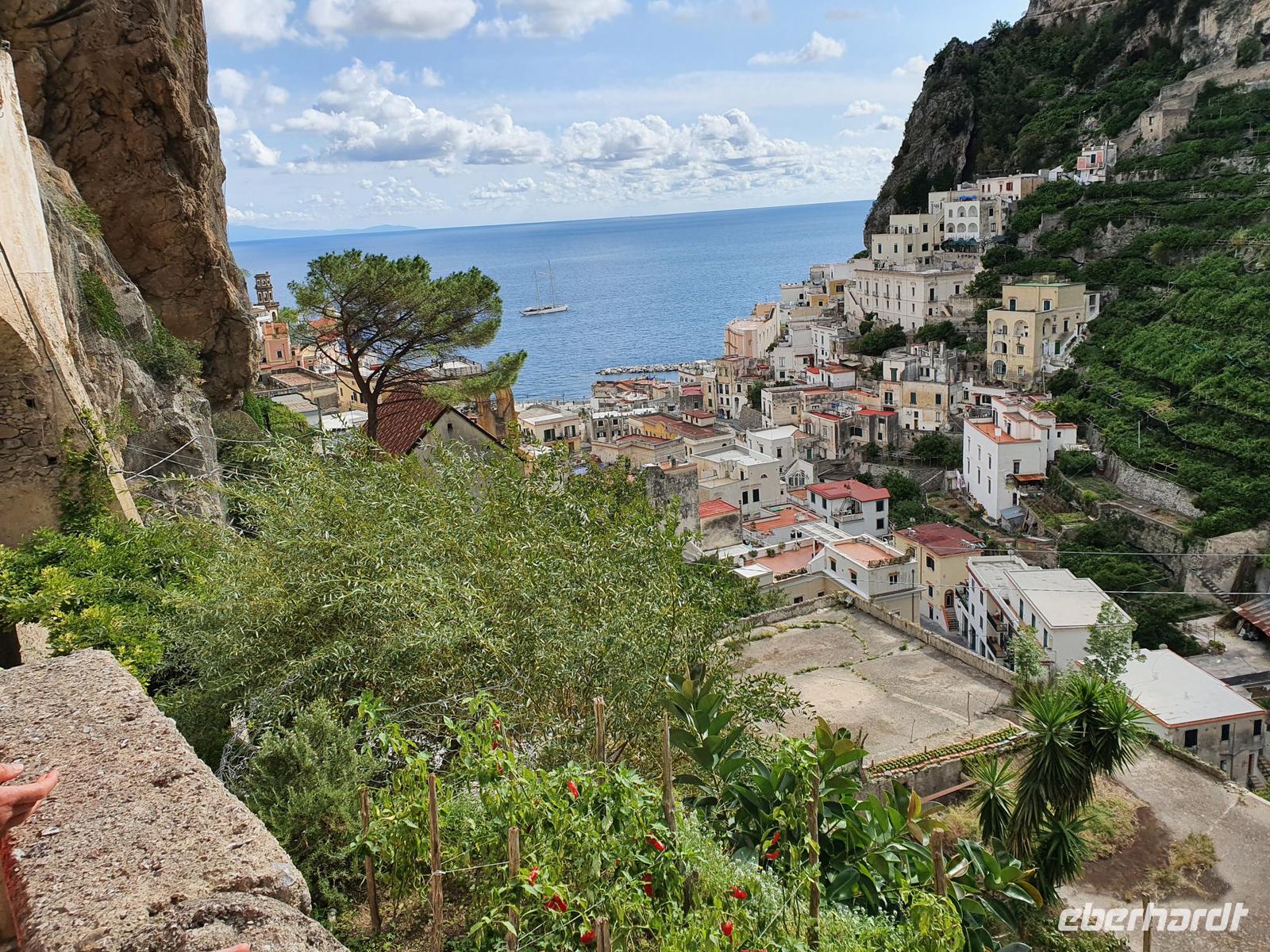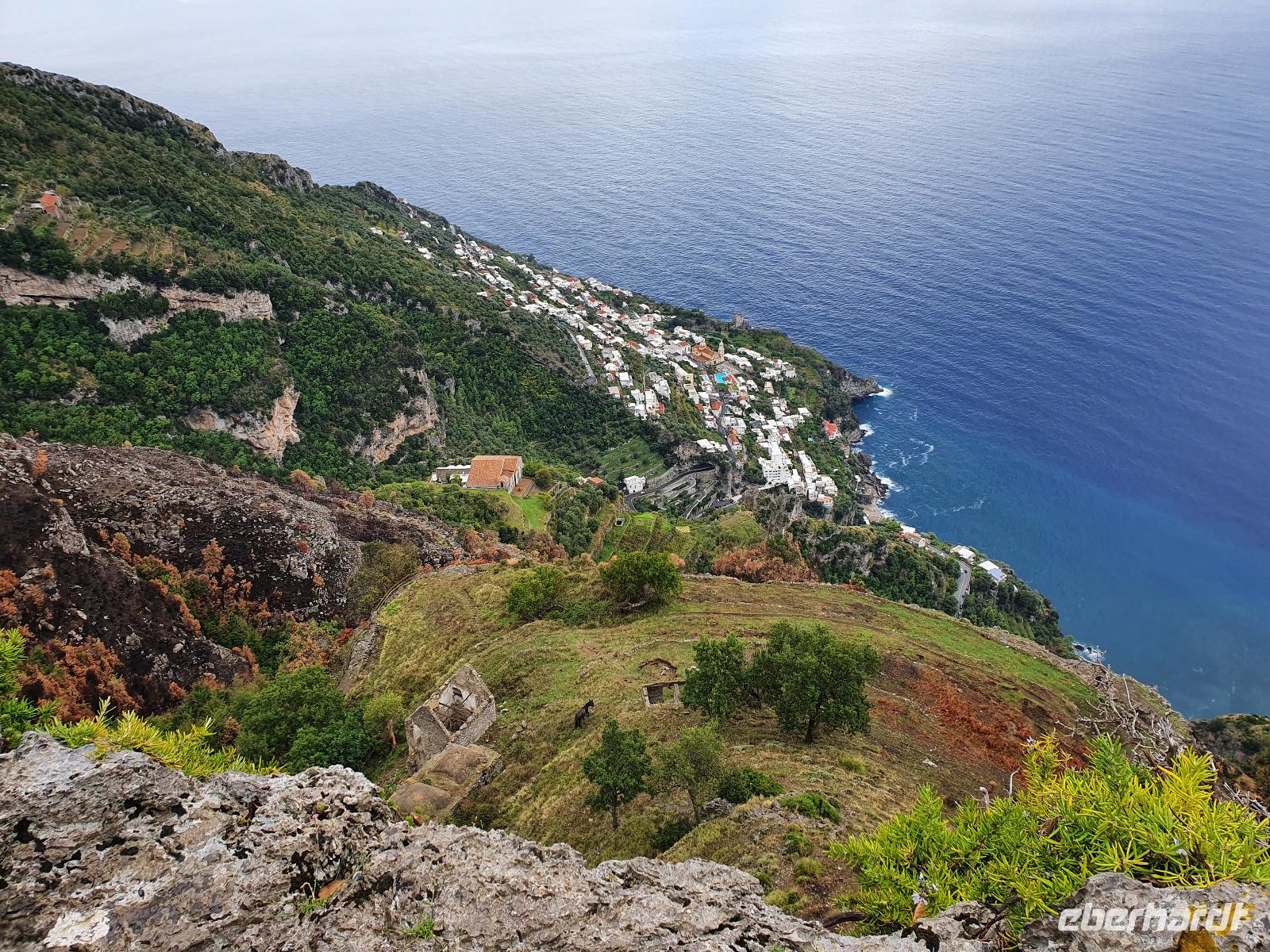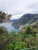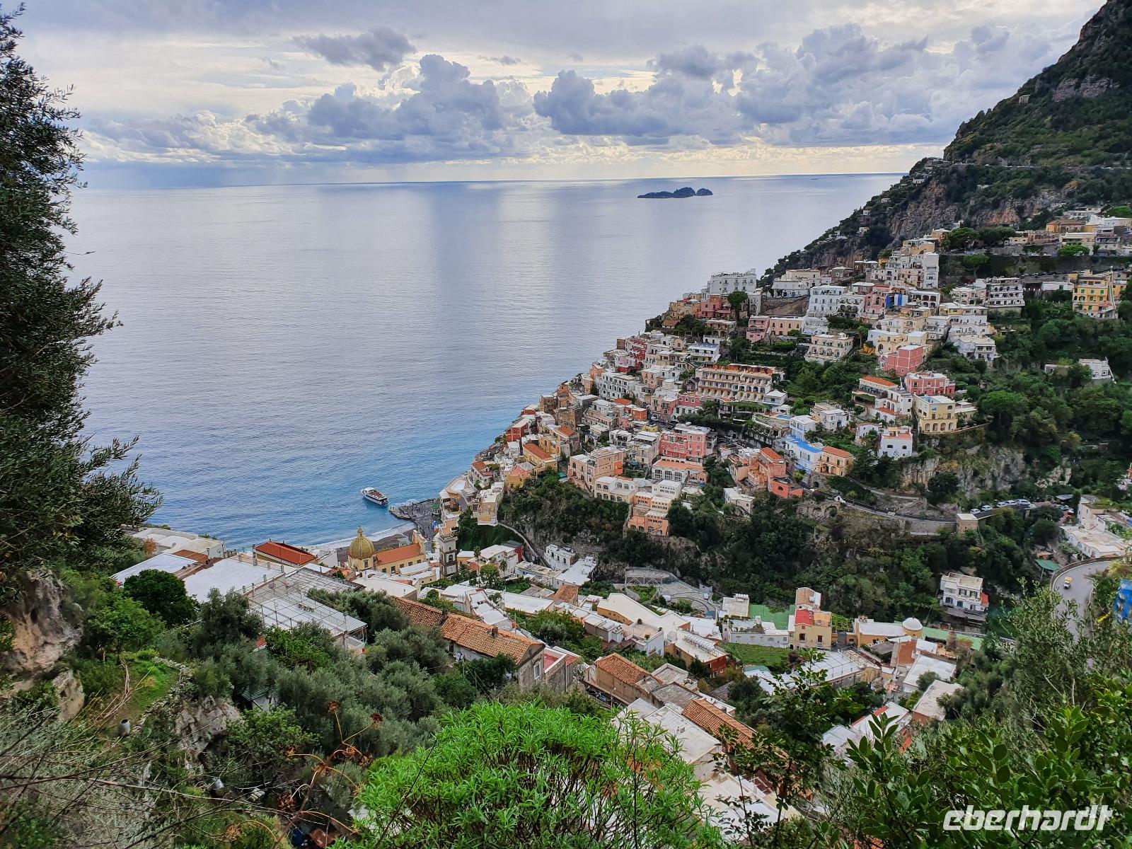Gut gestärkt und erholt nehmen wir die letzte Etappe unserer Wanderung in Angriff. Gemeinsam laufen wir durch Nocelle zur Bushaltestelle und dort nehmen 5 Gäste den Bus hinunter nach Positano. Vor den Wanderern liegen nun 1300 Treppenstufen und 440 Höhenmeter hinunter. Zunächst wandern wir auf der Strasse bis nach Monte Perduso, benannt nach dem Felsen mit dem Loch und den sehen wir auch gut. Bei der Kirche beginnen dann die Treppen und die verfolgen uns bis Positano hinunter ans Meer. Unten treffen wir die "Busfahrer" und 2 Gäste, die sich heute eine Auszeit nahmen und mit dem Linienbus von Minori nach Positano reisten. Gemeinsam fahren wir mit dem Linienboot entlang der Küste über Amalfi zurück nach Minori.
