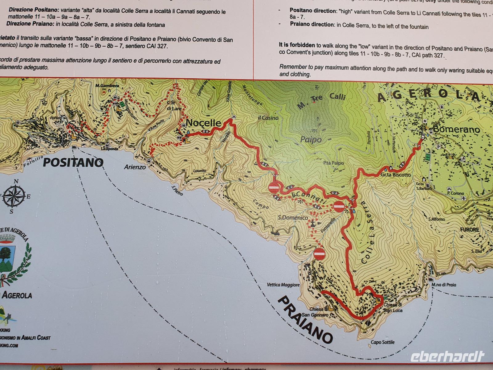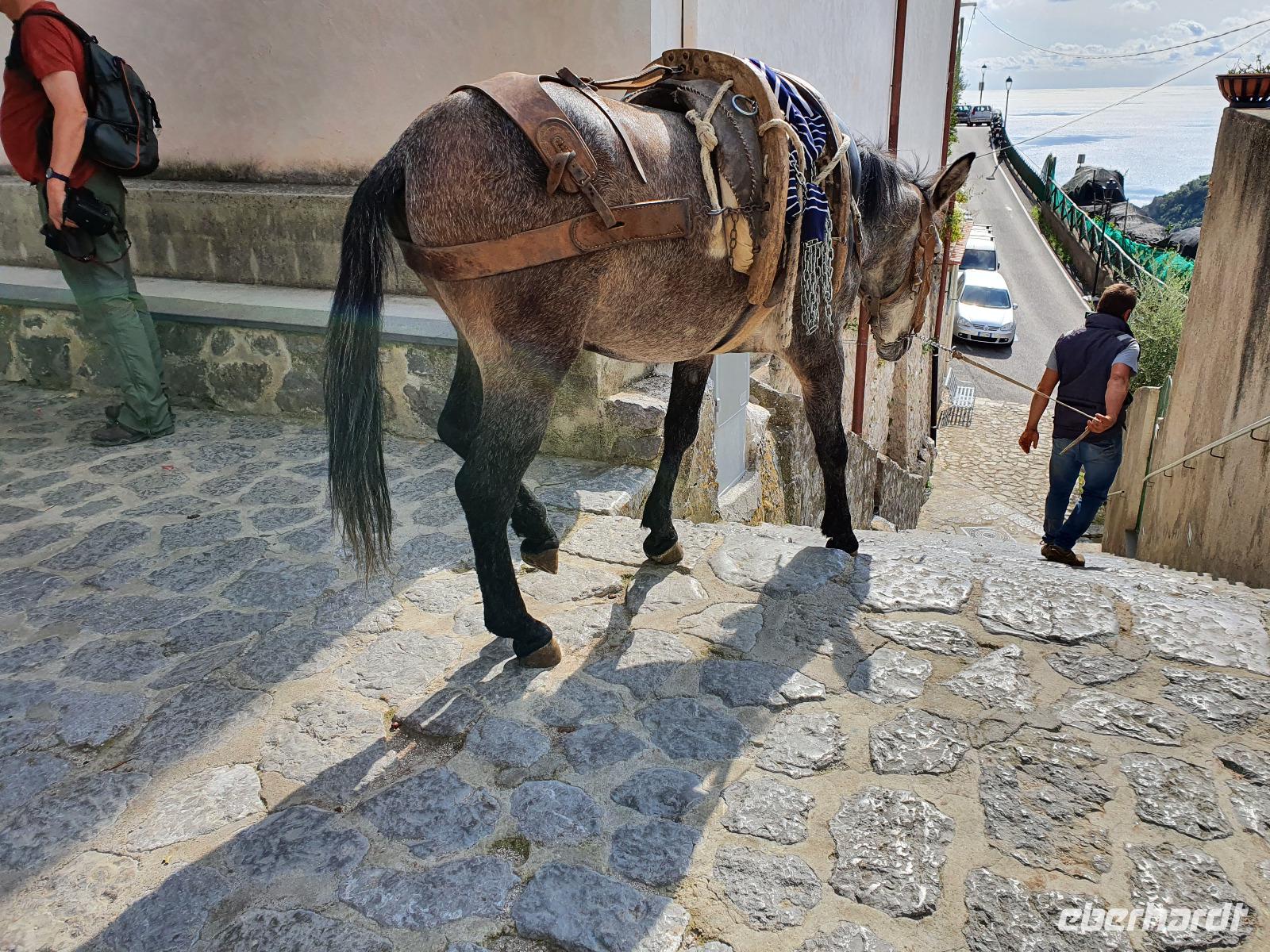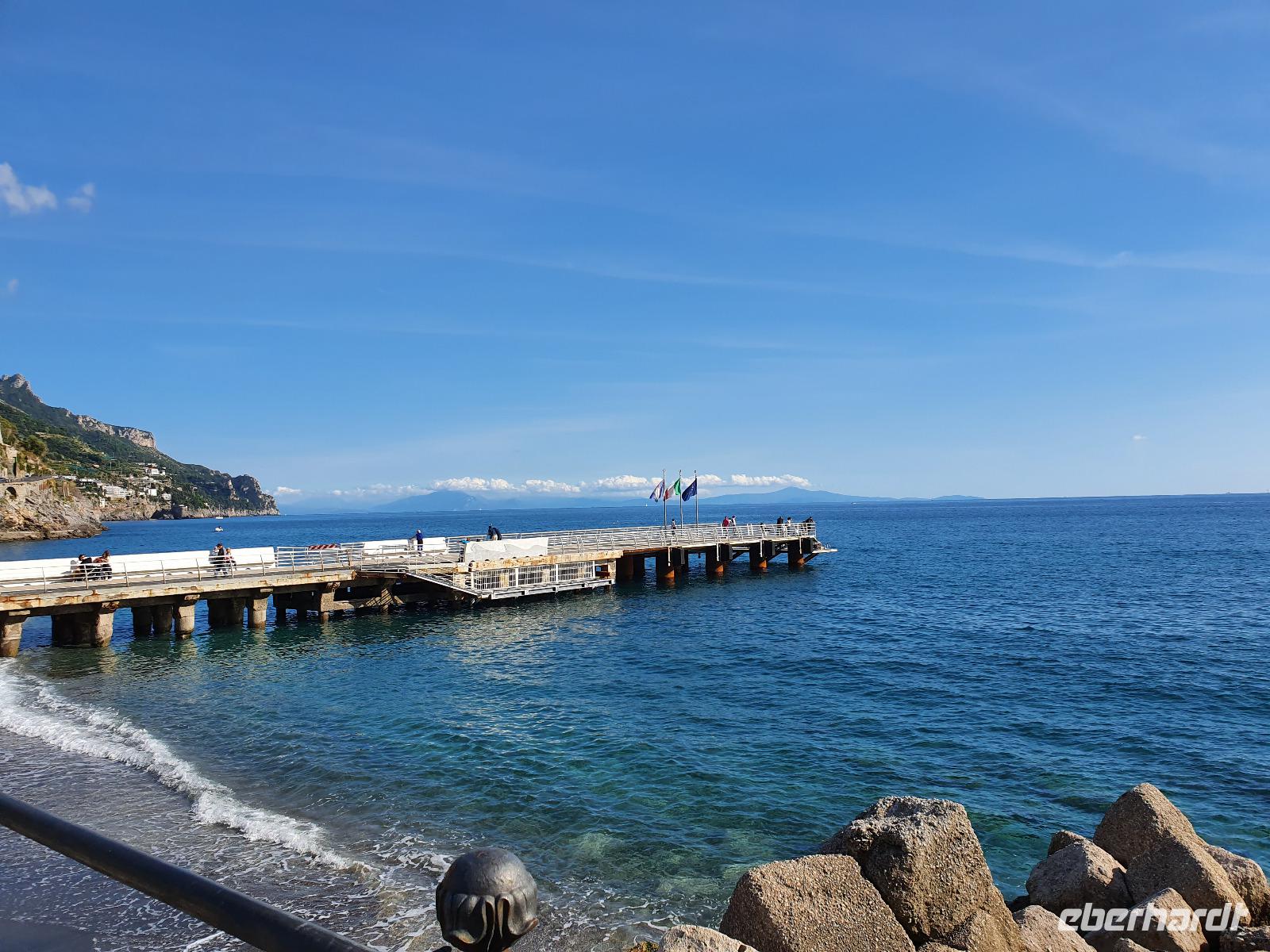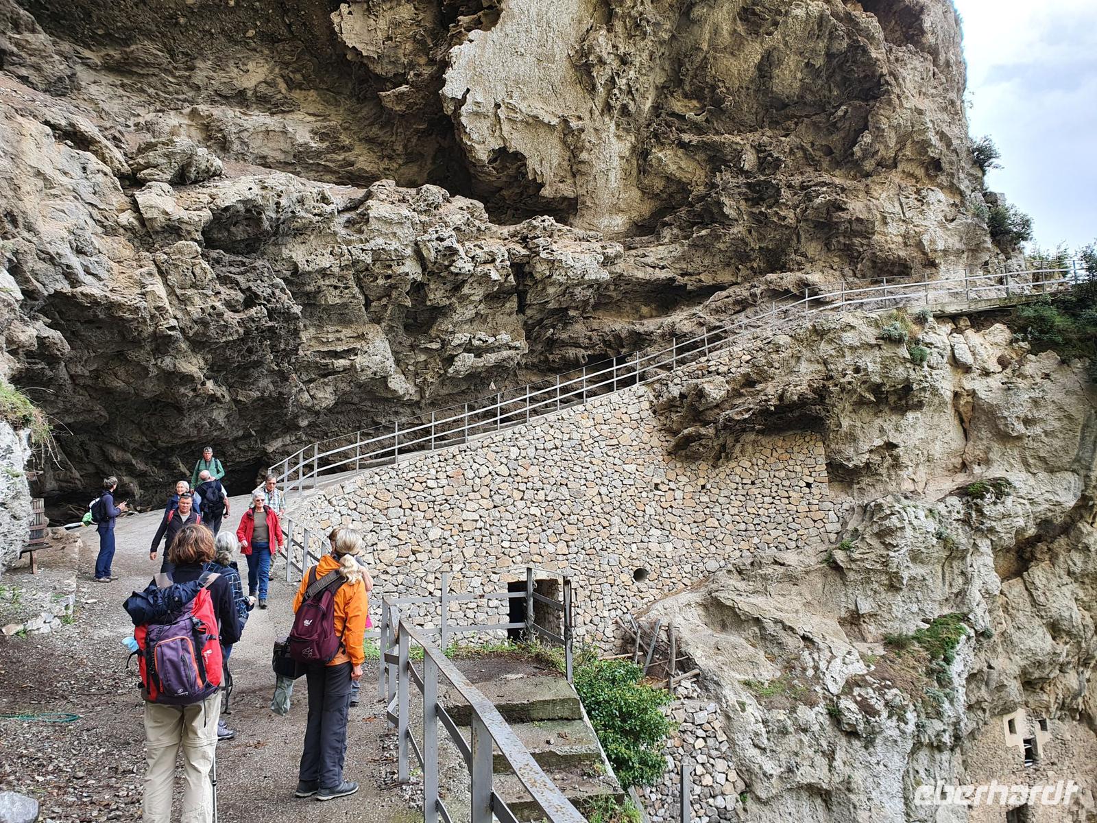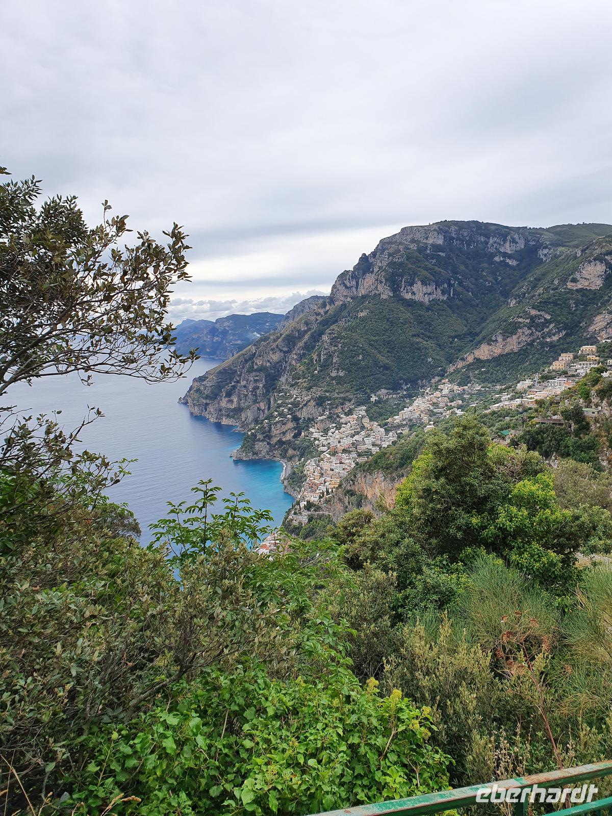 Gut gestärkt und erholt nehmen wir die letzte Etappe unserer Wanderung in Angriff. Gemeinsam laufen wir durch Nocelle zur Bushaltestelle und dort nehmen 5 Gäste den Bus hinunter nach Positano. Vor den Wanderern liegen nun 1300 Treppenstufen und 440 Höhenmeter hinunter. Zunächst wandern wir auf der Strasse bis nach Monte Perduso, benannt nach dem Felsen mit dem Loch und den sehen wir auch gut. Bei der Kirche beginnen dann die Treppen und die verfolgen uns bis Positano hinunter ans Meer. Unten treffen wir die "Busfahrer" und 2 Gäste, die sich heute eine Auszeit nahmen und mit dem Linienbus von Minori nach Positano reisten. Gemeinsam fahren wir mit dem Linienboot entlang der Küste über Amalfi zurück nach Minori.