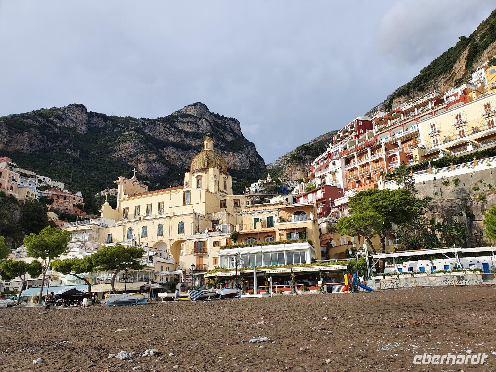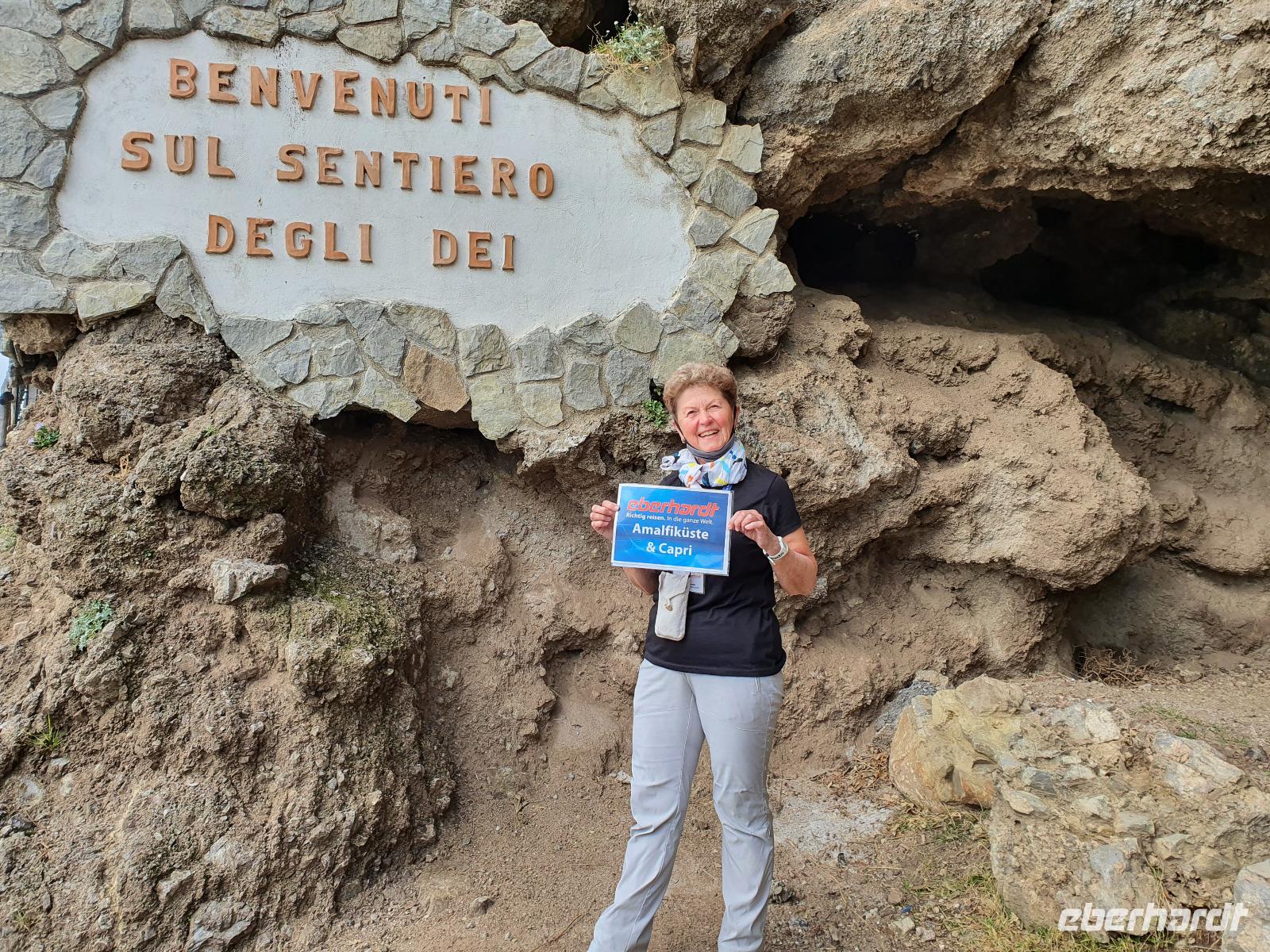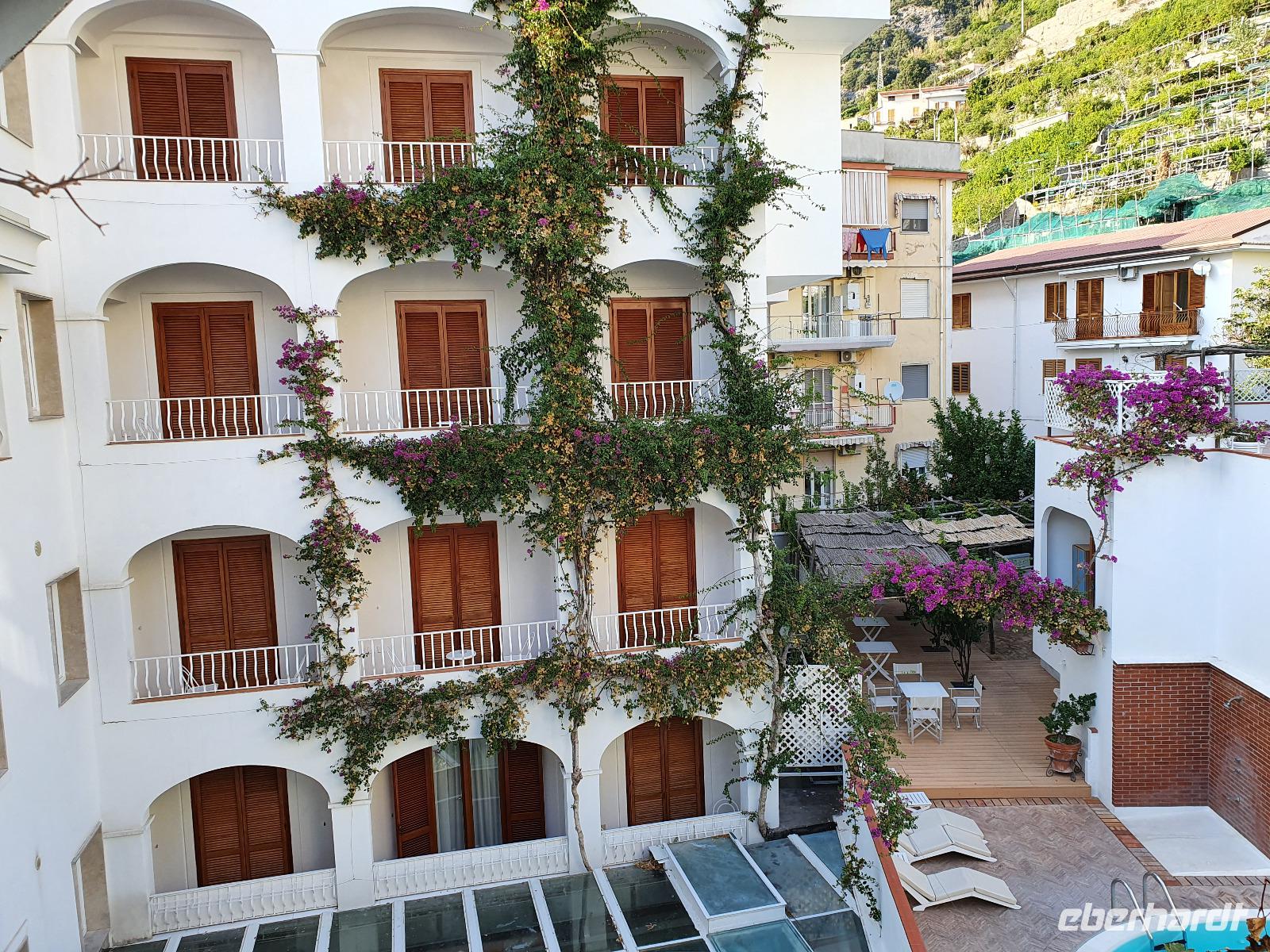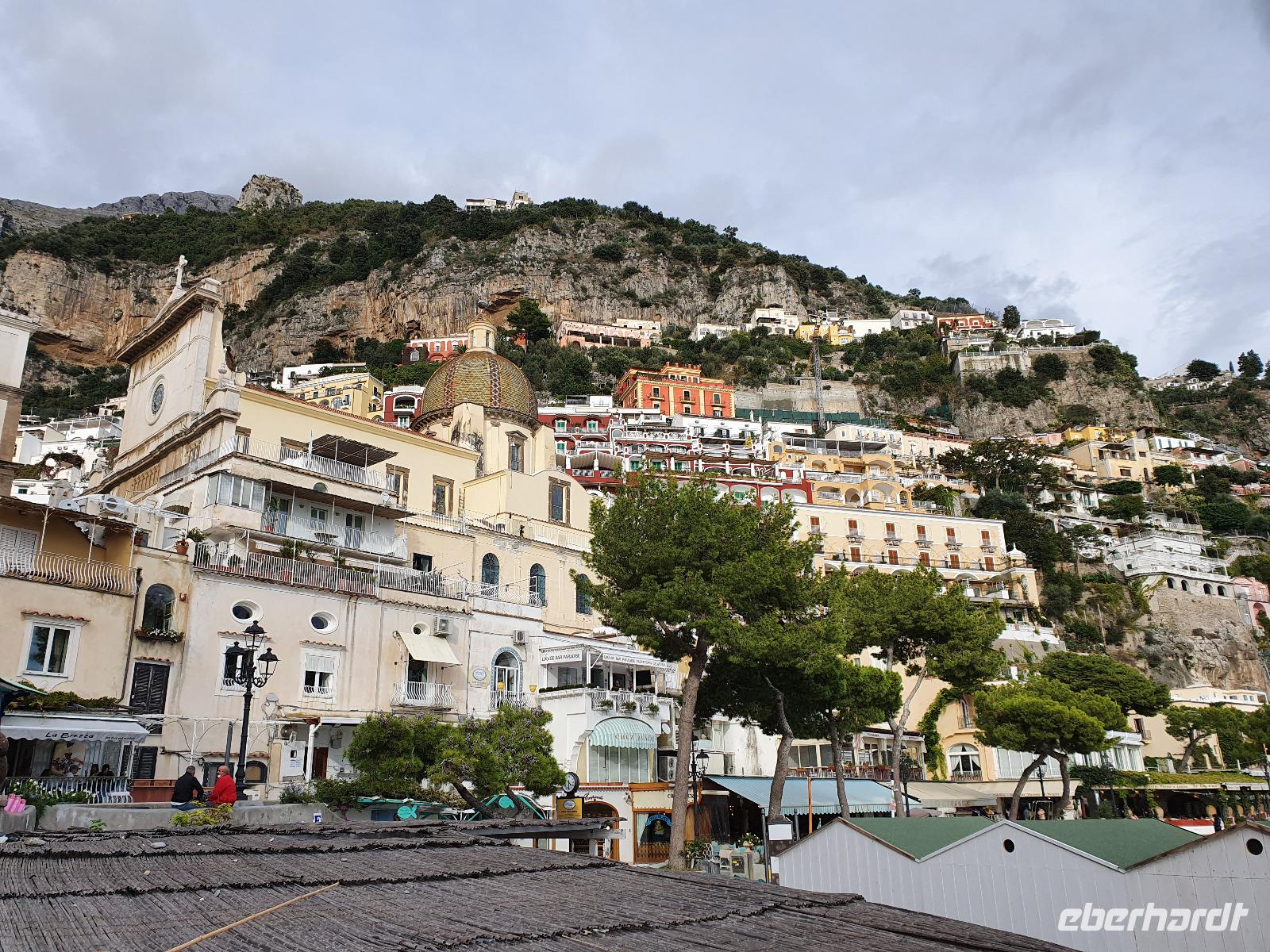 Gut gestärkt und erholt nehmen wir die letzte Etappe unserer Wanderung in Angriff. Gemeinsam laufen wir durch Nocelle zur Bushaltestelle und dort nehmen 5 Gäste den Bus hinunter nach Positano. Vor den Wanderern liegen nun 1300 Treppenstufen und 440 Höhenmeter hinunter. Zunächst wandern wir auf der Strasse bis nach Monte Perduso, benannt nach dem Felsen mit dem Loch und den sehen wir auch gut. Bei der Kirche beginnen dann die Treppen und die verfolgen uns bis Positano hinunter ans Meer. Unten treffen wir die "Busfahrer" und 2 Gäste, die sich heute eine Auszeit nahmen und mit dem Linienbus von Minori nach Positano reisten. Gemeinsam fahren wir mit dem Linienboot entlang der Küste über Amalfi zurück nach Minori.