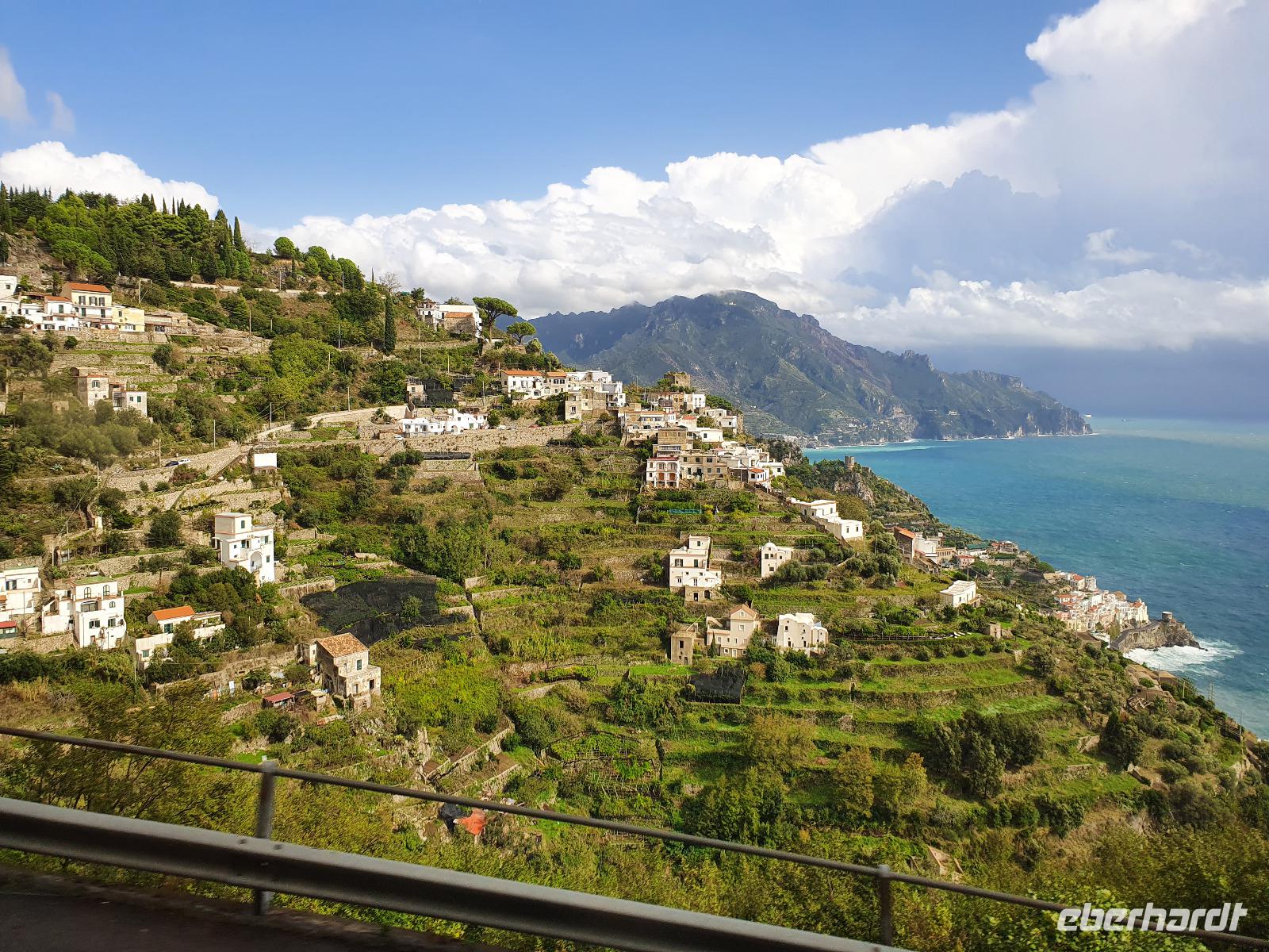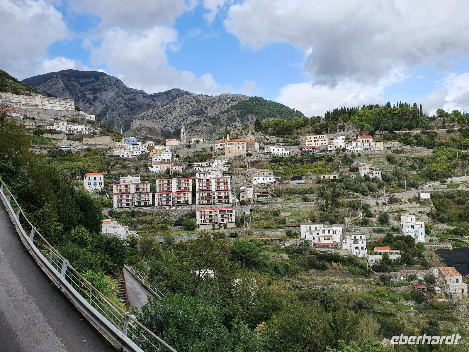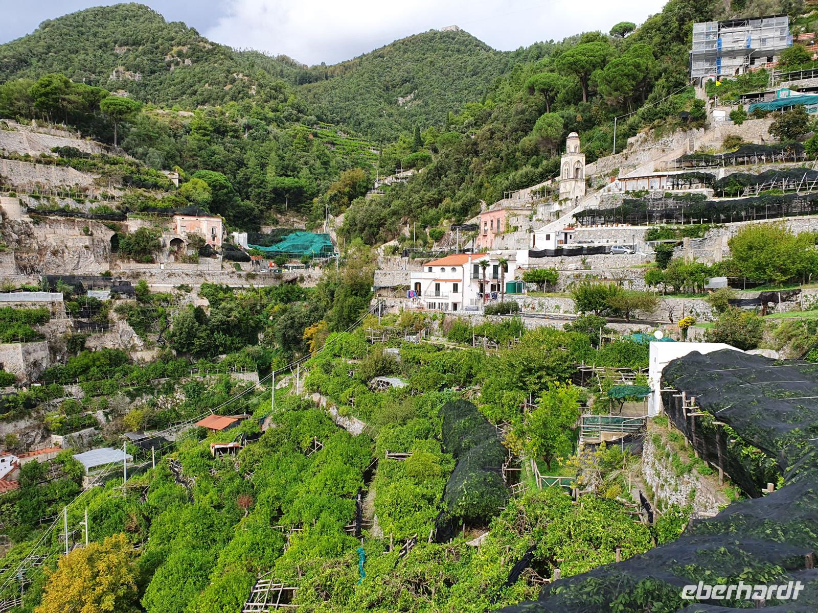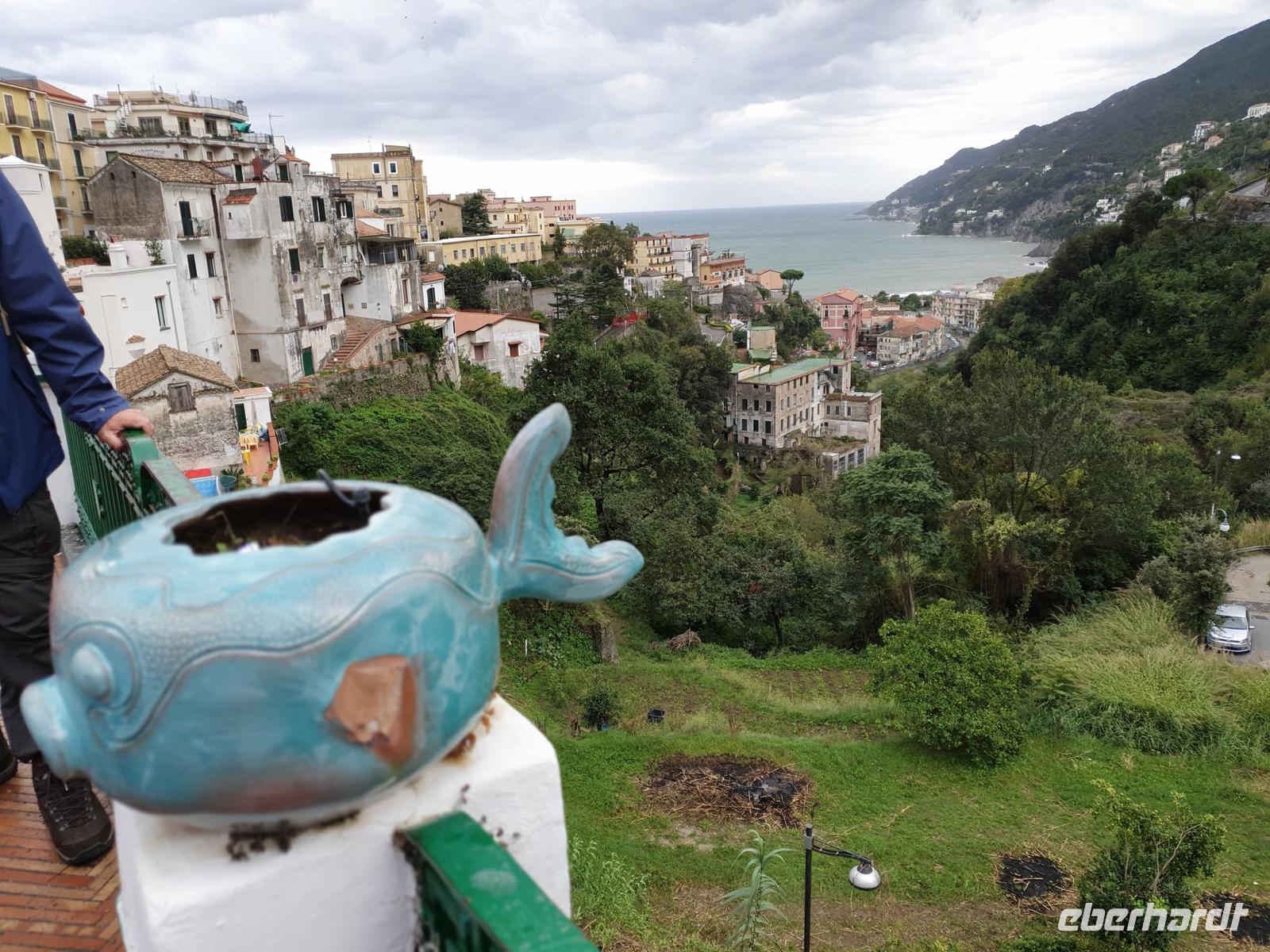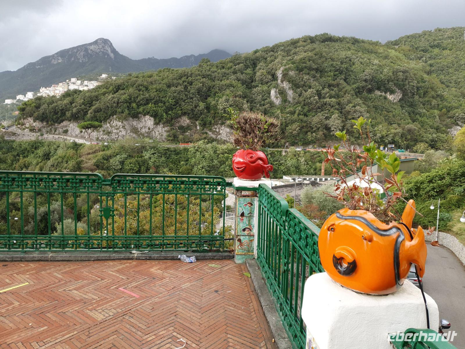 Wir dürfen ausschlafen, später frühstücken und starten erst 9.30 Uhr mit dem Bus entlang der Amalfitana Richtung Osten. Das Städtchen Vietri sul mare zwischen der Amalfiküste und Salerno gelegen ist bekannt für seine Keramikerzeugnisse. Es gibt viele verschiedene Künstler, die die Erzeugnisse bemalen und gestalten. DIE Gelegenheit, etwas für die Lieben zu Hause zu kaufen. In Vietri sul mare verlassen wir am zentralen Platz den Bus und gehen gemeinsam durch die Gassen bis zur Keramikfabrik Solemene. Das Gebäude im Gaudi Stil ist vor allem von aussen sehenswert. Eine Innenbesichtigung ist wegen Corona leider nicht möglich. Dann trennen sich unsere Wege, einige wandern mit hinunter zur Marina und die anderen wollen mehr Freizeit. 12 Uhr treffen wir uns wieder und fahren zurück auf der Amalfitana bis hinter Amalfi und dort hinauf nach Pogerola.