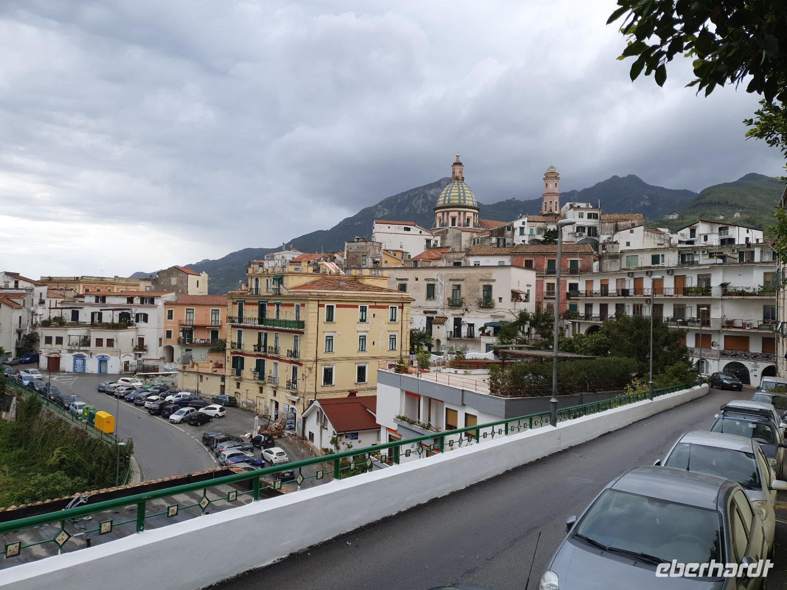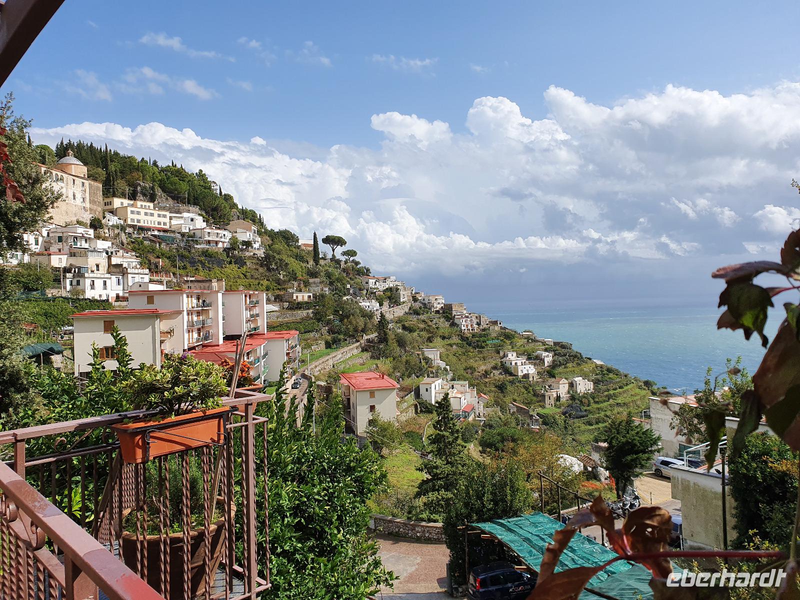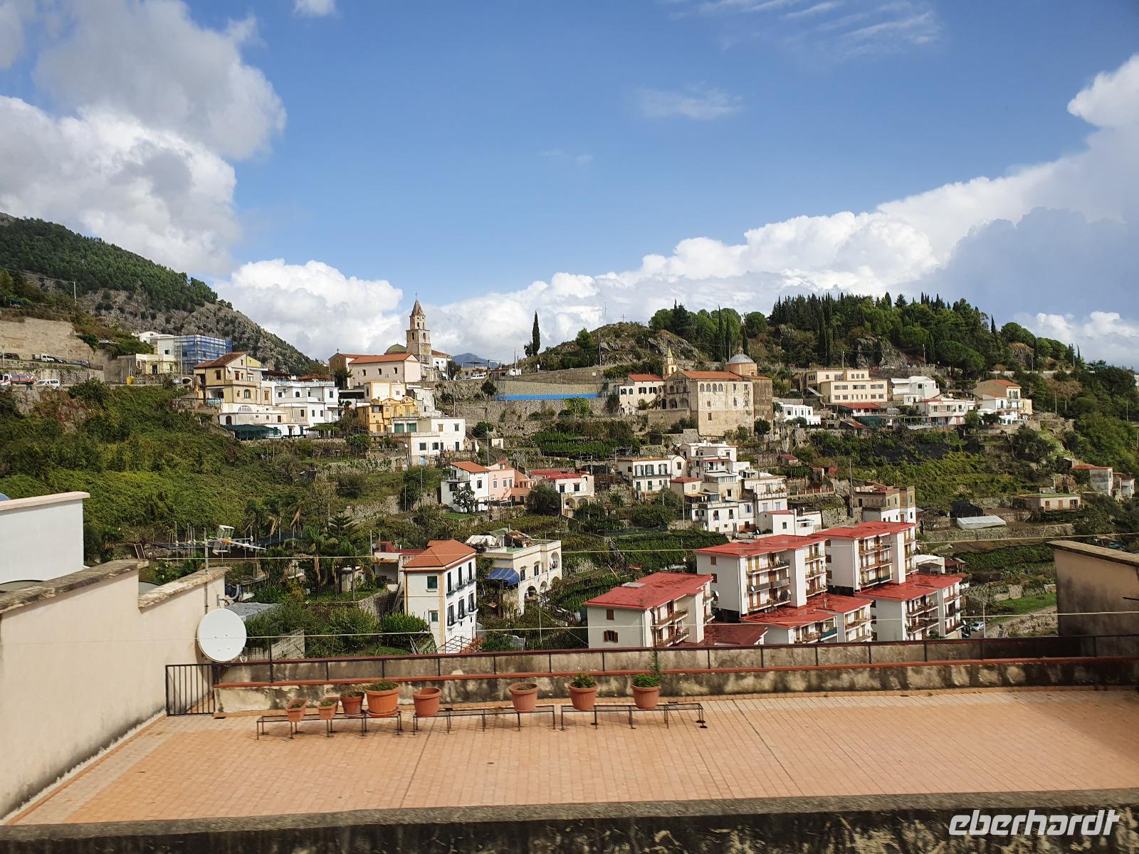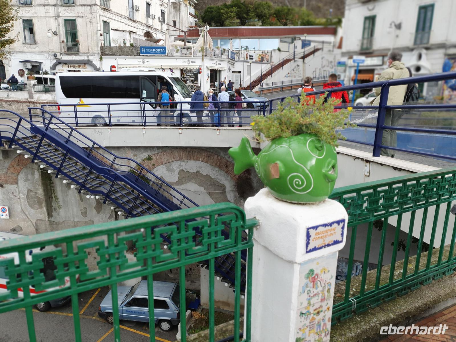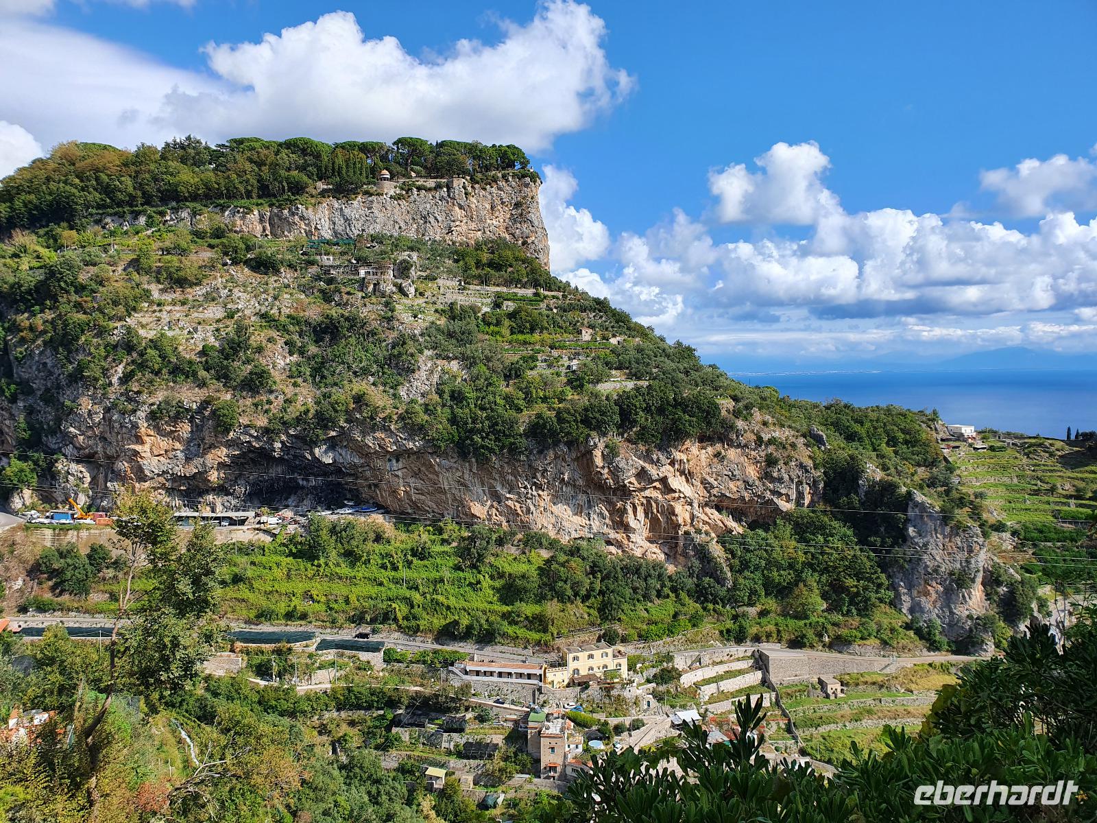 Wir dürfen ausschlafen, später frühstücken und starten erst 9.30 Uhr mit dem Bus entlang der Amalfitana Richtung Osten. Das Städtchen Vietri sul mare zwischen der Amalfiküste und Salerno gelegen ist bekannt für seine Keramikerzeugnisse. Es gibt viele verschiedene Künstler, die die Erzeugnisse bemalen und gestalten. DIE Gelegenheit, etwas für die Lieben zu Hause zu kaufen. In Vietri sul mare verlassen wir am zentralen Platz den Bus und gehen gemeinsam durch die Gassen bis zur Keramikfabrik Solemene. Das Gebäude im Gaudi Stil ist vor allem von aussen sehenswert. Eine Innenbesichtigung ist wegen Corona leider nicht möglich. Dann trennen sich unsere Wege, einige wandern mit hinunter zur Marina und die anderen wollen mehr Freizeit. 12 Uhr treffen wir uns wieder und fahren zurück auf der Amalfitana bis hinter Amalfi und dort hinauf nach Pogerola.