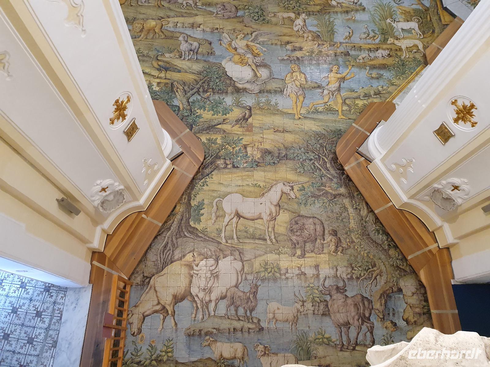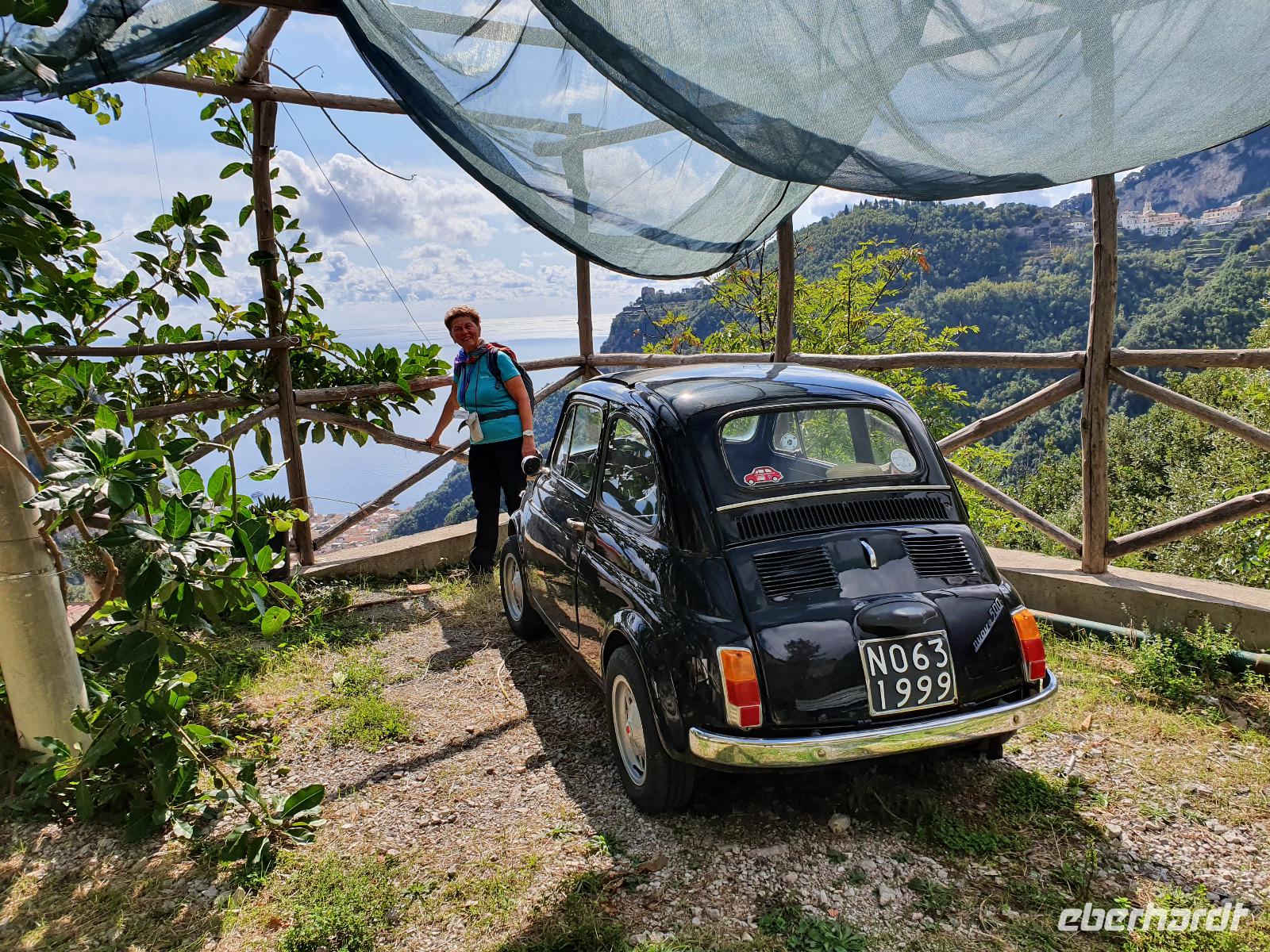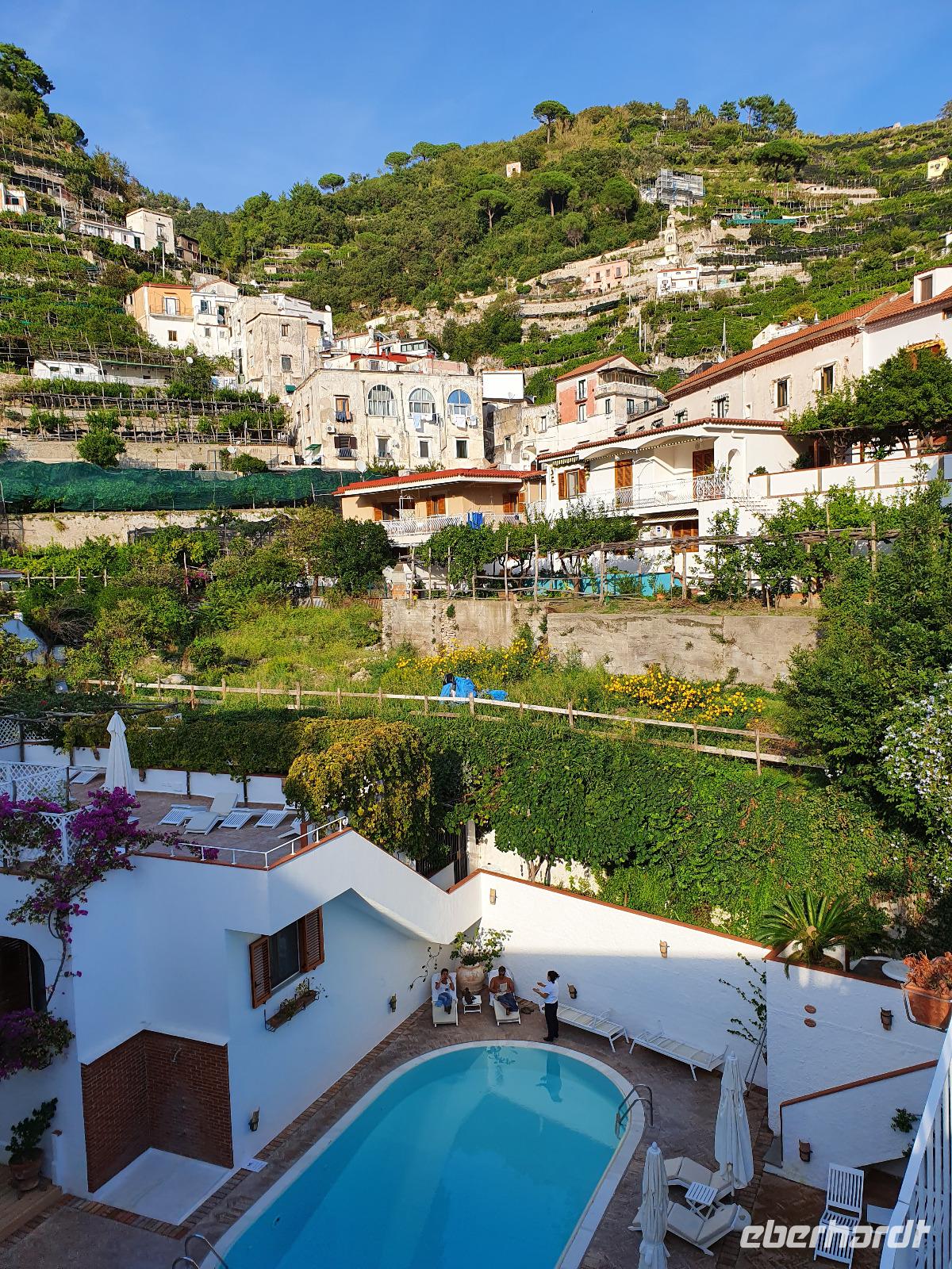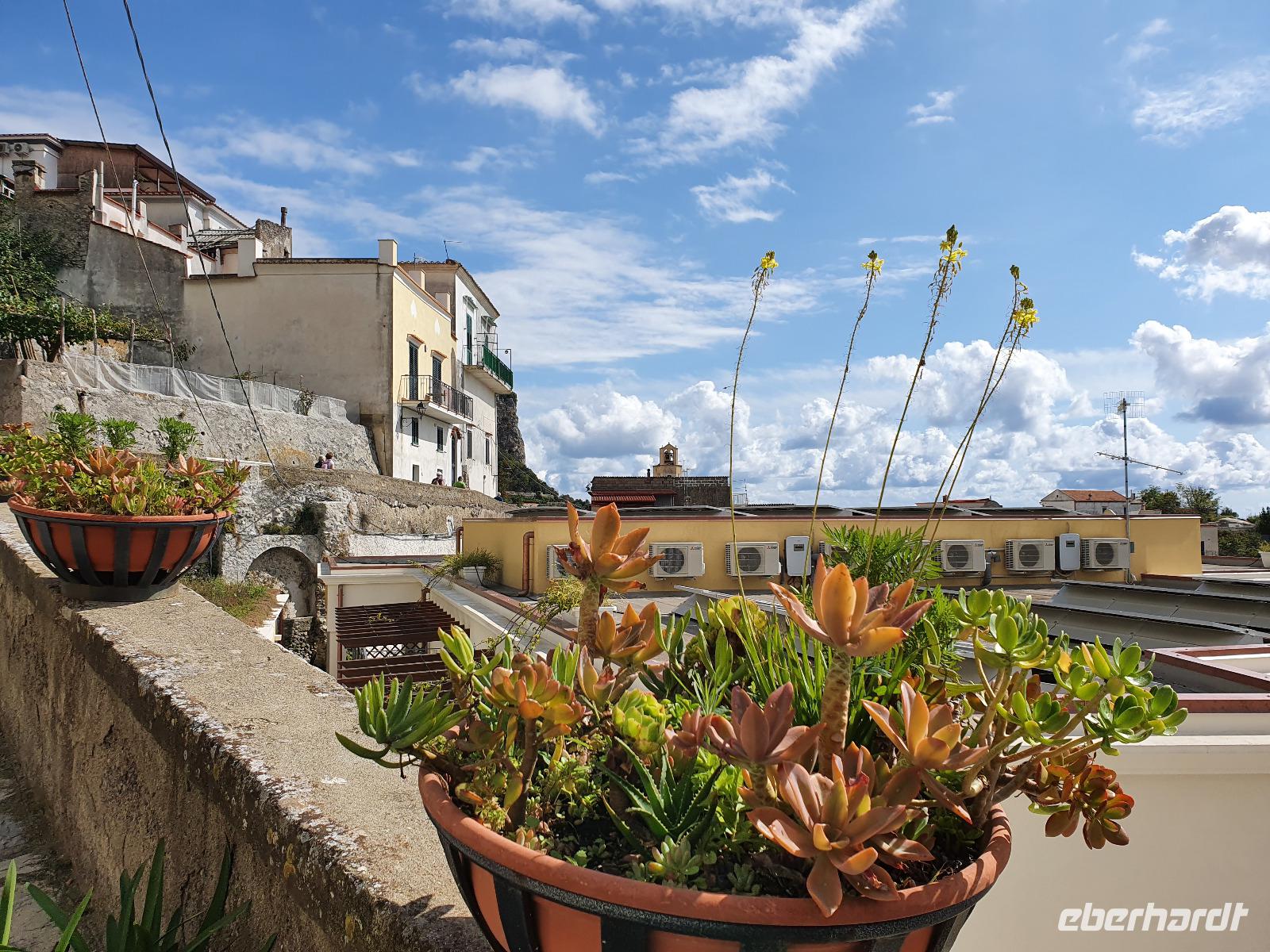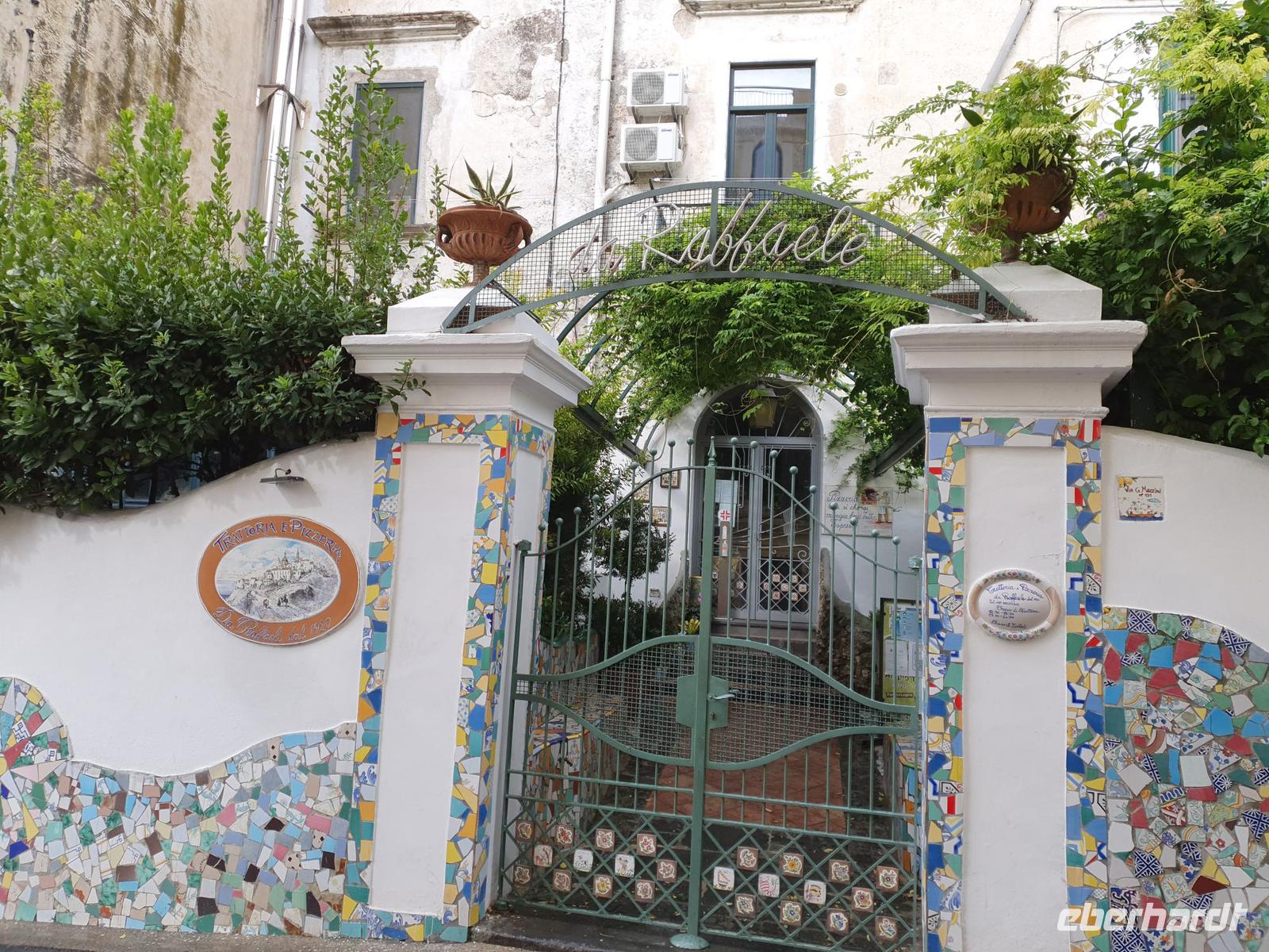 Wir dürfen ausschlafen, später frühstücken und starten erst 9.30 Uhr mit dem Bus entlang der Amalfitana Richtung Osten. Das Städtchen Vietri sul mare zwischen der Amalfiküste und Salerno gelegen ist bekannt für seine Keramikerzeugnisse. Es gibt viele verschiedene Künstler, die die Erzeugnisse bemalen und gestalten. DIE Gelegenheit, etwas für die Lieben zu Hause zu kaufen. In Vietri sul mare verlassen wir am zentralen Platz den Bus und gehen gemeinsam durch die Gassen bis zur Keramikfabrik Solemene. Das Gebäude im Gaudi Stil ist vor allem von aussen sehenswert. Eine Innenbesichtigung ist wegen Corona leider nicht möglich. Dann trennen sich unsere Wege, einige wandern mit hinunter zur Marina und die anderen wollen mehr Freizeit. 12 Uhr treffen wir uns wieder und fahren zurück auf der Amalfitana bis hinter Amalfi und dort hinauf nach Pogerola.