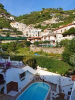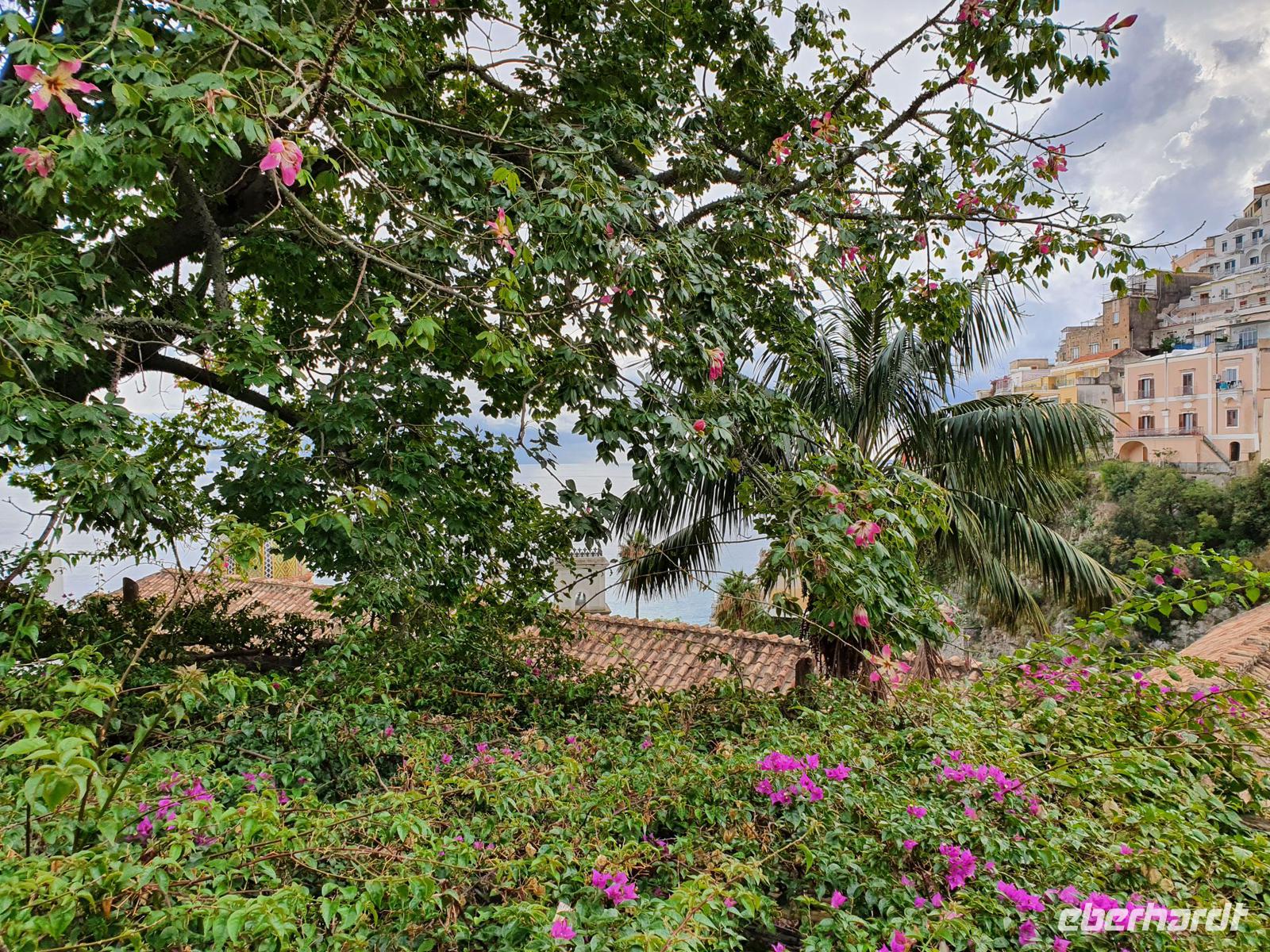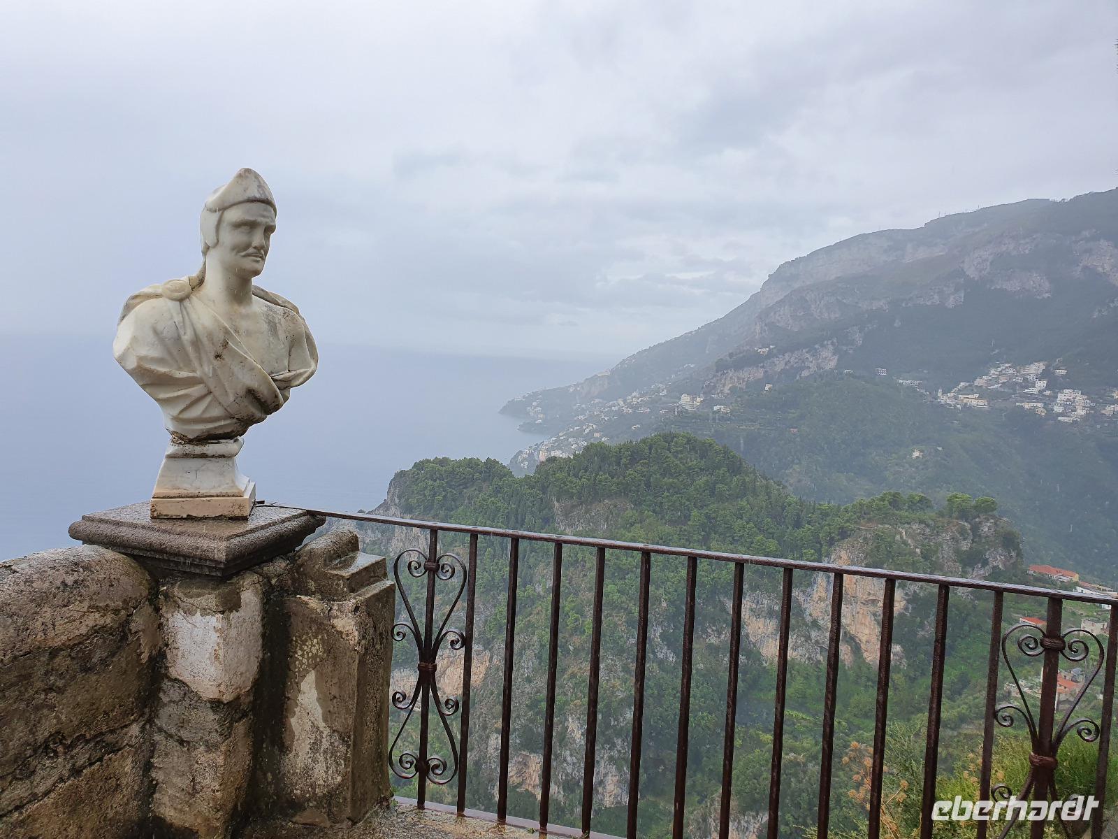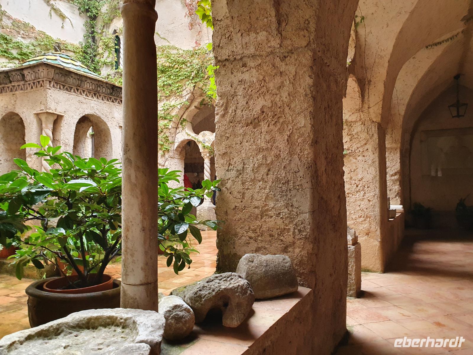 Die Villa Cimbrone war ursprünglich ein Palazzo aus dem 12.Jahrhundert, der nur gelegentlich bewohnt wurde und schliesslich verfiel. Anfang des 20.Jahrhundert erwarb der Schotte Beckett das Anwesen und baute es als ein Schlösschen wieder auf. 1904 liess er den wunderschönen Garten und die Terrasse der "Unendlichkeit" anlegen. Im Garten sind viele Skulpturen und Brunnen aufgestellt, die der griechischen und römischen Antike entstammen. Von der Terrasse kann man bis nach Capri schauen, wenn es nicht gerade regnet. Die Terrasse wurde auch gern für Filmaufnahmen genutzt, z.B. für den 3. Teil der Sissi-Verfilmung, der eigentlich auf Madeira spielt. Heute ist die Villa Cimbrone ein 5 Sterne Hotel und wird von einem Schweizer geführt. Man kann deshalb nur den Kreuzgang mit Brunnen und eine Halle im Untergeschoss besichtigen.