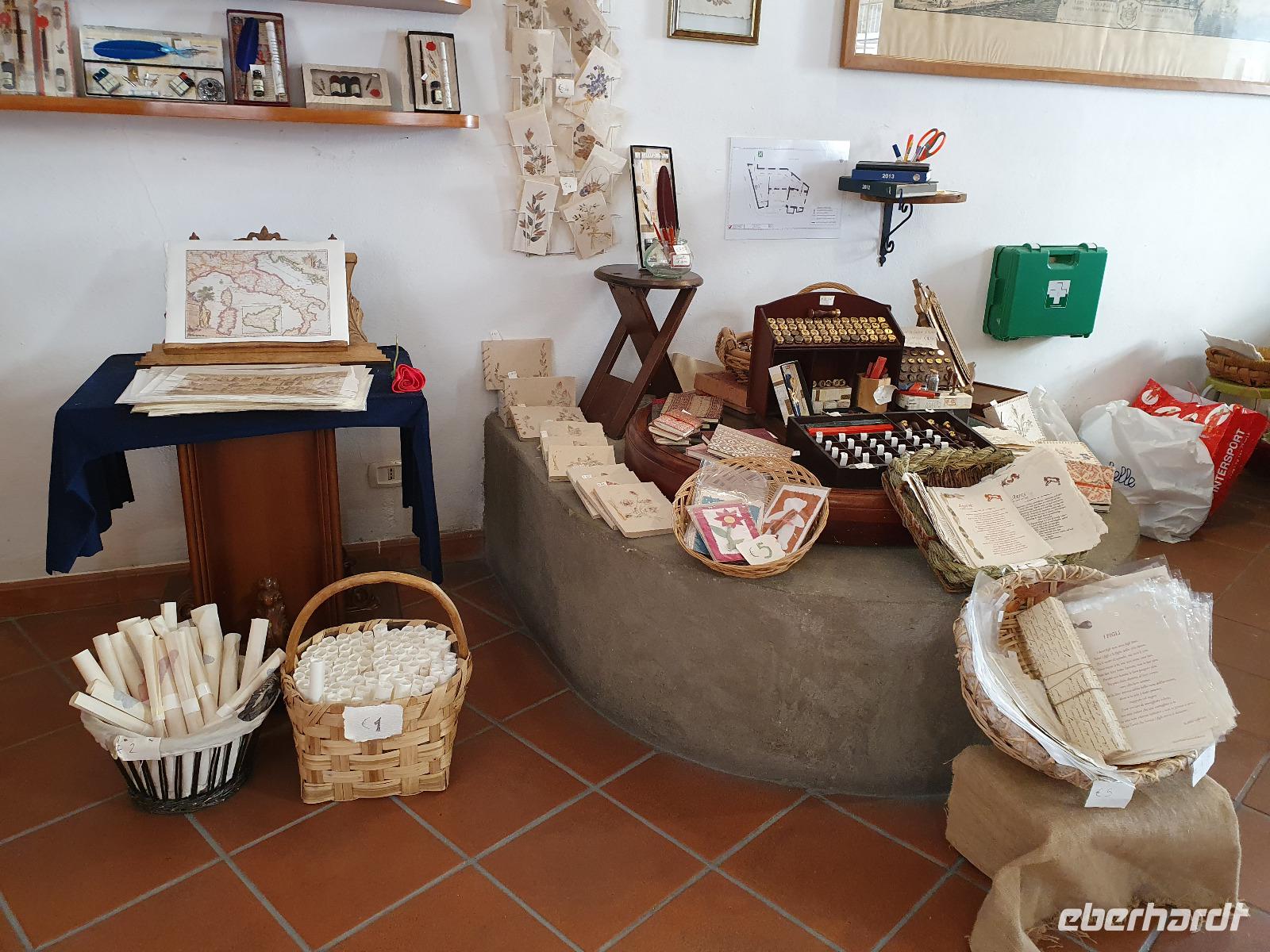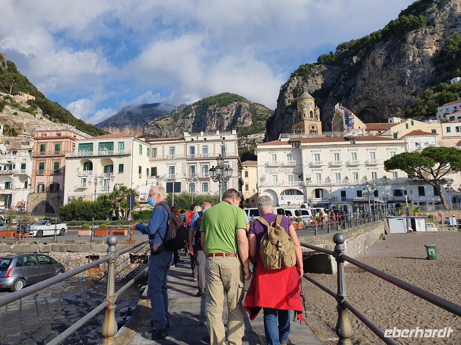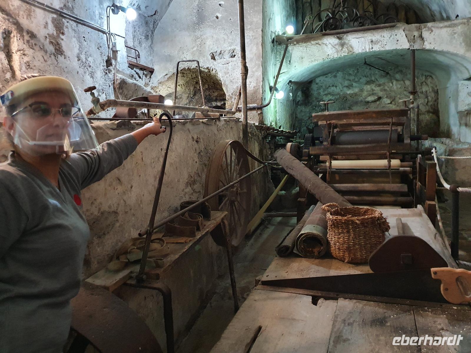 Unser Frühstück gibt es jeden morgen von einem grossen Buffet. Einzeln gehen wir mit einem Kellner rundherum und erhalten von ihm das ausgesuchte auf unseren Teller. Das braucht Zeit, ist aber eine sehr praktikable Lösung. Es sind sehr wenige Gäste im Hotel und so geht es recht flott. Gut gestärkt treffen wir dann Annamaria und gehen mit ihr zum Parkplatz am Hafen, wo unser Bus mit Fahrer Guiseppe uns schon erwartet. Wir fahren auf der Amalfitana das kurze Stück nach Amalfi und begeben uns auf die Mole am Hafen. Von da hat man den Übersichtsblick und Annamaria erklärt uns die Stadt. Danach spazieren wir durch das Zentrum von Amalfi hinaus ins Mühlental. Am Stadtrand ist in einer alten Papiermühle ein Museum eingerichtet worden und dort zeigt man uns die traditionelle Papierherstellung an Jahrhundert alten Maschinen. Erstaunlich, dass das alles noch funktioniert.