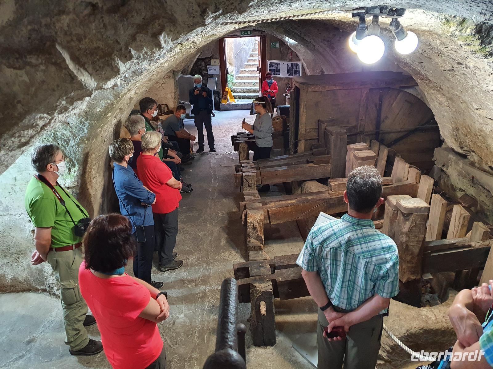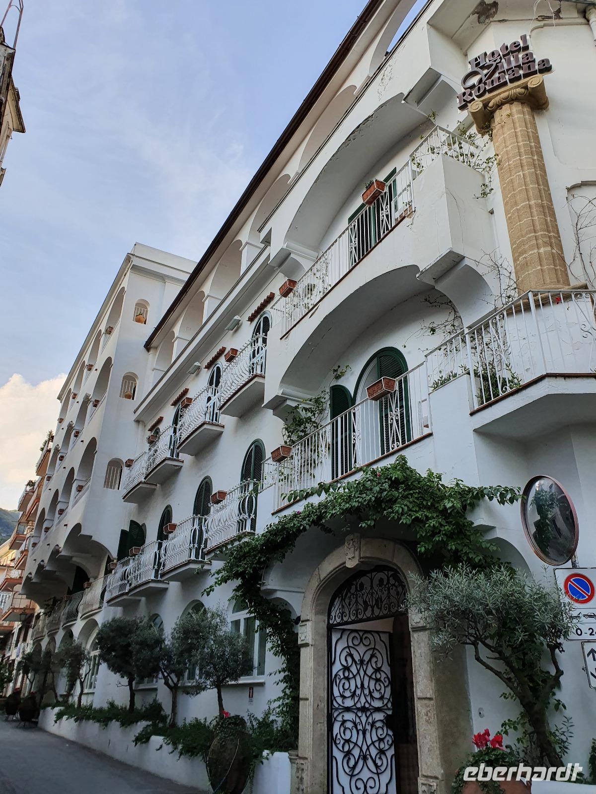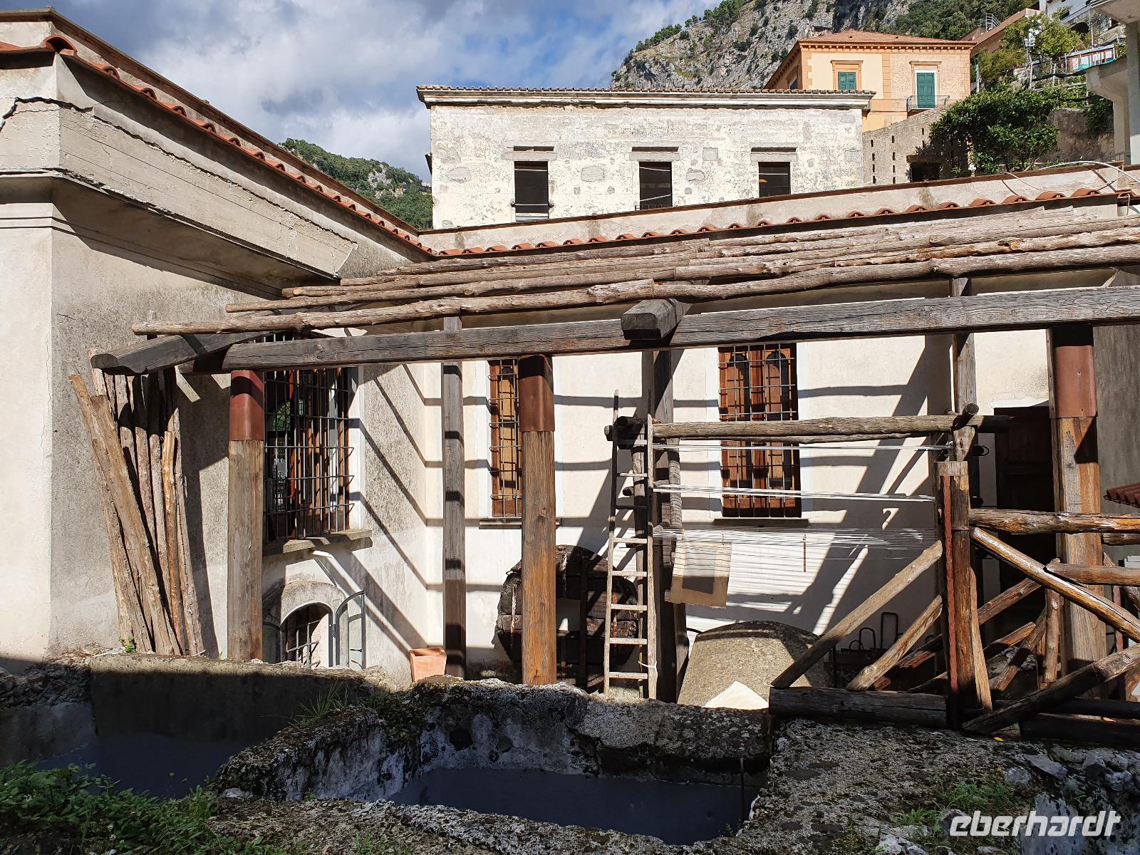 Unser Frühstück gibt es jeden morgen von einem grossen Buffet. Einzeln gehen wir mit einem Kellner rundherum und erhalten von ihm das ausgesuchte auf unseren Teller. Das braucht Zeit, ist aber eine sehr praktikable Lösung. Es sind sehr wenige Gäste im Hotel und so geht es recht flott. Gut gestärkt treffen wir dann Annamaria und gehen mit ihr zum Parkplatz am Hafen, wo unser Bus mit Fahrer Guiseppe uns schon erwartet. Wir fahren auf der Amalfitana das kurze Stück nach Amalfi und begeben uns auf die Mole am Hafen. Von da hat man den Übersichtsblick und Annamaria erklärt uns die Stadt. Danach spazieren wir durch das Zentrum von Amalfi hinaus ins Mühlental. Am Stadtrand ist in einer alten Papiermühle ein Museum eingerichtet worden und dort zeigt man uns die traditionelle Papierherstellung an Jahrhundert alten Maschinen. Erstaunlich, dass das alles noch funktioniert.