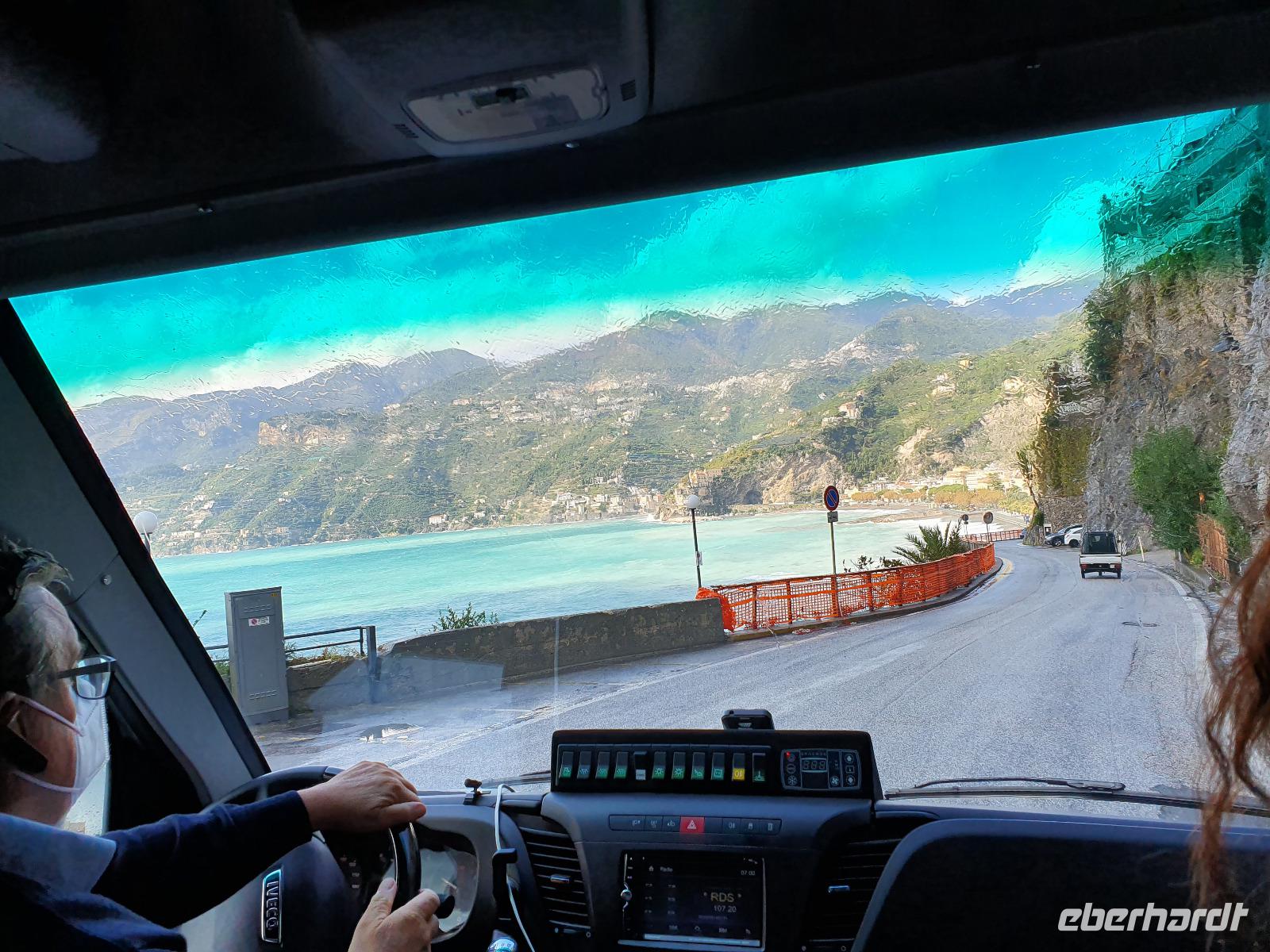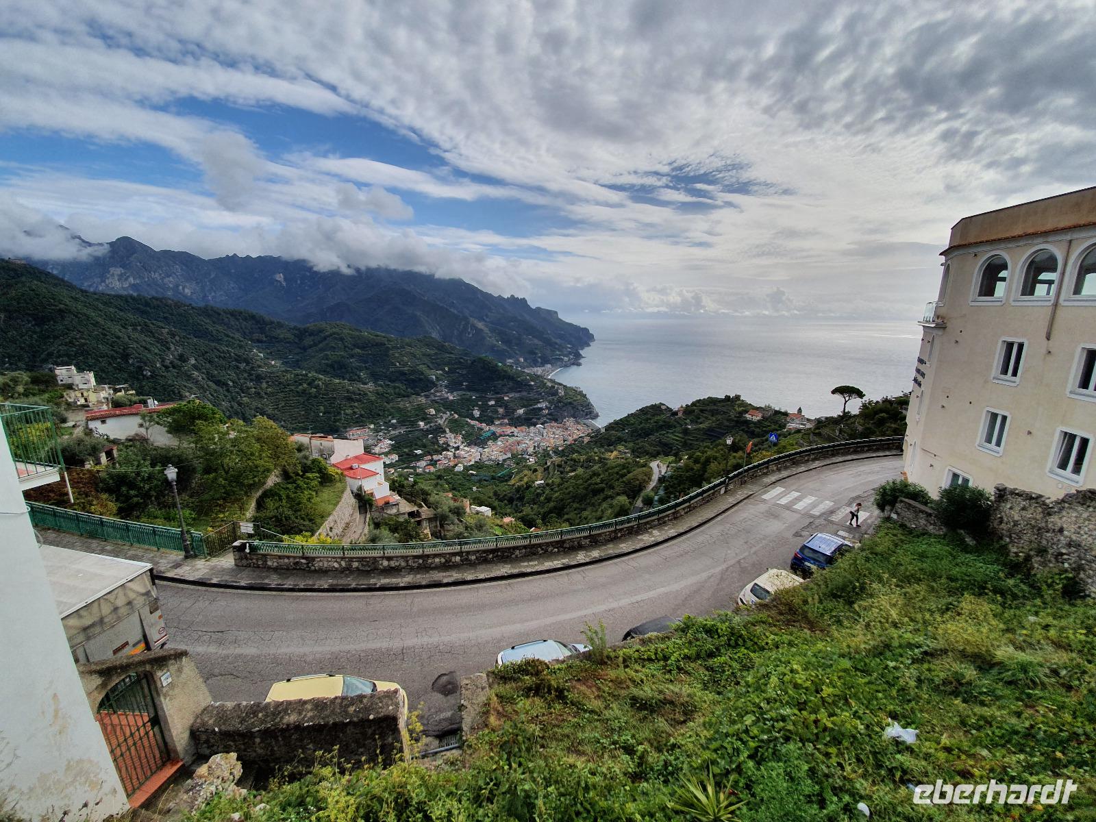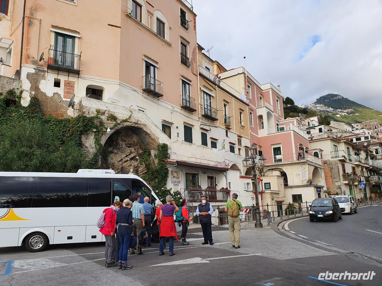 Heute geht es etwas früher los und wir starten mit Daniele wieder am Hafen von Minori. Wir fahren mit unserem Bus in vielen Serpentinen vom Meer hinauf nach Ravello auf 360 m Höhe.