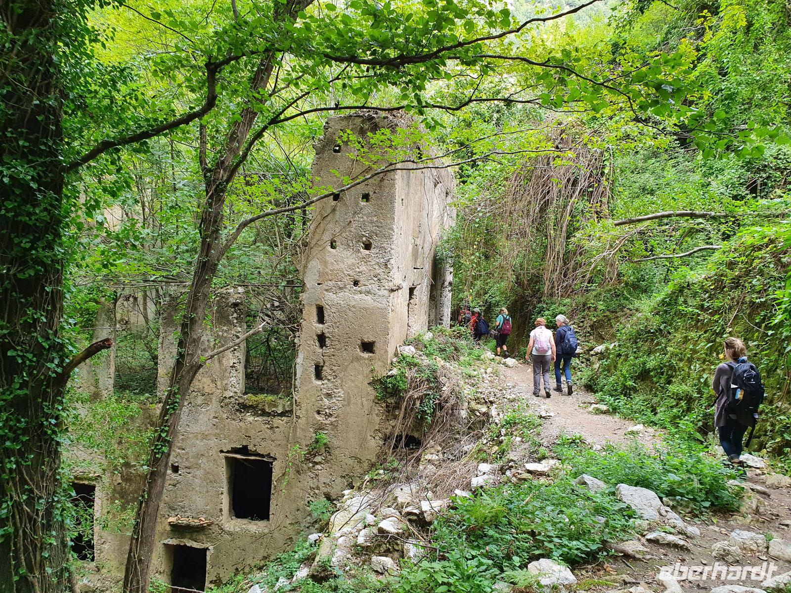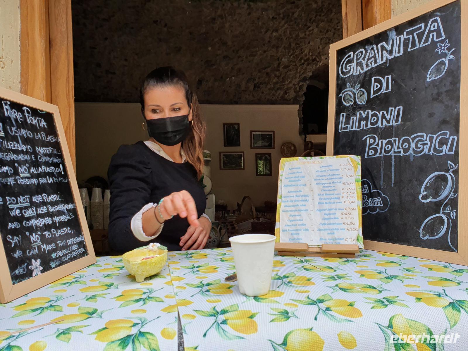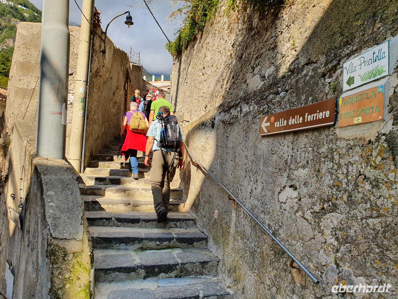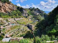 Bei herrlichem Sonnenschein steigen wir die ersten Treppen hinauf auf der via Ferrata. Es geht zwischen Zitronenhainen hindurch, Kakibäumen und Gemüsegärten säumen den Weg und an einem Haus dürfen wir frisch gepressten Zitronensaft pur oder als Granita mit zerstossenem Eis probieren. Köstlich beides und dann bekommen wir noch frische Kaki zum probieren. Der weitere Weg führt an alten verlassenen Eisenwerken vorbei, über viele Treppen und teilweise steile Wege bis das Örtchen Pontone auf dem Hügel zu sehen ist. In Pontone bei der Blue Bar bekommen wir auf dem Dorfplatz im Freien unser Mittagessen. Serviert werden alte traditionelle Speisen aus Brot, Tomate, Mozzarella, Blumenkohl, Auberginen und vieles mehr. Es ist reichlich und so schaffen wir nicht alles. Danach folgt der steile Abstieg über unzählige Stufen hinunter nach Atrani am Meer. Unterwegs spendiere ich einen Limoncello. Von Atrani laufen wir nach Amalfi und haben nochmals Freizeit.