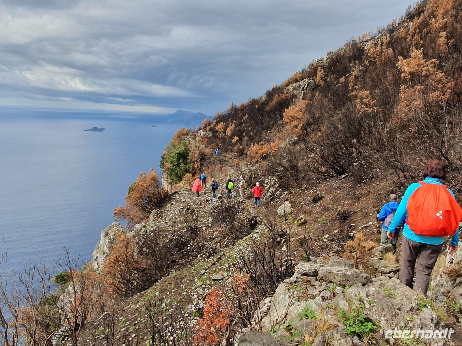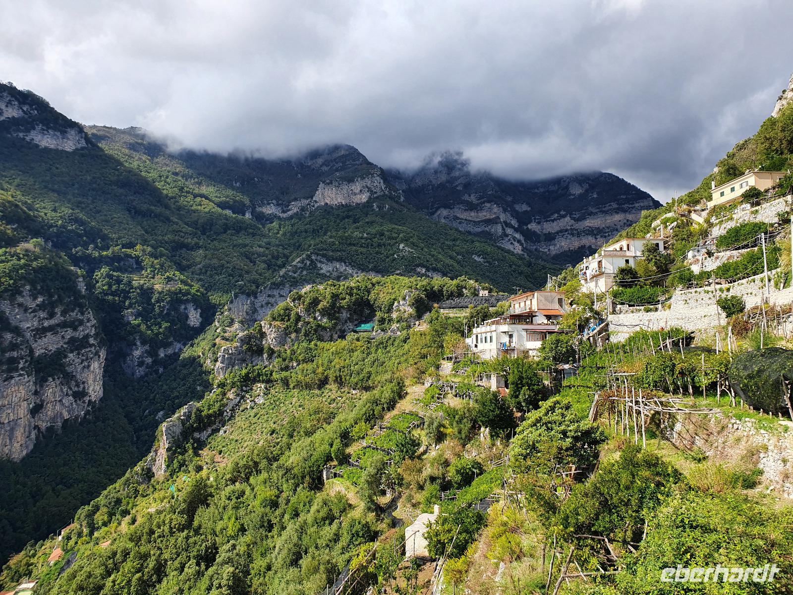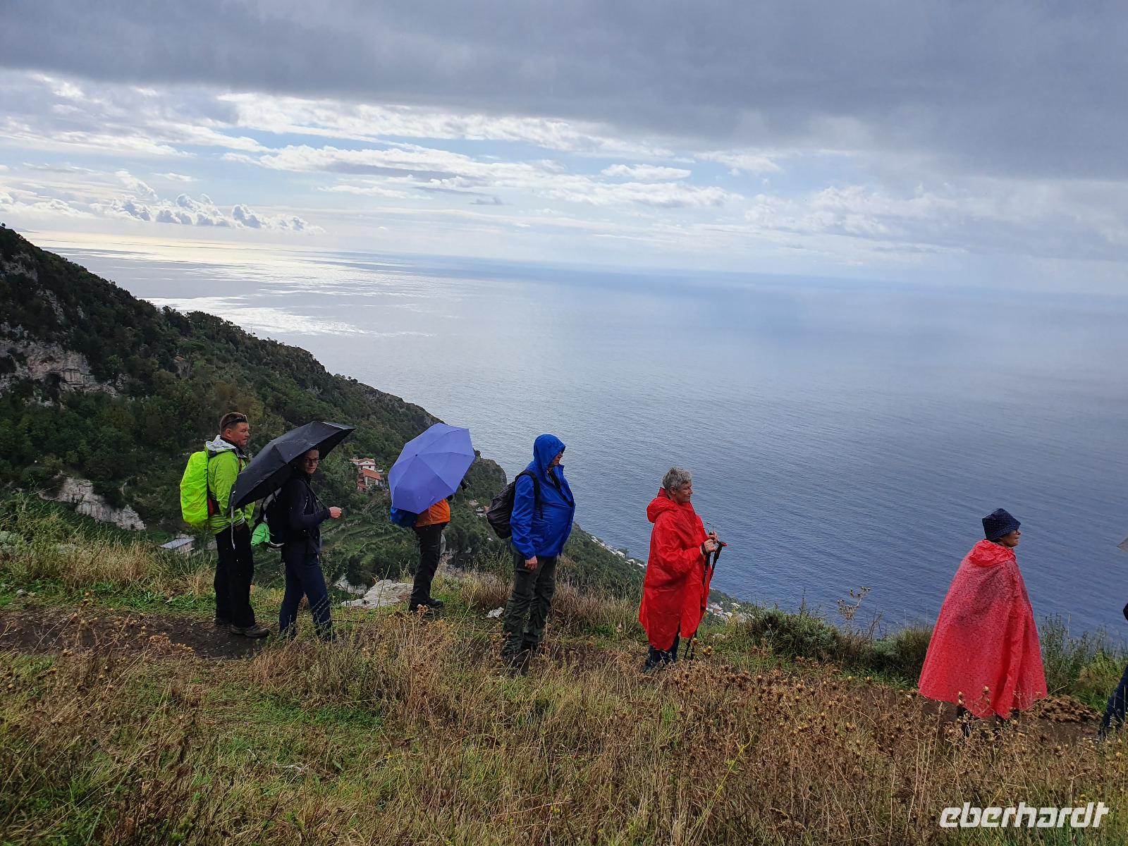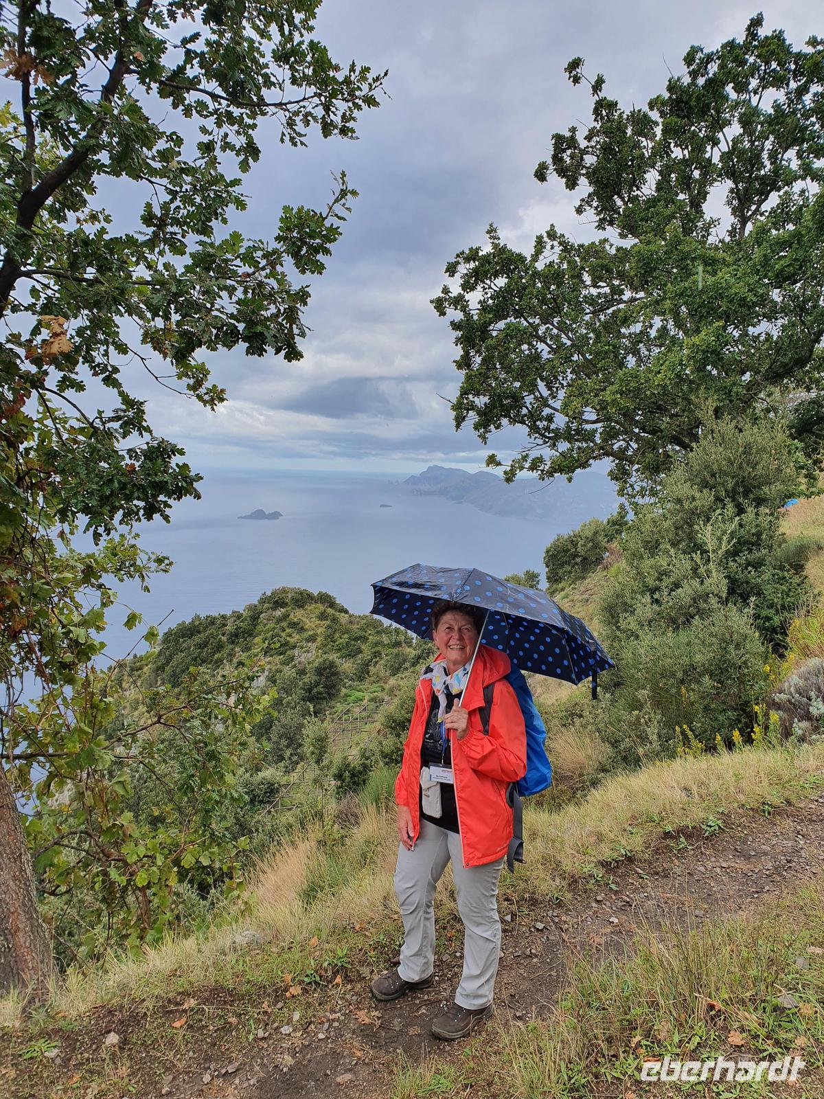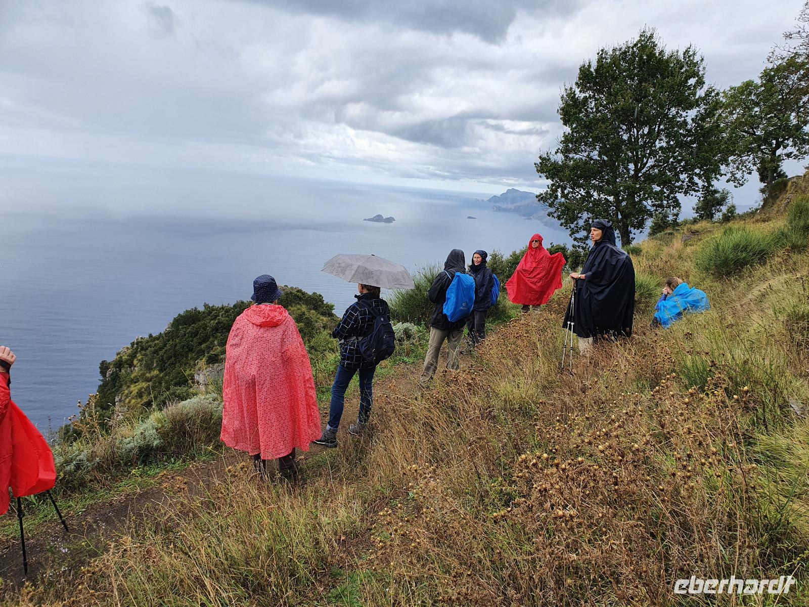 Mit unserem Bus fahren wir zunächst die Amalfitana bis hinter Amalfi und dann in der Furore Schlucht hinauf in den gleichnamigen Ort, wo zahlreiche Malereien die Häuserwände zieren. Immer weiter bergan erreichen wir schliesslich Bomerano auf 630 m Höhe und steigen am Dorfplatz aus. Es bleibt noch Zeit für einen Kaffee und eine WC Pause und dann begeben wir uns auf den wohl berühmtesten Wanderweg an der Amalfiküste - den Götterweg. Die Regensachen halten wir immer bereit, denn es gibt ab und zu einen Schauer. Das Wolkenspiel macht es noch interessanter und wenn die Sonne durch die Wolken schaut, ist es wie Weihnachten - ein Geschenk. Wir geniessen die Ausblicke ausgiebig. Ende August hatte es am Götterweg gebrannt und so müssen wir den oberen, aussichtsreicheren und etwas längeren Weg nehmen. Es sind viele verkohlte Bäume zu sehen und das abgebrannte Gras treibt schon wieder frisch aus. Der Weg geht ständig auf und ab und das teilweise auch recht steil. Nach 3 Stunden erreichen wir das Dorf Nocelle und wir kehren im Chiosco ein zu einem Mittagsimbiss.
