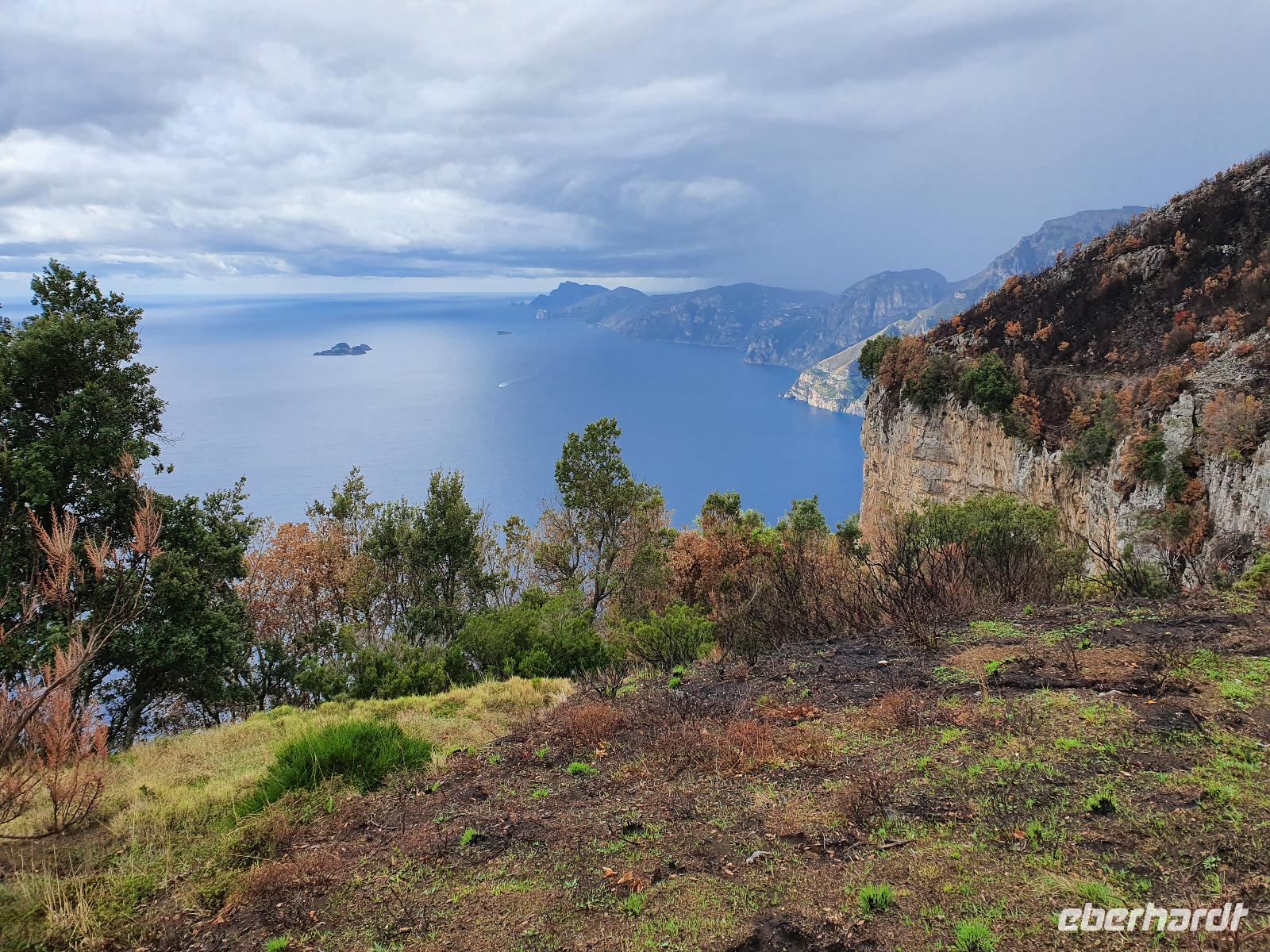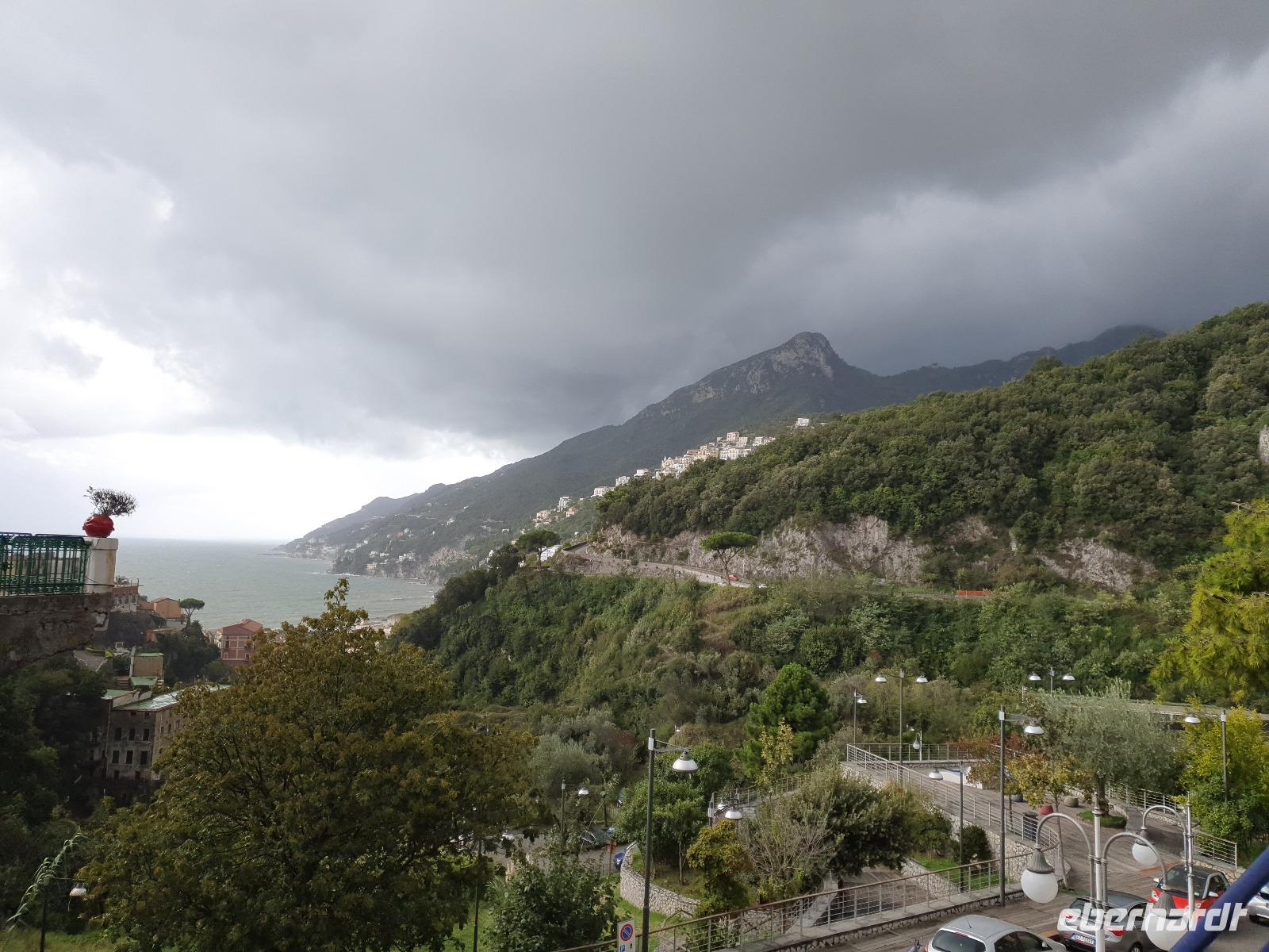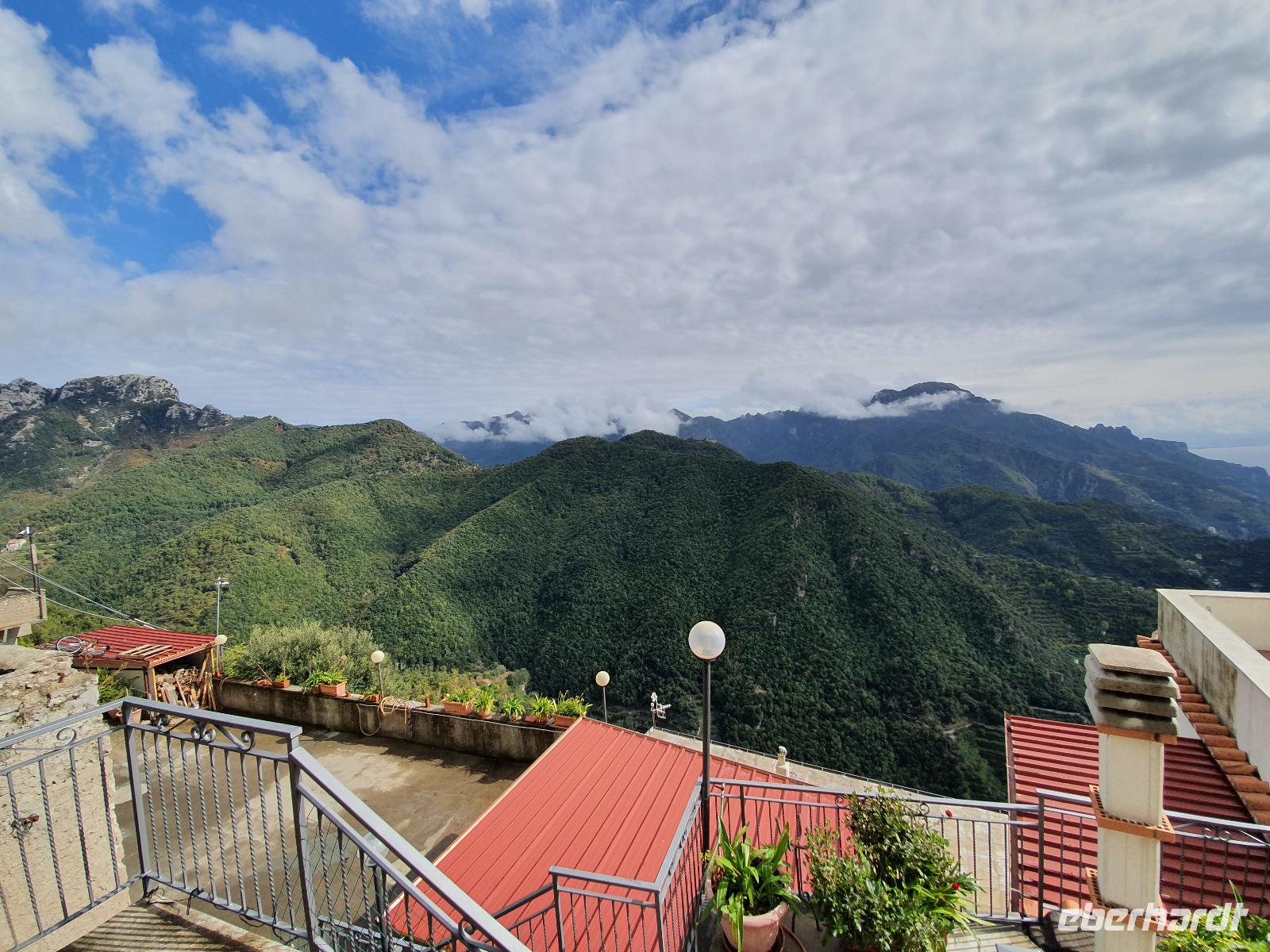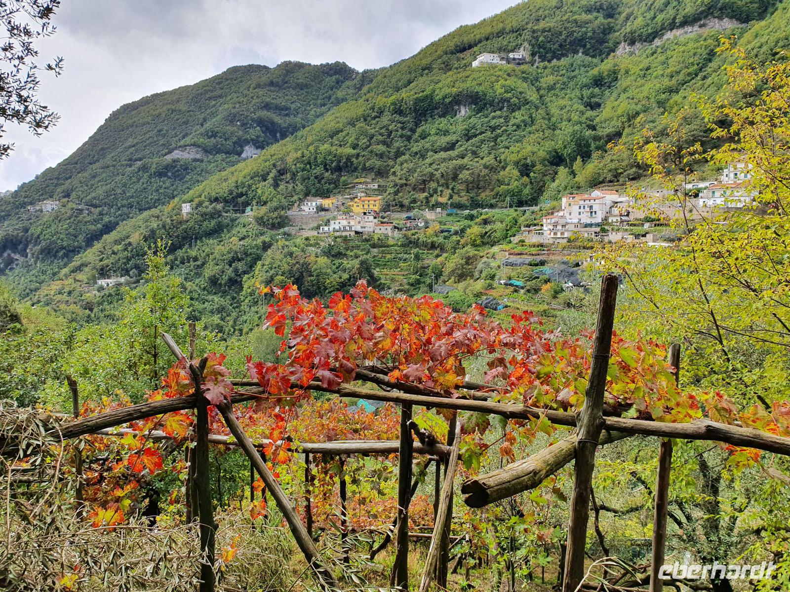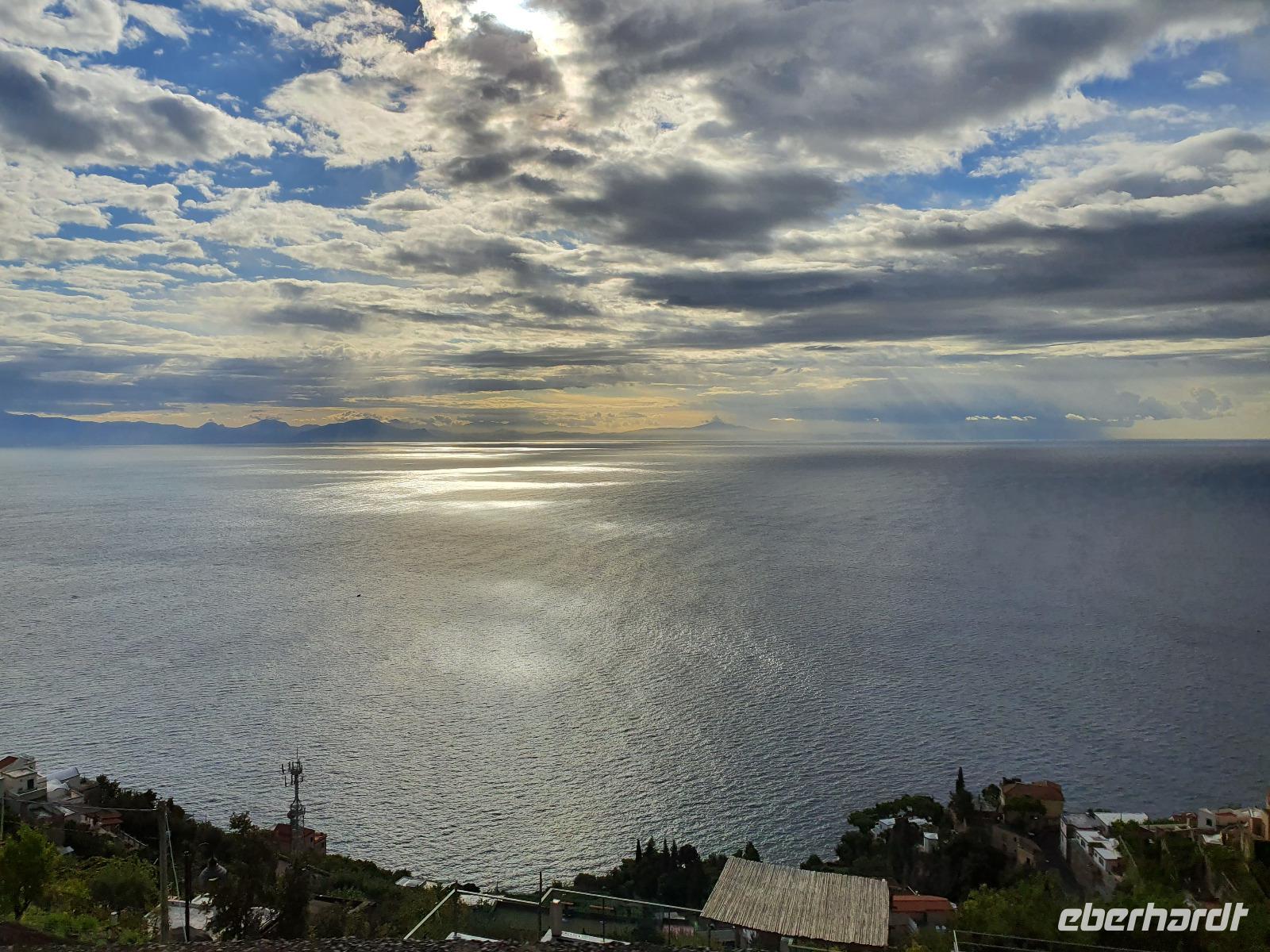 Mit unserem Bus fahren wir zunächst die Amalfitana bis hinter Amalfi und dann in der Furore Schlucht hinauf in den gleichnamigen Ort, wo zahlreiche Malereien die Häuserwände zieren. Immer weiter bergan erreichen wir schliesslich Bomerano auf 630 m Höhe und steigen am Dorfplatz aus. Es bleibt noch Zeit für einen Kaffee und eine WC Pause und dann begeben wir uns auf den wohl berühmtesten Wanderweg an der Amalfiküste - den Götterweg. Die Regensachen halten wir immer bereit, denn es gibt ab und zu einen Schauer. Das Wolkenspiel macht es noch interessanter und wenn die Sonne durch die Wolken schaut, ist es wie Weihnachten - ein Geschenk. Wir geniessen die Ausblicke ausgiebig. Ende August hatte es am Götterweg gebrannt und so müssen wir den oberen, aussichtsreicheren und etwas längeren Weg nehmen. Es sind viele verkohlte Bäume zu sehen und das abgebrannte Gras treibt schon wieder frisch aus. Der Weg geht ständig auf und ab und das teilweise auch recht steil. Nach 3 Stunden erreichen wir das Dorf Nocelle und wir kehren im Chiosco ein zu einem Mittagsimbiss.