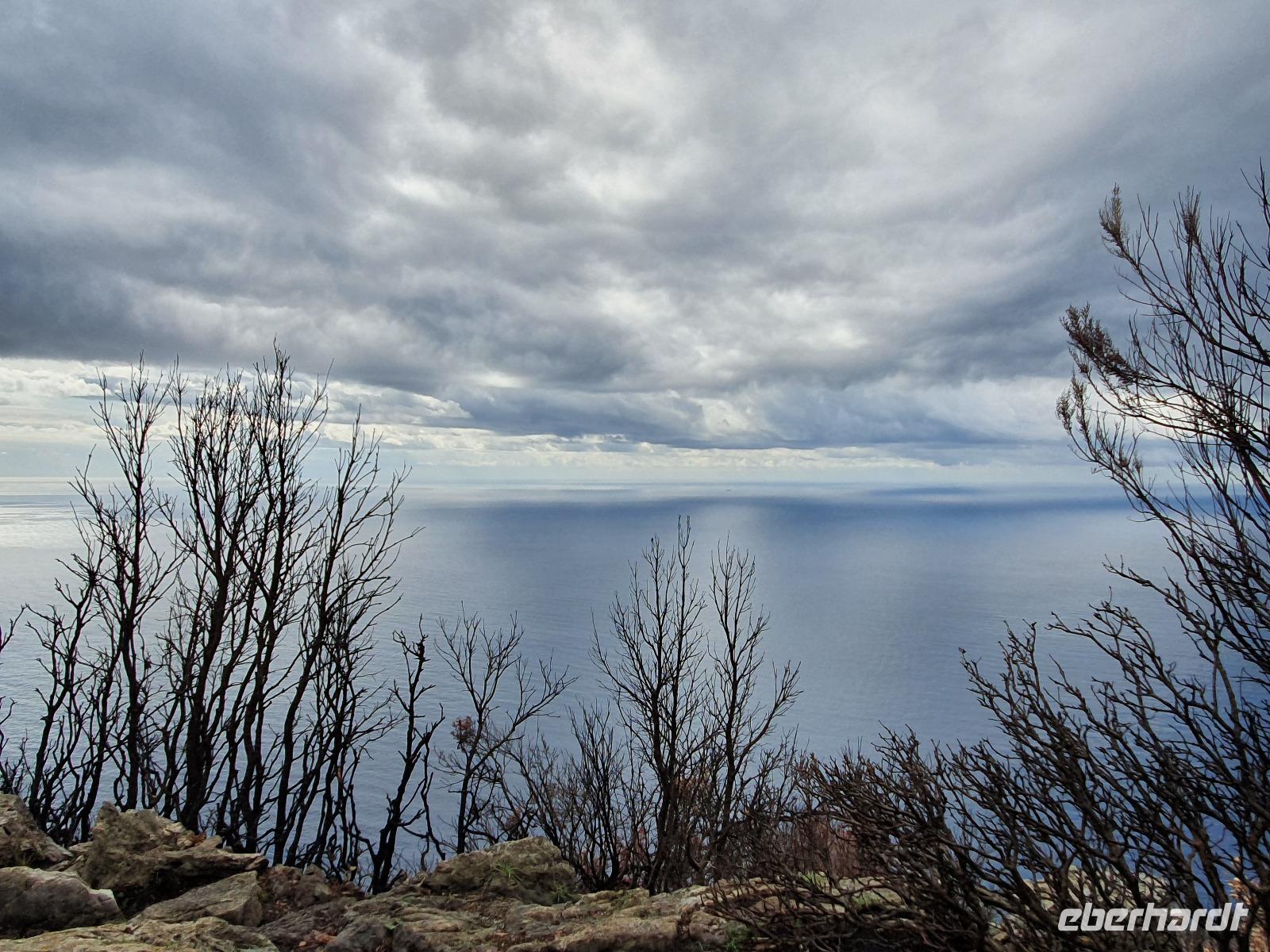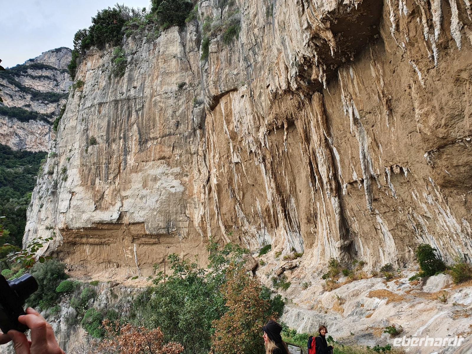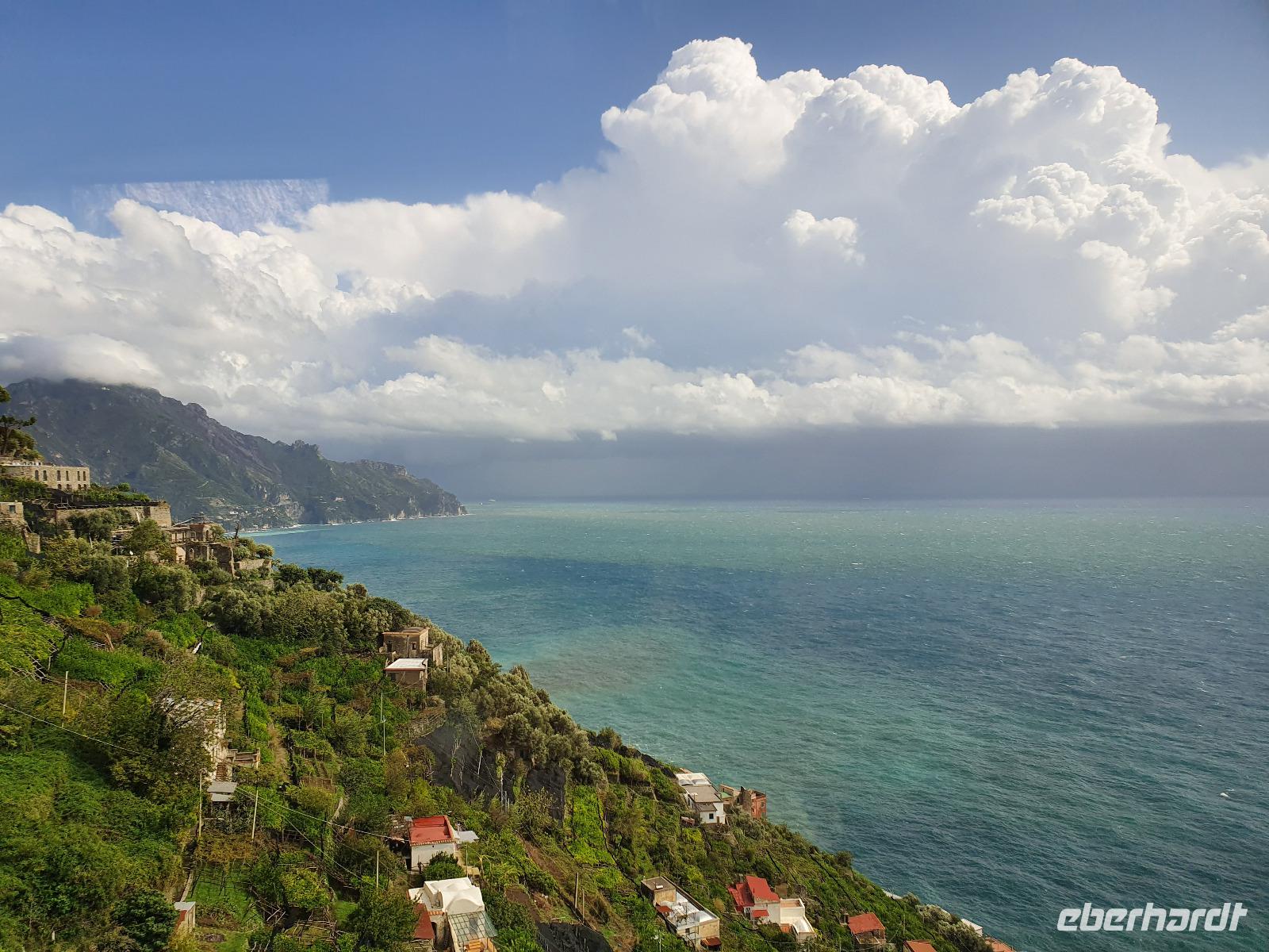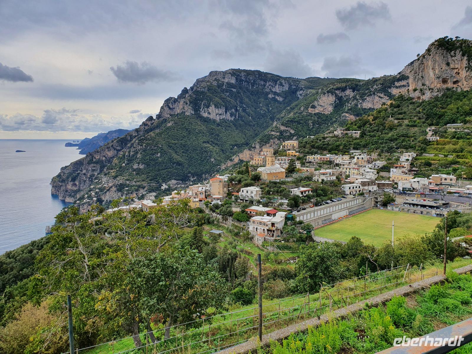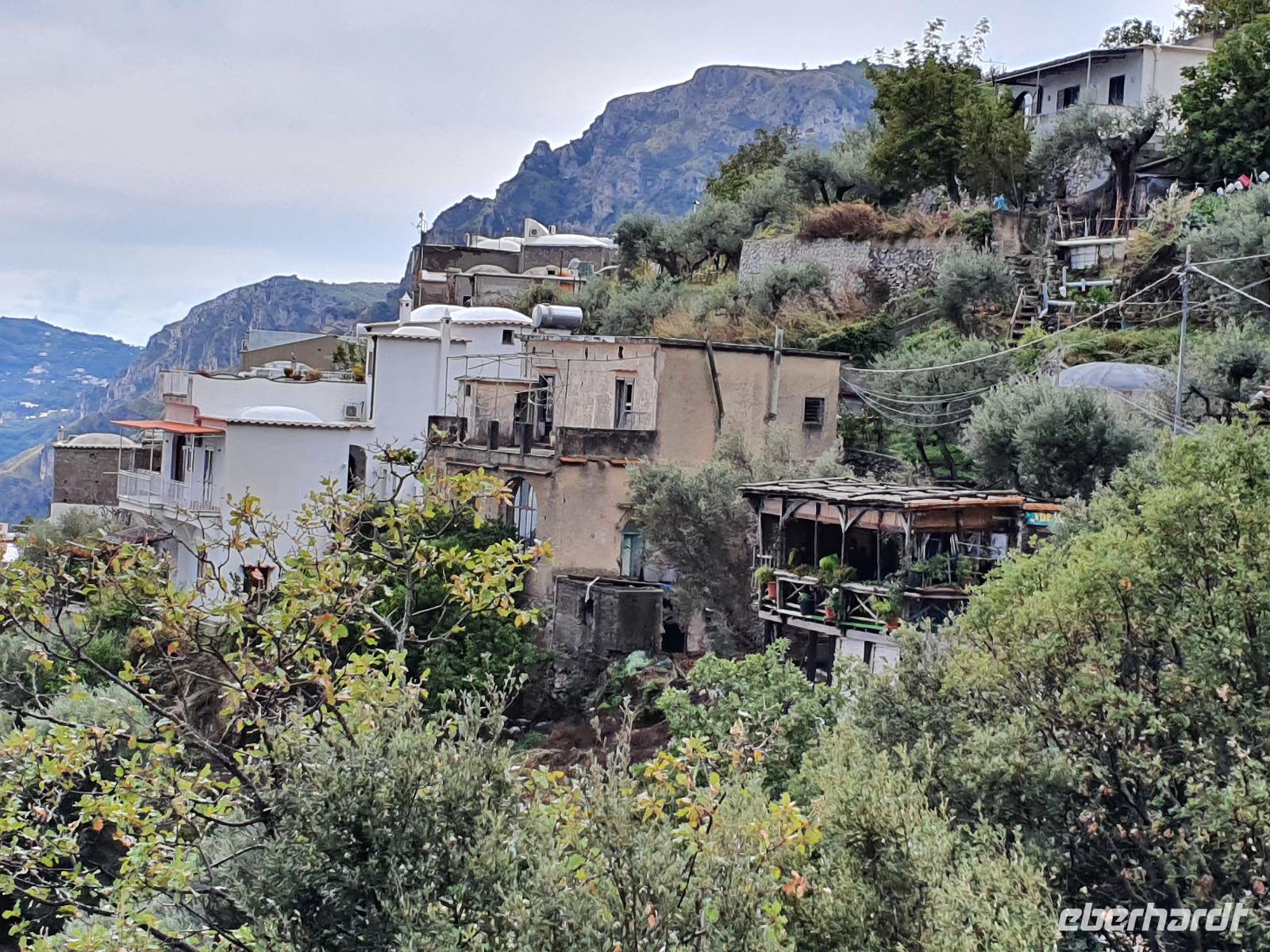 Mit unserem Bus fahren wir zunächst die Amalfitana bis hinter Amalfi und dann in der Furore Schlucht hinauf in den gleichnamigen Ort, wo zahlreiche Malereien die Häuserwände zieren. Immer weiter bergan erreichen wir schliesslich Bomerano auf 630 m Höhe und steigen am Dorfplatz aus. Es bleibt noch Zeit für einen Kaffee und eine WC Pause und dann begeben wir uns auf den wohl berühmtesten Wanderweg an der Amalfiküste - den Götterweg. Die Regensachen halten wir immer bereit, denn es gibt ab und zu einen Schauer. Das Wolkenspiel macht es noch interessanter und wenn die Sonne durch die Wolken schaut, ist es wie Weihnachten - ein Geschenk. Wir geniessen die Ausblicke ausgiebig. Ende August hatte es am Götterweg gebrannt und so müssen wir den oberen, aussichtsreicheren und etwas längeren Weg nehmen. Es sind viele verkohlte Bäume zu sehen und das abgebrannte Gras treibt schon wieder frisch aus. Der Weg geht ständig auf und ab und das teilweise auch recht steil. Nach 3 Stunden erreichen wir das Dorf Nocelle und wir kehren im Chiosco ein zu einem Mittagsimbiss.