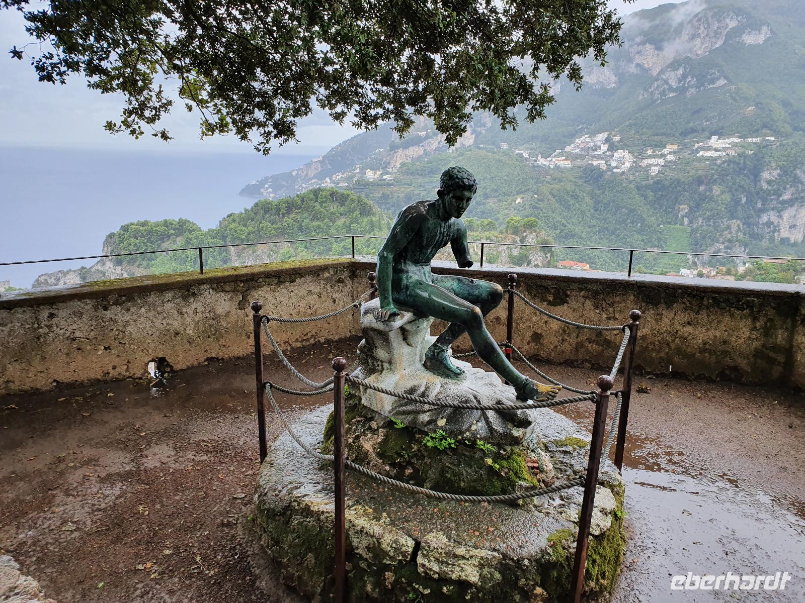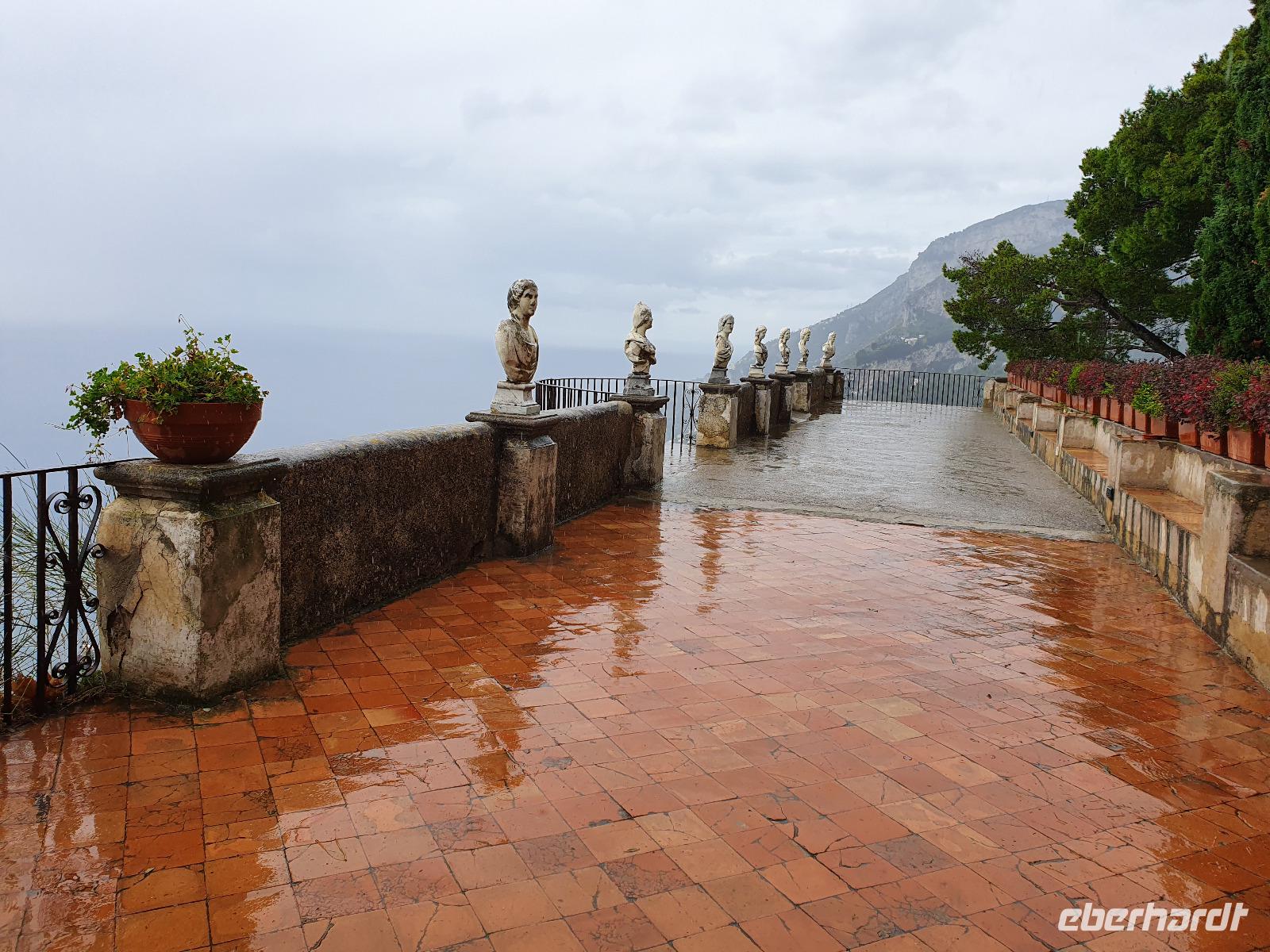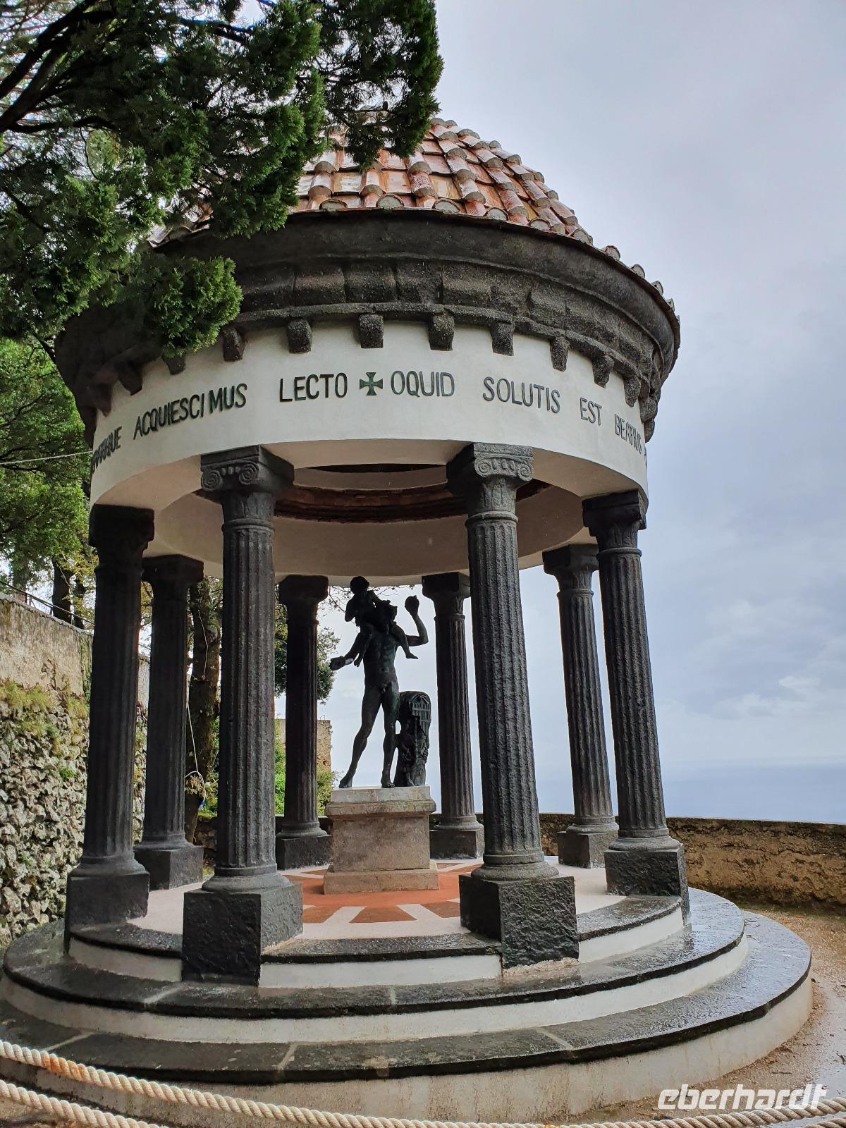 Leider verdunkelt sich der Himmel und Regen setzt ein. Daniele zeigt uns zuerst den Bau des Oskar-Niemeyer-Auditoriums, dass vom brasilianischen Stararchitekten im Jahr 2000 entworfen, vorwiegend von der EU finanziert und 2010 mit 2 Konzerten endlich eröffnet wurde. Gleich darauf schloss man es wieder und seitdem gibt es nur wenig Nutzung, dafür aber enorme Verfallserscheinungen. Geplant war ursprünglich, dass die im Rahmen der Wagner Festspiele organisierten Konzerte auch im Winter im Auditorium stattfinden können. Das trat aber nicht ein und so werden die Veranstaltungen wie eh und je im Sommer im Garten der Villa Rufolo durchgeführt - mit Ausnahme 2020. Wir spazieren durch einen der beiden Tunnel ins Stadtzentrum und gehen vorbei an der Villa Rufolo zur Villa Cimbrone.