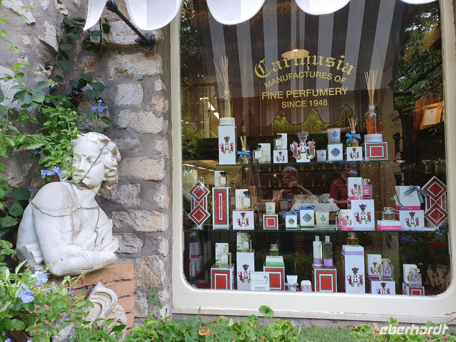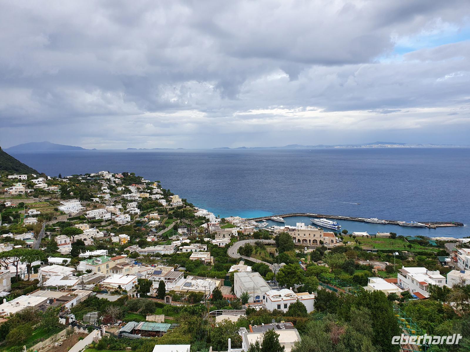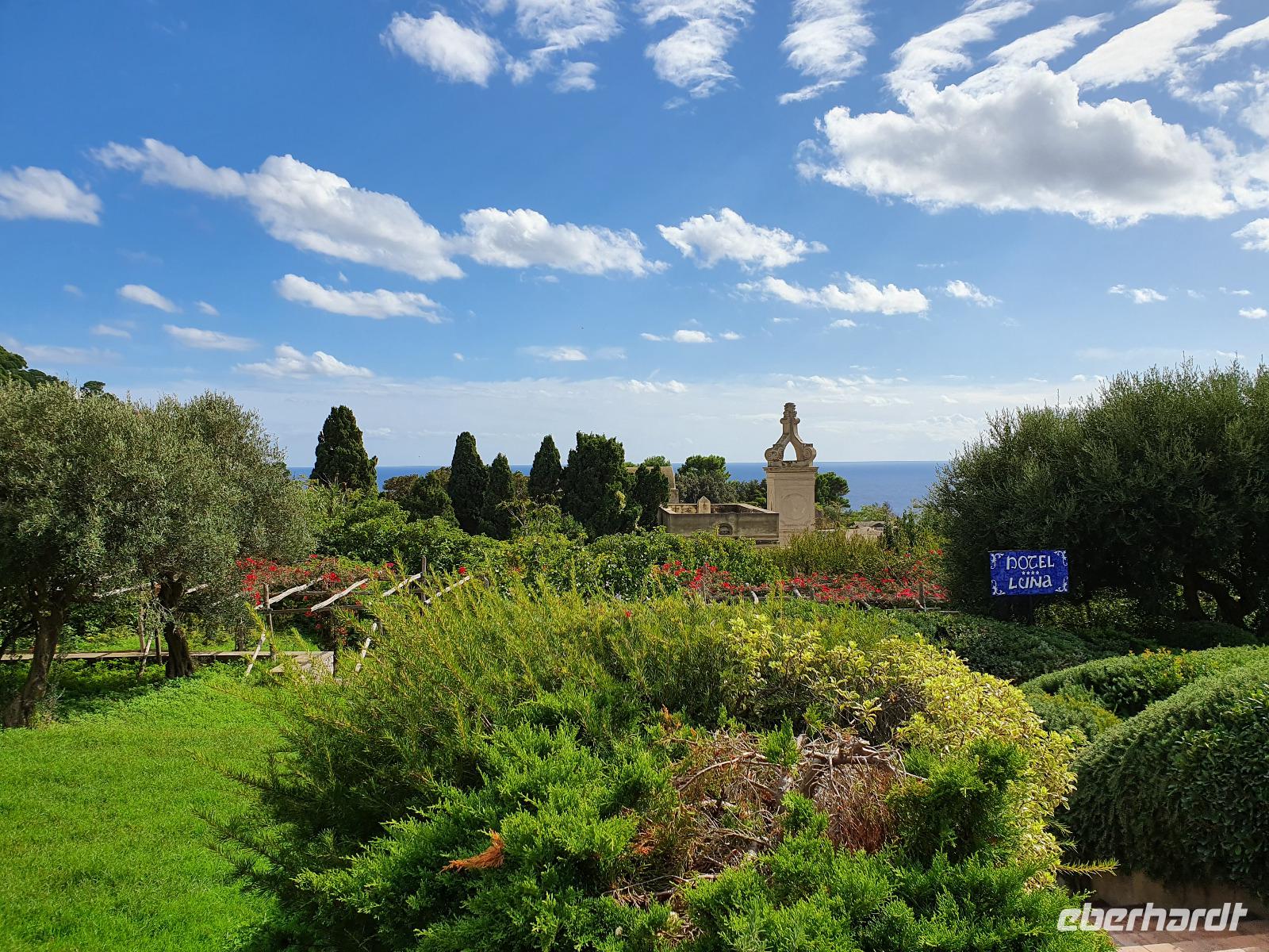 Von der Piazetta spazieren wir gemütlich durch die Gassen zum Quisisana Hotel, was schon geschlossen ist und so ohne Fahnen und Schmuck ganz ungewöhnlich aussieht. Weiter geht es vorbei am Karthäuserkloster und der Parfümerie zu den Augustusgärten. Am Eingang beginnt die berühmte Via Krupp, die leider seit vielen Jahren wegen Steinschlag gesperrt ist und man so nicht mehr zur Marina Picollo gelangen kann von dort. Die Augustusgärten bieten viele wunderschöne Aussichtspunkte und um zu vielen Menschen auf den Bänken vorzubeugen, hat man Pappschilder mit berühmten Persönlichkeiten, die Capri besuchten, auf den Bänken fest montiert. Wir geniessen die Aussichten im Sonnenschein und gehen dann zurück wieder durch Gassen zur Evangelischen Kirche und schliesslich zur Piazetta. Dort bleibt noch genügend Zeit für einen Kaffee oder Shopping. Der Himmel weint und so sind wir nicht böse, dass ein Privatbus uns schliesslich wieder hinunter zur Marina Grande bringt, wo unsere Fähre nach Sorrent 16.20 Uhr pünktlich ablegt.