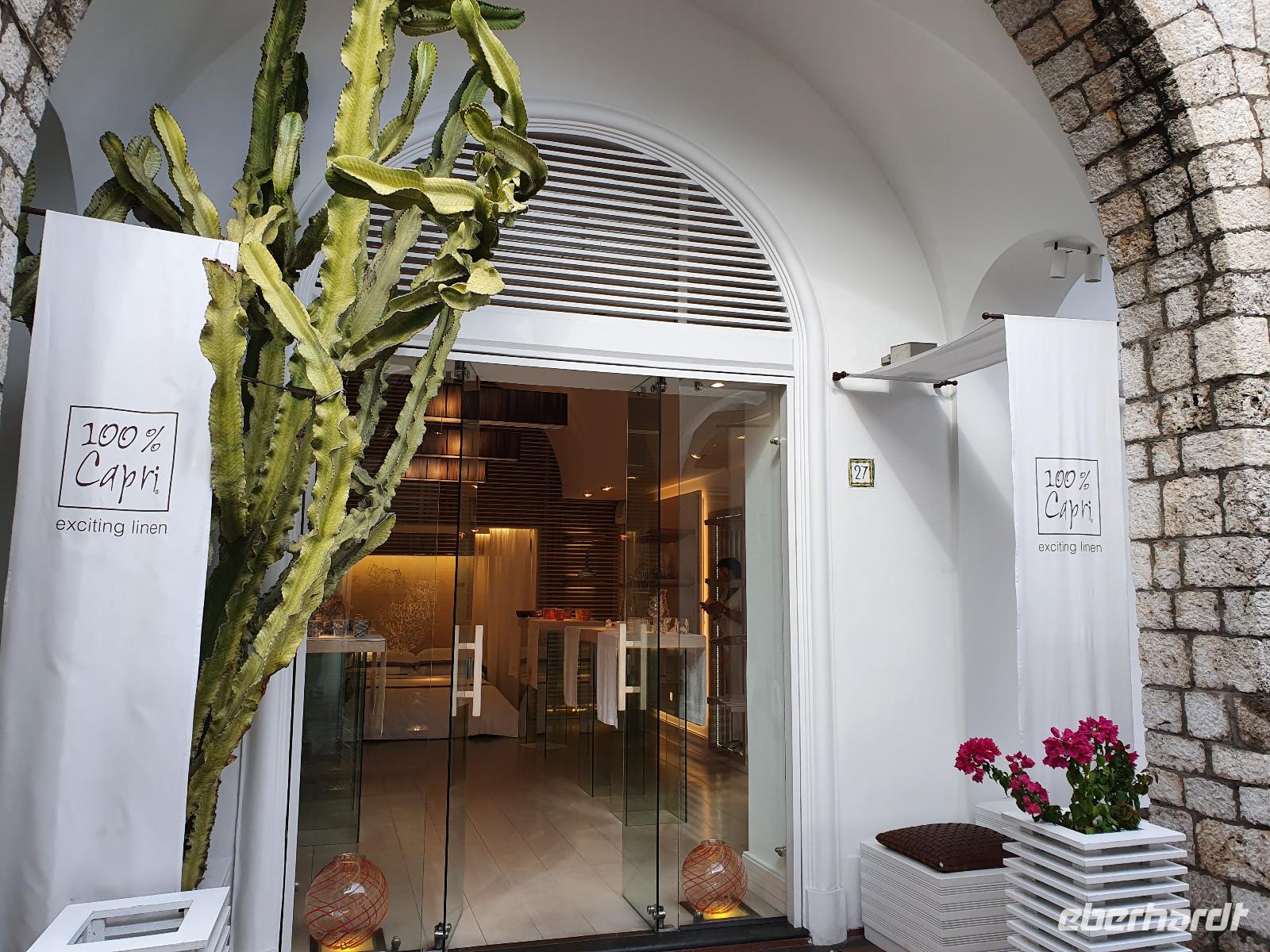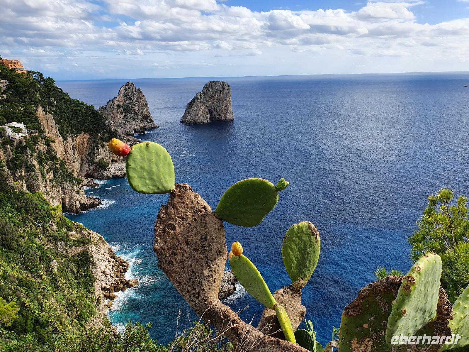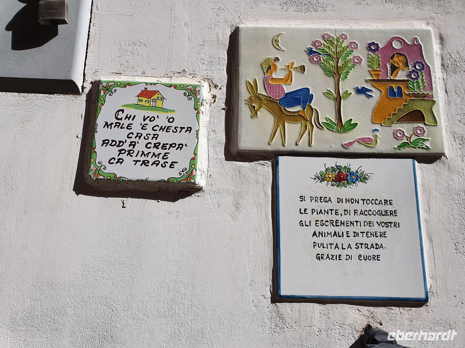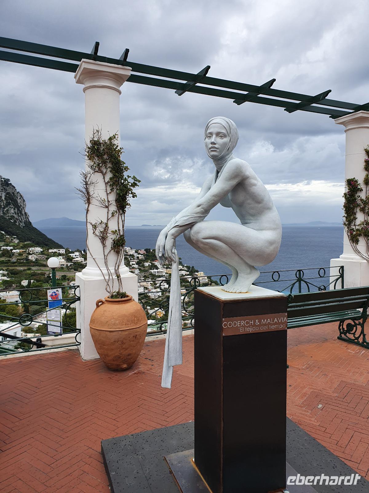 Von der Piazetta spazieren wir gemütlich durch die Gassen zum Quisisana Hotel, was schon geschlossen ist und so ohne Fahnen und Schmuck ganz ungewöhnlich aussieht. Weiter geht es vorbei am Karthäuserkloster und der Parfümerie zu den Augustusgärten. Am Eingang beginnt die berühmte Via Krupp, die leider seit vielen Jahren wegen Steinschlag gesperrt ist und man so nicht mehr zur Marina Picollo gelangen kann von dort. Die Augustusgärten bieten viele wunderschöne Aussichtspunkte und um zu vielen Menschen auf den Bänken vorzubeugen, hat man Pappschilder mit berühmten Persönlichkeiten, die Capri besuchten, auf den Bänken fest montiert. Wir geniessen die Aussichten im Sonnenschein und gehen dann zurück wieder durch Gassen zur Evangelischen Kirche und schliesslich zur Piazetta. Dort bleibt noch genügend Zeit für einen Kaffee oder Shopping. Der Himmel weint und so sind wir nicht böse, dass ein Privatbus uns schliesslich wieder hinunter zur Marina Grande bringt, wo unsere Fähre nach Sorrent 16.20 Uhr pünktlich ablegt.