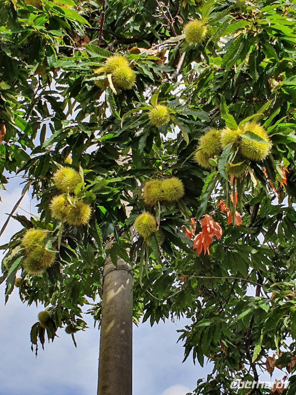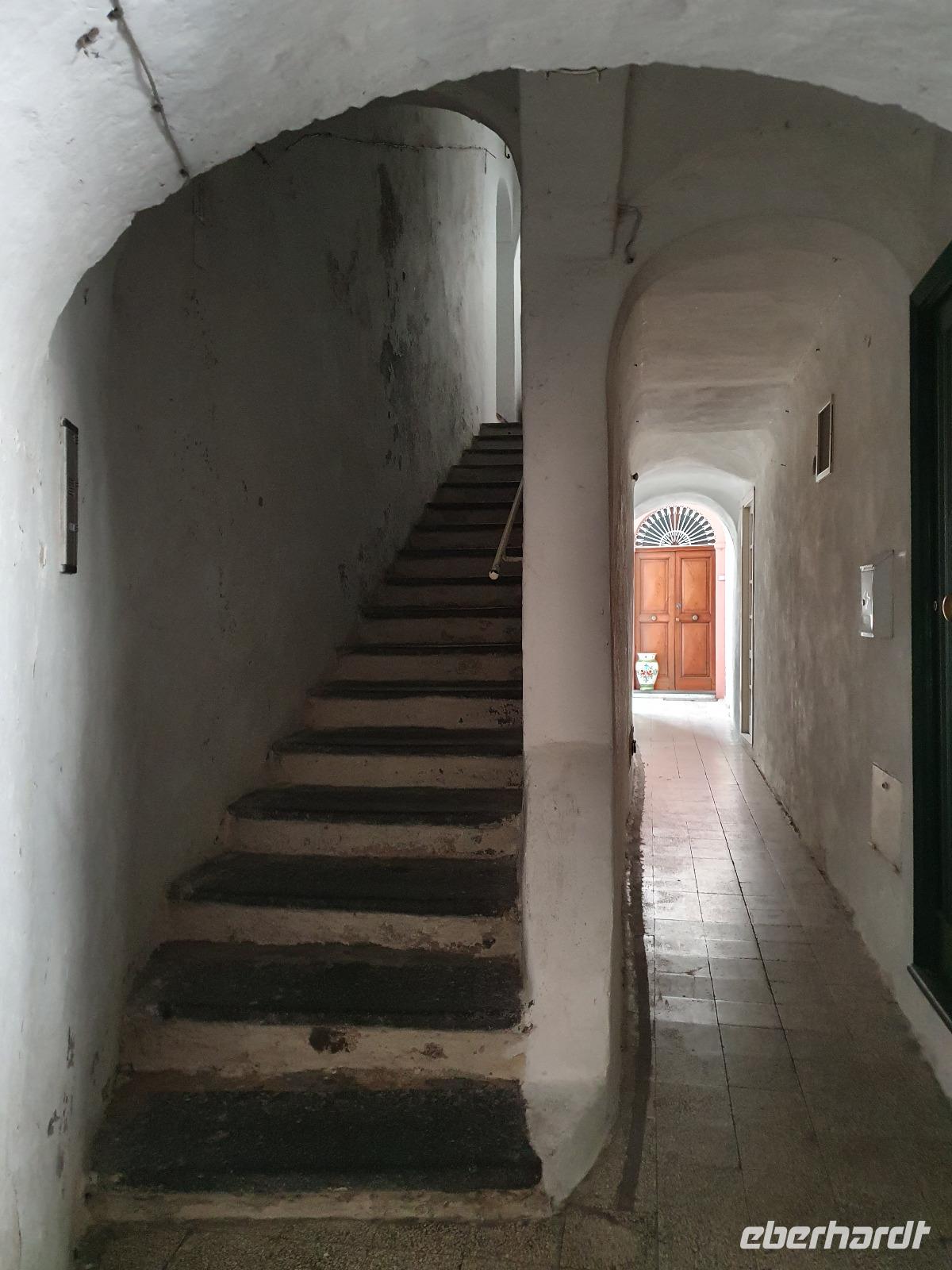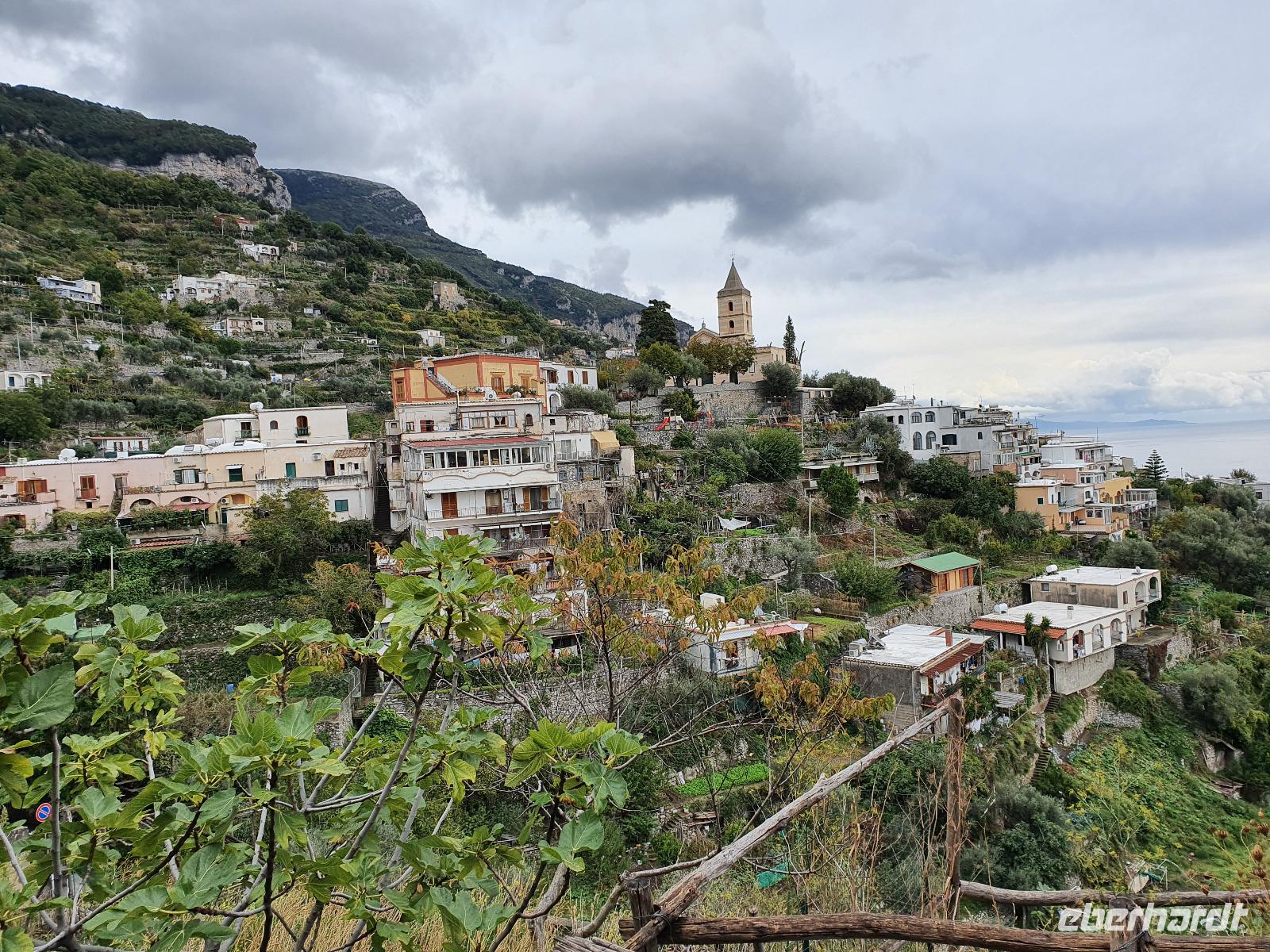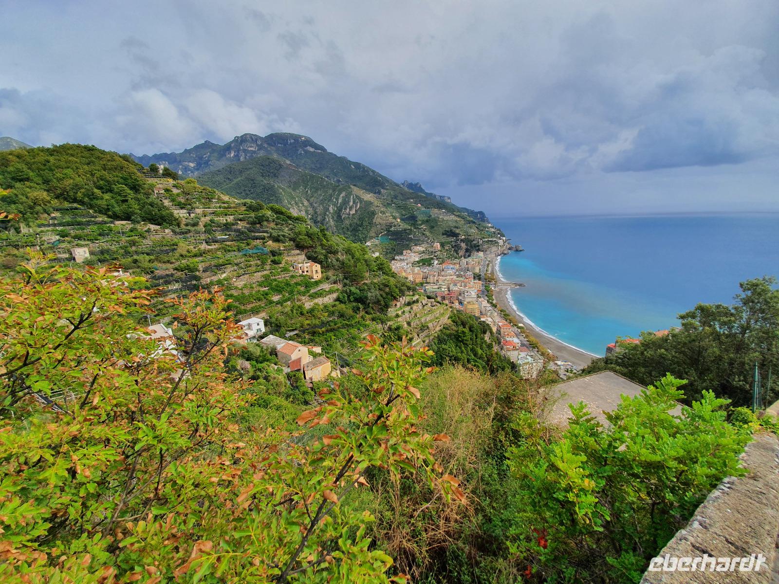 Der Weg hinunter ins Tal, anfangs im Wald und später mit Blick links auf Maiori und rechts auf Minori war mit zahllosen Treppen bestückt. Nicht so gut für Wanderer mit Knieproblemen. Wir kommen vorbei an vielen Obstgärten mit Zitronen, Feigen- und Kakibäumen. Die Früchte der Esskastanien liegen wie gesät am Boden. Das Mittagessen in Minori hoch oben beim Campanile nehmen wir auf einer überdachten Terrasse ein und bekommen zum Abschluss einen Limoncello ausgeschenkt. Viele kaufen auch ein von dem selbstgemachten Likör. Der Weg hinunter ins Zentrum von Minori verläuft auf einer kurvenreichen, wenig befahrenen Strasse, oder aber über Treppen und da war man ganz fix unten beim Hotel.