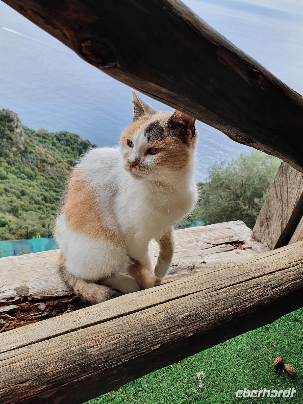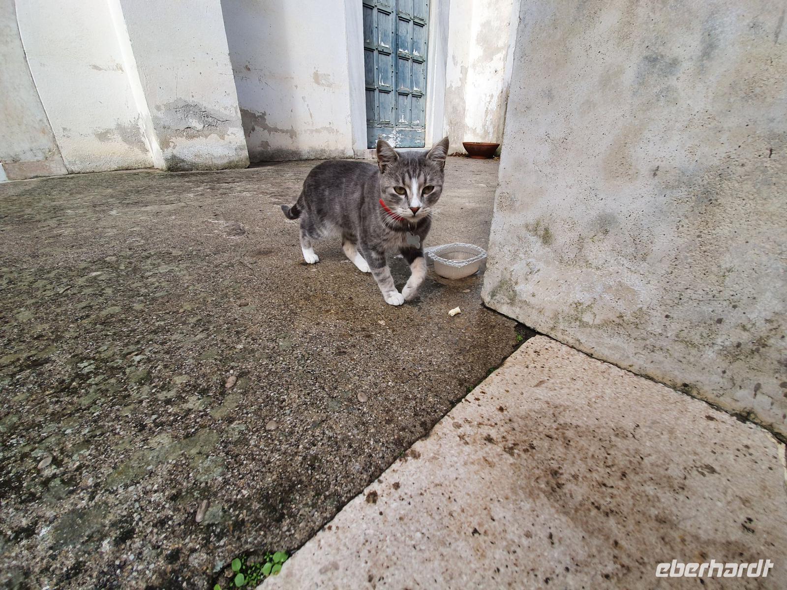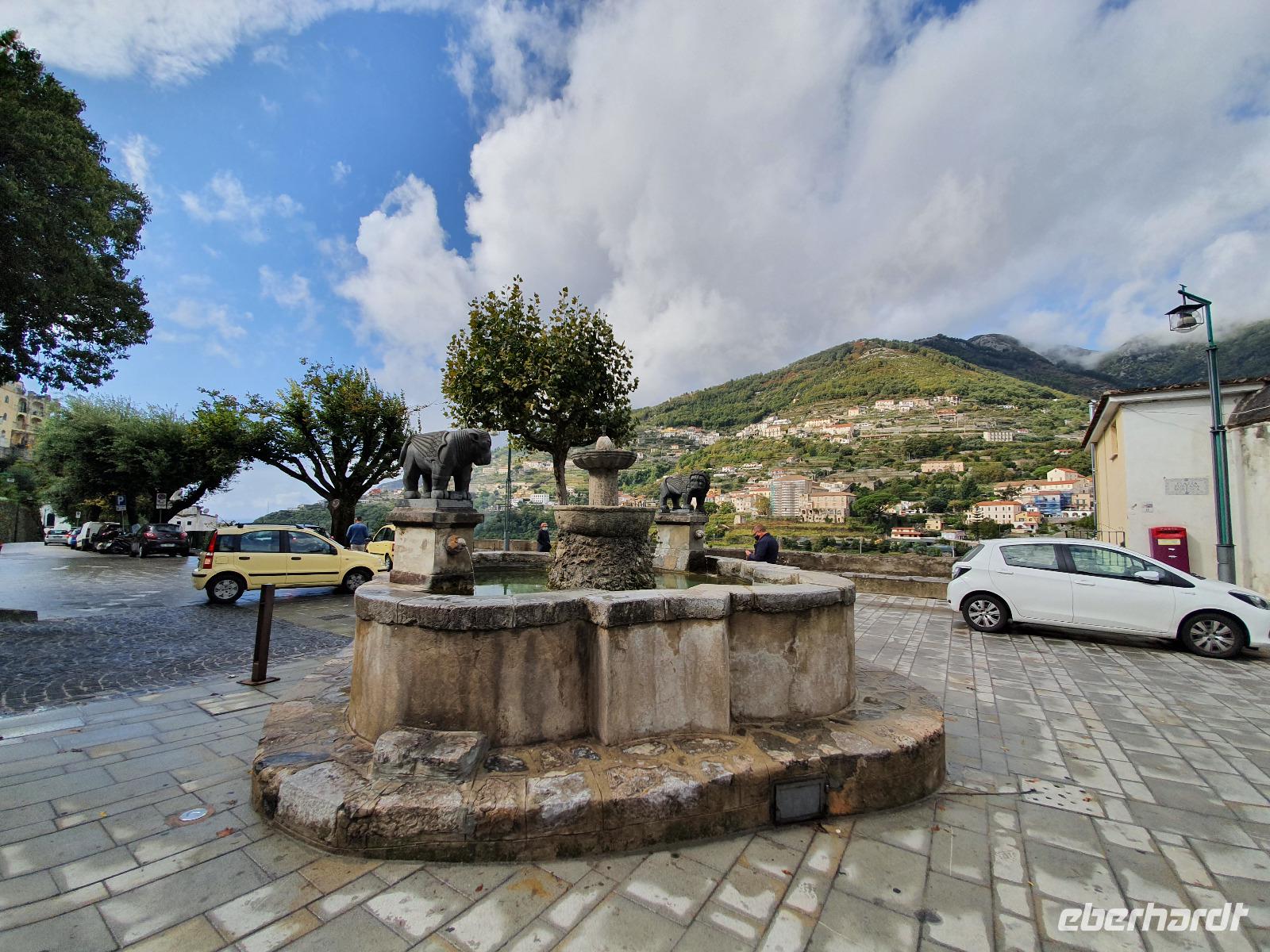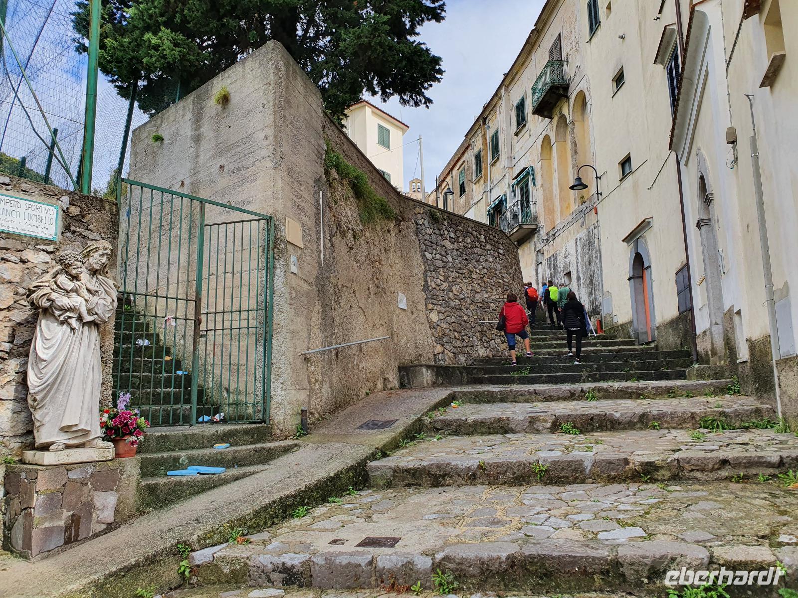 Nach der Besichtigung gehen wir zurück, an der Villa Rufolo vorbei zum Dom. Der Bau des Domes geht auf das 12.Jahrhundert zurück und noch heute kann die bronzene Eingangstür aus dem Jahr 1172 bewundert werden. Innen gibt es venezianische Fenster und eine Marmorkanzel, die von 4 Löwen getragen wird, zu bestaunen. Inzwischen scheint wieder die Sonne. Auf unserem Weg durch die Stadt treffen wir auf viele Katzen. Die meisten sind herrenlos und warten bei den Restaurants auf etwas Fressbares. Eine Katze aber kommt aus einem 4-Sterne Hotel mit elegantem Halsband und ist dort offenbar als Mäusefängerin "angestellt". Vorbei an einem Brunnen aus dem Mittelalter verlassen wir Ravello durch enge Gassen und über viele Stufen. Der weitere Weg verläuft auf einer wenig befahrenen Strasse und dann weiter auf einem aussichtsreichen alten Maultierpfad in Richtung Kloster St.Nicola.