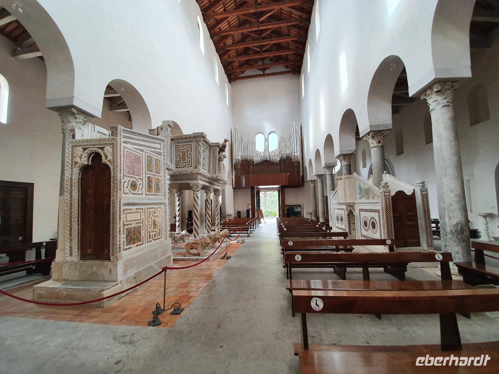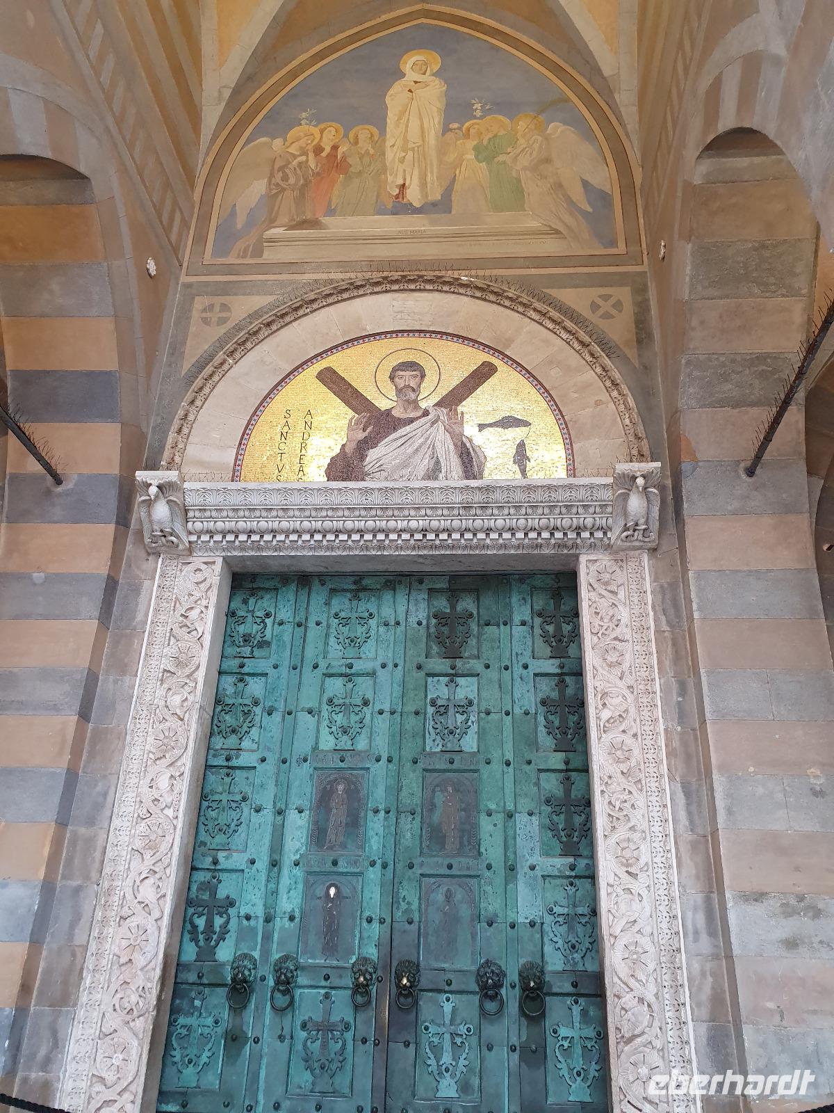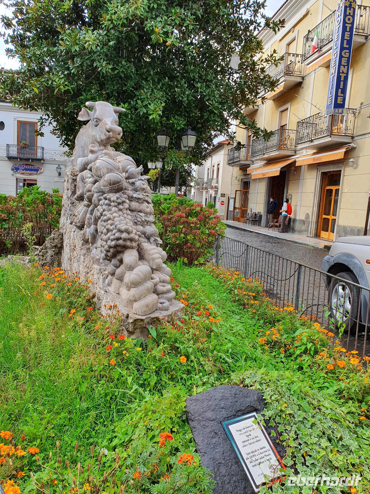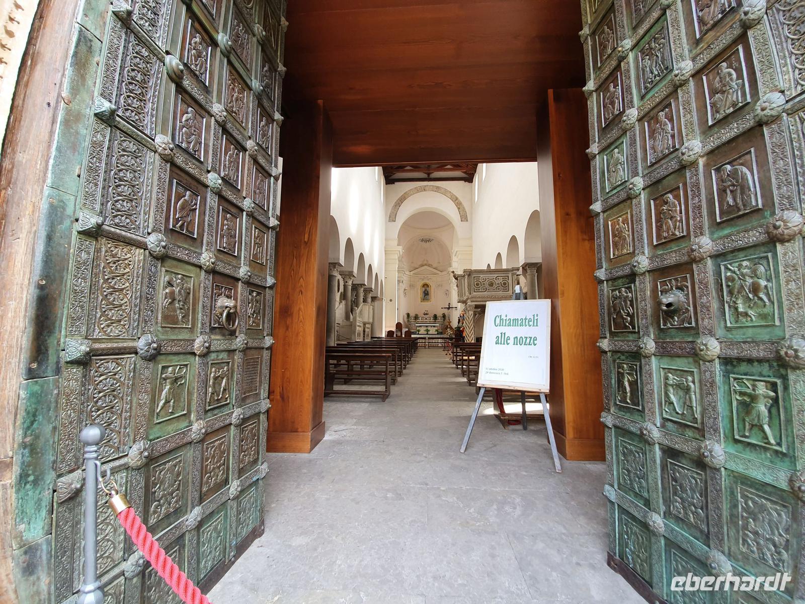 Nach der Besichtigung gehen wir zurück, an der Villa Rufolo vorbei zum Dom. Der Bau des Domes geht auf das 12.Jahrhundert zurück und noch heute kann die bronzene Eingangstür aus dem Jahr 1172 bewundert werden. Innen gibt es venezianische Fenster und eine Marmorkanzel, die von 4 Löwen getragen wird, zu bestaunen. Inzwischen scheint wieder die Sonne. Auf unserem Weg durch die Stadt treffen wir auf viele Katzen. Die meisten sind herrenlos und warten bei den Restaurants auf etwas Fressbares. Eine Katze aber kommt aus einem 4-Sterne Hotel mit elegantem Halsband und ist dort offenbar als Mäusefängerin "angestellt". Vorbei an einem Brunnen aus dem Mittelalter verlassen wir Ravello durch enge Gassen und über viele Stufen. Der weitere Weg verläuft auf einer wenig befahrenen Strasse und dann weiter auf einem aussichtsreichen alten Maultierpfad in Richtung Kloster St.Nicola.